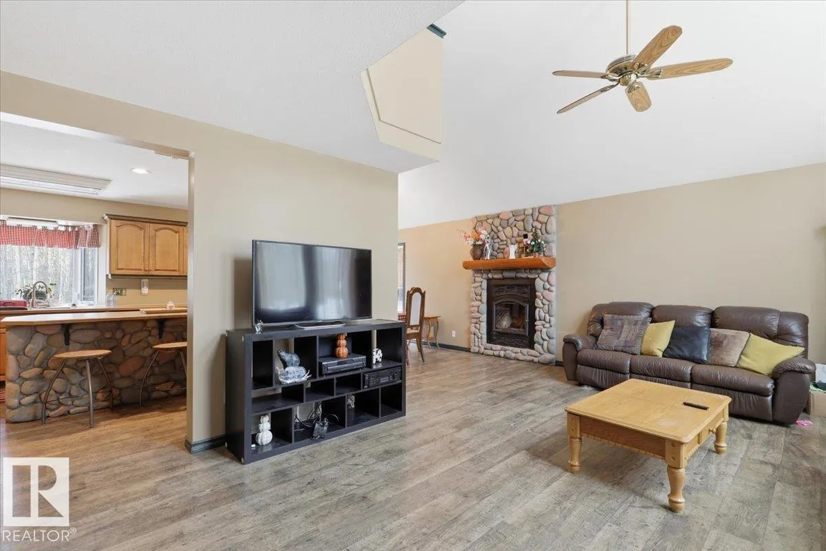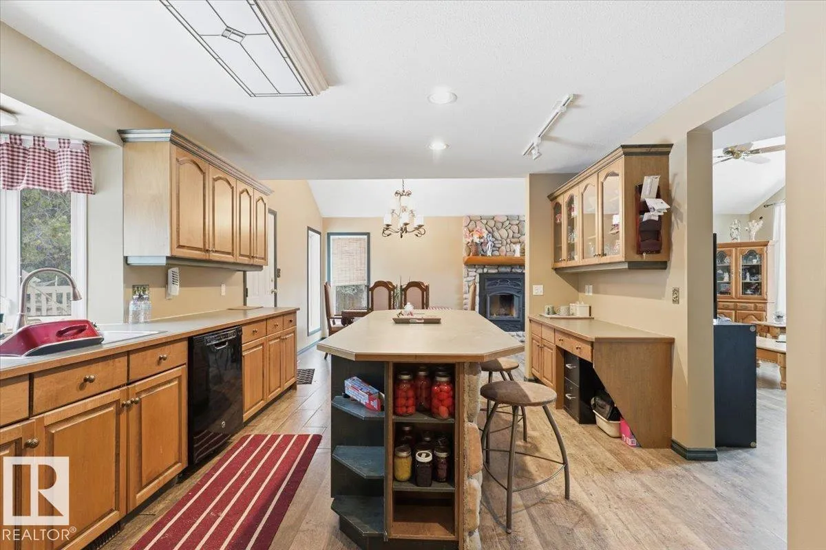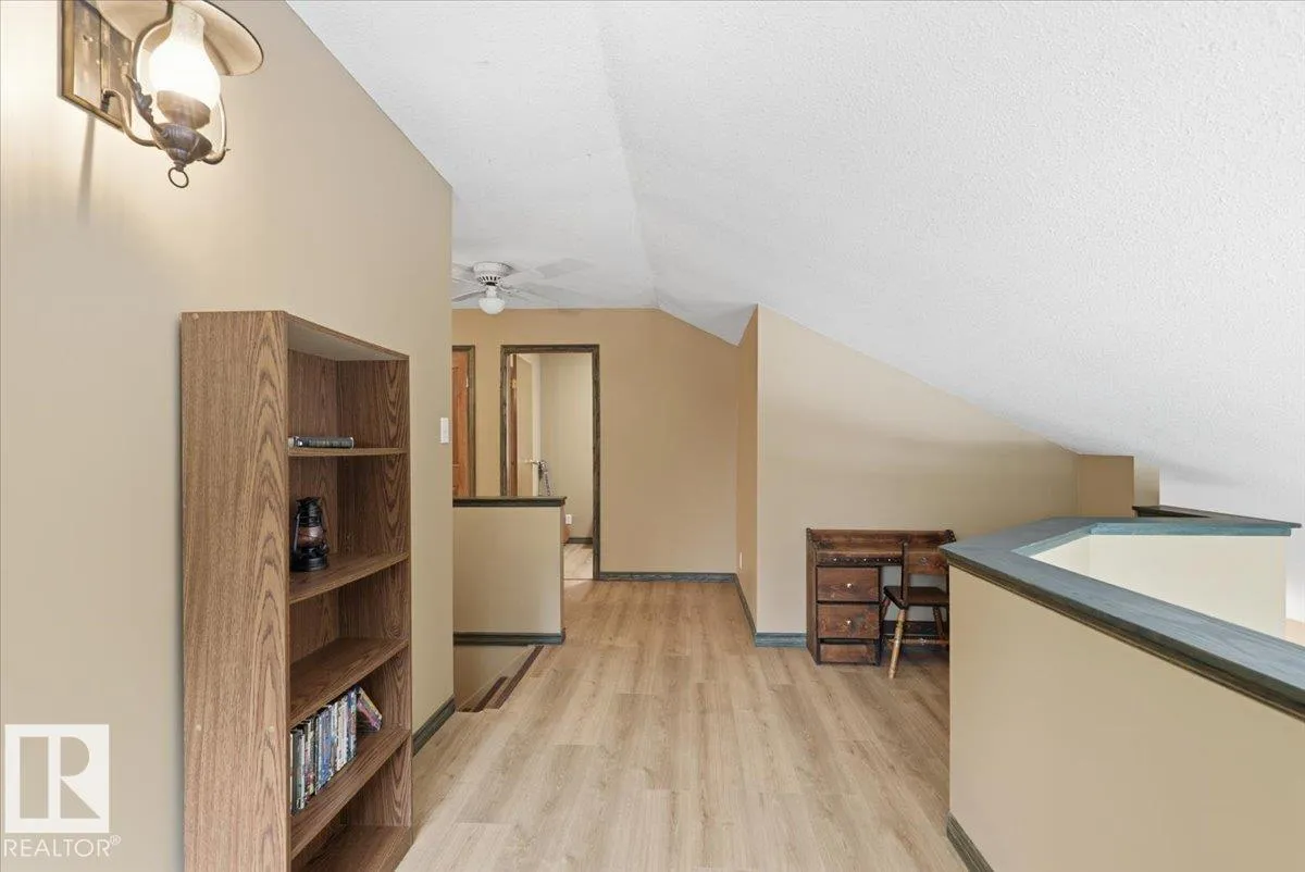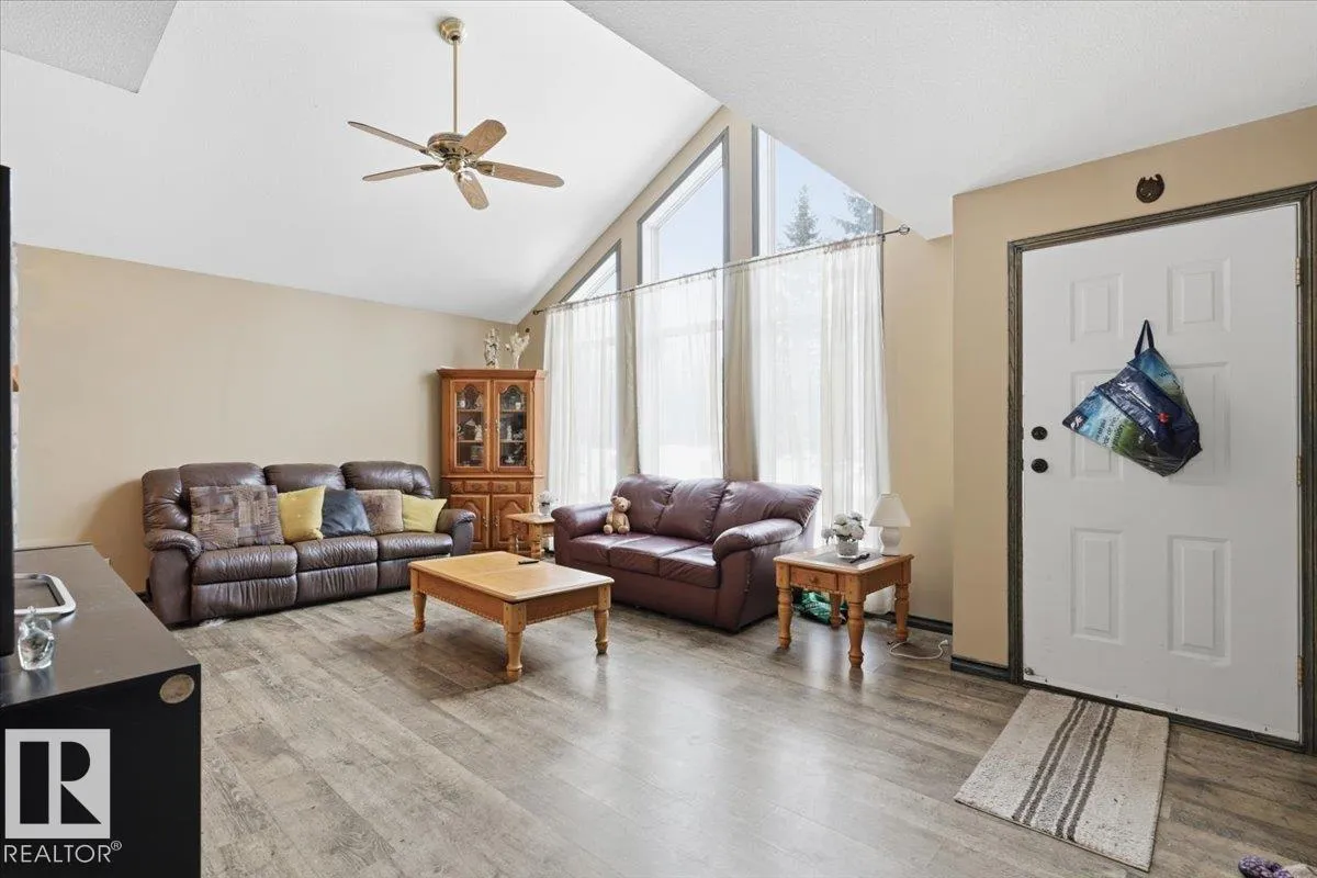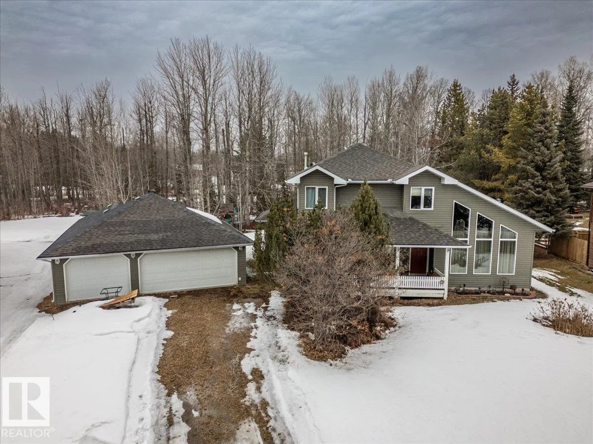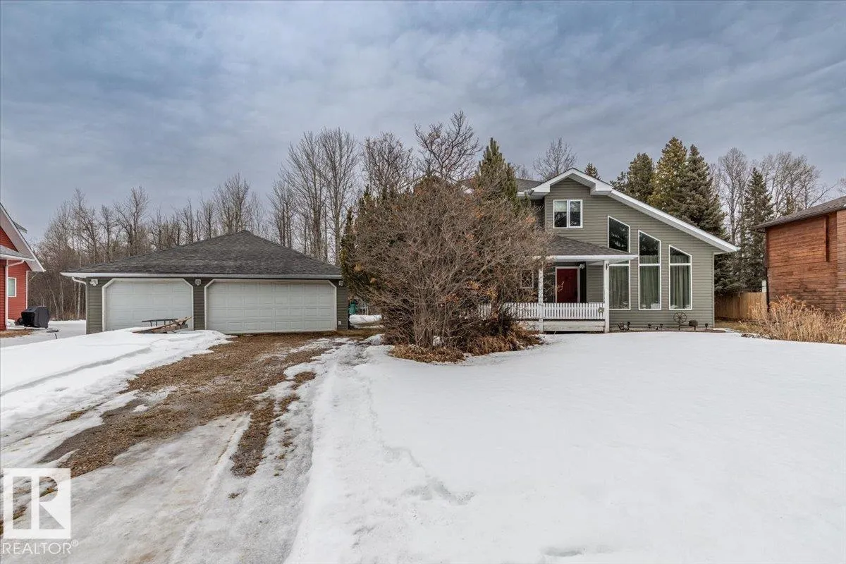Located within walking distance to the Lake, sits this Country Style 1.5 Storey home with a Triple Detached Garage! Past the front covered deck and inside the home, the spacious living room greets you with large windows, a vaulted ceiling, and a stone fireplace. The kitchen has lots of cabinets, an island, and is open to the dining area. The Primary Bedroom is also situated on the main level with an ensuite bathroom and a make up desk with a sink. Another 2 piece bathroom, and the laundry room conclude the main floor plan. The upper level hosts a loft, office, two more bedrooms, and a 4 piece bathroom. A large deck off the back of the home overlooks the spacious, treed backyard. The large Triple detached garage is heated with a cement floor, power, and has a guest suite off the back. This Property is the perfect blend of country living, and life at the lake! (id:27476)