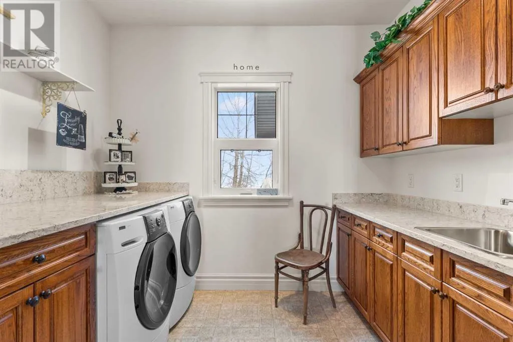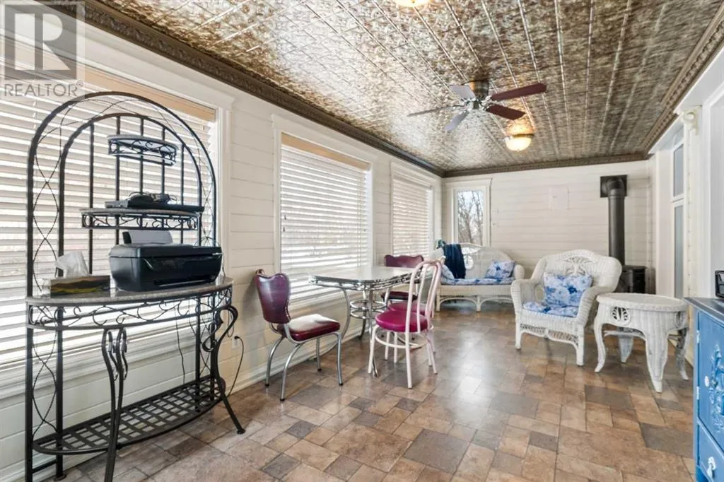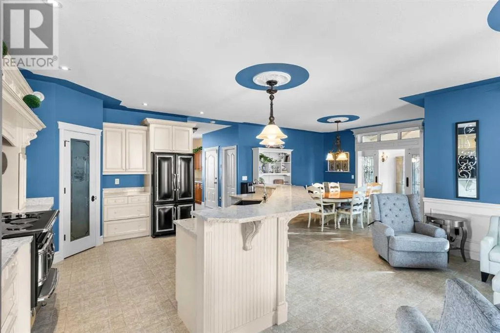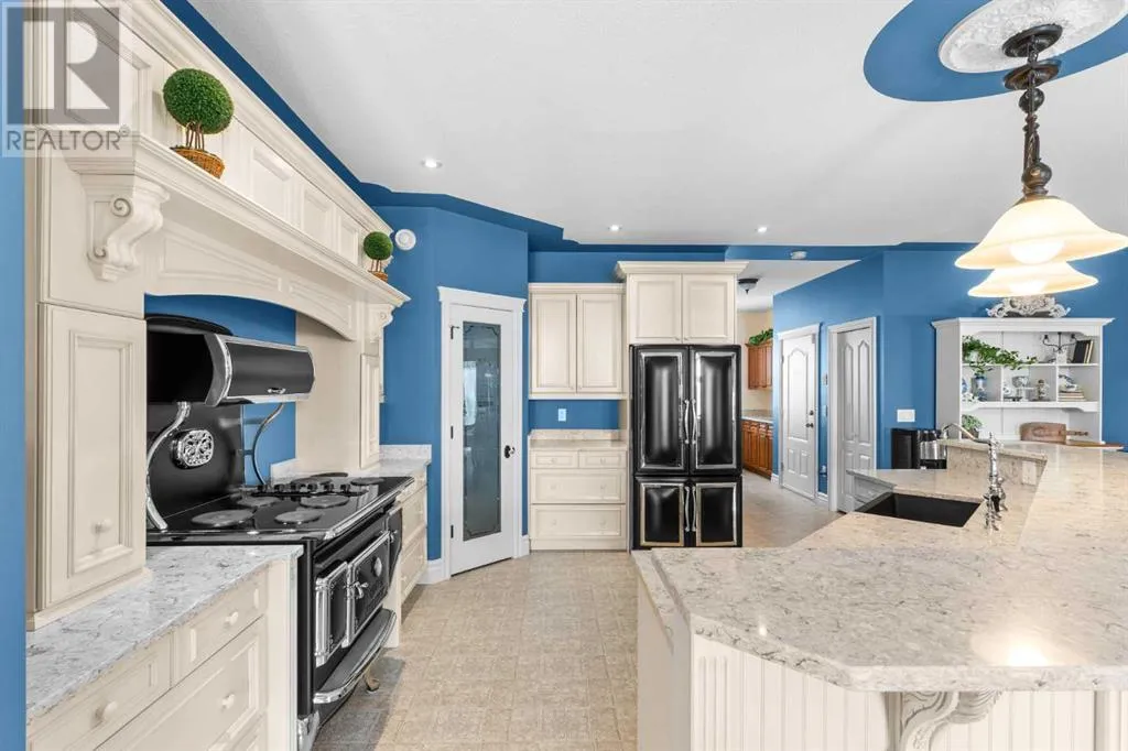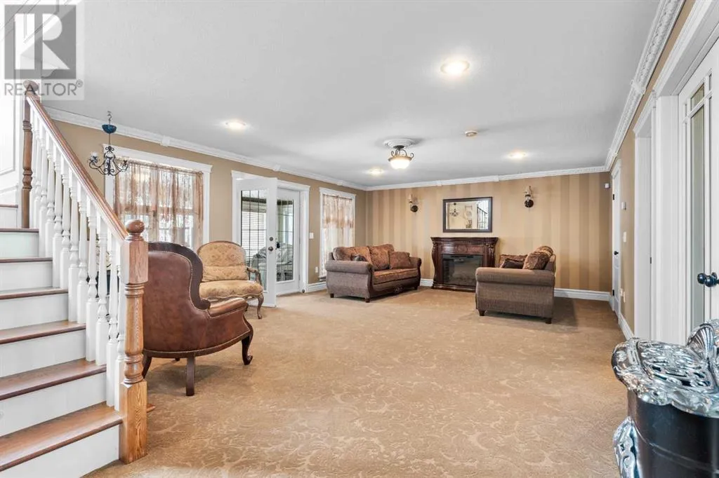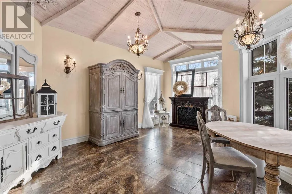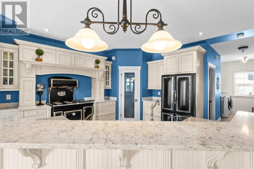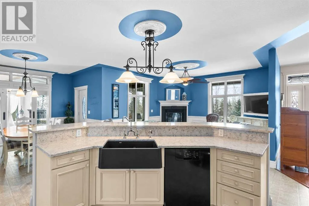 This beautifully landscaped 5.49-acre acreage offers exceptional potential for a small/medium-sized business and additional housing for extended or blended families. Located 5 minutes north of Didsbury, AB, and 10 minutes south of Olds, AB, just off Highway 2A, it boasts gorgeous mountain views. The main house, with 2,017 sq ft of French country charm, features crown moldings, barn and French doors, and hardwood floors. The spacious kitchen, updated in 2023, has a two-tiered island, quartz countertops, a farmhouse sink, hard wood floors and ample cabinet space. The main floor also includes a dining room, living room, covered maintenance-free veranda with an outdoor kitchen. Master bedroom with a 4-piece ensuite, fireplace, soaker tub, and walk-in closet. Additional spaces include a 2-piece bath, second bedroom, laundry room, mudroom, and garage entrance. The fully finished walk-out basement provides 1,735 sq ft, featuring 2 bedrooms, a media room, a 4-piece bath, a playroom, and storage. ICF construction, crown moldings, fresh paint (2023), and in-floor heating throughout enhance the home's appeal. The oversized, heated double garage has a paved driveway. The property includes a 6,400 sq ft shop (128' x 50') with three-phase power. Features include a 50âx24â drive-through wash bay with 12â overhead doors, a 50âx24â welding bay with a 16â overhead bay door and crane. 50âx80â main shop area with two 14â bay doors and 16â clearance. The shop also has a wood workshop, paint storage, front office space, and a 3-piece bathroom. A new boiler (2024) ensures in-floor heating. Above the woodworking shop, a spacious living area includes a kitchen, laundry, 4-piece bathroom, 3 bedrooms, a master bedroom with a walk-in closet, and a storage room. The mezzanine adds additional living space, perfect for additional family members. This exceptional property has been meticulously maintained and offers an unparalleled combination of country residential comfort and business potential. Whether you are seeking a spacious family home, a live-work opportunity, or a combination of both, this acreage provides a rare and sophisticated setting with limitless possibilities. (id:27476)