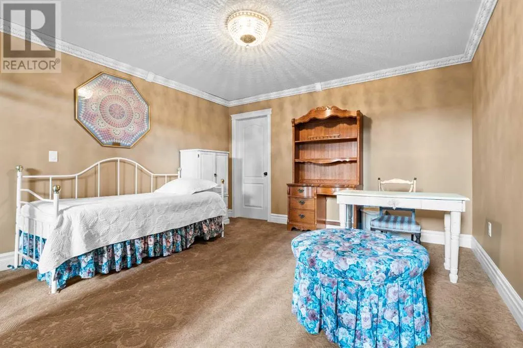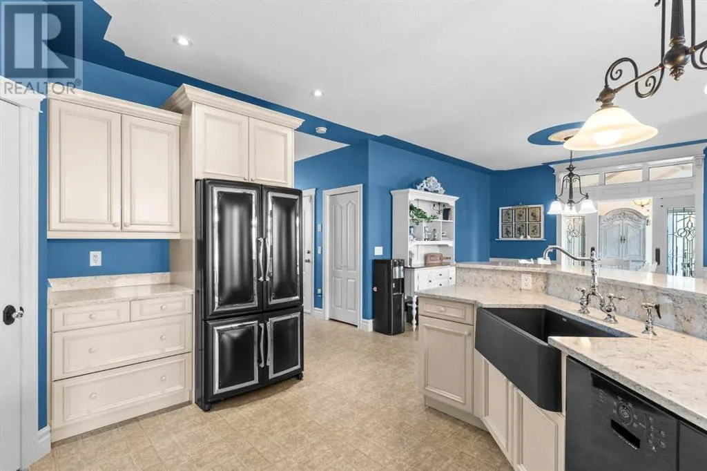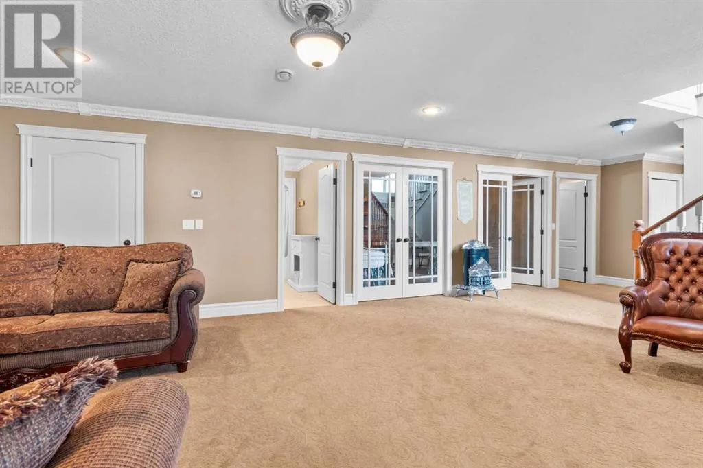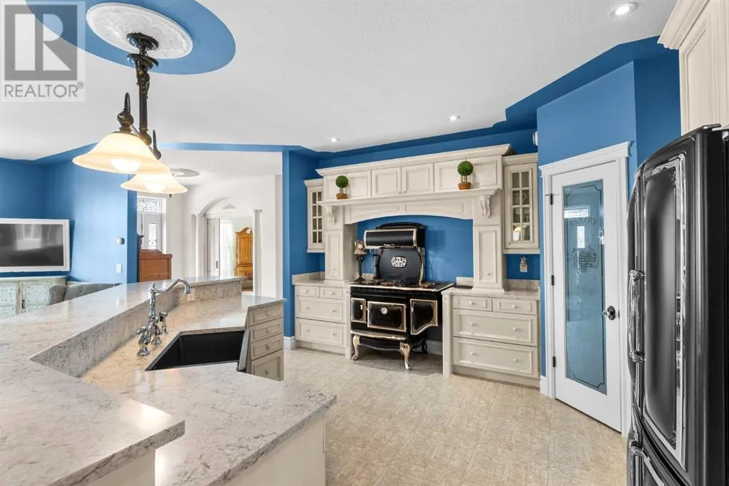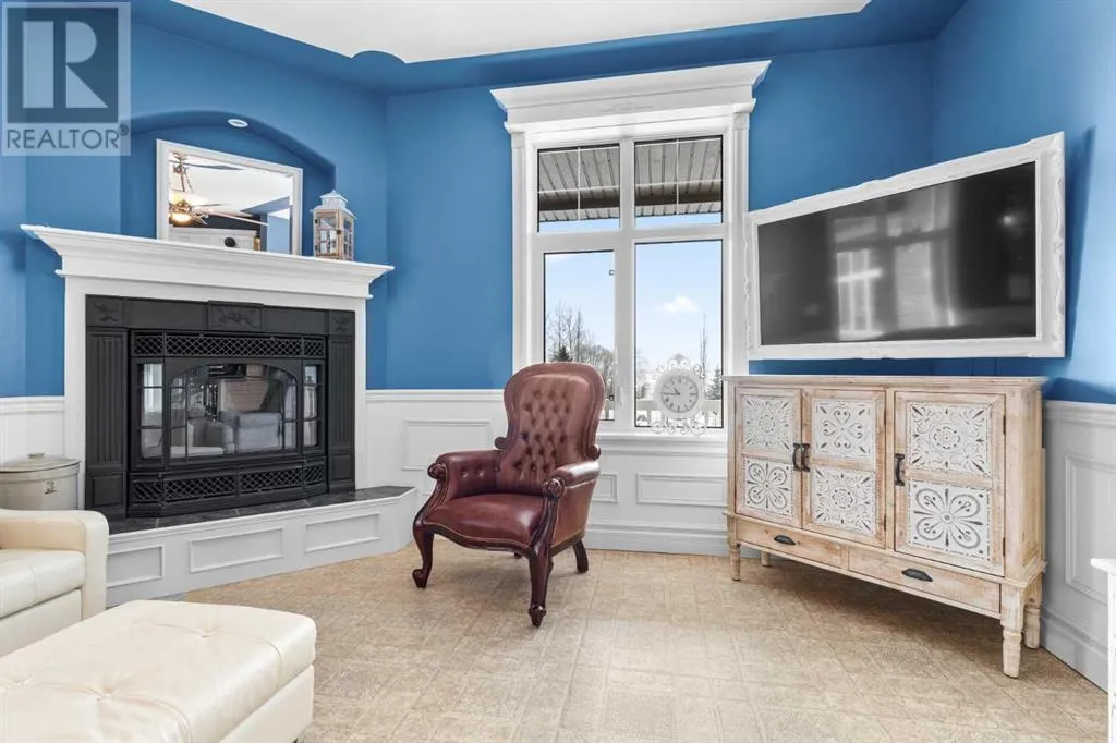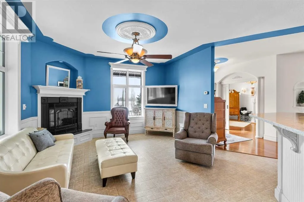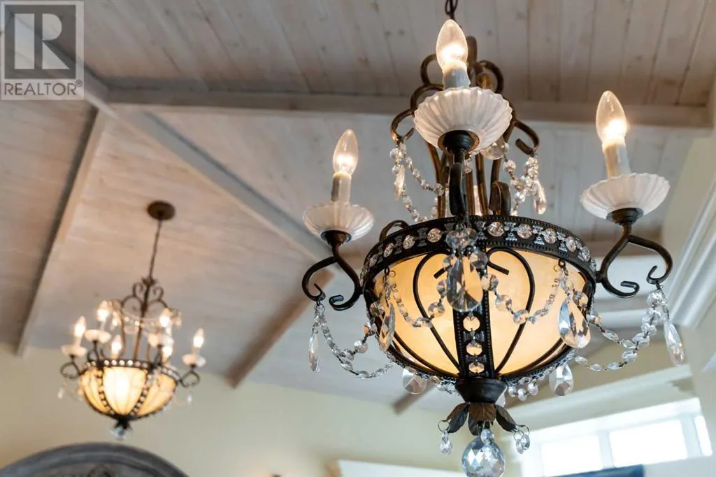 This beautifully landscaped 5.49-acre acreage offers exceptional potential for a small/medium-sized business and additional housing for extended or blended families. Located 5 minutes north of Didsbury, AB, and 10 minutes south of Olds, AB, just off Highway 2A, it boasts gorgeous mountain views. The main house, with 2,017 sq ft of French country charm, features crown moldings, barn and French doors, and hardwood floors. The spacious kitchen, updated in 2023, has a two-tiered island, quartz countertops, a farmhouse sink, hard wood floors and ample cabinet space. The main floor also includes a dining room, living room, covered maintenance-free veranda with an outdoor kitchen. Master bedroom with a 4-piece ensuite, fireplace, soaker tub, and walk-in closet. Additional spaces include a 2-piece bath, second bedroom, laundry room, mudroom, and garage entrance. The fully finished walk-out basement provides 1,735 sq ft, featuring 2 bedrooms, a media room, a 4-piece bath, a playroom, and storage. ICF construction, crown moldings, fresh paint (2023), and in-floor heating throughout enhance the home's appeal. The oversized, heated double garage has a paved driveway. The property includes a 6,400 sq ft shop (128' x 50') with three-phase power. Features include a 50âx24â drive-through wash bay with 12â overhead doors, a 50âx24â welding bay with a 16â overhead bay door and crane. 50âx80â main shop area with two 14â bay doors and 16â clearance. The shop also has a wood workshop, paint storage, front office space, and a 3-piece bathroom. A new boiler (2024) ensures in-floor heating. Above the woodworking shop, a spacious living area includes a kitchen, laundry, 4-piece bathroom, 3 bedrooms, a master bedroom with a walk-in closet, and a storage room. The mezzanine adds additional living space, perfect for additional family members. This exceptional property has been meticulously maintained and offers an unparalleled combination of country residential comfort and business potential. Whether you are seeking a spacious family home, a live-work opportunity, or a combination of both, this acreage provides a rare and sophisticated setting with limitless possibilities. (id:27476)