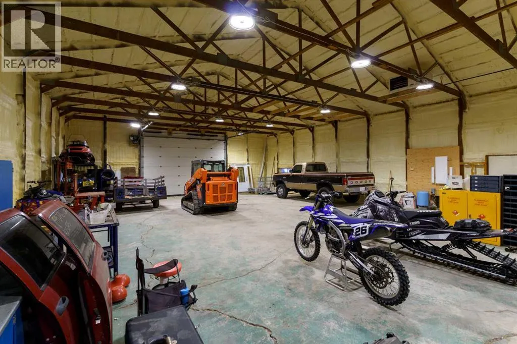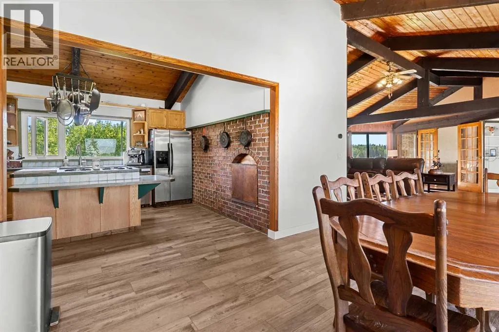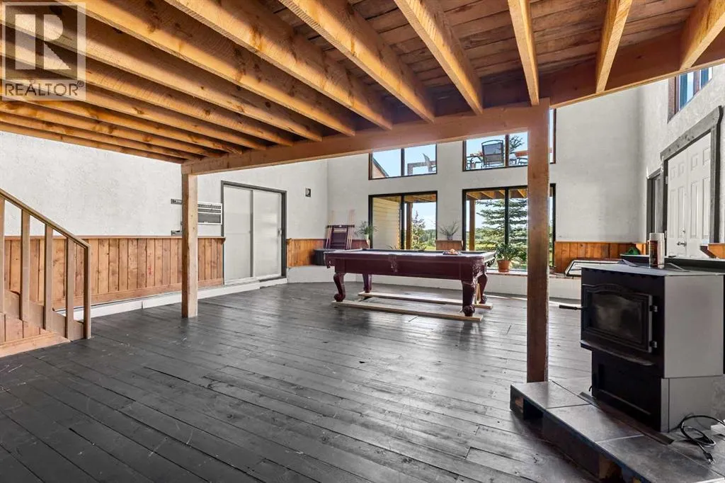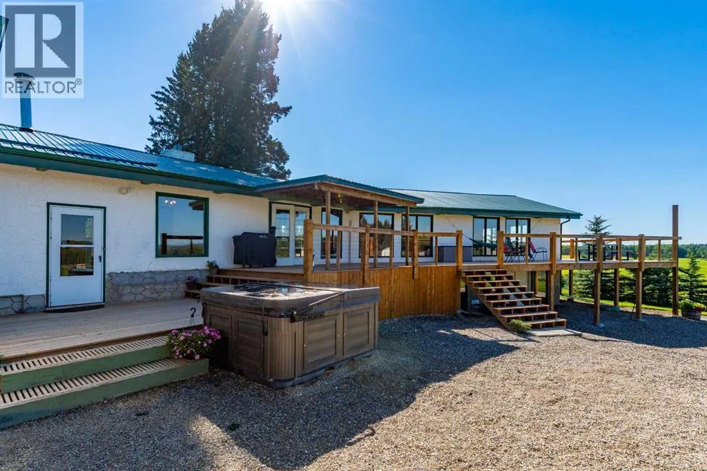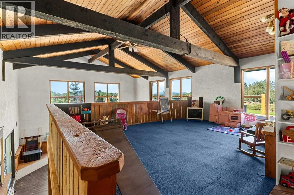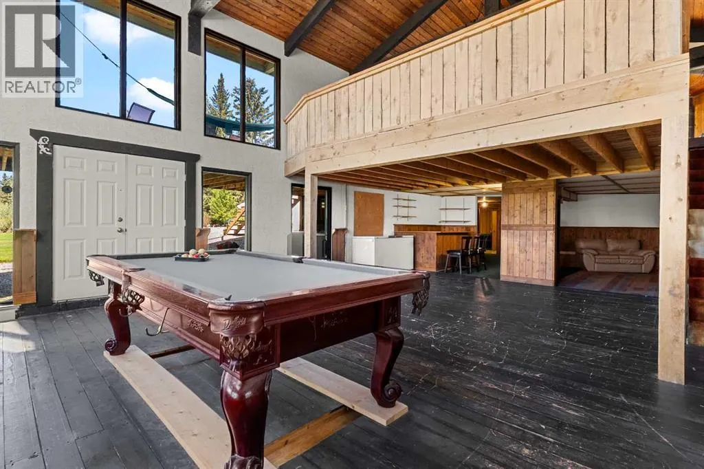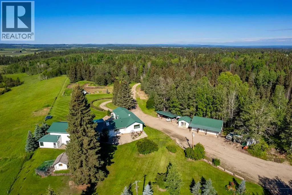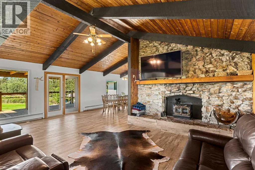 Welcome to your private 40 +/- acre rural oasis! A rare and versatile property that truly has it all. This beautifully finished walk-out bungalow offers 5,000+ Sq Ft, 6 bedrooms and 3 bathrooms. Upon entering the foyer, you will immediately notice the T&G CEDAR CEILING with dark accent BEAMS. To your left up a short run of stairs is access to 2 bedrooms plus the primary suite with 3-piece ensuite. Straight ahead is the main 4-piece bathroom, and then up another short run of stairs is your Kitchen and Dining spaces which is then open to a large living room offering an office nook with a picture window to the rec room and a WOOD BURNING FIREPLACE complete with a hearth, stone & wood mantel. Here you can also look west to your MOUNTAIN VIEWS. Through the living room is an additional rec/play space open to the lower level. This home offers a unique layout that has been optimized to suit a large family. Access to the basement is off the upper rec space or from the foyer. Downstairs you will find a 3-piece bathroom as well as a massive recreation/games space, complete with a PELLET STOVE, dry bar, and family room. From here a large STORAGE space connects you to 3 more bedrooms and the laundry room. With more recent UPDATES include vinyl plank flooring on the main floor, updated interior doors, new carpet & trim on the north side of the home, and updated main floor bathroom. This home is perfect for families or those who love to entertain while enjoying their own piece of rural paradise. This is a place where you come home from work and can truly unwind, while being able to support your inner child with plenty of recreational opportunities right here for you and the kiddos! No need to fight for a camping spot with what this parcel has to offer. The outdoors impress with an array of features including the convenience of a CARPORT right off the house, a large west DECK (partially covered) that wraps to the south side of the home, a 32'x24' HEATED GARAGE/WORKSHOP, multiple sh eds, a 24'x32' BARN for the horse lovers with finished LOFT (did someone say poker night)? Plus a 60'x42' HEATED SHOP with its own well, septic system, power, gas and RI for a bathroom! Explore WALKING TRAILS, a MOTOCROSS TRACK, and 2 large spring fed PONDS stocked with rainbow trout. All this plus a dock for swimming in summer and a perfect skating surface in winter for year-round enjoyment! The year round flowing creek that meanders through the land can be heard running in the background and adds to this property's retreat feel. With ~25 ACRES OF FENCED PASTURE, a lush garden, and abundant privacy, this property is a true rural haven just waiting for its next chapter. Enjoy the peace of rural living without feeling isolated â conveniently located just off pavement, only 10 minutes to the community of Sundre & only 30 minutes to the larger center of Olds. GST due diligence required. (id:27476)