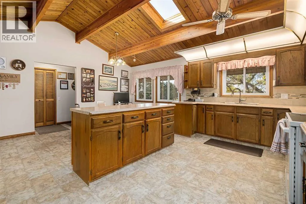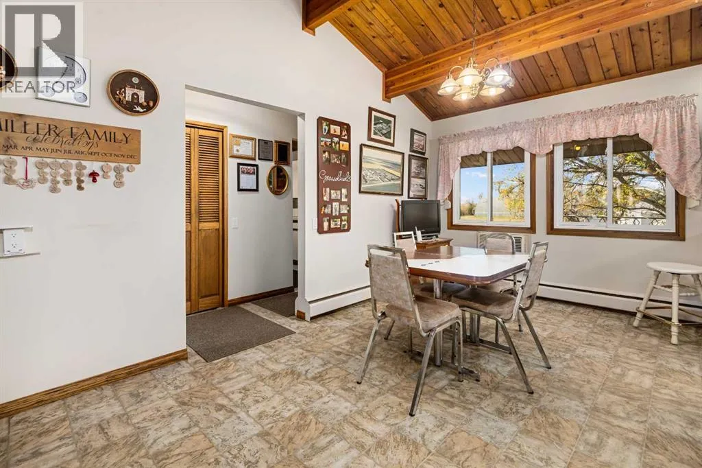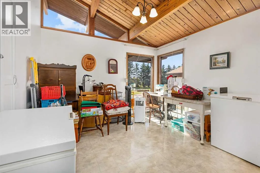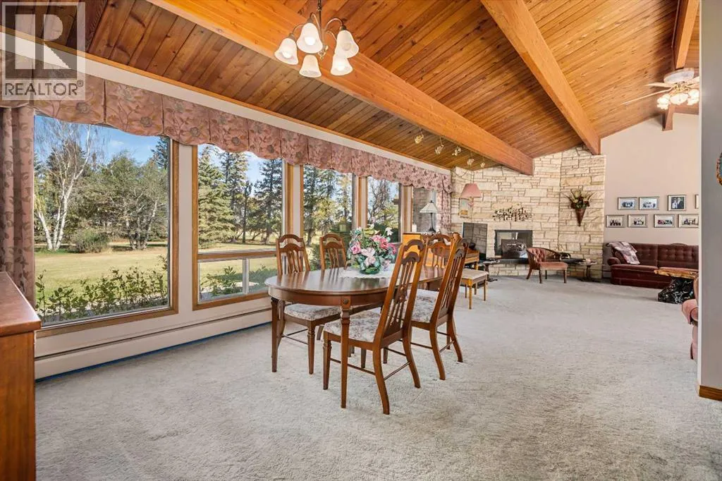 Tucked away among mature trees, this beautifully maintained acreage offers the perfect blend of privacy, space & convenience, just 37 mins to Calgary Airport, 26 mins to Airdrie, under 50 mins to downtown Calgary & 17 mins to Crossfield. This sprawling bungalow on 5.56 acres has over 6,300 sq ft of living space (3,237 sq ft up + 3,126 sq ft down), making it an incredible opportunity for large families or multi-generational living, with solid bones & endless potential to personalize. Inside youâll find 5 bedrooms up(one can be an office or flex space) & 2 down, 3.5 bathrooms up & 1 full bath down, vaulted wood ceilings throughout the main level, a large kitchen overlooking the breakfast nook, a massive family room with stone faced wood burning fireplace, & patio doors leading to a private concrete patio, a bright living room also with stone faced wood burning fireplace & formal dining area, & a main-floor laundry room with sink & cabinetry for convenience off the back entry & garage. The fully finished basement is designed for entertaining & flexible living, featuring a huge rec/family room with another stone wood-burning fireplace & adjacent wet bar, 2 bedrooms, full bathroom, cold room, kitchenette, additional living/games room, flex space & a large storage area, plus stairs to access to the garage directly. Outside, the property impresses with a 72x40 heated, insulated Quonset with concrete floor, a 40x30 detached garage & a 24x24 attached garage, along with a huge garden area perfect for growing your own food & room for animals or recreation. Additional highlights include newer shingles & 2 zoned boilers with thermostats throughout the home for efficient comfort. This acreage is the perfect place to raise a family, create your dream hobby farm, or simply enjoy the serenity of country living with quick access to nearby communities & city amenities. (id:27476)