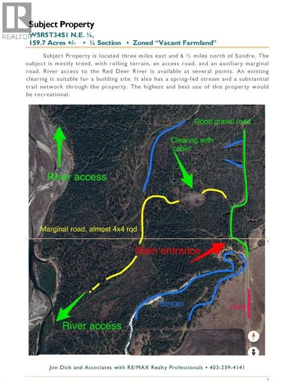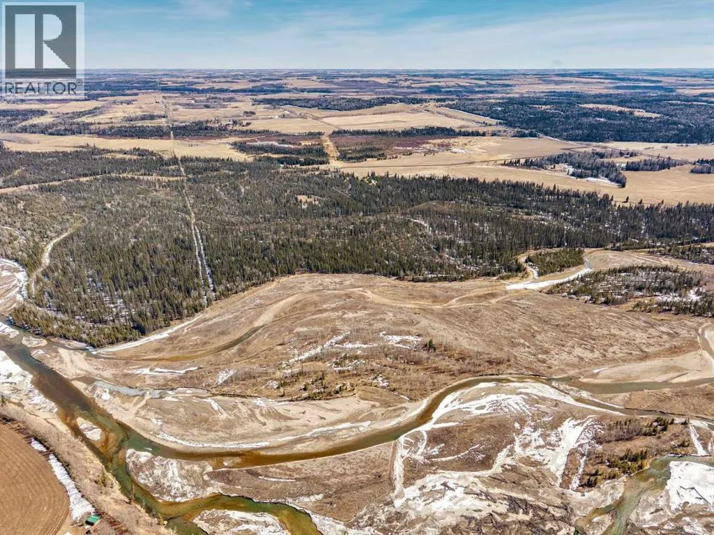 This highly secluded quarter section is currently zoned as Vacant Farmland and is conveniently located just 15 minutes from Sundre. The property offers a unique opportunity for a private retreat, ideal for building a residence or cabin, recreational activities such as hunting or fishing, or family camping. The southeast corner is suitable for hay production. A spacious clearing with direct road access provides an excellent location for construction or gatherings, while the remaining area is densely wooded with multiple trails for walking, mountain biking, or dirt biking. The Red Deer River borders the entire west side of the land, with several access points, including a road accessible for four-wheel drive vehicles. There is a year-round spring creek with trout and a dug-out swimming hole on site. The property ensures exceptional privacy, bordered by crown land to the north and situated on a dead-end road with only one neighbouring parcel to the northeast. This is a rare opportunity to acquire a substantial river-access property in a distinctly private setting. Please do not access the property without prior permission. (id:27476)