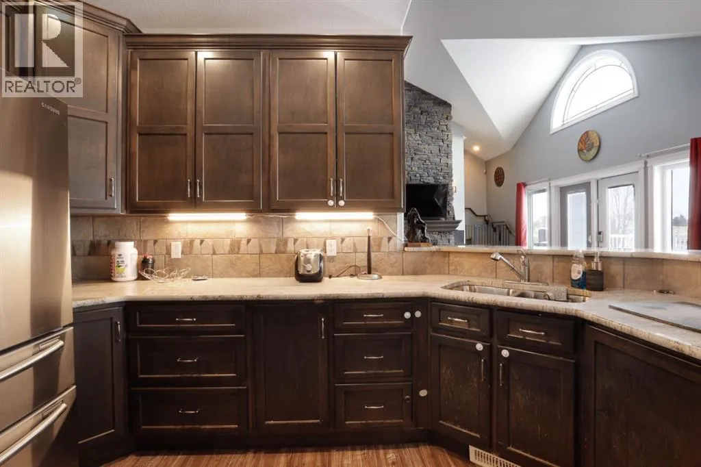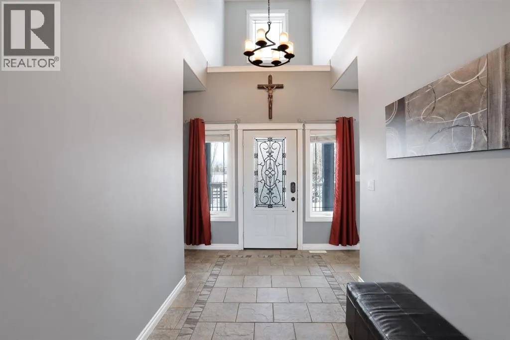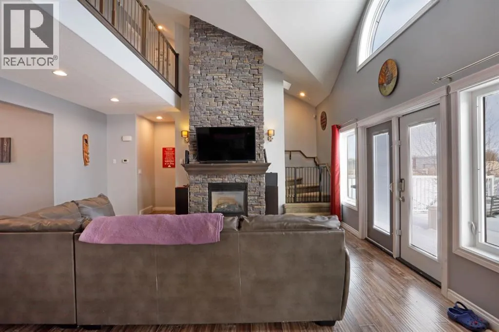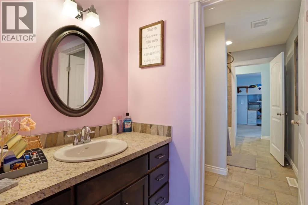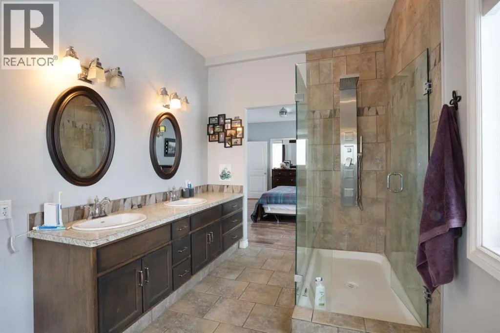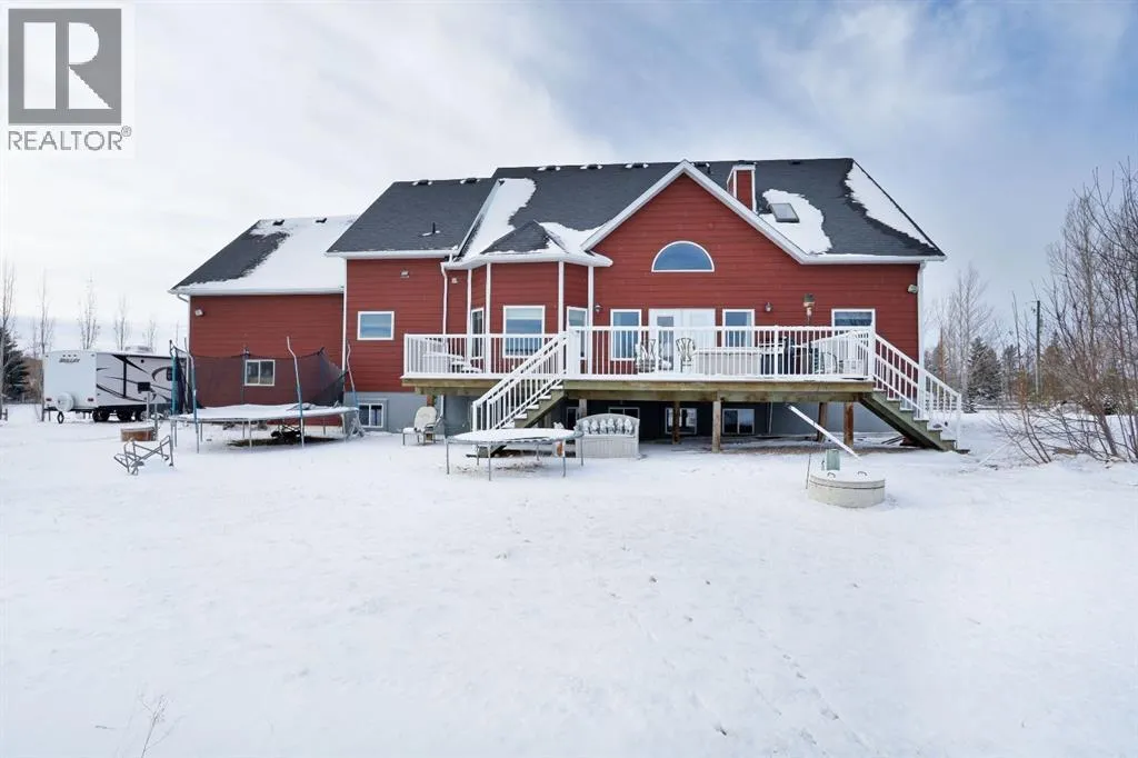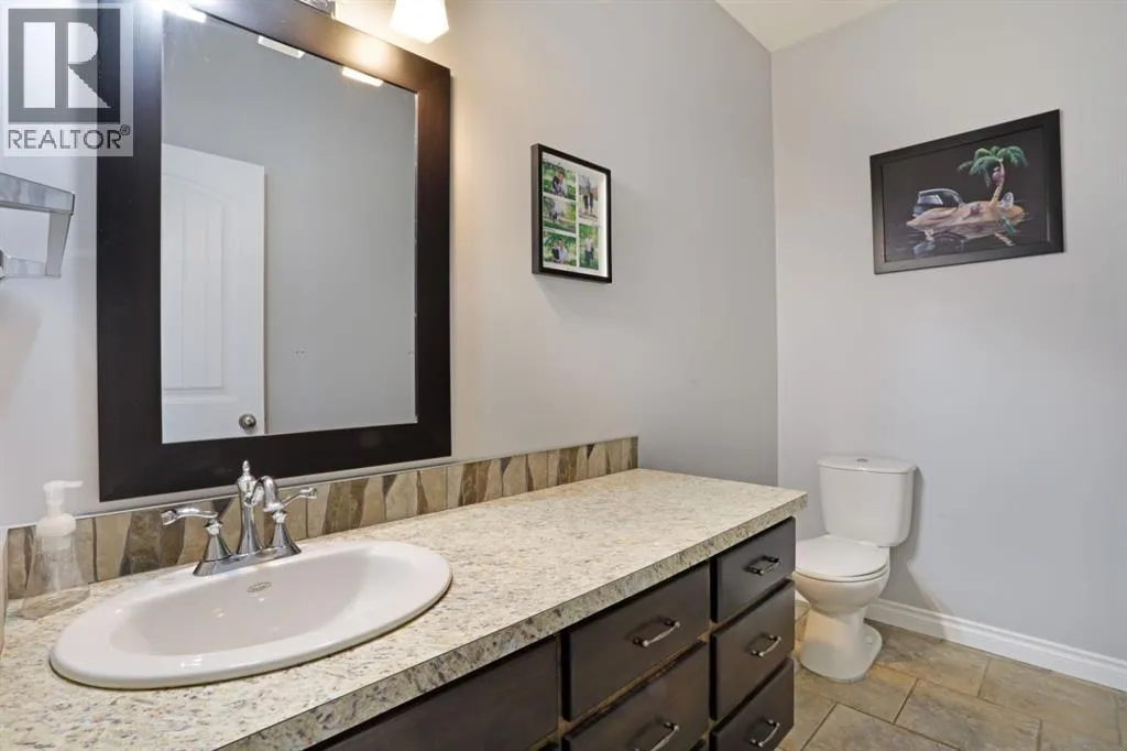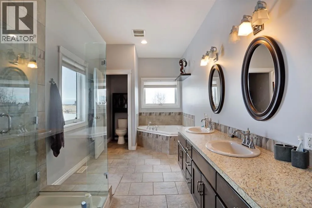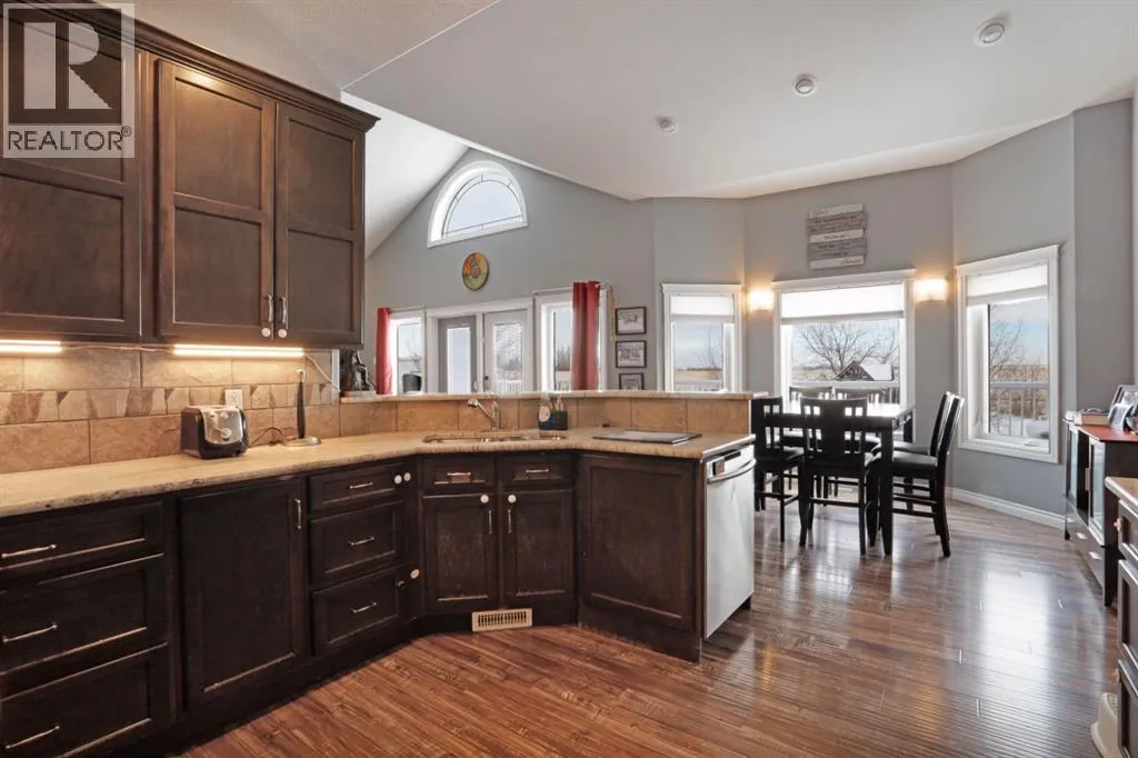 Located in the desirable Mortensen subdivision just six kilometres south of Brooks and minutes from Lake Newell, this property offers a standout blend of space, comfort and convenience. Surrounded by peaceful prairie views, the area features a nearby canal and a trout pond, creating a calm and family friendly atmosphere on a beautiful 1.66 acre parcel. This bright and inviting one and a half storey home features an attached heated triple car garage and a wonderfully designed main floor that feels open the moment you step inside. The spacious entry with its skylight sets the tone, leading into a sun filled layout with vaulted ceilings that elevate the great room. A striking floor to ceiling gas fireplace adds warmth and character, while the kitchen and dining area overlook the backyard and showcase granite countertops, espresso cabinetry, an eat up island, a walk in pantry and convenient main floor laundry just off the garage. The primary suite is located on the main level and offers a generous five piece ensuite and walk in closet, creating a relaxing retreat. A second bedroom on this floor is currently set up as an office. The full width west facing front porch is made for evening sunsets and quiet moments outside.The second floor continues to impress with two spacious bedrooms, excellent storage and a shared Jack and Jill bathroom, each with its own vanity area. This level overlooks the great room below, giving the entire space an open, airy and connected feel. The basement is built for fun and unforgettable nights in. The spacious family room comes complete with a pool table that is included, making it instantly ready for game nights and gatherings. A dedicated media or movie room brings the theatre experience home, and this level also features a bedroom, a full four piece bathroom and a utility room. Thereâs even enough room to create a second bedroom if you need more space. Step outside and enjoy everything acreage living has to offer. A large deck overlooks th e beautiful backyard and side yard, perfect for relaxing, hosting or watching the kids play. The property includes underground sprinklers, air conditioning, a natural gas BBQ line and a great play set. With open views of both sunrise and sunset, every day feels special. There is also tons of parking and RV hookups for all your toys and guests. This is acreage living at its best in a fantastic subdivision just minutes from town. (id:27476)