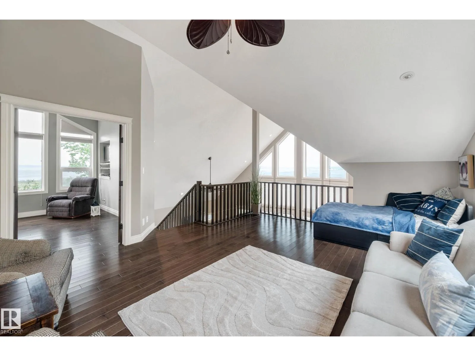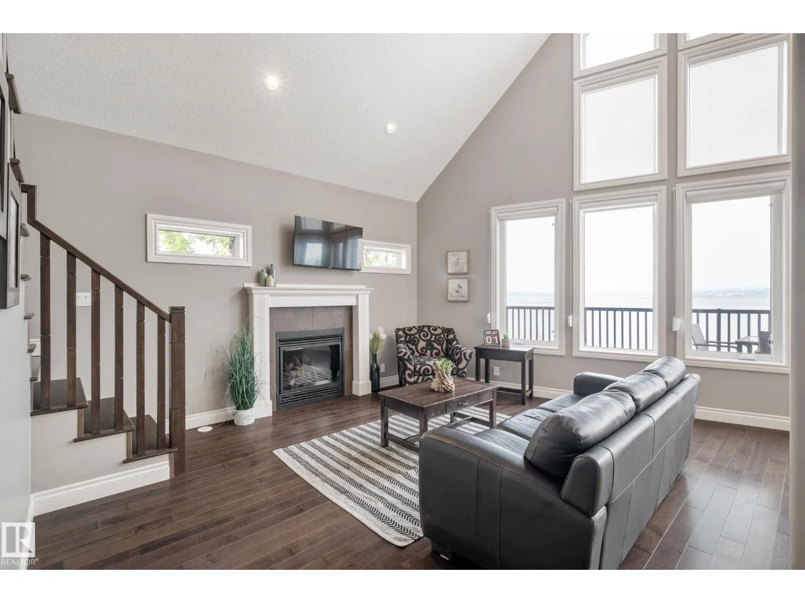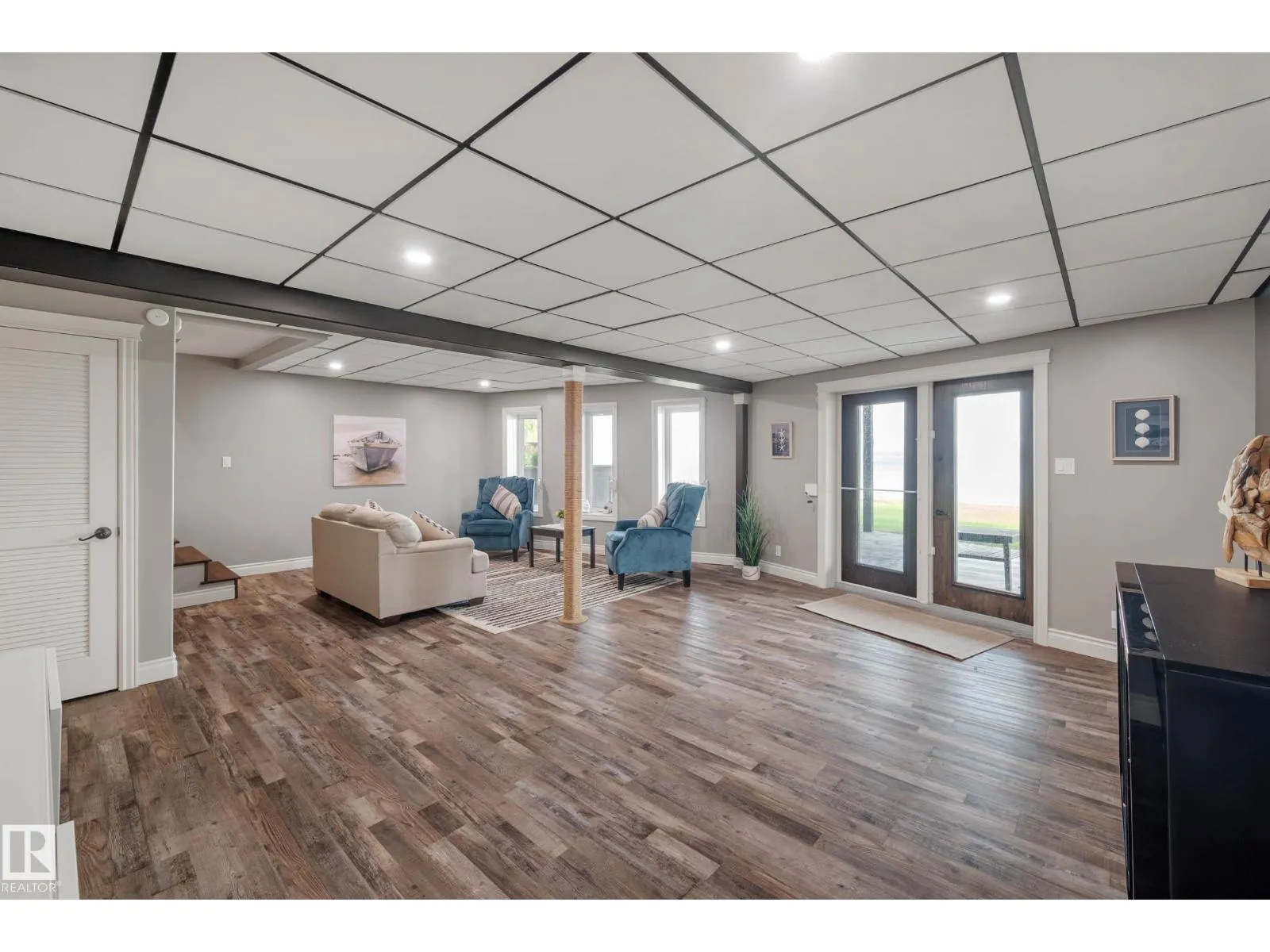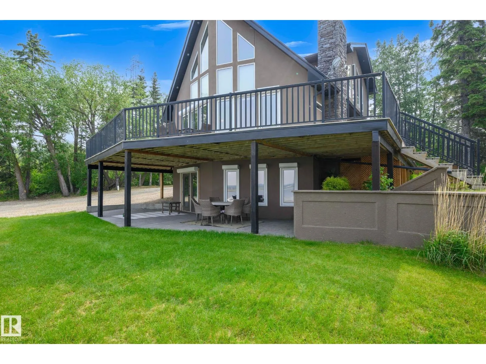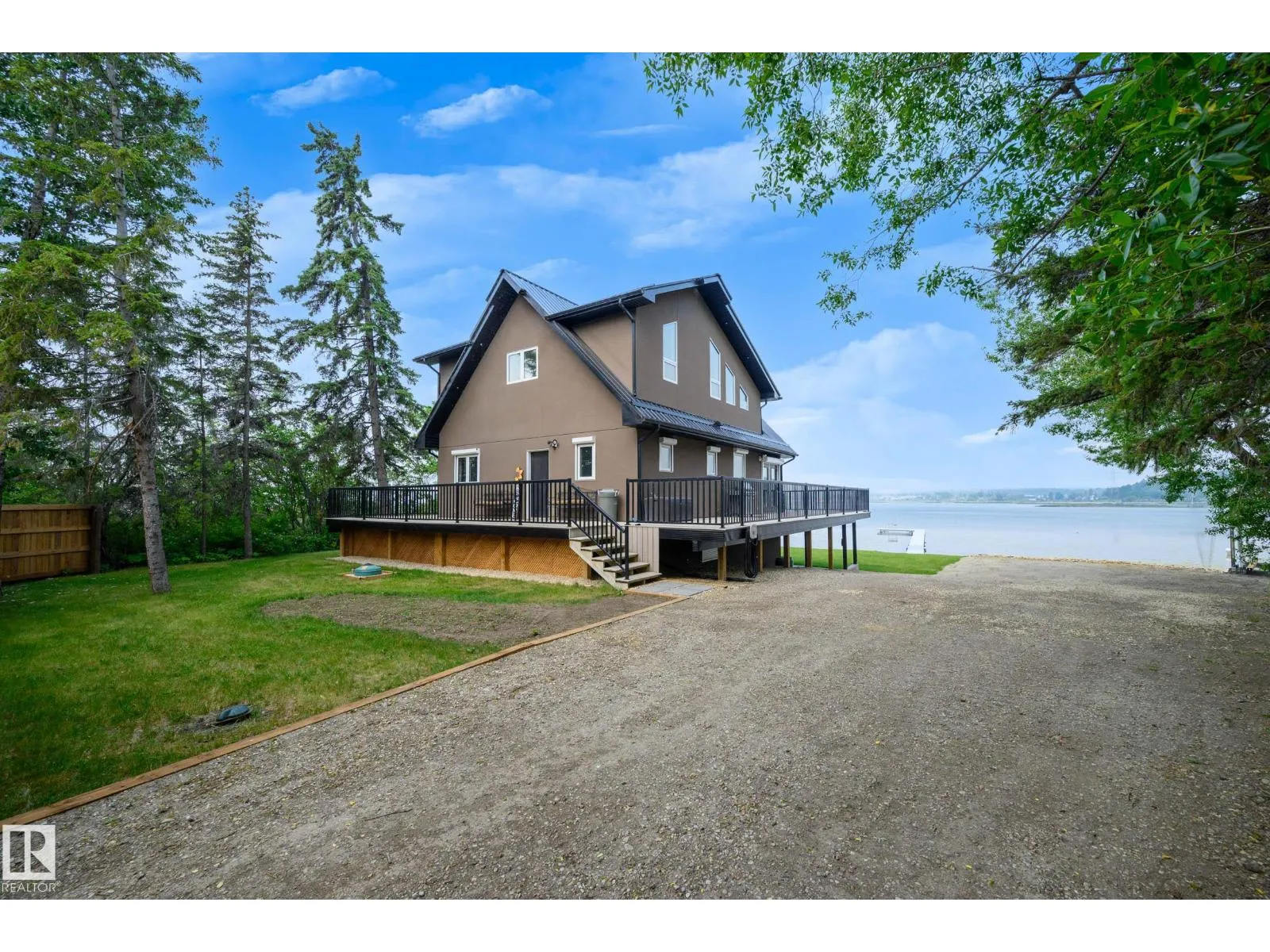 Enjoy this year-round lakefront living with 220 ft of private shoreline and southwest exposure beside a protected bird sanctuary. This rare flat, sun-soaked lot features a stunning A-frame with 1,800 sq ft above grade and over 2,800 sq ft of total space, including a developed walkout basement. The main floor boasts an open-concept kitchen and great room with hardwood floors, gas fireplace, and lake views, plus a bedroom, 3-pc bath, and laundry. The chefâs kitchen offers espresso cabinetry, stainless steel appliances, corian counters, pantry, and prep island with eating bar. Upstairs, a loft and serene primary suite with ensuite provide the perfect retreat. The basement adds a large rec room, spacious bedroom, 4-pc bath, and walkout to a stamped concrete patio, private yard, and beach. Freshly painted with central A/C, central vac, shutters, alarm, RV parking, and new secure fence and gate. A perfect year-round retreat! (id:27476)