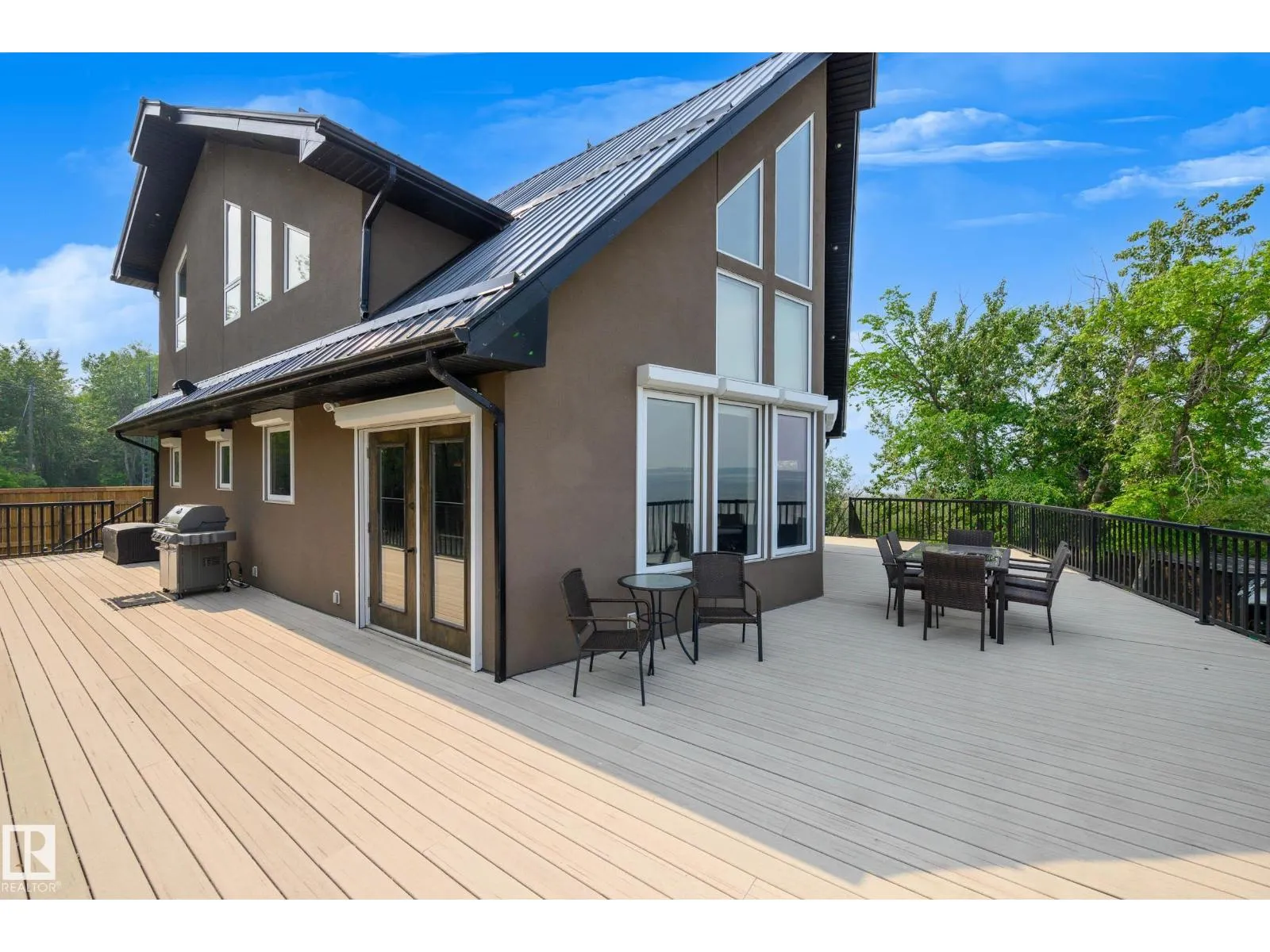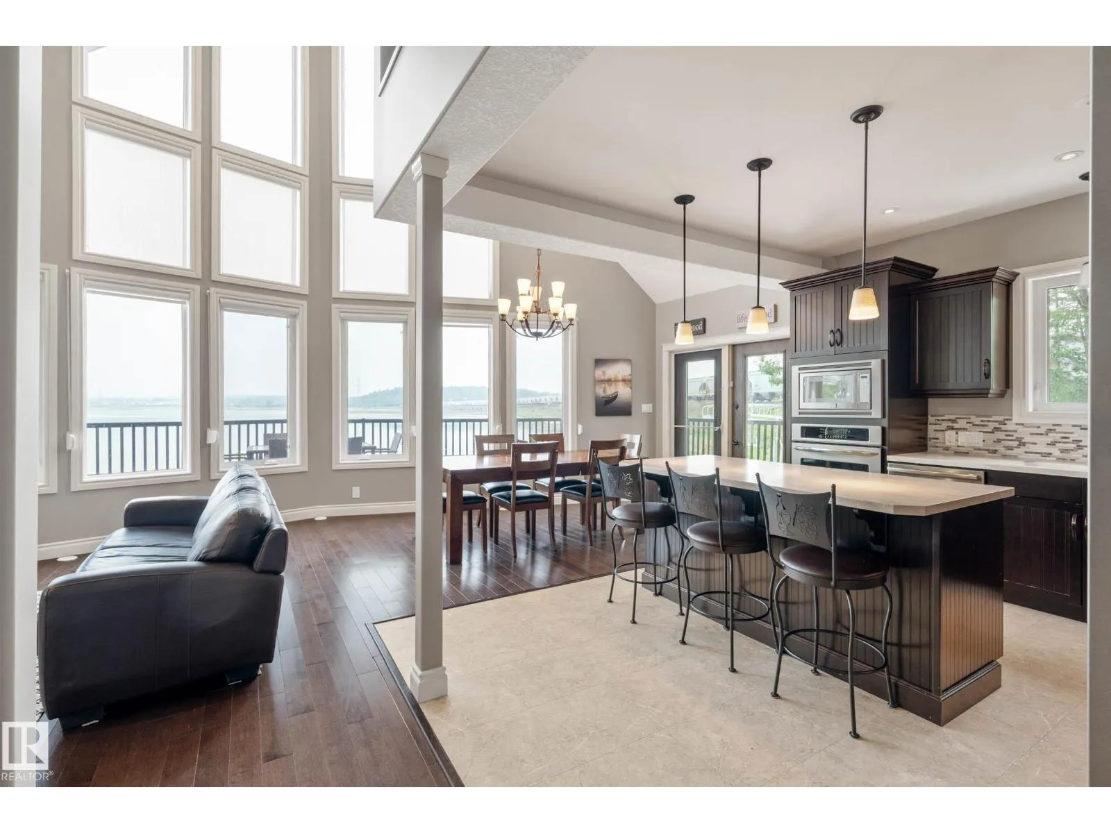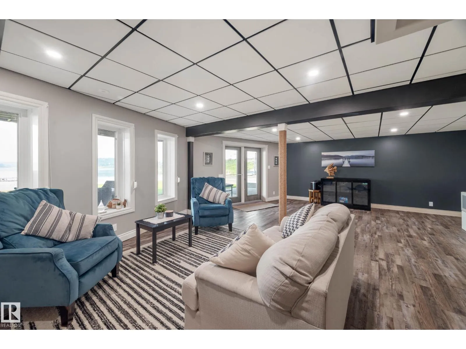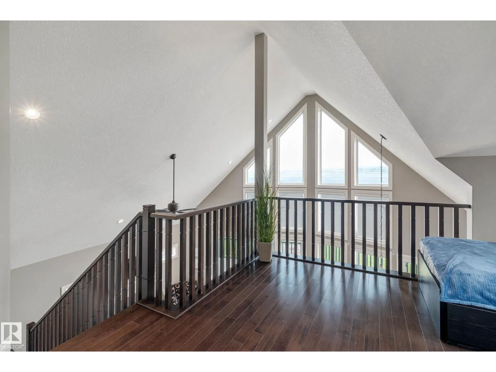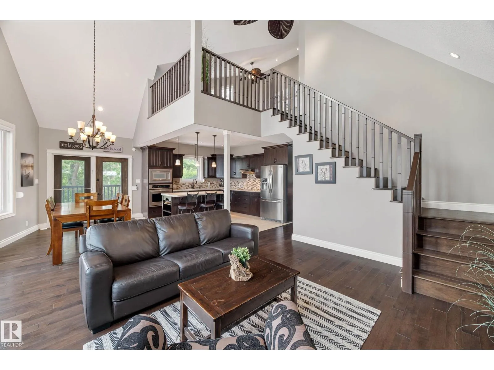 Enjoy this year-round lakefront living with 220 ft of private shoreline and southwest exposure beside a protected bird sanctuary. This rare flat, sun-soaked lot features a stunning A-frame with 1,800 sq ft above grade and over 2,800 sq ft of total space, including a developed walkout basement. The main floor boasts an open-concept kitchen and great room with hardwood floors, gas fireplace, and lake views, plus a bedroom, 3-pc bath, and laundry. The chefâs kitchen offers espresso cabinetry, stainless steel appliances, corian counters, pantry, and prep island with eating bar. Upstairs, a loft and serene primary suite with ensuite provide the perfect retreat. The basement adds a large rec room, spacious bedroom, 4-pc bath, and walkout to a stamped concrete patio, private yard, and beach. Freshly painted with central A/C, central vac, shutters, alarm, RV parking, and new secure fence and gate. A perfect year-round retreat! (id:27476)