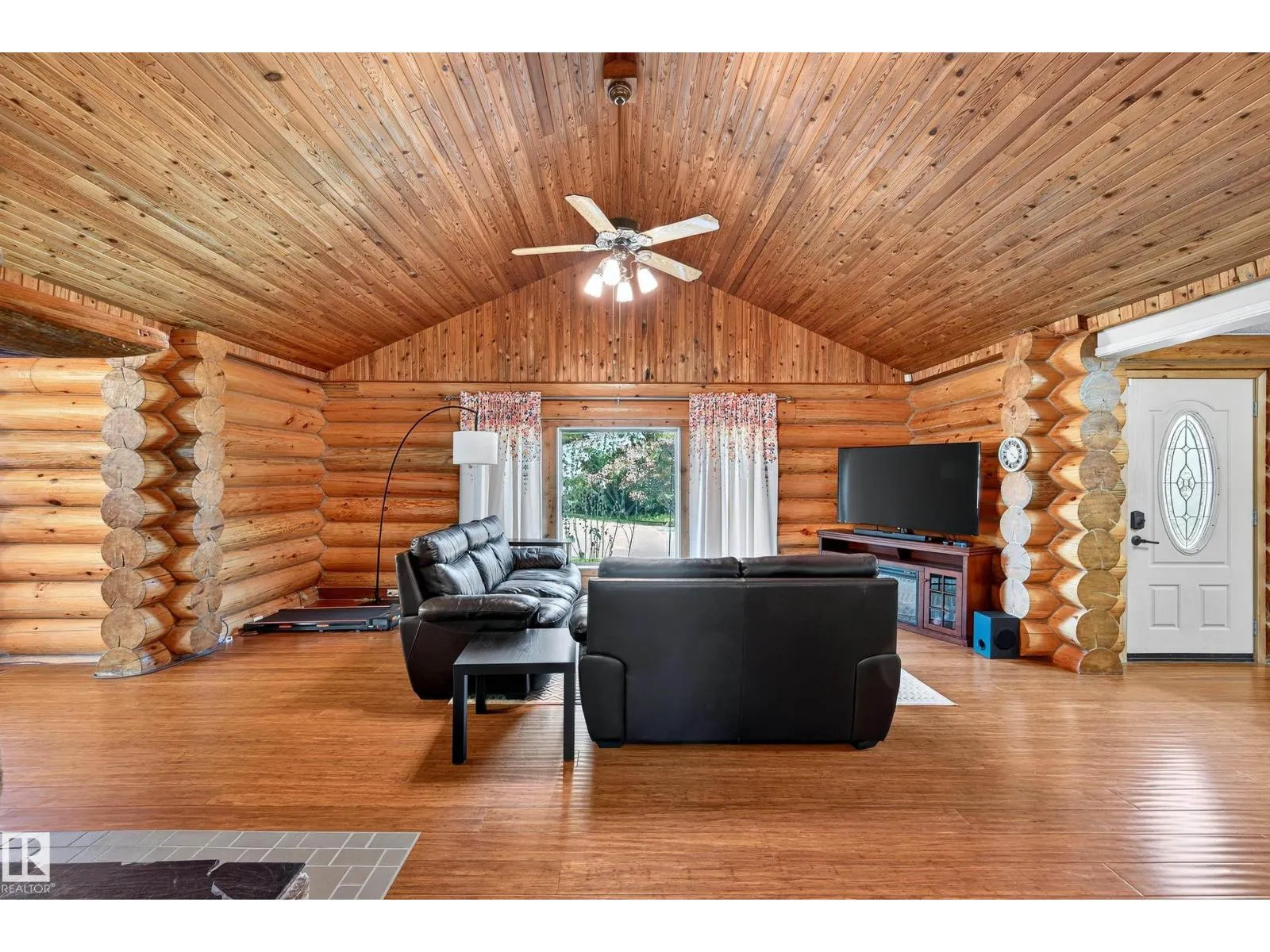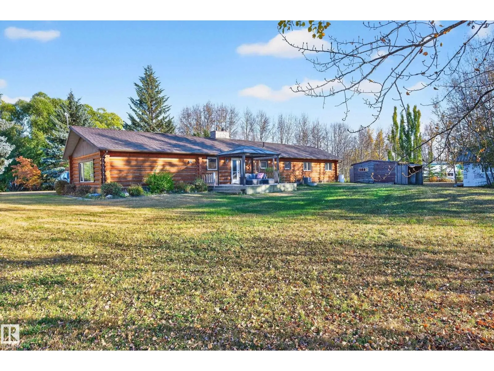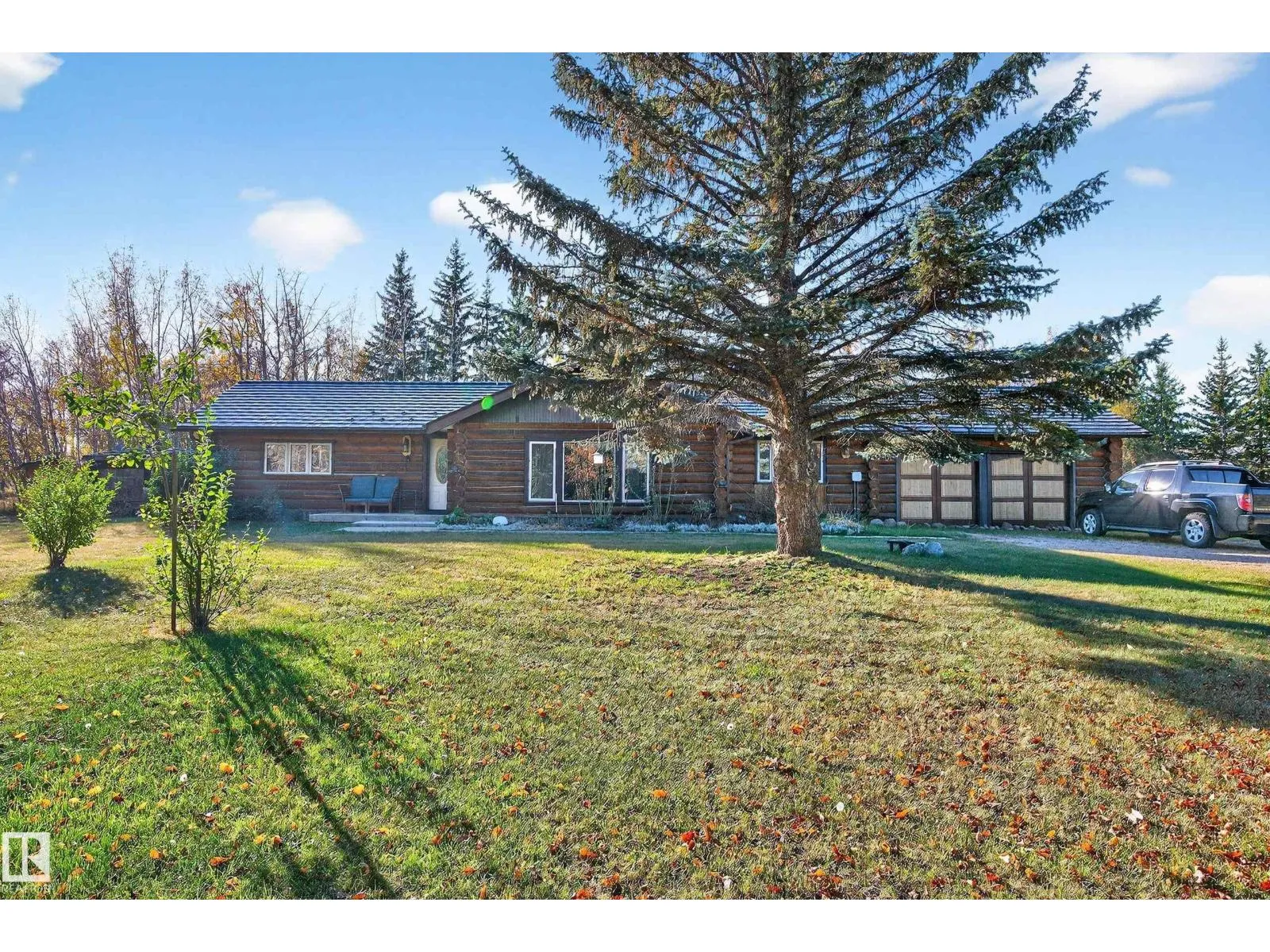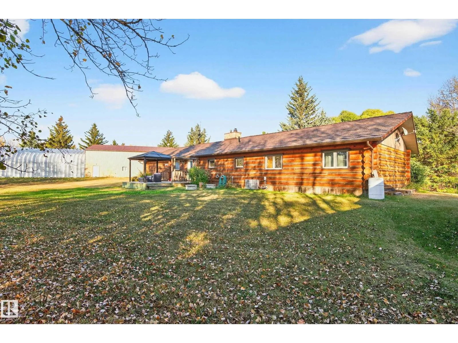 Stunning 2,034 sq.ft log bungalow on 2.06 private acres in Spanish Oaks, just off Hwy 60 and minutes from Edmonton! This beautifully upgraded home features vaulted ceilings, hand-carved bamboo flooring, a cozy wood-burning fireplace, modern kitchen with built-in appliances, 3 spacious bedrooms, 2 living rooms, and a formal dining area. Recent upgrades include a metal roof, triple-paned windows, furnace, hot water tank, pressure tank, flooring, and full log treatment. Outside, enjoy a 28' x 50' shop with radiant heat, 14' high door, 220 power, 200 amp service, floor drains & room to park your RV indoors! Additional features: $150K in recent upgrades, new HVAC, water treatment system, oversized heater, 8x10 & 16x16 sheds, a 16x24 powered clubhouse, and a large storage Quonset. The landscaped yard includes fruit trees, perennials, a large deck, firepit & garden area. Located at the end of a quiet cul-de-sac, this incredible property offers privacy, functionality & charm. A rare find! (id:27476)