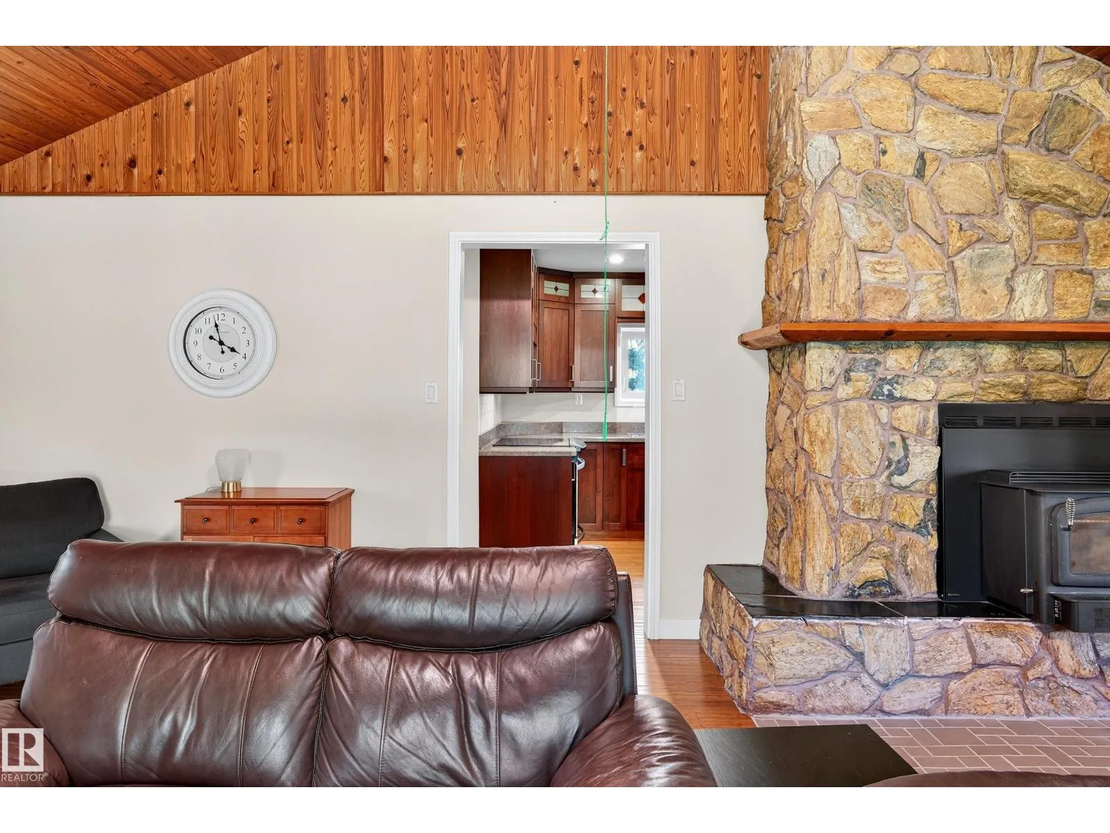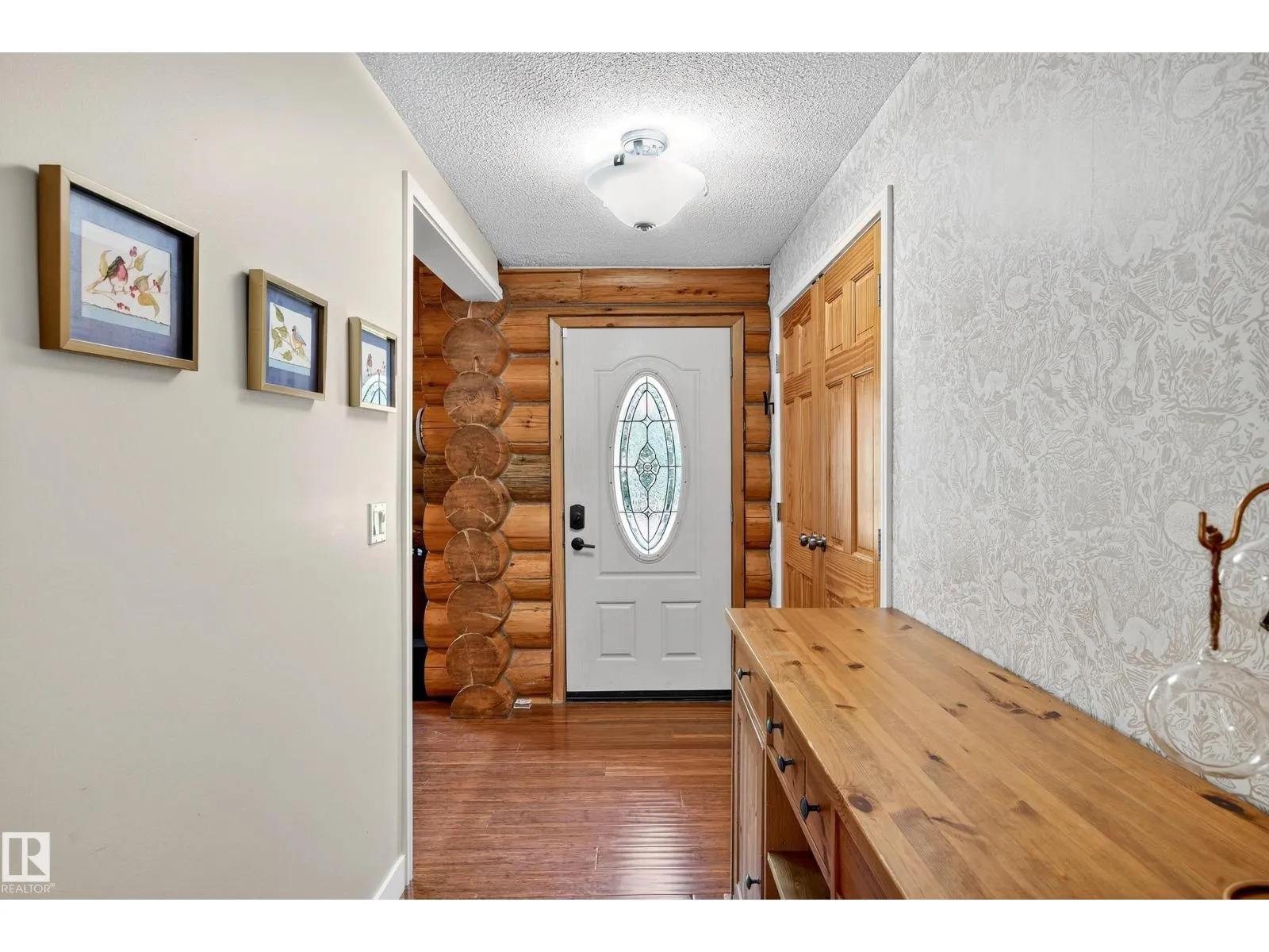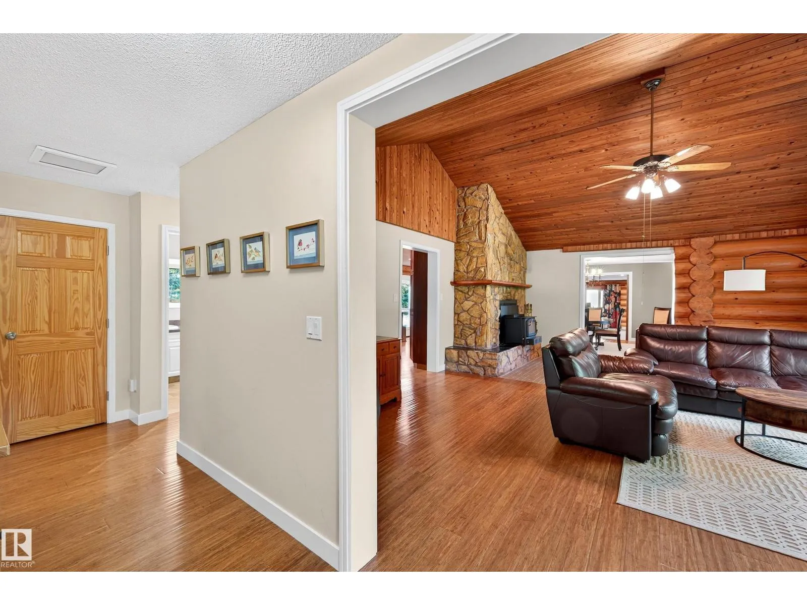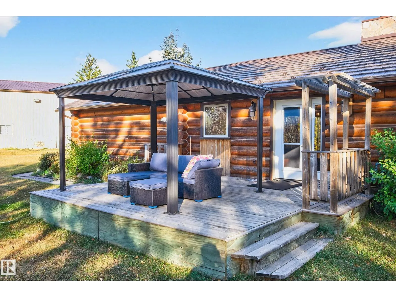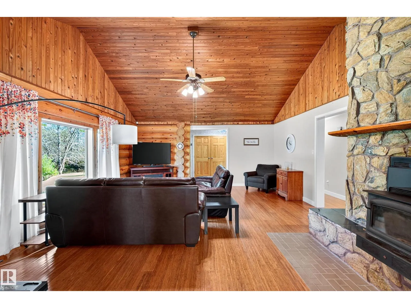 Stunning 2,034 sq.ft log bungalow on 2.06 private acres in Spanish Oaks, just off Hwy 60 and minutes from Edmonton! This beautifully upgraded home features vaulted ceilings, hand-carved bamboo flooring, a cozy wood-burning fireplace, modern kitchen with built-in appliances, 3 spacious bedrooms, 2 living rooms, and a formal dining area. Recent upgrades include a metal roof, triple-paned windows, furnace, hot water tank, pressure tank, flooring, and full log treatment. Outside, enjoy a 28' x 50' shop with radiant heat, 14' high door, 220 power, 200 amp service, floor drains & room to park your RV indoors! Additional features: $150K in recent upgrades, new HVAC, water treatment system, oversized heater, 8x10 & 16x16 sheds, a 16x24 powered clubhouse, and a large storage Quonset. The landscaped yard includes fruit trees, perennials, a large deck, firepit & garden area. Located at the end of a quiet cul-de-sac, this incredible property offers privacy, functionality & charm. A rare find! (id:27476)
