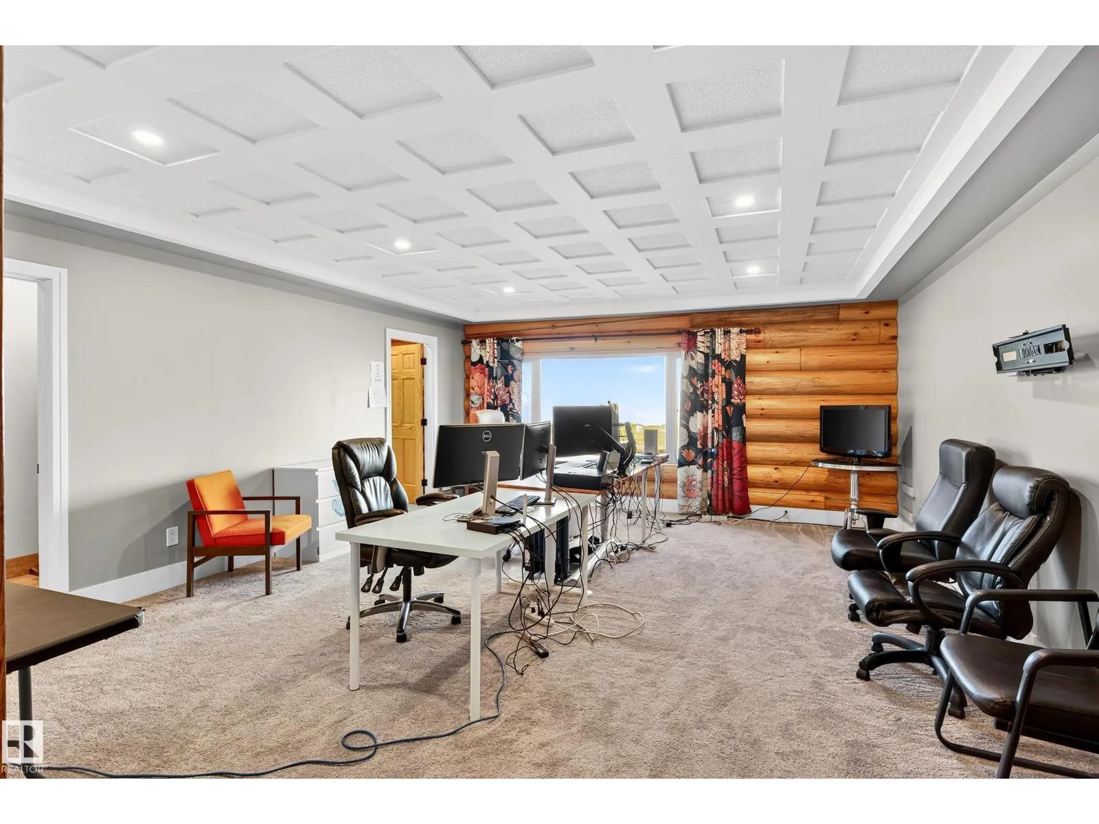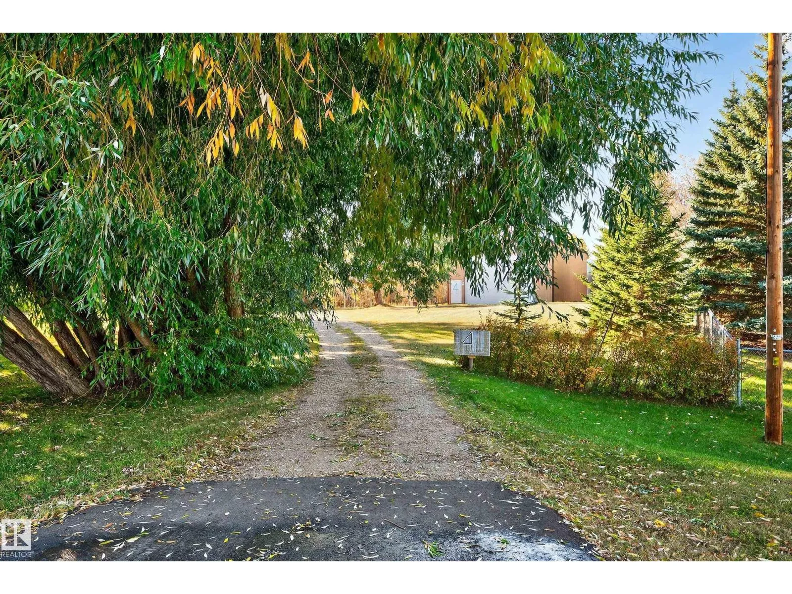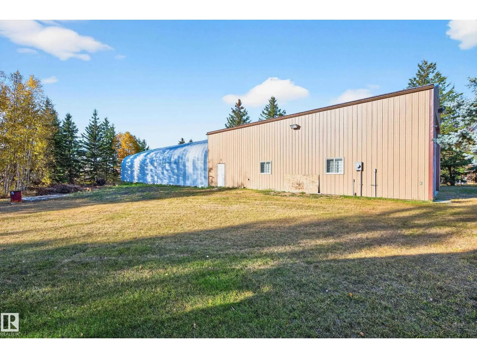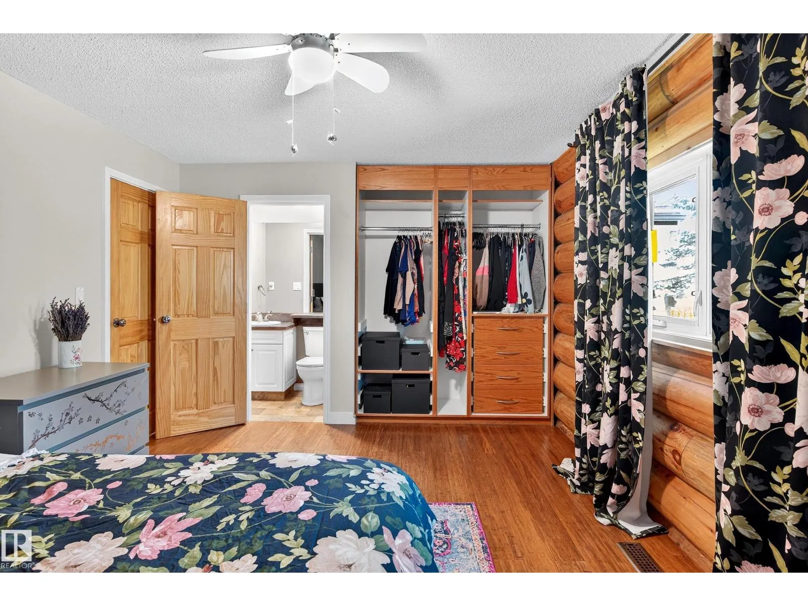 Stunning 2,034 sq.ft log bungalow on 2.06 private acres in Spanish Oaks, just off Hwy 60 and minutes from Edmonton! This beautifully upgraded home features vaulted ceilings, hand-carved bamboo flooring, a cozy wood-burning fireplace, modern kitchen with built-in appliances, 3 spacious bedrooms, 2 living rooms, and a formal dining area. Recent upgrades include a metal roof, triple-paned windows, furnace, hot water tank, pressure tank, flooring, and full log treatment. Outside, enjoy a 28' x 50' shop with radiant heat, 14' high door, 220 power, 200 amp service, floor drains & room to park your RV indoors! Additional features: $150K in recent upgrades, new HVAC, water treatment system, oversized heater, 8x10 & 16x16 sheds, a 16x24 powered clubhouse, and a large storage Quonset. The landscaped yard includes fruit trees, perennials, a large deck, firepit & garden area. Located at the end of a quiet cul-de-sac, this incredible property offers privacy, functionality & charm. A rare find! (id:27476)