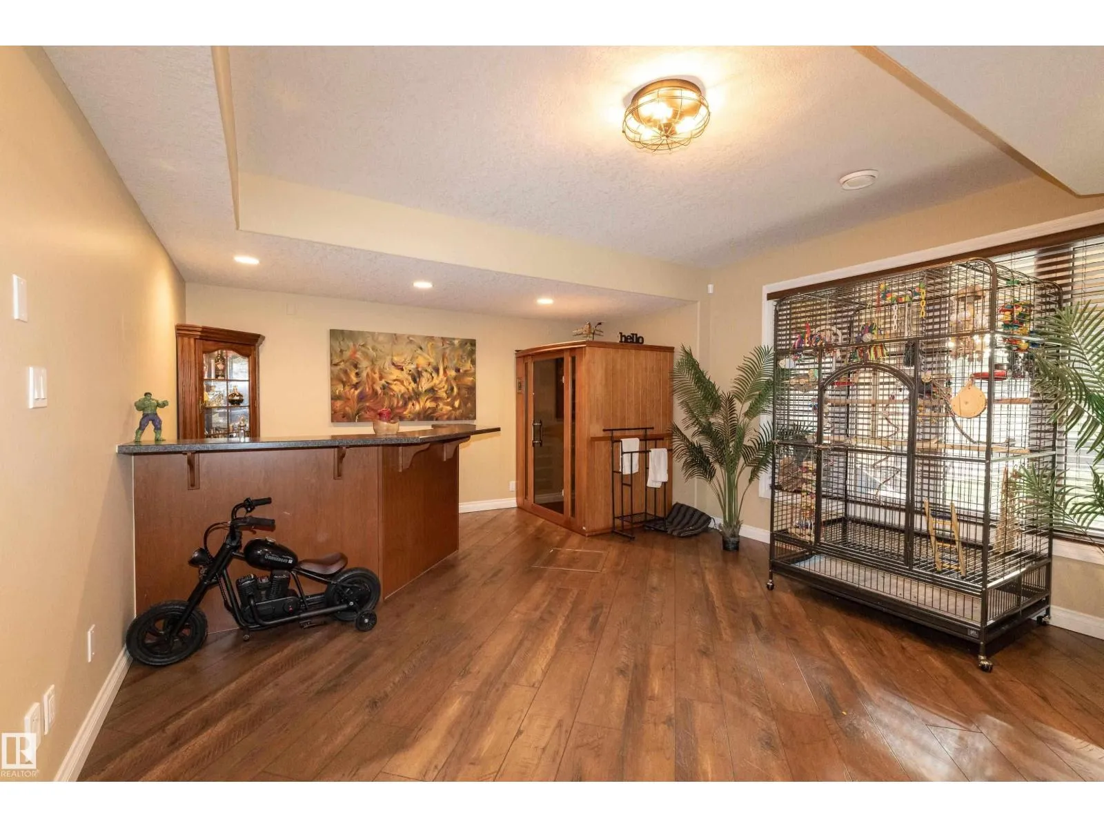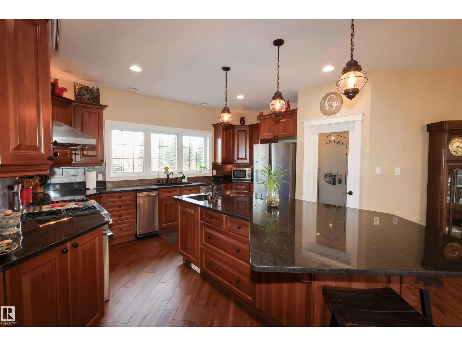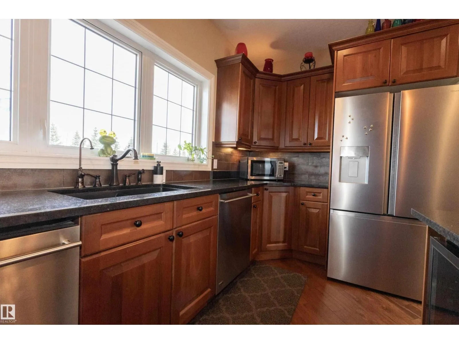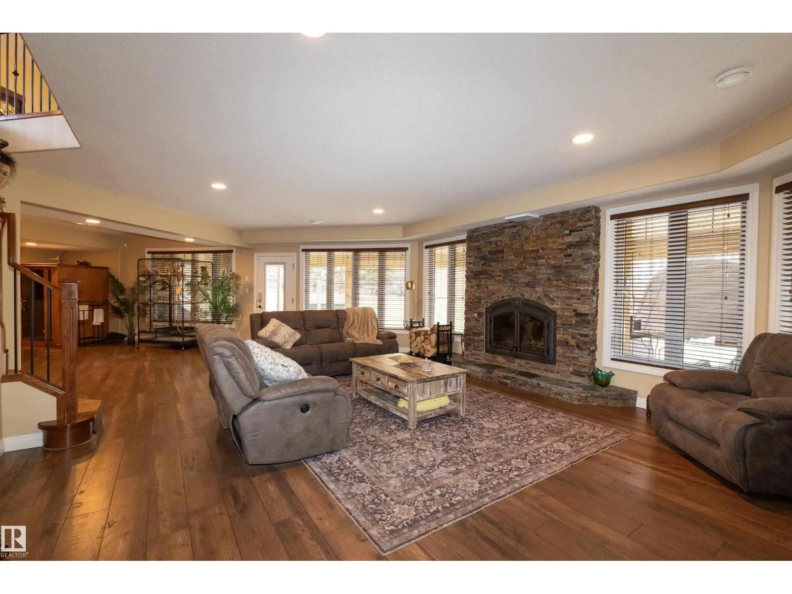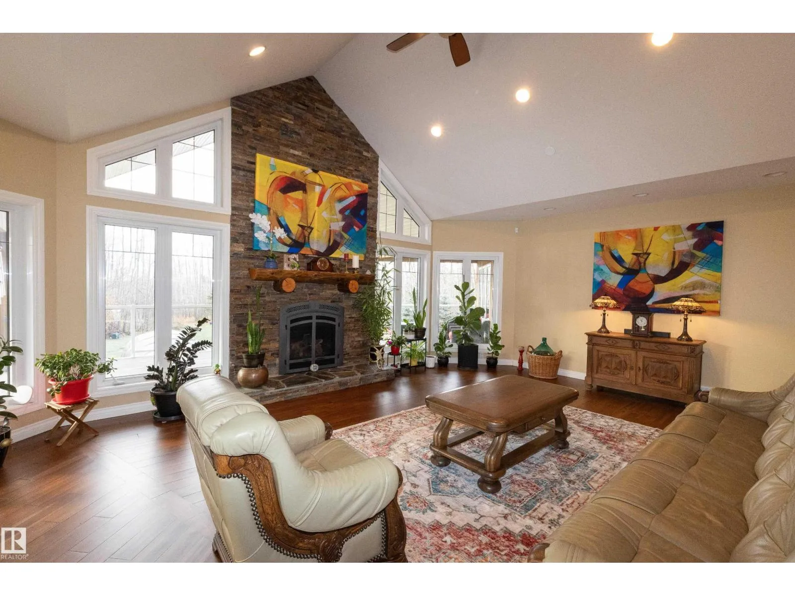 This one-of-a-kind bungalow offers a warm, lodge-like feel with vaulted ceilings, an open-concept design, and large windows that overlook the beautifully landscaped, private backyard. The main floor features new hardwood floors, a spacious primary suite with a two-person shower, soaker tub, and direct access to a 600 sq ft patio. A large den provides flexibility as a second bedroom or home office. The walkout basement includes in-floor heating, a wet bar, and three generous bedrooms with access to a lower patio finished in epoxy. Recent upgrades include a new roof, new paved driveway, new garage doors, new taps, new pressure tank, glycol system, and septic tank blower. Additional highlights include A/C, charcoal water filtration, 3-stage water reclamation septic system, and gutter covers. The massive 44x30 ft garage sits on a full foundation with a half bath and potential for a mechanicâs pit or lower-level expansion. Outdoor living is elevated with a new fence, a cement pad with swim spa & much more! (id:27476)