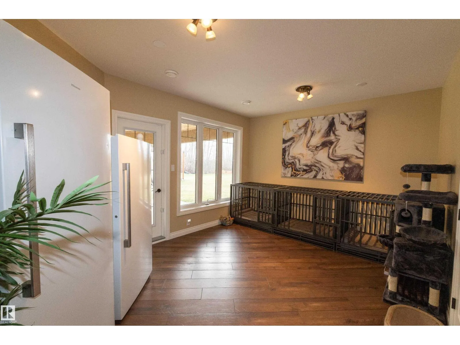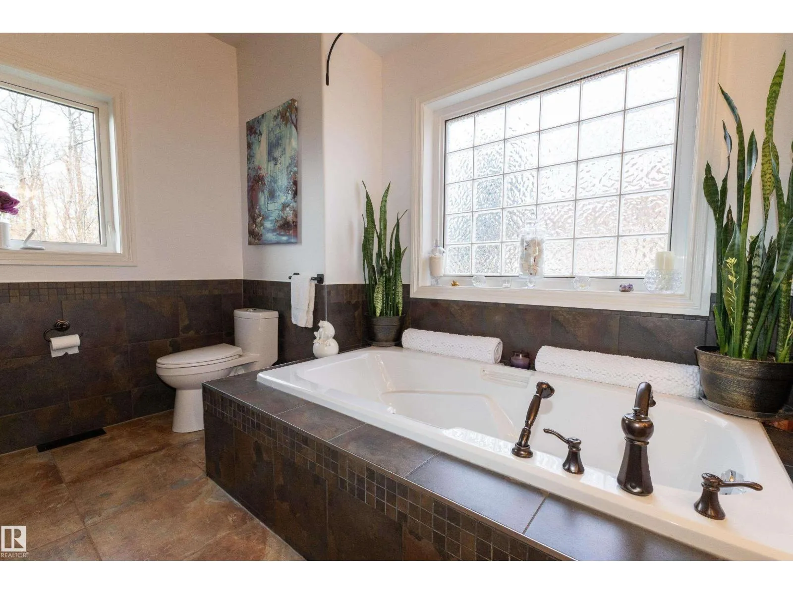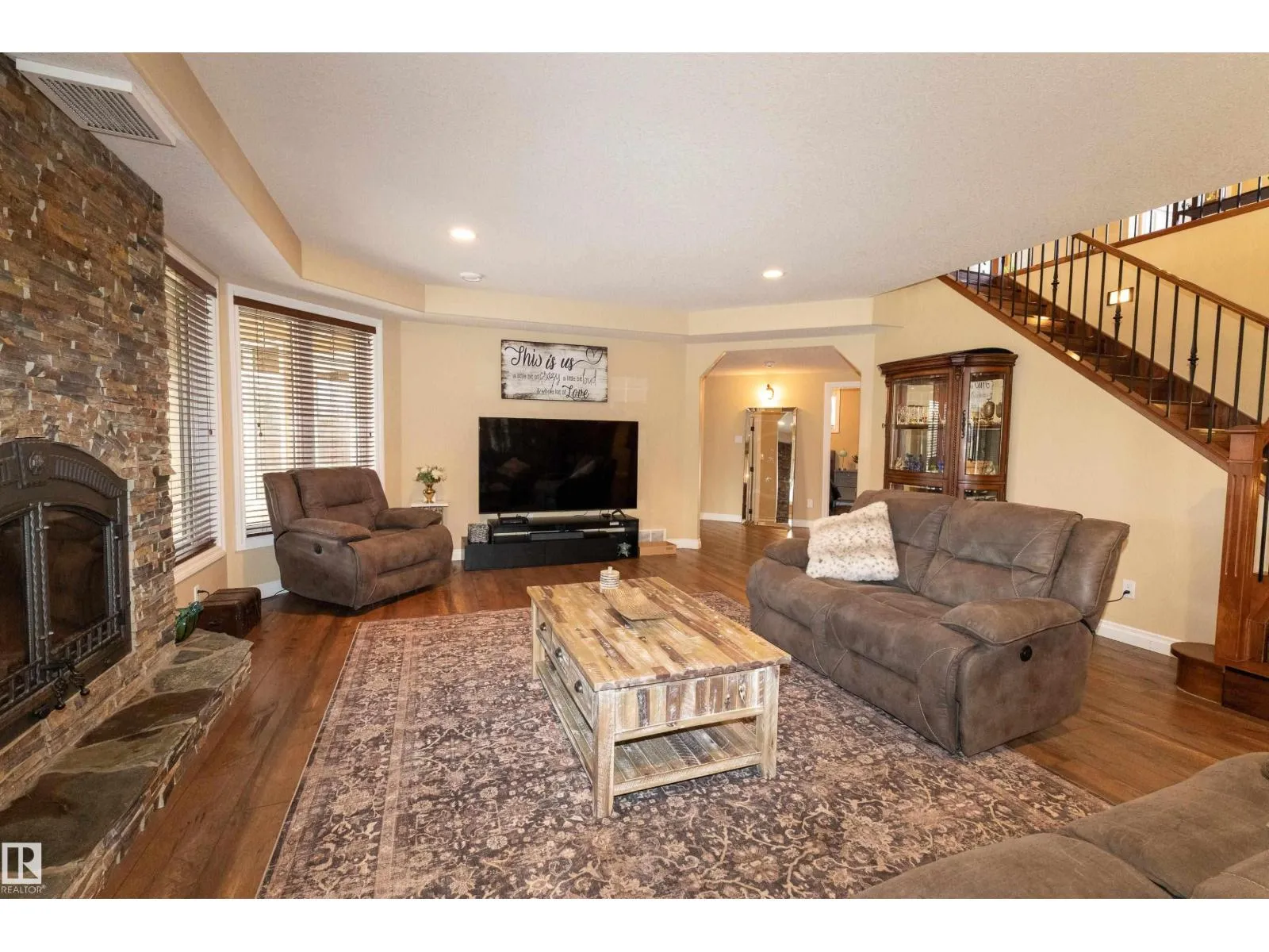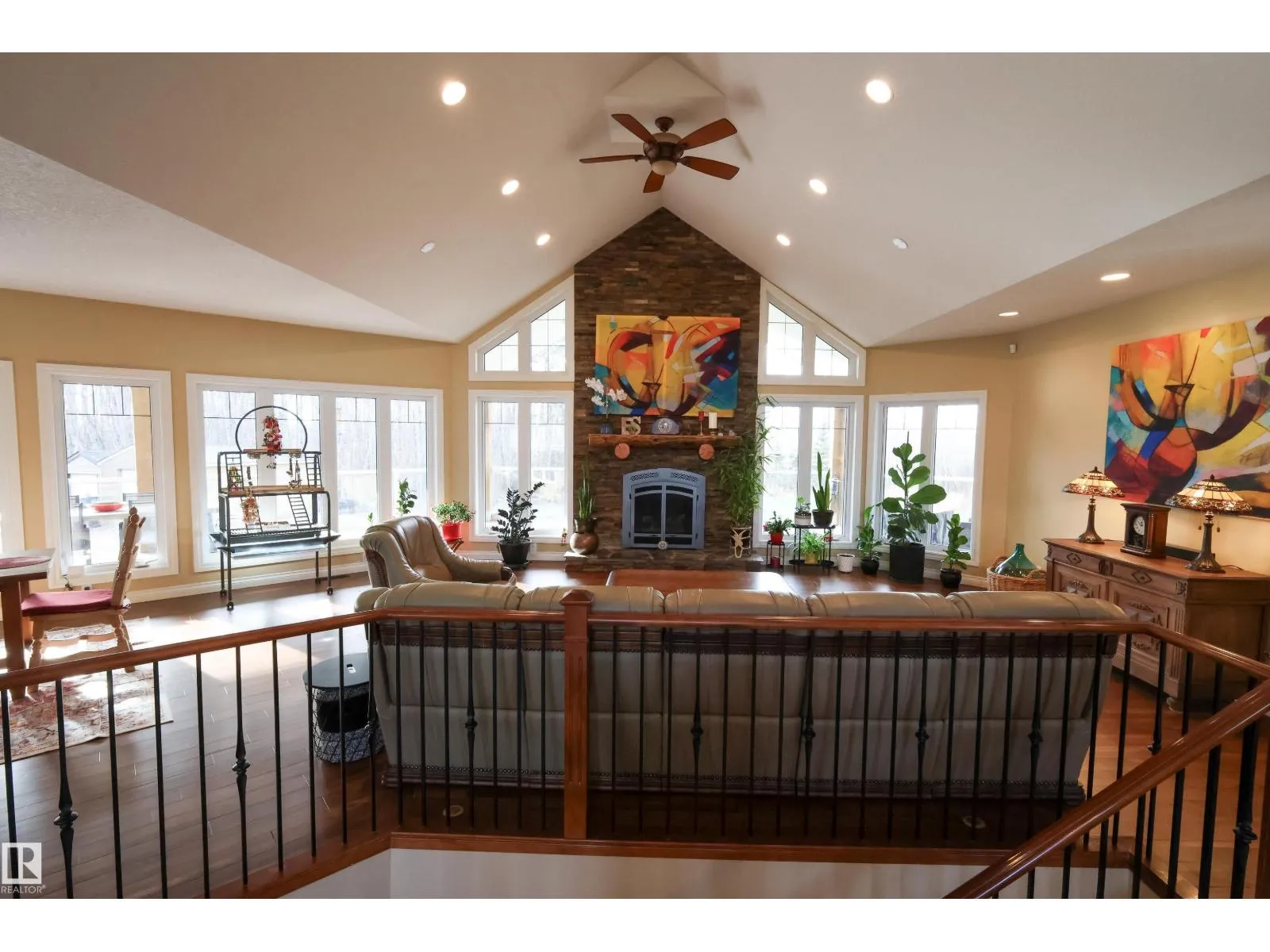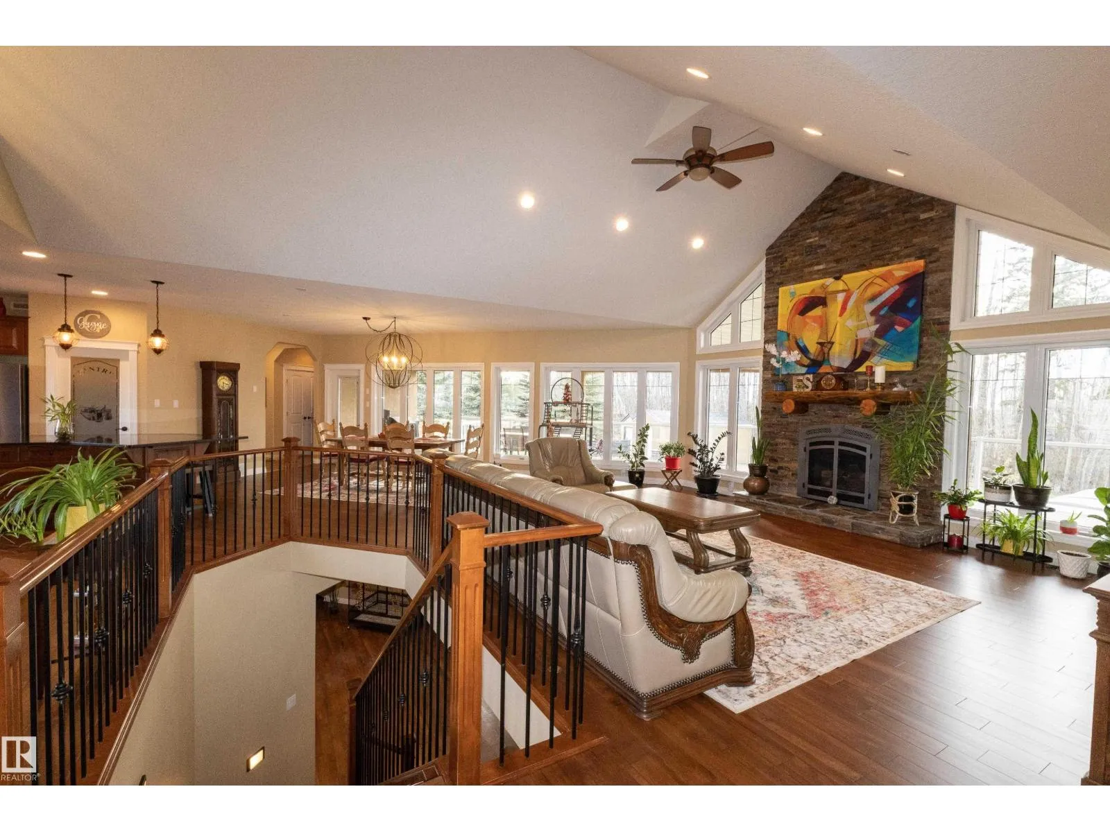 This one-of-a-kind bungalow offers over 4000sqft of living space, this warm lodge-like feel has vaulted ceilings, an open-concept design, and large windows that overlook the beautifully landscaped private backyard. The main floor features new hardwood floors, a spacious primary suite with a two-person shower, soaker tub, and direct access to a 600 sq ft covered deck patio. A large den provides flexibility as a second bedroom or home office. Every bathroom and the complete basement has in floor heating. The walkout basement includes all around windows, a wet bar, and three generous bedrooms with access to a lower patio finished in epoxy. Recent upgrades include a new roof, new paved driveway, new garage doors and front doors and many more . The massive 44x30 ft garage sits on a full foundation with a half bath and potential for a mechanicâs pit or lower-level expansion. Outdoor living is fully fenced, with a bran new 14â swim spa & an enclosed fire pit. (id:27476)