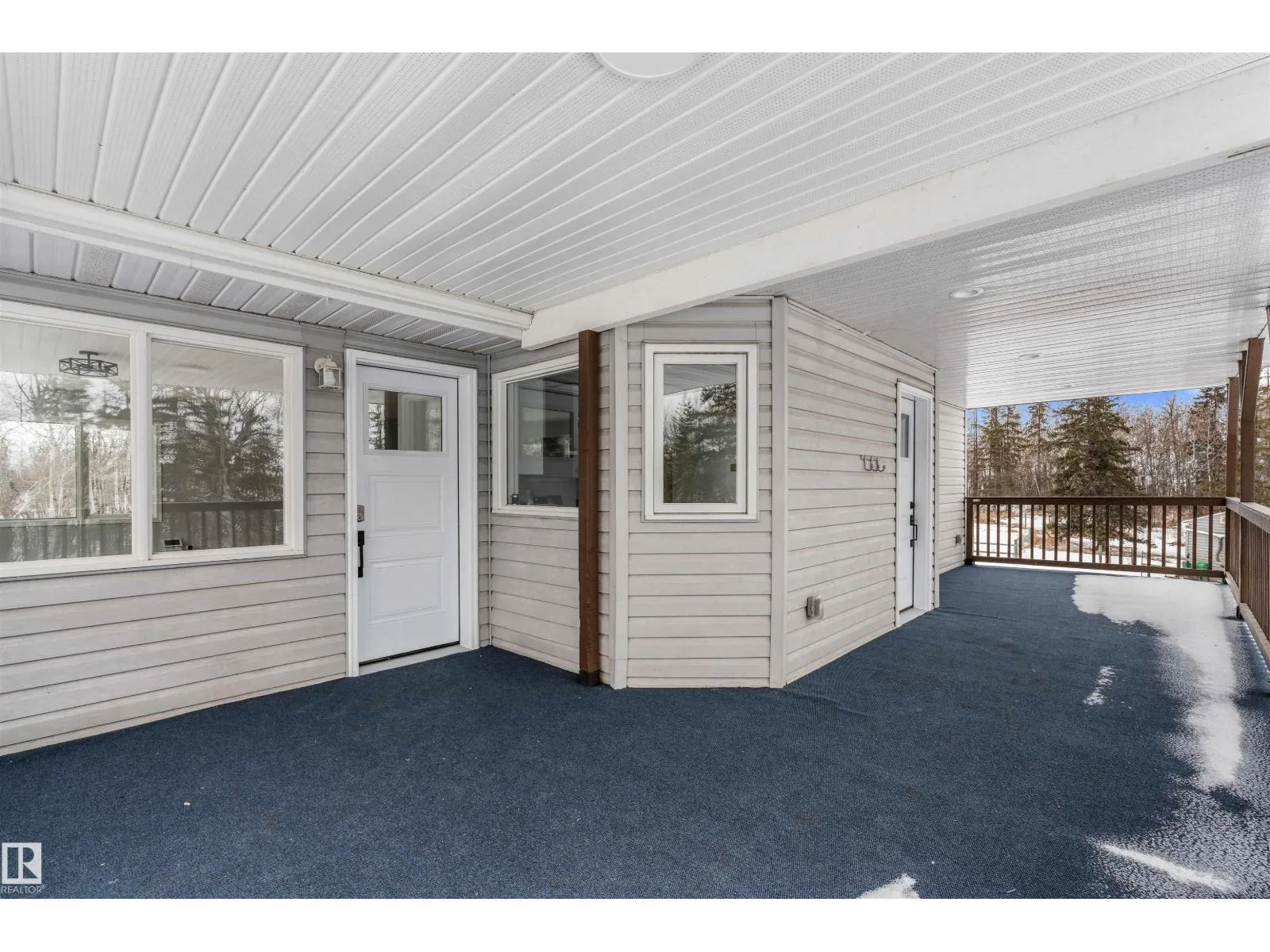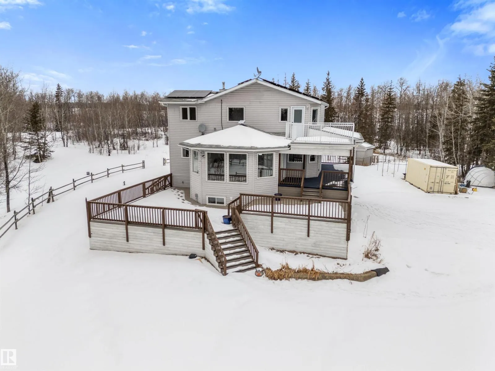If you want peace and quiet? Enjoy nature on this 9.99 acre parcel just 20 minutes from Stony Plain. Nicely upgraded thru-out is this two storey walk out basement. Brand new kitchen cabinets, and back splash, freshly painted thru-out, new carpets, newer septic and filtration system, All new appliances, central vacuum system, Covered wrap around deck with new carpeting. House has 60 amp service with solar panels. Cistern holds approximately. 3000 gallons. Lots of room for a great hobby farm. Smaller attached garage with new epoxy floor. Property was recently subdivided so taxes to be determined. Were approx. $4221.30 in 2025. Located just minutes from the N. Sask River. Adjacent 10 acres may be purchased separately . MLS#E4476253 (id:27476)