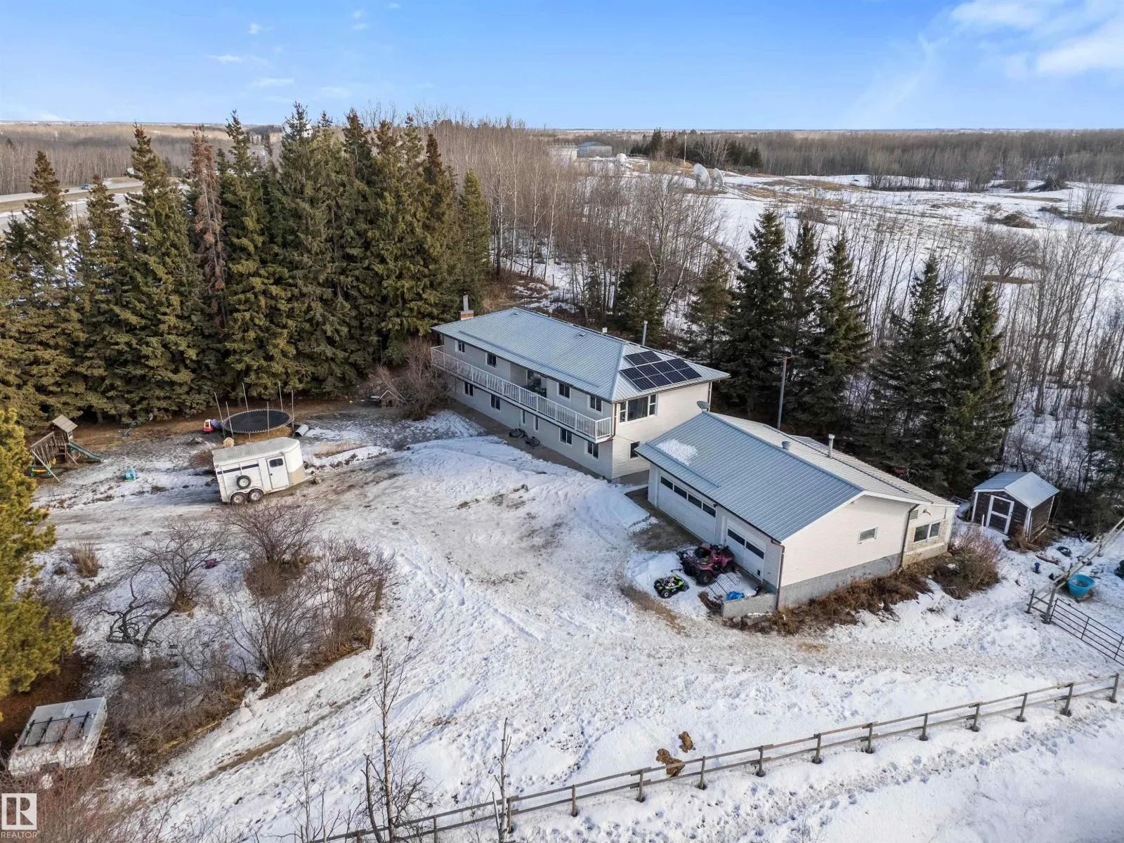 Nestled on 5+ picturesque acres just 5 minutes outside of Stony Plain, this charming hillside bungalow offers the perfect blend of country living and functionality for animal lovers. The property is fully perimeter fenced and cross-fenced, featuring a tack shed with power, horse pen, lean to shelter, greenhouse, and plenty of space to roam. There are plenty of fruit trees. A heated tripe car garage provides ample room for vehicles, toys, and workshop space. A new well is on the property and solar panels on a metal roof. Inside, the home offers a warm and inviting country kitchen. The main level features comfortable living spaces along with 4 bedrooms and 2 full bathrooms, including a beautiful clawfoot tub that adds timeless character. The fully finished basement expands your living area, providing extra space for recreation, guests or a growing family. Enjoy peaceful views, privacy and the freedom of acreage living while still having all the amenities you need with quick access to Stony Plain. (id:27476)