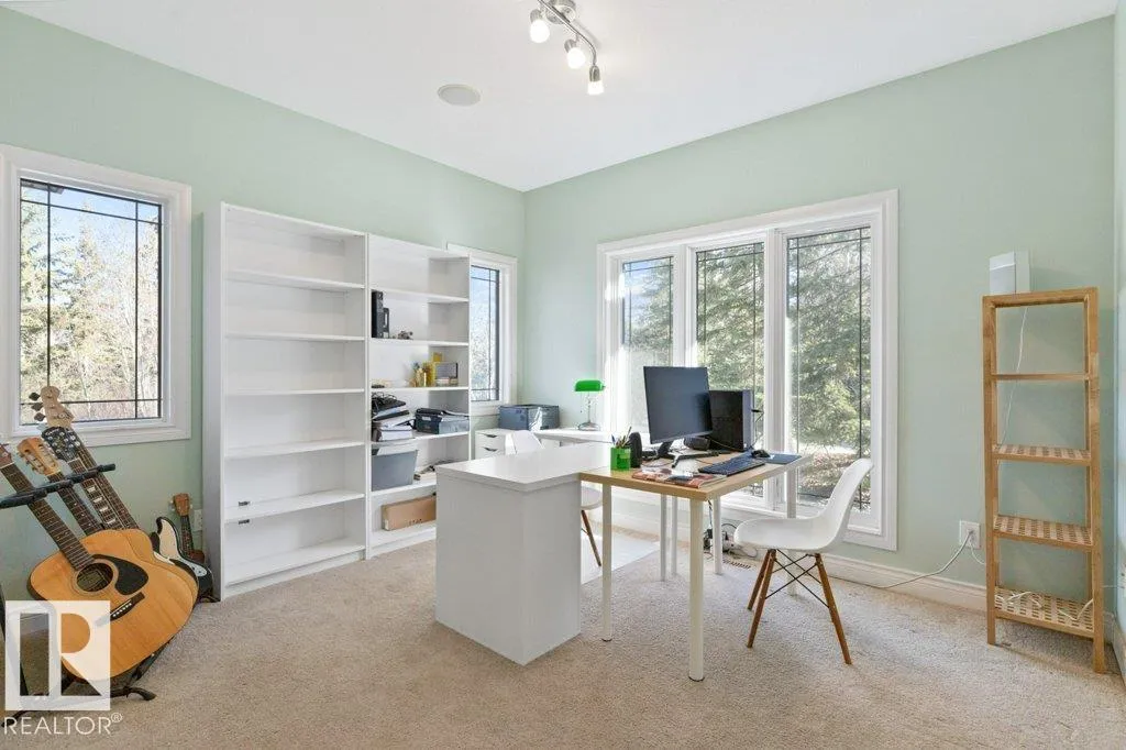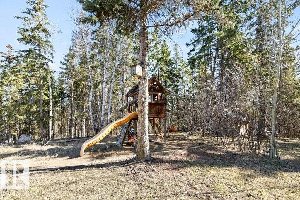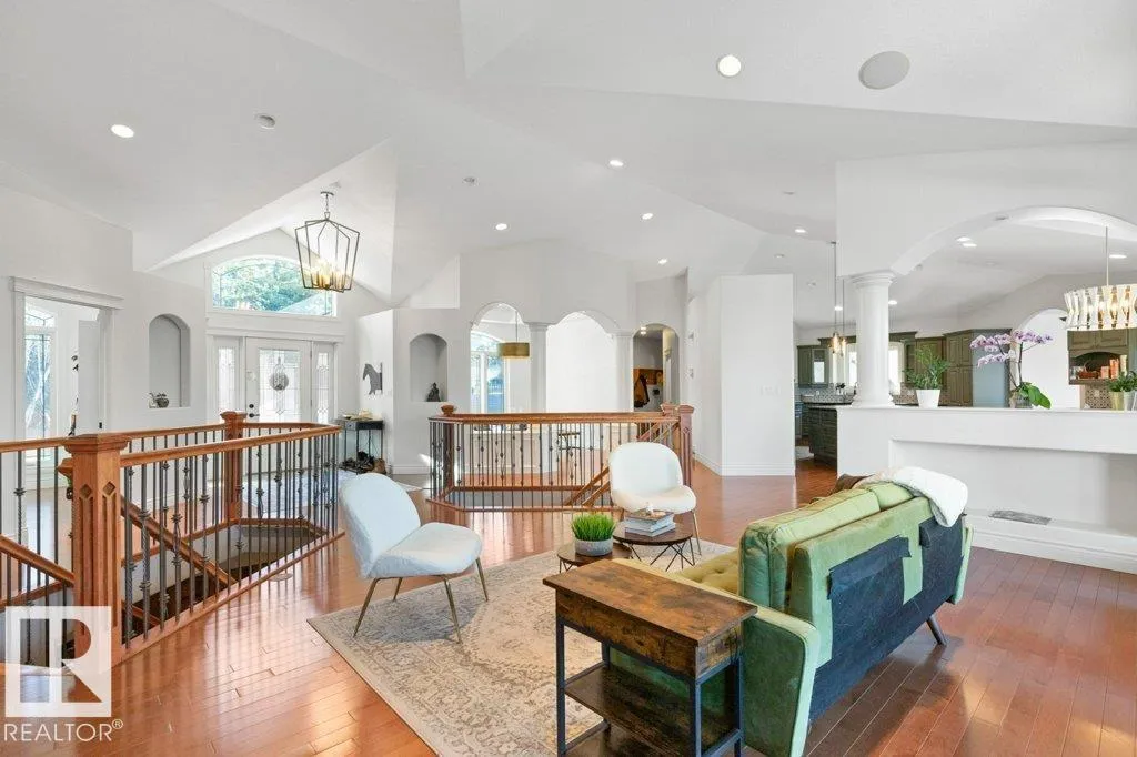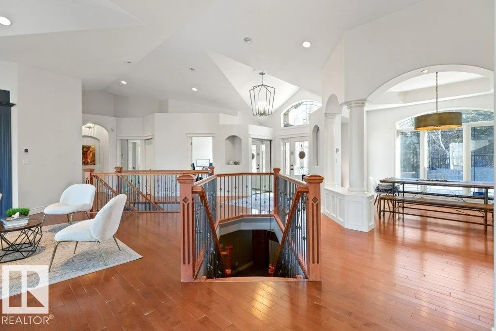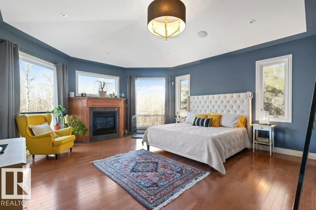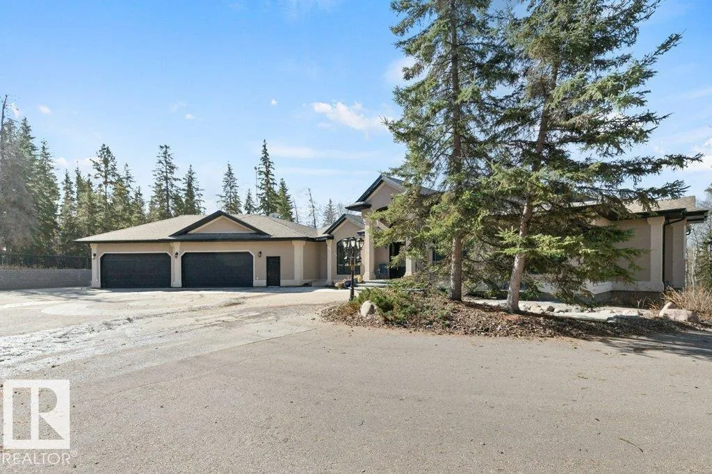 Discover an exquisite executive custom bungalow nestled on 2.45 treed acres, just minutes from Edmonton. This stunning home features soaring ceilings and expansive windows that highlight the beautiful grounds, creating a bright and inviting atmosphere. The main floor, expertly renovated by Weaver Design, boasts a chef-style kitchen w/ updated cabinetry, granite countertops, & stainless steel appliances. Enjoy seamless entertaining in the open-concept living room, formal dining area, & family room. The primary suite is a serene retreat with a fireplace, deck access, & a reno'd spa-inspired ensuite w/ a walk-in closet. Also includes a second bedroom, office, laundry, & bathroom leading to a hot tub. The fully finished basement offers 3 more bedrooms, a full kitchen, games & theater rooms, exercise area, & bathrooms. Both levels access 4 car garage w/ infloor heat. Outside, relax around the firepit or on the expansive deck & patio, complementing the luxurious indoor spaces & exceptional location. (id:27476)