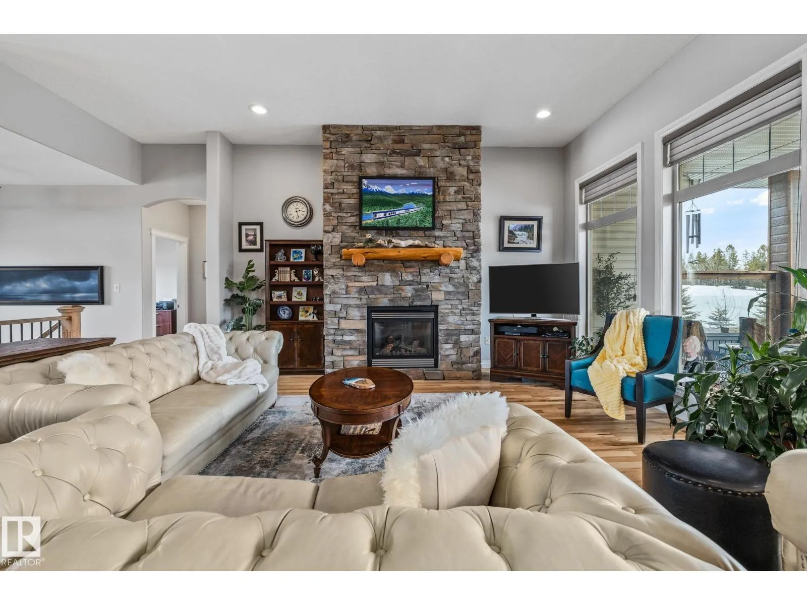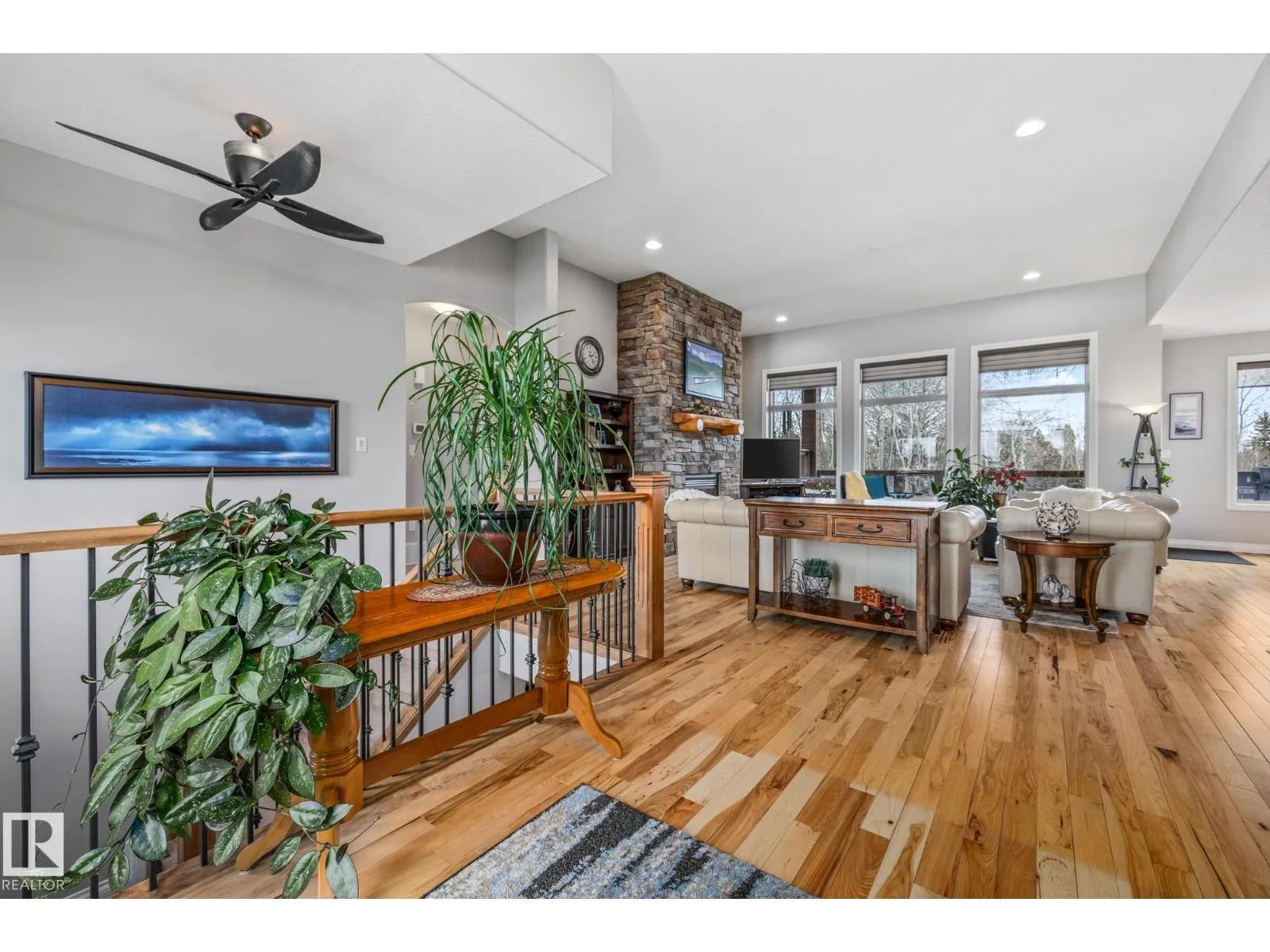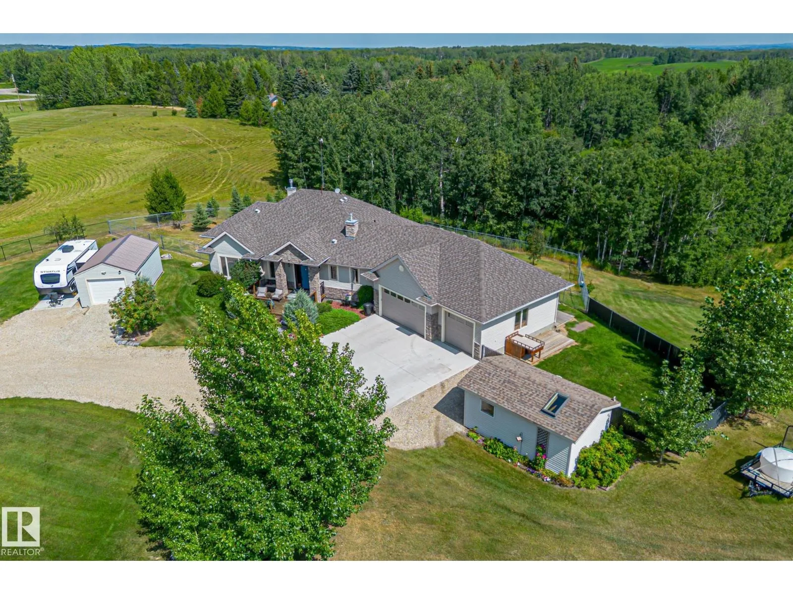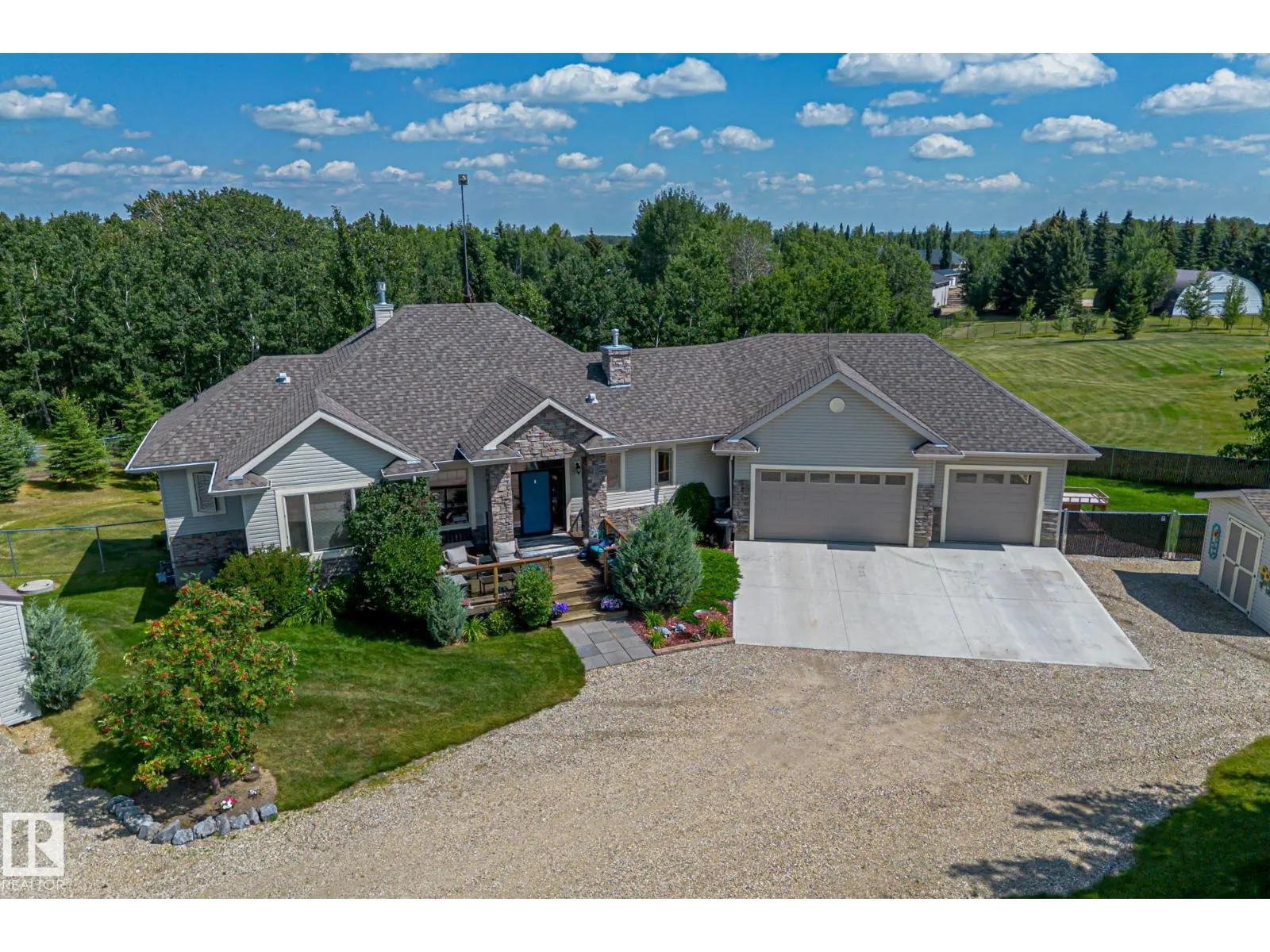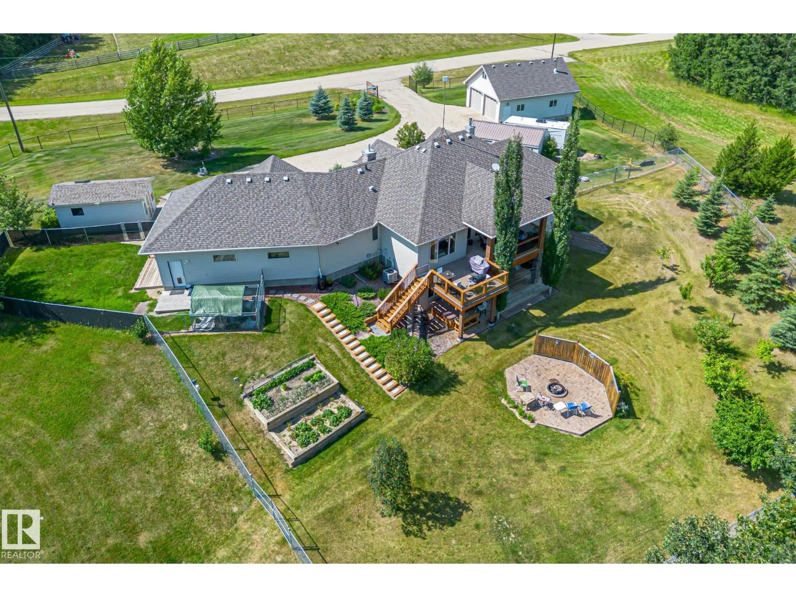 Welcome to this beautifully landscaped and updated walkout bungalow just minutes from Stony Plain. Complete with A/C, a triple attached garage, and a fully equipped shop, this property is ideal for both space and tranquility. Step inside to a bright, open concept main floor featuring an abundance of natural light and a stunning floor to ceiling stone fireplace as the focal point of the living area. New hardwood flooring flows seamlessly to the kitchen and dining space, complete with a covered back deck, perfect for entertaining. The private backyard is a true retreat, showcasing raised garden beds, mature fruit trees, and a relaxing hot tub. The spacious primary suite offers a beautifully renovated ensuite with in-floor heat, stand up shower a luxurious tub. The fully finished walkout basement features a large rec room with bar area, two additional bedrooms, a den, and 4 pc bath. Triple attached garage and a detached shop offer ultimate space for vehicles, toys, and projects, luxury acreage living! (id:27476)