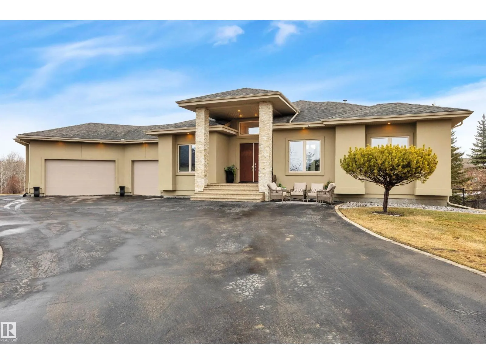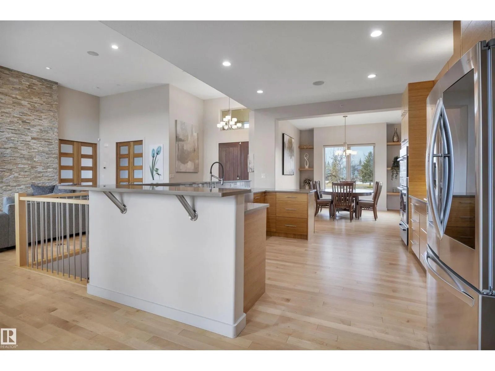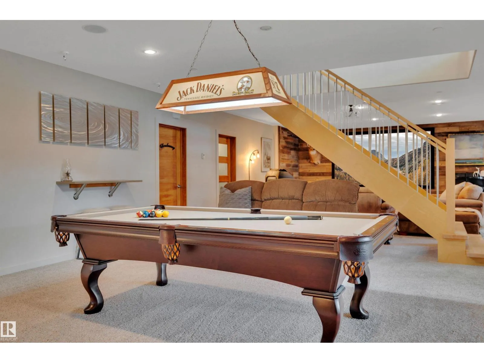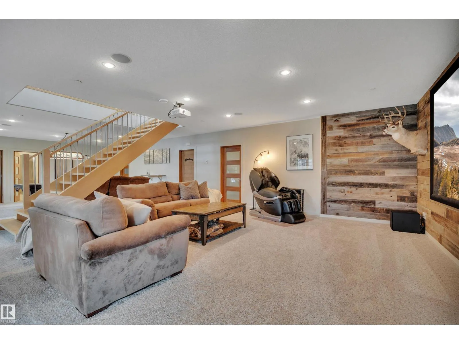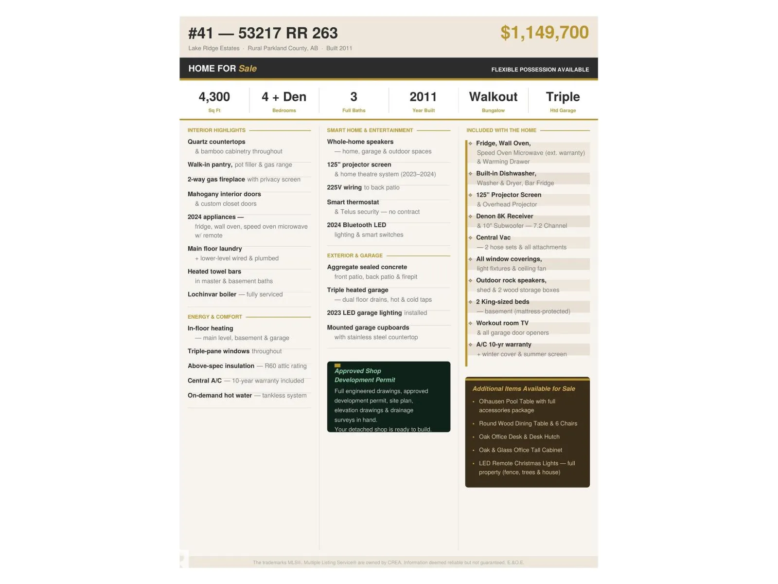 Executive walkout bungalow on ½ acre lot in prestigious Lake Ridge Estates â where refined country living meets uncompromising luxury. Over 4,300 sq ft of masterfully finished space where soaring rock walls, towering windows & open-concept layout create a breathtaking first impression. The chef's kitchen stuns with quartz countertops, bamboo cabinetry, gas range & a huge eat-up island. Entertain in your formal dining area or on the huge deck with whole-home sound & smart home tech throughout. Watch the game on the 125 projector screen from the bar or over a game of pool! Then retreat to your spa-inspired master suite with double-sided fireplace designed for pure indulgence. In-floor heat on both levels, triple-pane windows & R60 insulation ensure year-round comfort. The triple heated garage features a drive-through door, dual floor drains & hot/cold taps. Approved shop development permit & full drawings in hand â truly rare. Exceptional inclusions. Flexible possession. Country prestige. City convenience. (id:27476)