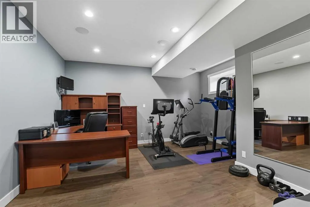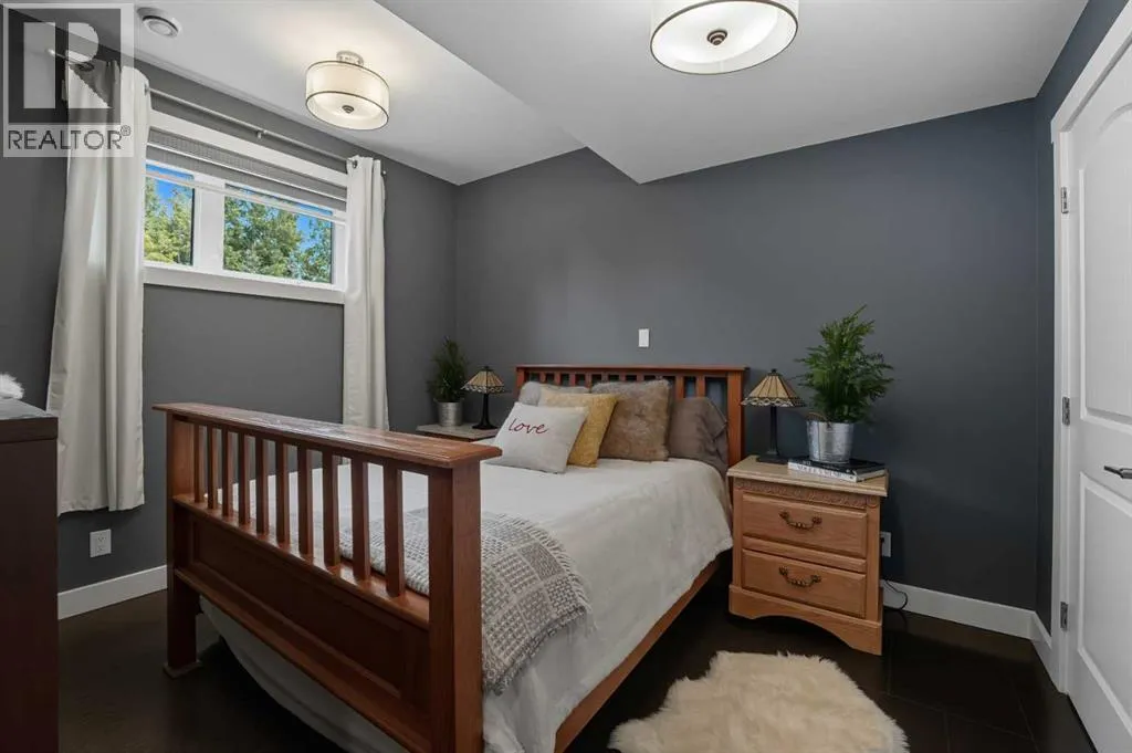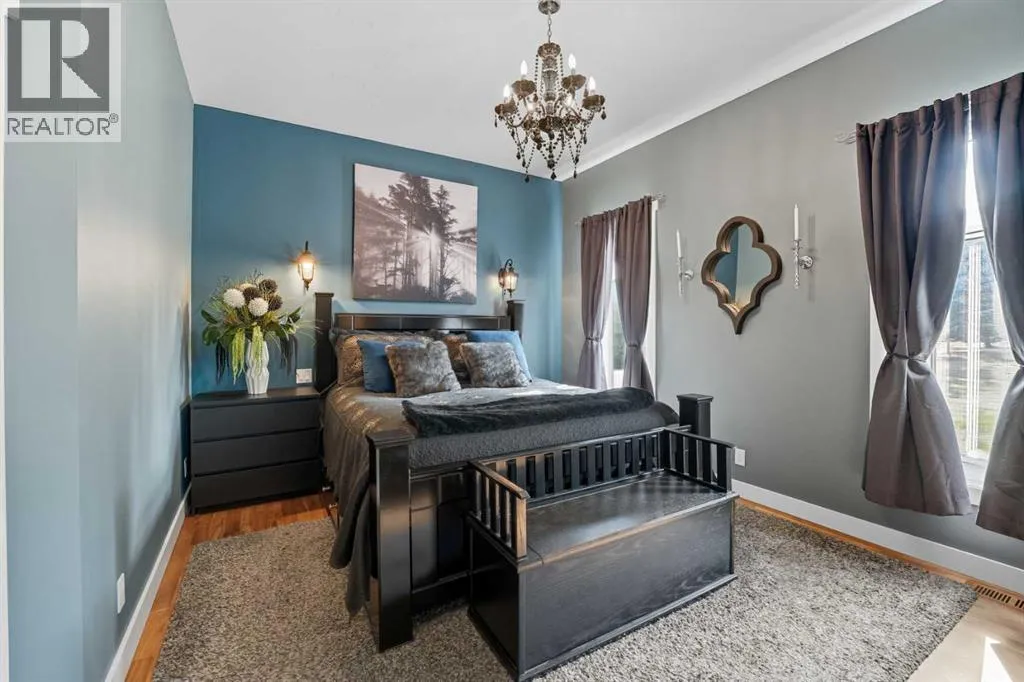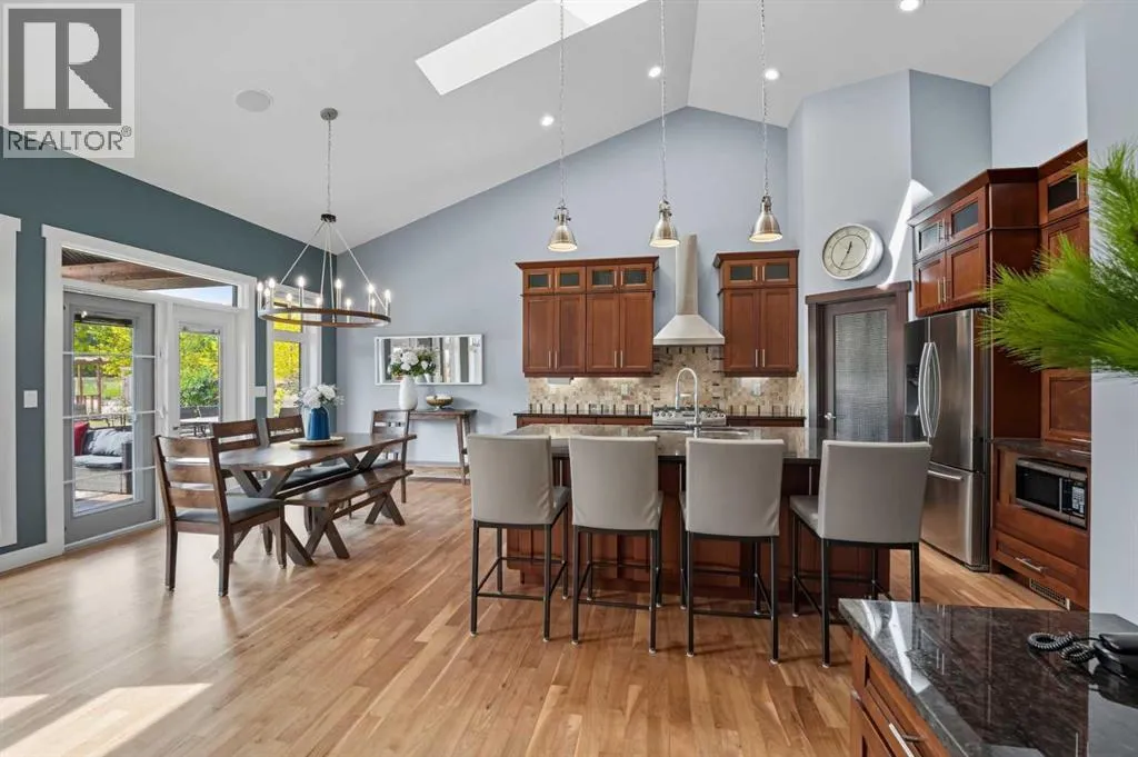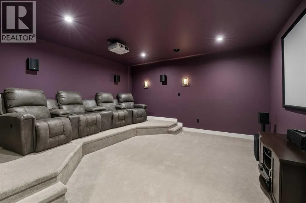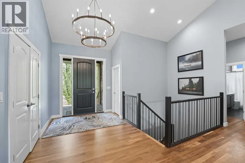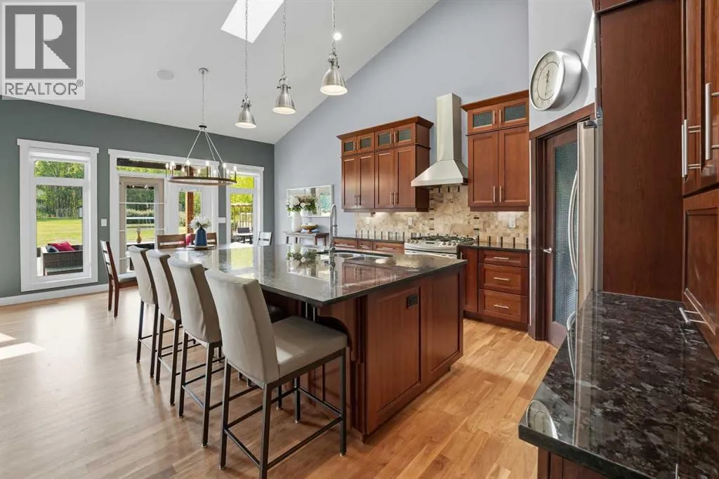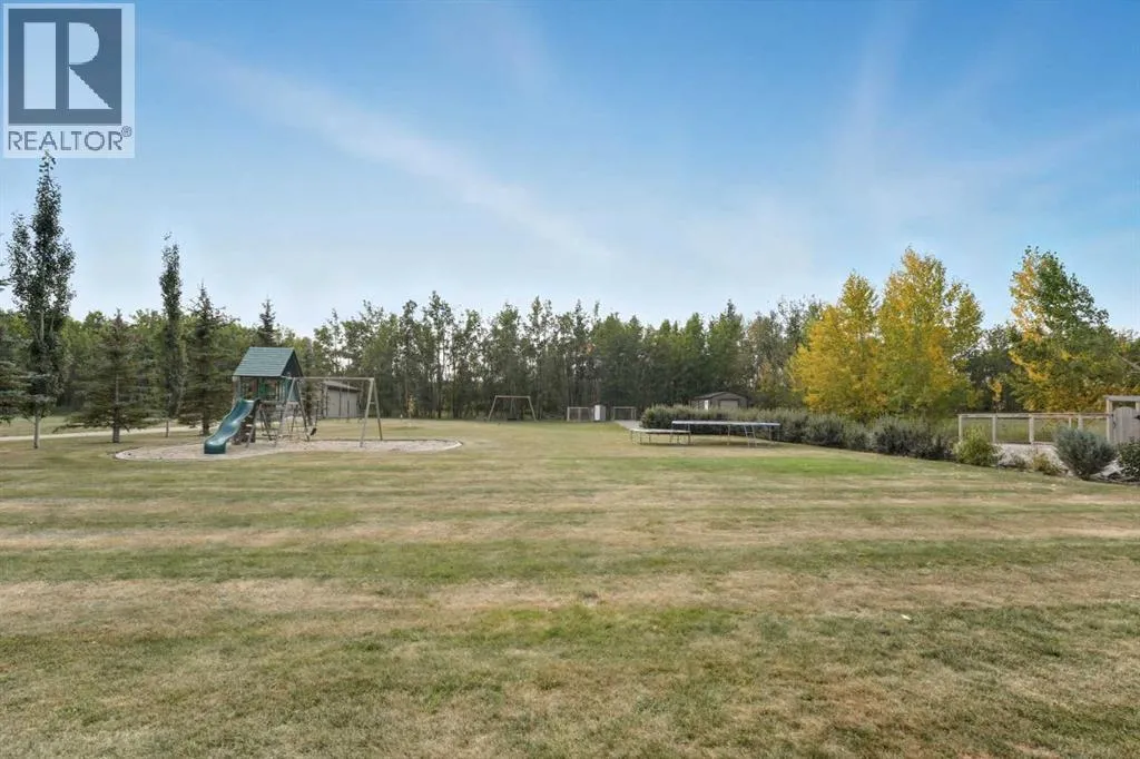 A fully developed bungalow on 1.47 acres in Balmoral Heights! The curb appeal is accented by the paved circular driveway, stucco, stone accents and covered front porch. The front entryway greets you to the open style floor plan that features vaulted ceilings and hardwood floors that have been refinished with a trendy matte finish. Maple kitchen cabinets are accented by full tile backsplash, crown moldings, granite countertops, glass front upper cabinets, a large island eating bar, skylights, a gas stove and a walkthrough pantry. The eating area has patio doors out to the backyard. You'll enjoy relaxing in the living room next to the gas fireplace that has floor to ceiling stone surround. The tiled back entryway has a laundry area with a sink and quartz countertops. There are 3 bedrooms on the main floor. The king sized primary bedroom has hardwood floors, double windows overlooking the backyard, a walk in closet with custom built ins and a 5 piece ensuite with heated tile floors, double sinks, quartz, a freestanding air jet tub & a custom glass/tile shower. The main floor also boasts a powder room off the back entryway and a 4 piece bathroom with quartz. Follow the stairs with wrought iron railings and stair lights down to the basement into the large family games area with a massive wet bar that features granite countertops, a dishwasher, wine fridge and ice maker, pool table (included) and family room with a gas fireplace and a door that accesses the side yard & a two tiered theatre room, all with leather flooring. There is a 4th bedroom, a 4 piece bathroom, a gym/office with durable gym flooring. Step outside onto the composite deck that has a vaulted roof cover (two gas hookups) that leads to a concrete patio with a hot tub area overlooking the retaining wall and into the yard. There is a shed, chicken coop and power/water to the back of the lot for a future shop. The home has a high efficient furnace, a boiler system, central vac, sonos for sound throughout, a/c , reverse osmosis, heated tile throughout (except in the back entryway, a tandem triple car garage (warmed by underfloor heat). The perfect country residential location within minutes to Red Deer. Upgrades since 2016: paved front driveway, stucco repainted, landscaping, retaining wall in backyard, garden shed, reverse osmosis, refinished hardwood with a matte finish and concrete around the home. (id:27476)