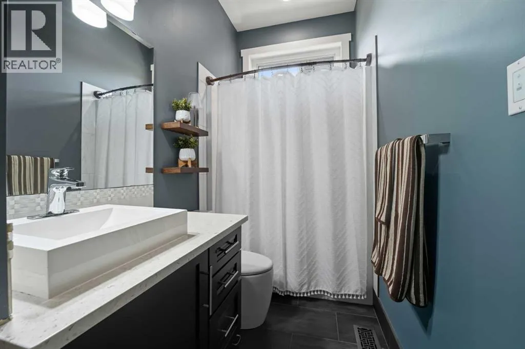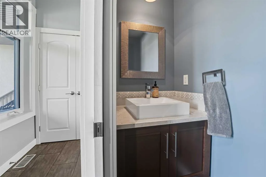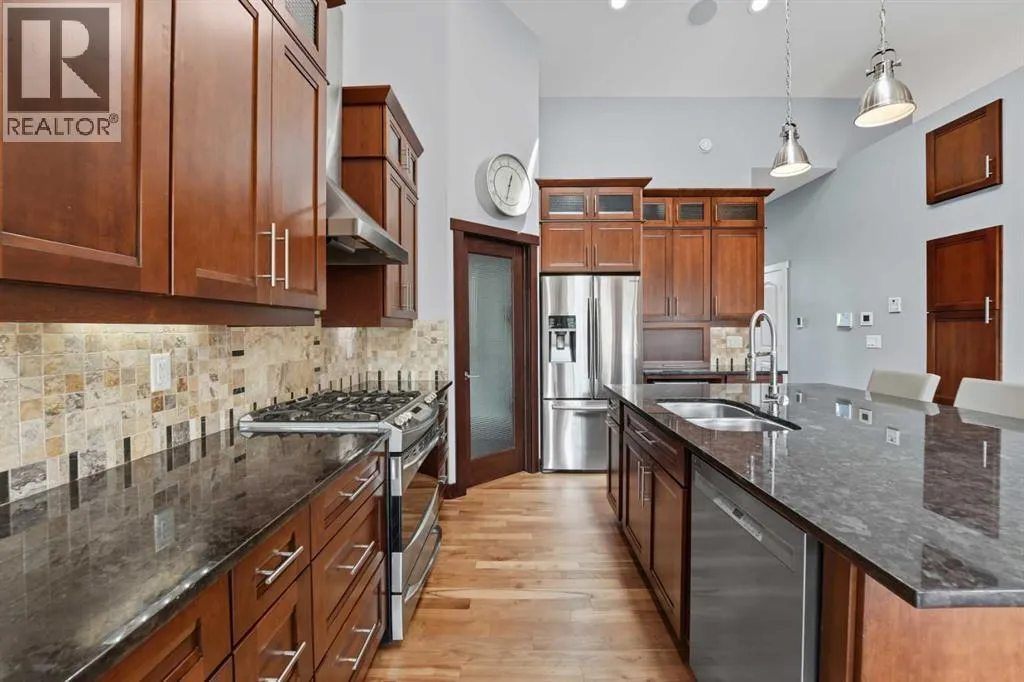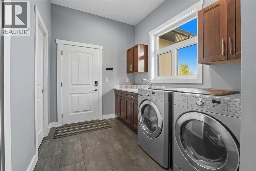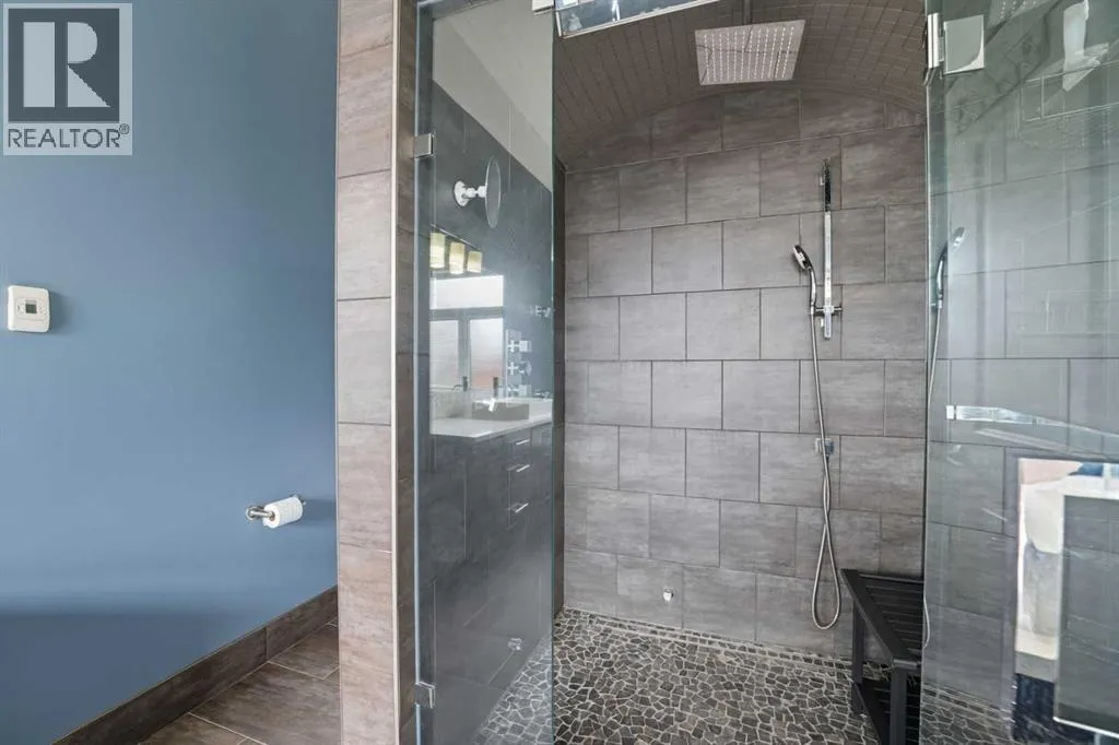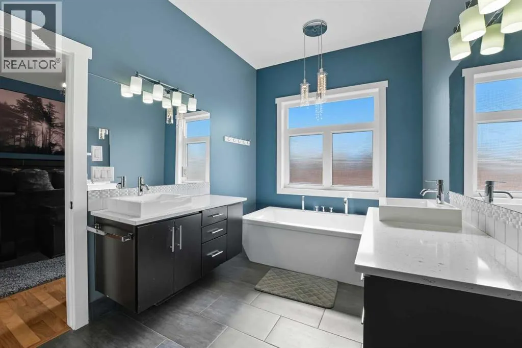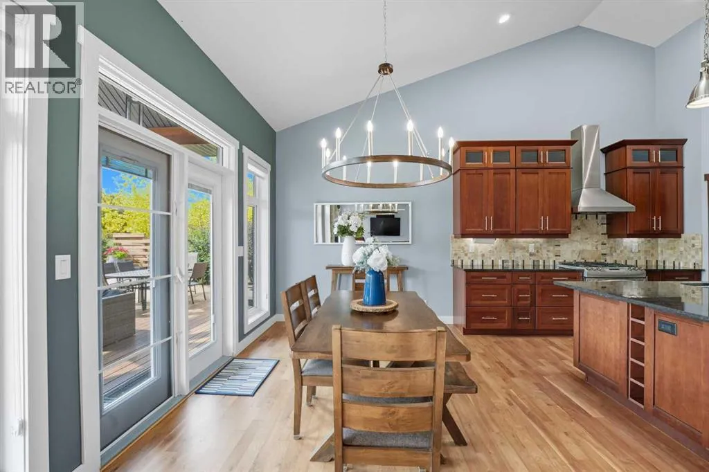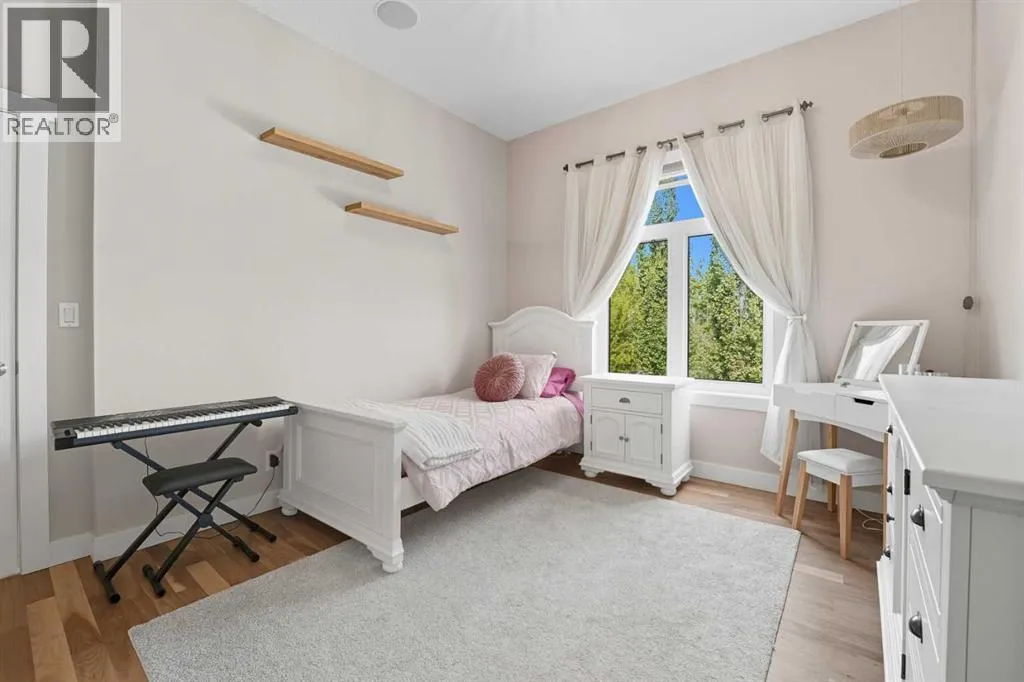 A fully developed bungalow on 1.47 acres in Balmoral Heights! The curb appeal is accented by the paved circular driveway, stucco, stone accents and covered front porch. The front entryway greets you to the open style floor plan that features vaulted ceilings and hardwood floors that have been refinished with a trendy matte finish. Maple kitchen cabinets are accented by full tile backsplash, crown moldings, granite countertops, glass front upper cabinets, a large island eating bar, skylights, a gas stove and a walkthrough pantry. The eating area has patio doors out to the backyard. You'll enjoy relaxing in the living room next to the gas fireplace that has floor to ceiling stone surround. The tiled back entryway has a laundry area with a sink and quartz countertops. There are 3 bedrooms on the main floor. The king sized primary bedroom has hardwood floors, double windows overlooking the backyard, a walk in closet with custom built ins and a 5 piece ensuite with heated tile floors, double sinks, quartz, a freestanding air jet tub & a custom glass/tile shower. The main floor also boasts a powder room off the back entryway and a 4 piece bathroom with quartz. Follow the stairs with wrought iron railings and stair lights down to the basement into the large family games area with a massive wet bar that features granite countertops, a dishwasher, wine fridge and ice maker, pool table (included) and family room with a gas fireplace and a door that accesses the side yard & a two tiered theatre room, all with leather flooring. There is a 4th bedroom, a 4 piece bathroom, a gym/office with durable gym flooring. Step outside onto the composite deck that has a vaulted roof cover (two gas hookups) that leads to a concrete patio with a hot tub area overlooking the retaining wall and into the yard. There is a shed, chicken coop and power/water to the back of the lot for a future shop. The home has a high efficient furnace, a boiler system, central vac, sonos for sound throughout, a/c , reverse osmosis, heated tile throughout (except in the back entryway, a tandem triple car garage (warmed by underfloor heat). The perfect country residential location within minutes to Red Deer. Upgrades since 2016: paved front driveway, stucco repainted, landscaping, retaining wall in backyard, garden shed, reverse osmosis, refinished hardwood with a matte finish and concrete around the home. (id:27476)