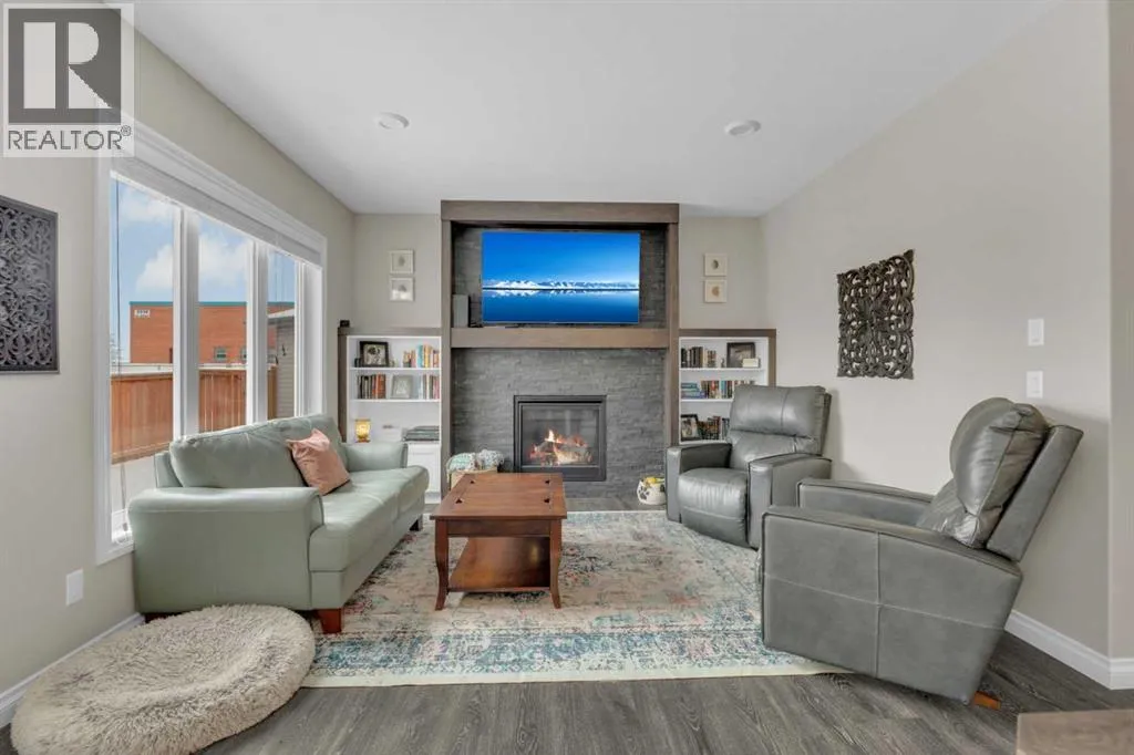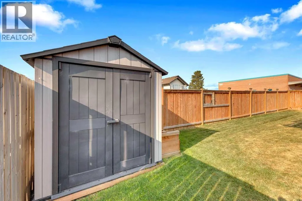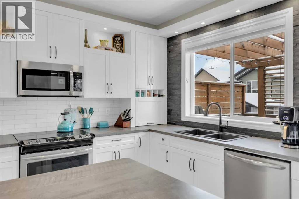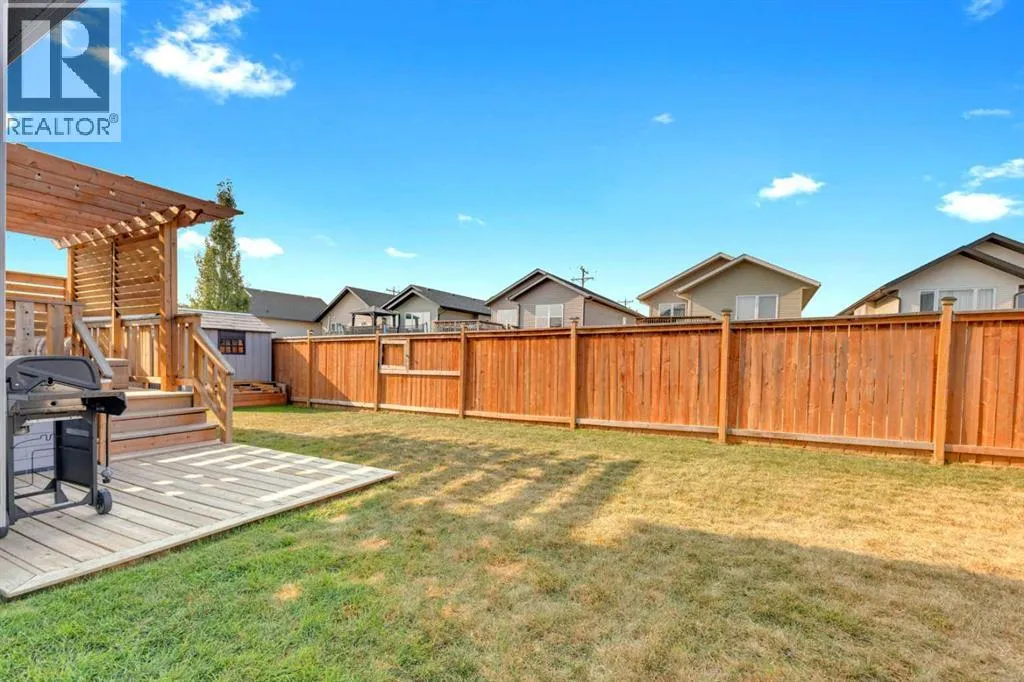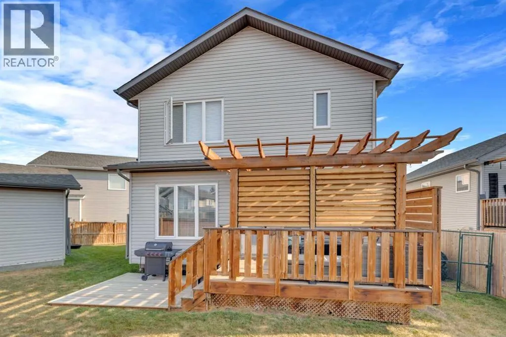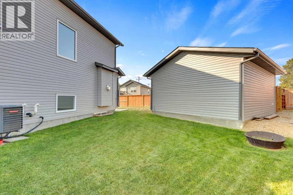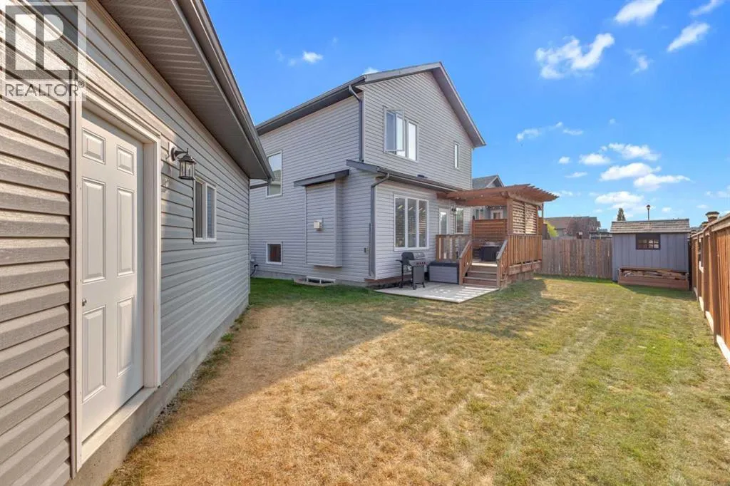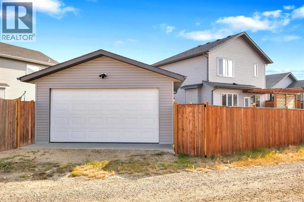 Welcome to this stunning property situated on a spacious pie-shaped lot, offering both an attached heated garage and a separate detached garage â perfect for anyone needing extra parking or workspace.Built in 2018 (detached garage built in 2024), this home features a thoughtfully designed main floor with an inviting open-concept layout that seamlessly connects the kitchen, dining, and living area. The kitchen impresses with white cabinetry, a large island, stainless steel appliances, a double silgranit sink, a kick sweep (central vac) and a garden door leading to the deck and fully fenced yard.The cozy living room centers around a gas fireplace with custom built-in wall unit, creating the perfect gathering spot. A convenient mudroom off the garage offers access to a dog run, and a stylish 2-piece powder room completes the main level.Upstairs, youâll find three bedrooms, two full bathrooms, and a laundry room that connects directly to the primary suiteâs walk-through closet and ensuite bath â a truly functional design. One of the bedrooms has been converted into a beautiful home office with built-in shelving and an electric fireplace.The unfinished basement is ready for your personal touch, complete with rough-ins for a future bathroom.Outdoor living is a dream with a deck featuring a pergola and privacy shades, a shed, and an extra-wide concrete driveway providing plenty of parking space. Enjoy comfort year-round with central A/C and a heated front garage. (id:27476)