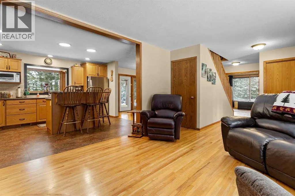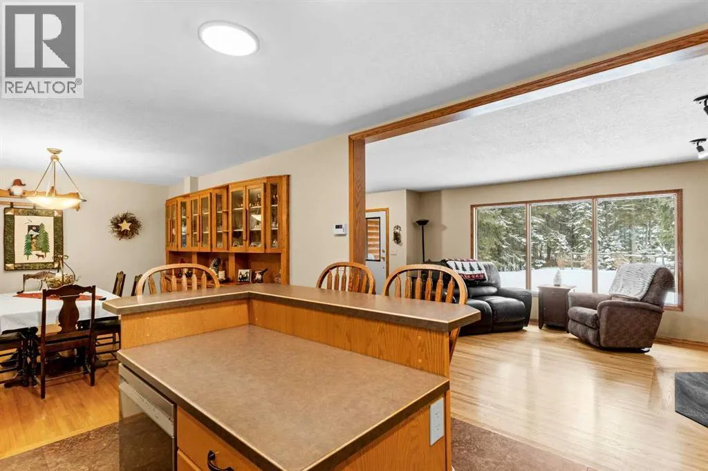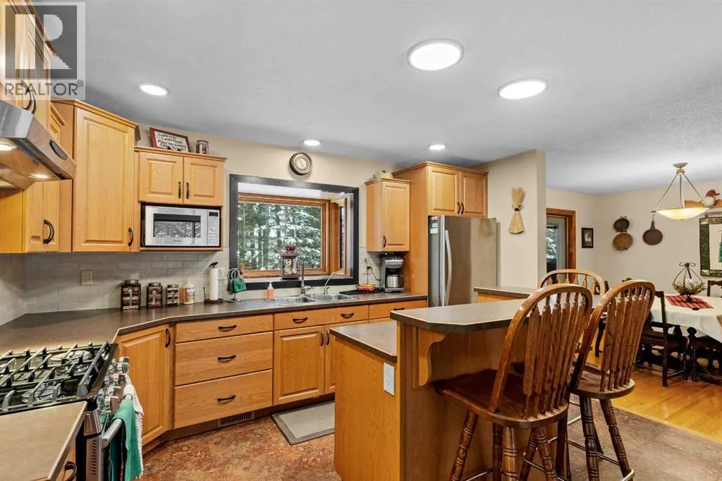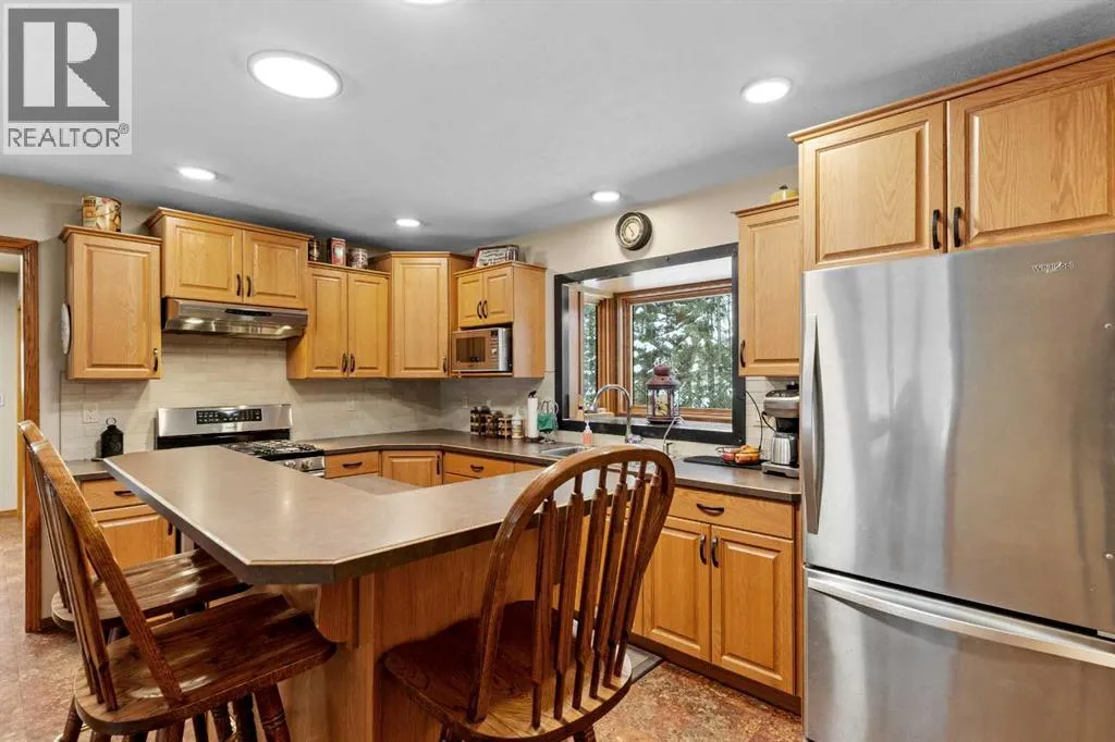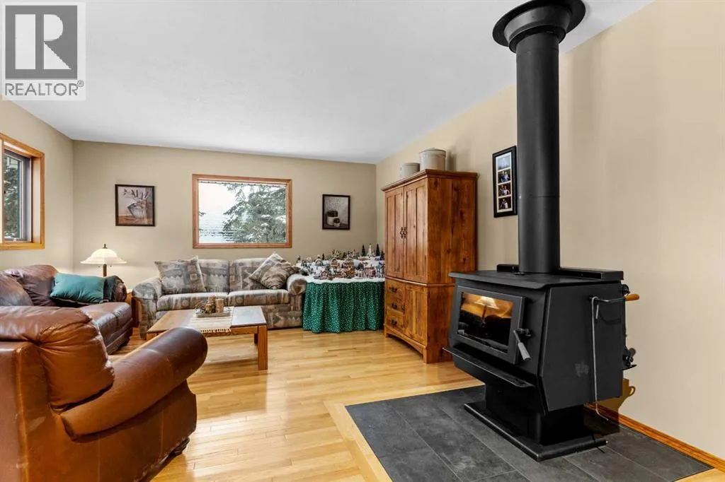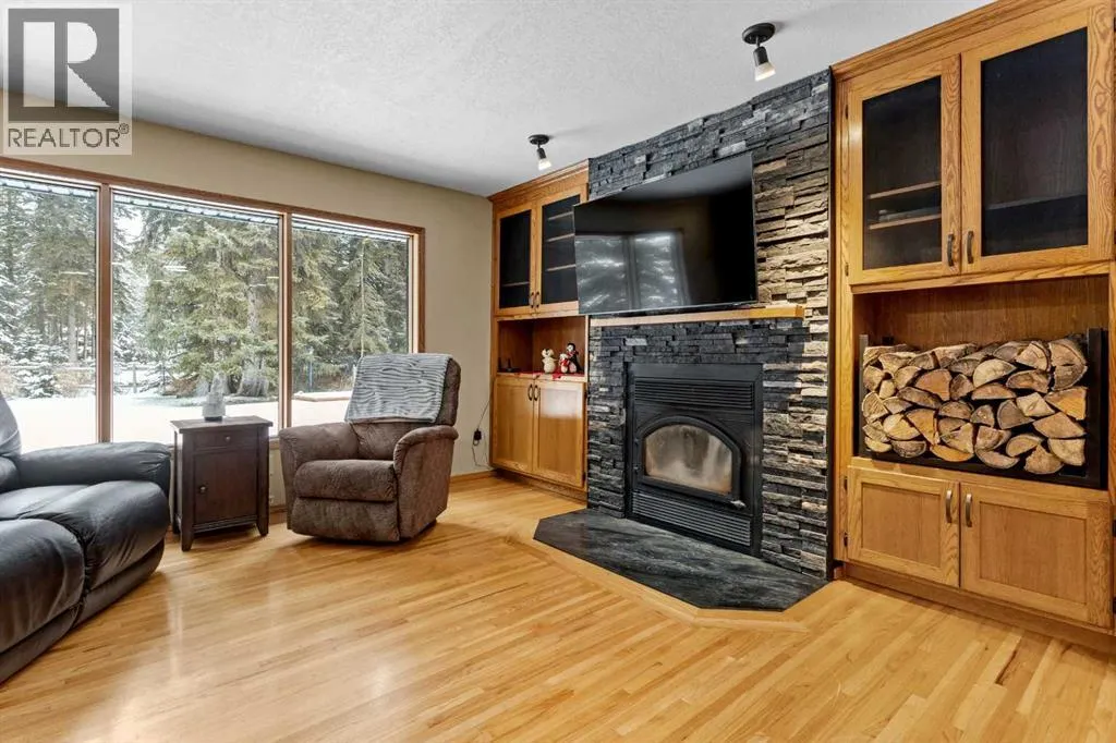 Welcome to your very own PRIVATE RETREAT! Offering 2,400+ Sq Ft of developed space in this 1.5 story home with 4 bedrooms & 3 Bathrooms! This inviting, lodge-style home is tucked among towering evergreens and wrapped in picture perfect tranquility. The exterior showcases warm half log siding, a striking stone chimney, and charming dormer windows, all framed by pristine forest views. There is an expansive rear concrete patio and this property is LANDSCAPED and WELL MAINTAINED. The main floor consists of beautiful HARDWOOD FLOORS and a wing design with the primary bedrooms and 4-piece ENSUITE on one side and another bedroom, 3-piece bathroom and family/rec room on the opposite side. Connecting the two is a spacious kitchen with center ISLAND, SS appliances and plenty of drawers, cabinetry and counter space. The kitchen is open to the cozy dining room and comfortable living space. Features: MAIN FLOOR LAUNDRY, plenty of STORAGE spaces and 3 FIREPLACES (2 wood burning & 1 gas in the primary ensuite). Upstairs houses 2 generously sized bedrooms, a storage/flex room and a 4-piece bathroom. The crawl space houses the utility components and offers even more storage. Outside you will find immaculately maintained landscape and a dedicated firepit area & GARDEN! The DETACHED GARAGE/SHOP was added onto and provides ample storage, parking, workshop space and is complete with 2-piece bathroom for added convenience. The STUDIO STYLE SUITE (Illegal, but County knows the suite is there) has an everything you need including a 3-piece bathroom. Great for guests accommodation! Great location just off pavement and just 15 minutes to Glennifer Lake and under 20 minutes to Bowden! Wheelchair accessible. (id:27476)