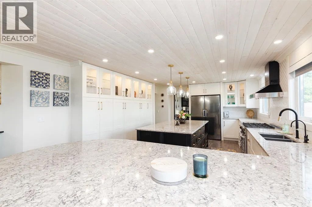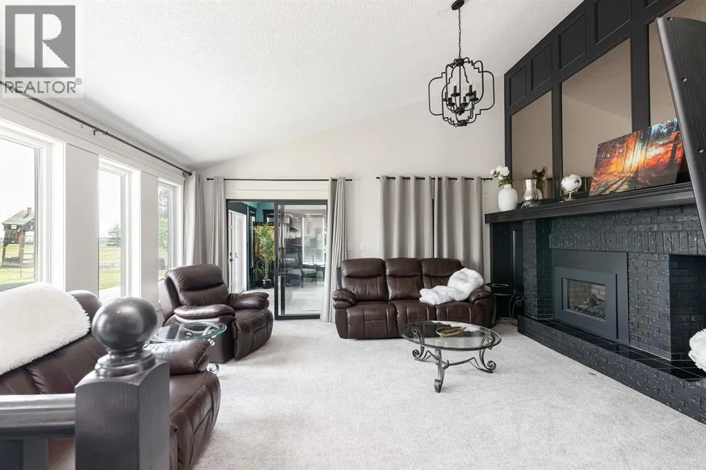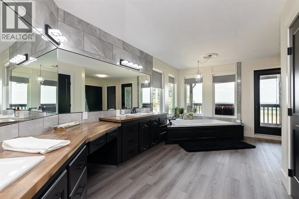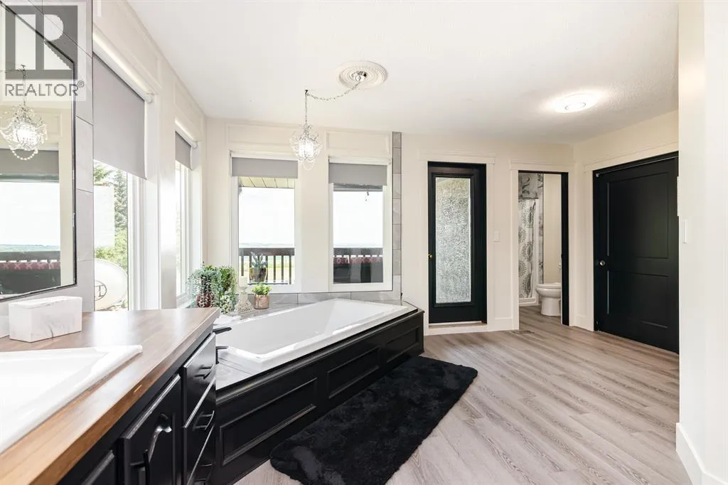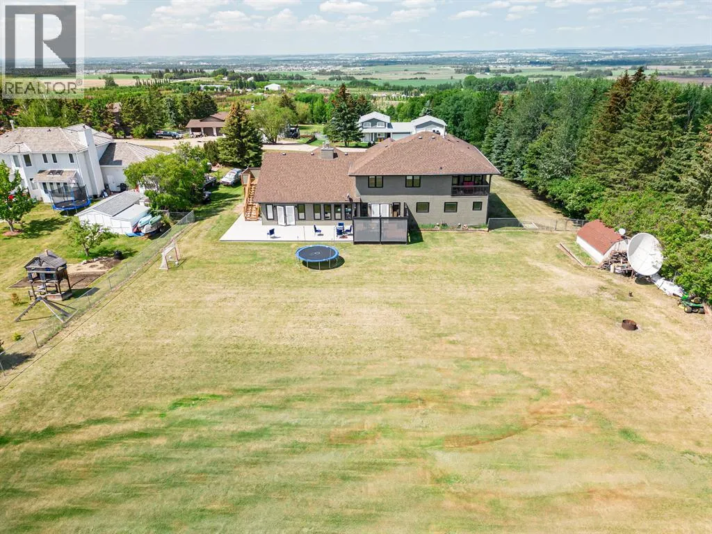 ~Exceptionally beautiful property inside and out~ BREATHTAKING VIEWS~ See the city lights twinkle as you look out from the west and enjoy the tranquility to the EAST!!! AMAZING TRANSFORMATION from old to new, with a complete professional renovation top to bottom! This home features: triple pane windows, new flooring, paint, bathrooms, kitchen, 220 in garage, new garage heater, appliances and much more! The front foyer boasts high ceilings and a beautiful, curved staircase! A sunken formal living room with wood burning fireplace and large windows located in the front off the entrance, flows to the spacious dining that also features a large window, built in modern cabinets and a large storage/panty tucked behind a beautiful barn door. The kitchen features expansive quartz countertops, a 4x8 island, STUNNING WHITE CABINTRY, reverse osmosis, 5 burner gas range, a walk-in pantry with coffee station and incredible MODERN tiled backsplash! The large QUARTZ peninsula seats 4 and is conveniently located adjacent to the double patio doors that walk out onto a large private patio and east back yard. The family room off the dining boasts high ceilings, a beautiful brick feature wall and a gas fireplace; a large comfortable living space for family gatherings and movie nights. THE HOT TUB ROOM is truly a remarkable place ALL YEAR ROUND to enjoy your mornings or evenings, and is completely set up for entertaining friends, drinks and BBQ'S. Main floor also features MAIN FLOOR LAUNDRY ROOM located off the garage entrance, and a spacious office with BUILT IN CABINETS! THE GORGEOUS CURVED STAIRCASE leads to the second floor where you'll find an illegal SUITE above the garage with a 4-piece bathroom, 2 bedrooms, a full-size living room, kitchen area, and separate entrance. The PRIMARY BEDROOM also located on the upper floor has a HOTEL FEEL, sunken and behind French Doors featuring a beautiful wood burning fireplace, door to the private balcony and views to the west overlooking the CIT Y! AMAZING AND GENEROUS size 5 piece en-suite has a large sunken spa like tub, water closet, separate shower, expansive counters with dual sinks and a door to the east PRIVATE BALCONY. There is enormous closet space for him and her. No shortage of beautiful upgrades throughout, lighting, flooring, air conditioning and more. The basement has 2 rooms close to completion, very little left to do, roughed in for a fourth bathroom, one room is used as a gym, there is a large storage room and full access to the hot tub above, for any maintenance. All new plumbing, and electrical, furnaces, sump pump, new garage heater, making this home an attractive purchase with peace of mind. Enjoy the tranquility acreage living has to offer, minutes to RED DEER, nothing left to do but enjoy your new beautiful home. (id:27476)