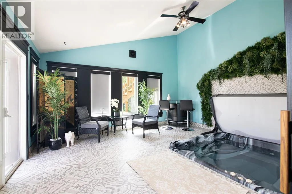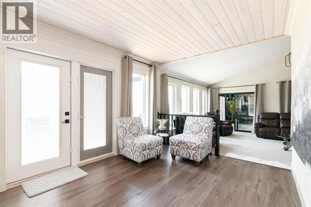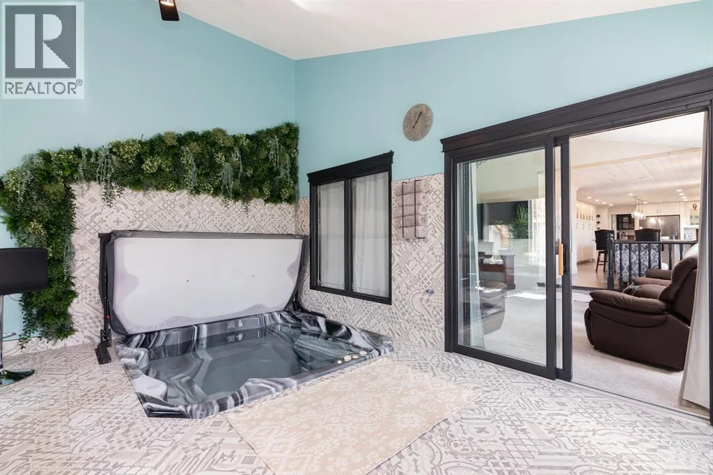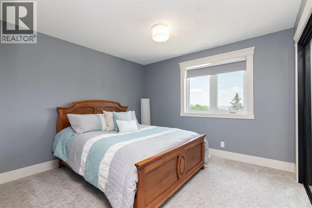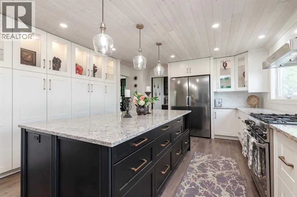 ~Exceptionally beautiful property inside and out~ BREATHTAKING VIEWS~ See the city lights twinkle as you look out from the west and enjoy the tranquility to the EAST!!! AMAZING TRANSFORMATION from old to new, with a complete professional renovation top to bottom! This home features: triple pane windows, new flooring, paint, bathrooms, kitchen, 220 in garage, new garage heater, appliances and much more! The front foyer boasts high ceilings and a beautiful, curved staircase! A sunken formal living room with wood burning fireplace and large windows located in the front off the entrance, flows to the spacious dining that also features a large window, built in modern cabinets and a large storage/panty tucked behind a beautiful barn door. The kitchen features expansive quartz countertops, a 4x8 island, STUNNING WHITE CABINTRY, reverse osmosis, 5 burner gas range, a walk-in pantry with coffee station and incredible MODERN tiled backsplash! The large QUARTZ peninsula seats 4 and is conveniently located adjacent to the double patio doors that walk out onto a large private patio and east back yard. The family room off the dining boasts high ceilings, a beautiful brick feature wall and a gas fireplace; a large comfortable living space for family gatherings and movie nights. THE HOT TUB ROOM is truly a remarkable place ALL YEAR ROUND to enjoy your mornings or evenings, and is completely set up for entertaining friends, drinks and BBQ'S. Main floor also features MAIN FLOOR LAUNDRY ROOM located off the garage entrance, and a spacious office with BUILT IN CABINETS! THE GORGEOUS CURVED STAIRCASE leads to the second floor where you'll find an illegal SUITE above the garage with a 4-piece bathroom, 2 bedrooms, a full-size living room, kitchen area, and separate entrance. The PRIMARY BEDROOM also located on the upper floor has a HOTEL FEEL, sunken and behind French Doors featuring a beautiful wood burning fireplace, door to the private balcony and views to the west overlooking the CIT Y! AMAZING AND GENEROUS size 5 piece en-suite has a large sunken spa like tub, water closet, separate shower, expansive counters with dual sinks and a door to the east PRIVATE BALCONY. There is enormous closet space for him and her. No shortage of beautiful upgrades throughout, lighting, flooring, air conditioning and more. The basement has 2 rooms close to completion, very little left to do, roughed in for a fourth bathroom, one room is used as a gym, there is a large storage room and full access to the hot tub above, for any maintenance. All new plumbing, and electrical, furnaces, sump pump, new garage heater, making this home an attractive purchase with peace of mind. Enjoy the tranquility acreage living has to offer, minutes to RED DEER, nothing left to do but enjoy your new beautiful home. (id:27476)