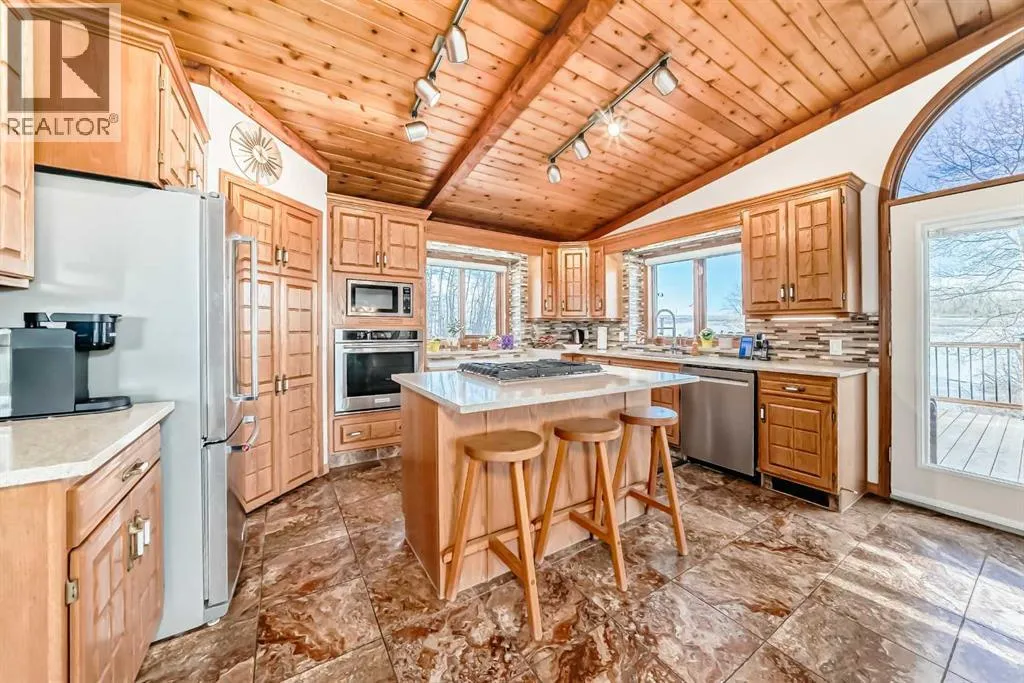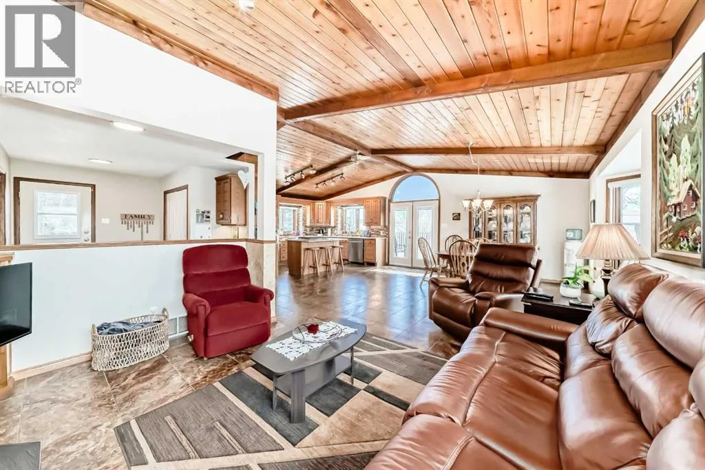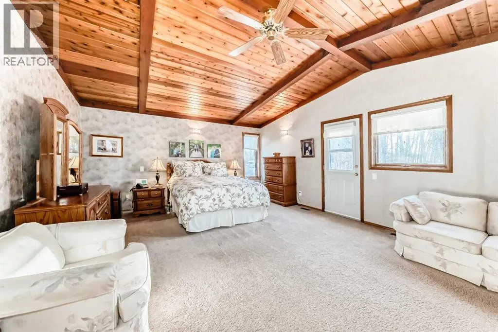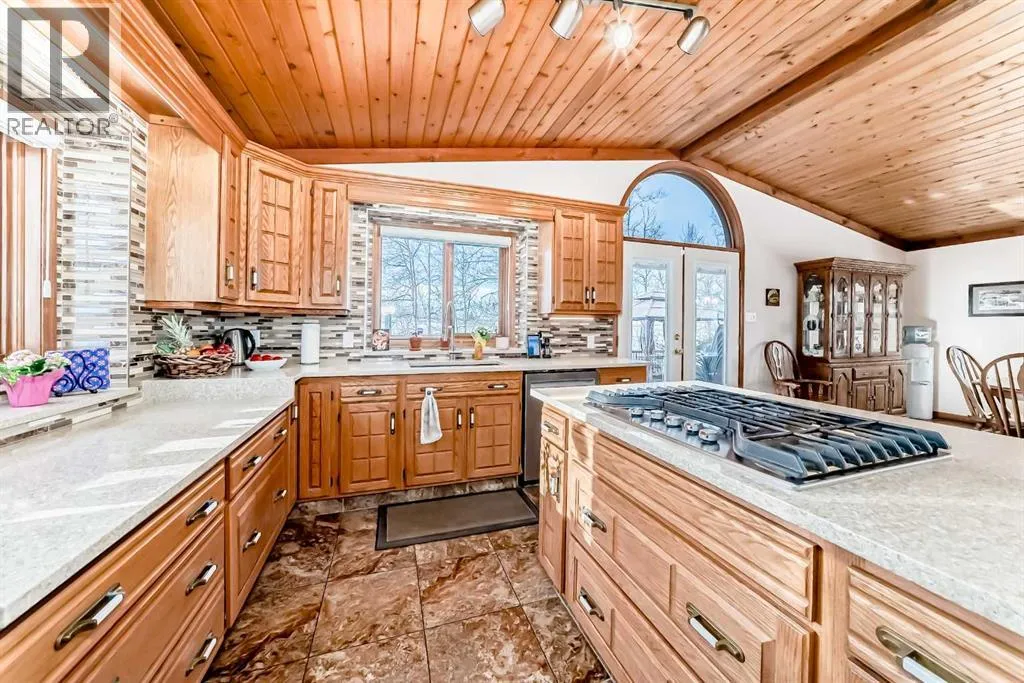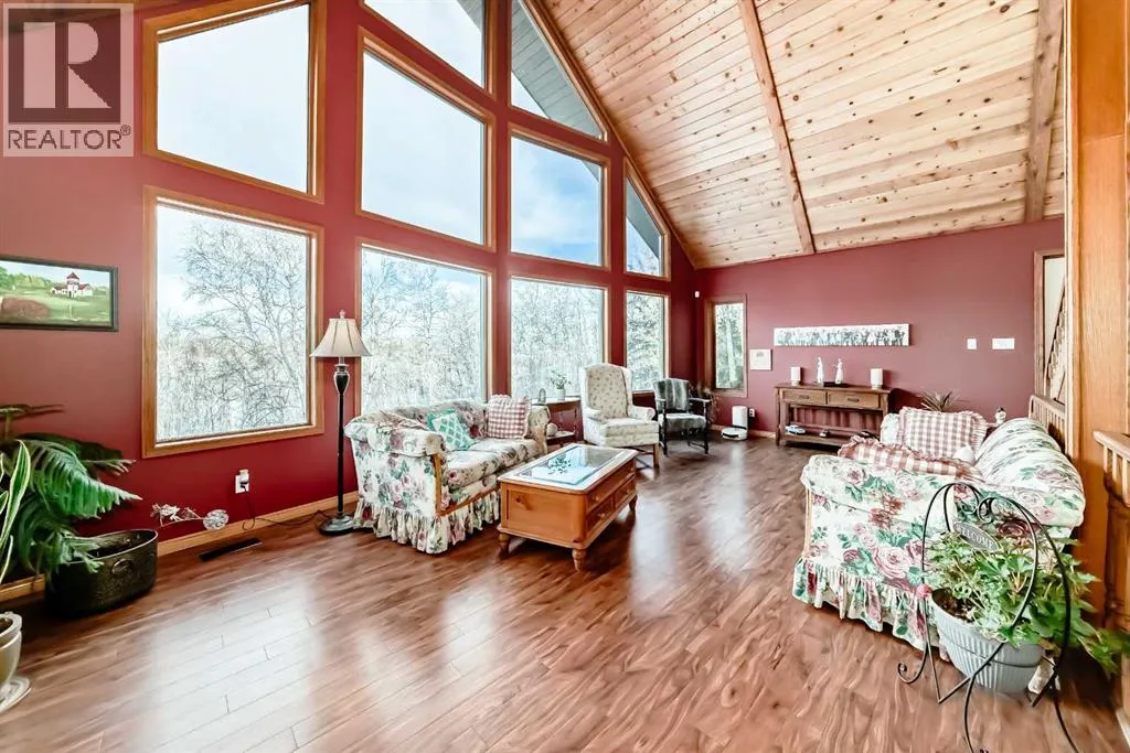 Welcome to this beautiful original-owner 3.39-acre custom-built acreage, offering a fully finished home with 5 bedrooms, 4 bathrooms, a large double attached garage, and an incredible 50â x 70â heated shop with a 12â x 50â addition complete with its own washroom. Step inside and youâll immediately notice the soaring vaulted cedar ceilings and the stunning recently renovated kitchen, designed to impress. This chefâs kitchen features solid oak cabinetry, granite countertops, stainless steel appliances, a large island with KitchenAid gas cooktop, corner pantry, and modern vinyl flooring. The spacious dining area easily accommodates large gatherings and overlooks the wraparound deck, making it perfect for entertaining. The inviting living room showcases a double-sided masonry wood-burning fireplace, creating a warm focal point for the space. On the opposite side, a large family room with near floor-to-ceiling windows captures breathtaking views of the surrounding landscape. The main floor also includes a bedroom, convenient main floor laundry, and a 4-piece bathroom. Upstairs youâll find a massive private primary retreat, complete with its own deck, walk-in closet, and a luxurious 4-piece ensuite. The walkout basement offers even more living space with a wood stove, games/craft room, cold room, additional storage, a 4-piece bathroom, and three more bedroomsâincluding one with its own 4-piece ensuite and walk-in closet. Outside, the property truly shines with a stunning landscaped yard recognized for rural beautification, a large wraparound deck perfect for gatherings, multiple storage sheds, a bunkhouse that sleeps six with a Murphy bed, and even a charming outhouse. The standout feature is the modern heated 50â x 70â shop with a 12â x 50â addition, 16â ceilings, 14â overhead doors, and ample space for large vehicles, equipment, or recreational toys. Ideally located just 17 minutes east of Red Deer and only 10 minutes to Delburne, this remarkable acreage offers the perf ect blend of privacy, space, and convenience. (id:27476)