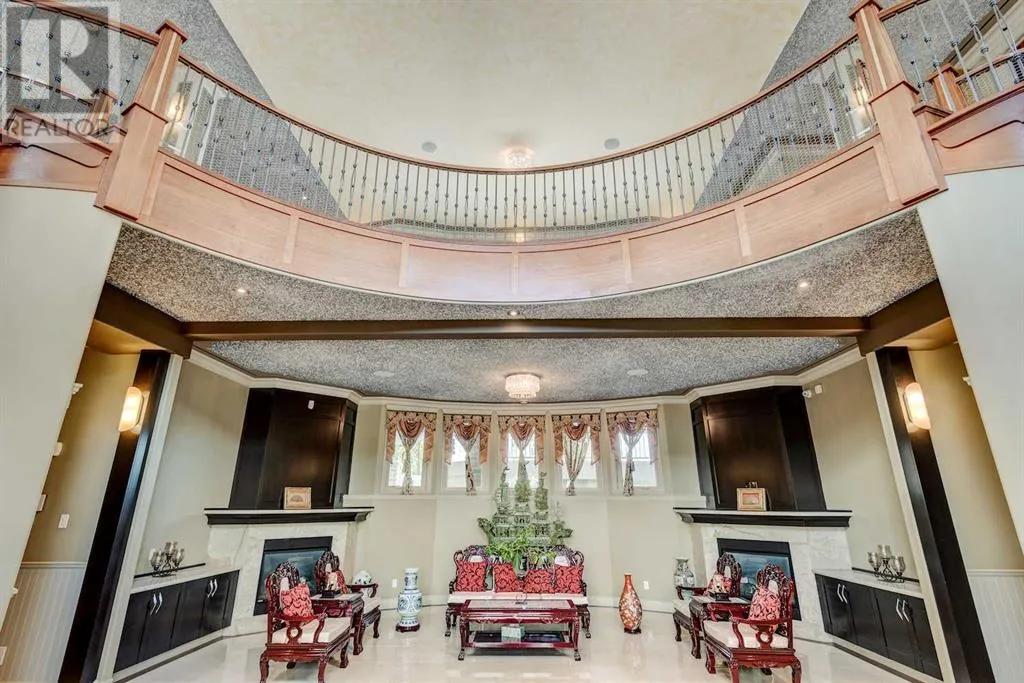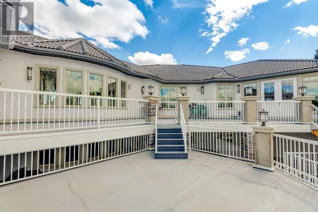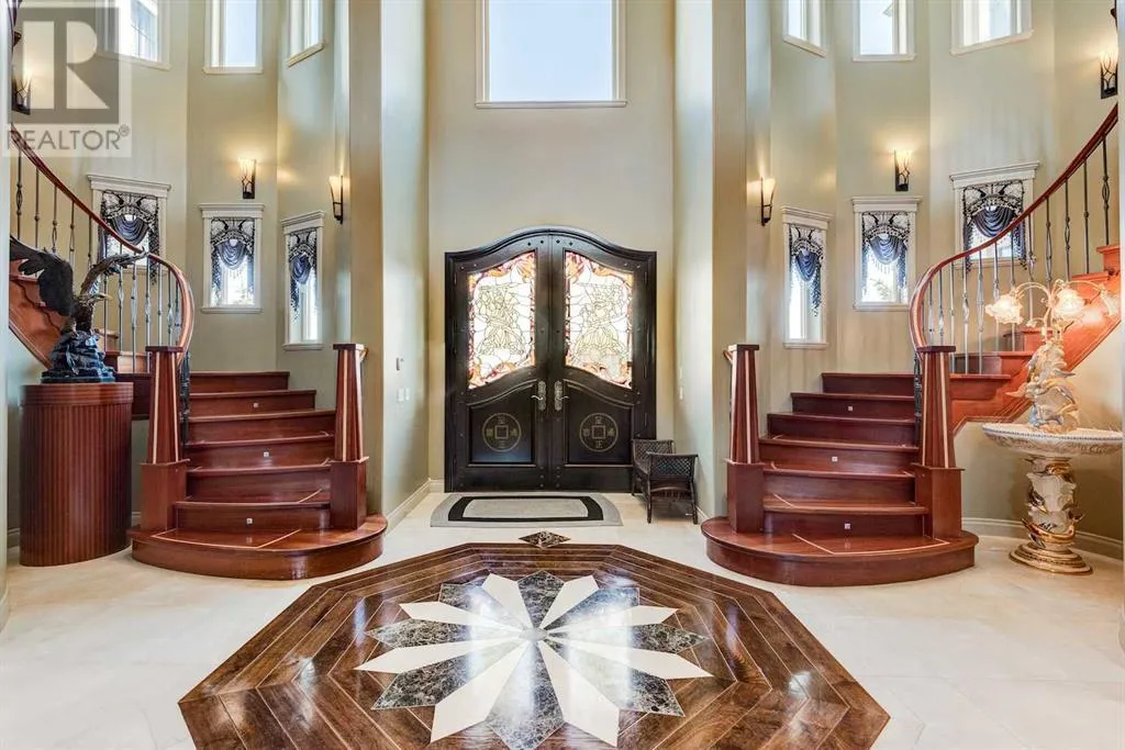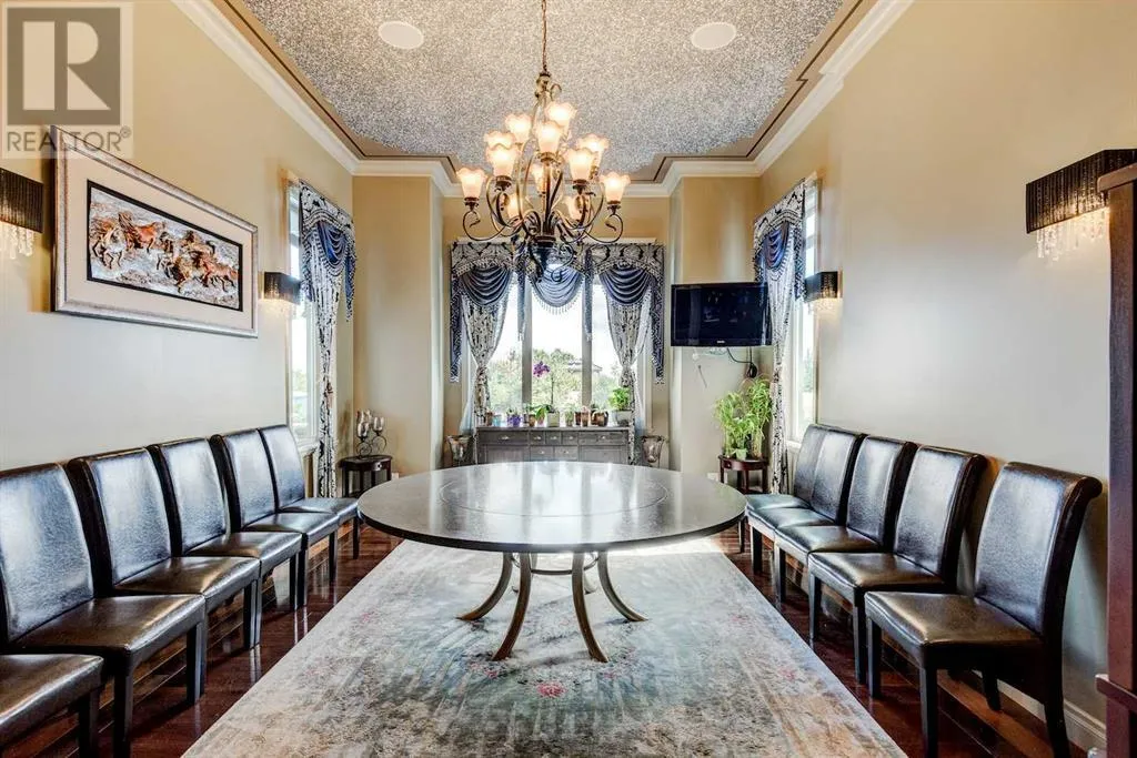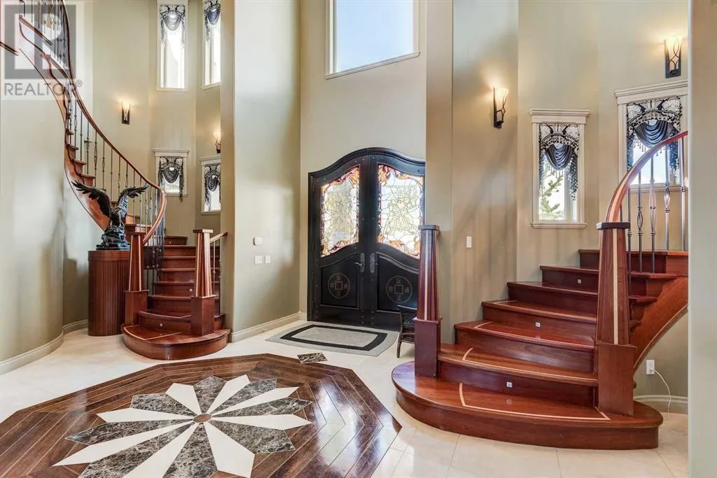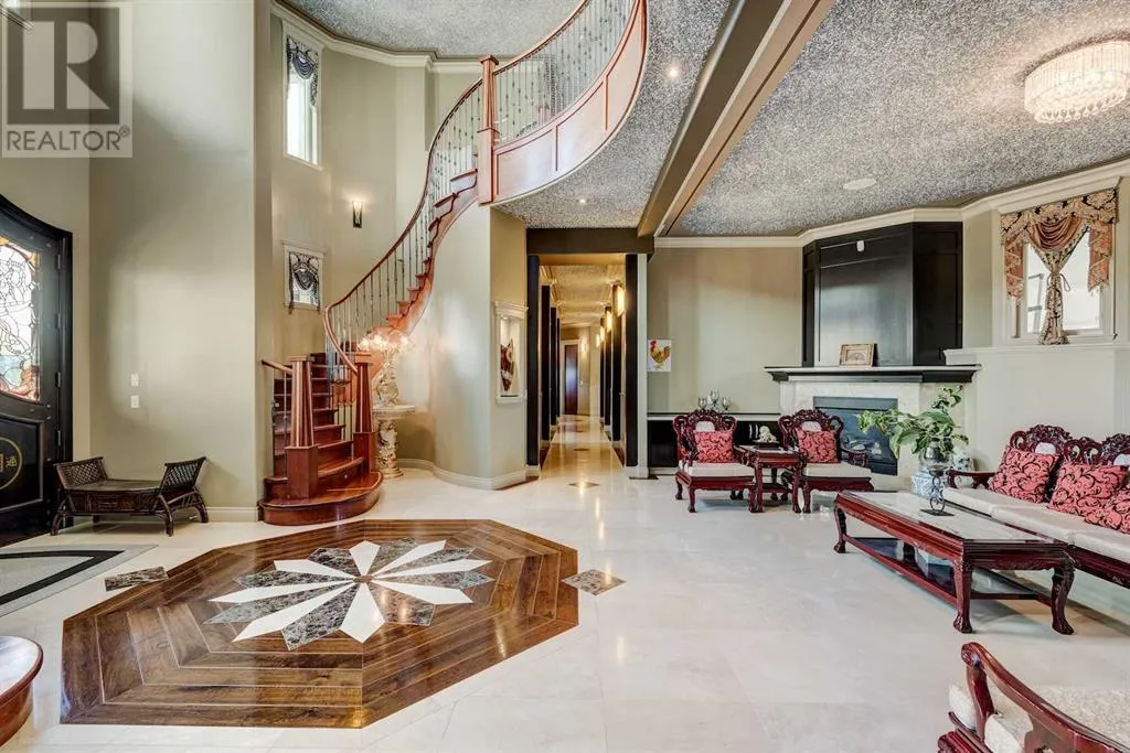 This architectural masterpiece offers an impressive fully furnished 13,500 SF of lavish living space, including a sprawling 2,700 SF gymnasium. A grand foyer, adorned with an imperial spiral staircase, warmly welcomes your guests. High ceilings grace this abode, featuring 7 bedrooms, 6 ensuite bathrooms, 3 additional bathrooms, an exercise room, a theatre room, and a formal dining room.This custom-designed residence offers an array of luxurious amenities, meticulously crafted for your entertainment and pleasure. The interior spaces are versatile, accommodating everything from formal dinners and cocktail soirées to movie nights, fully equipped karaoke system and lively games of basketball or badminton. The main level also boasts a bright sitting area with a well-appointed bar, a games area, and a magnificent sunroom. The open gourmet kitchen comes equipped with high-end built-in appliances, satisfying even the most discerning chefs. The primary bedroom retreat is a true oasis, complete with a cozy sitting area, a balcony, a walk-in closet with custom organizers, a soothing waterfall shower, and a rejuvenating Jacuzzi tub. Outside, a multi-level deck and terrace provide covered and open spaces for outdoor entertainment, all while offering panoramic views of the rolling Calgary hills. The private backyard is enveloped by lush landscaping and towering trees. With a 5-car insulated oversized garage and ample paved parking for guests, convenience is never compromised.Ideally situated, this home is just a short 5-minute drive from Bearspaw Golf Club and only 10 minutes away from Calgary's shopping, restaurants, schools, and more. Designed with the principles of Feng Shui, this estate fosters balance and harmony between you and the natural world that surrounds it. Don't miss the opportunity to make this stunning property your own. (id:27476)