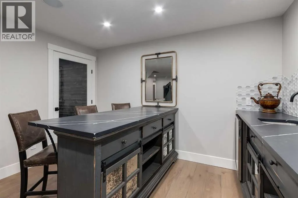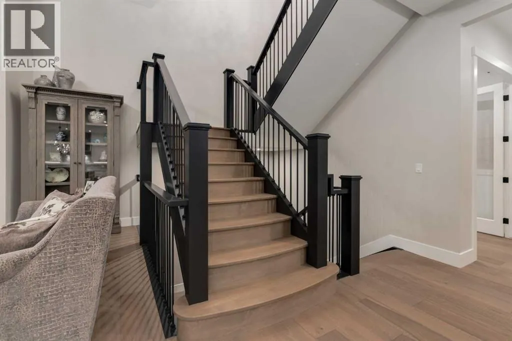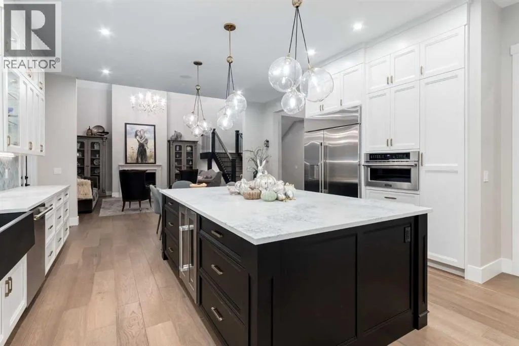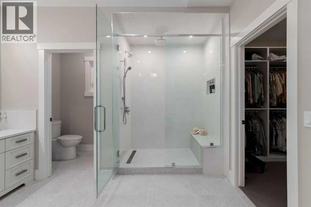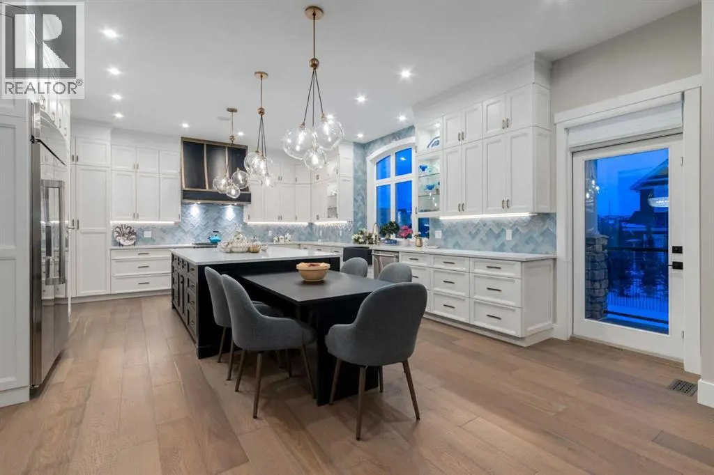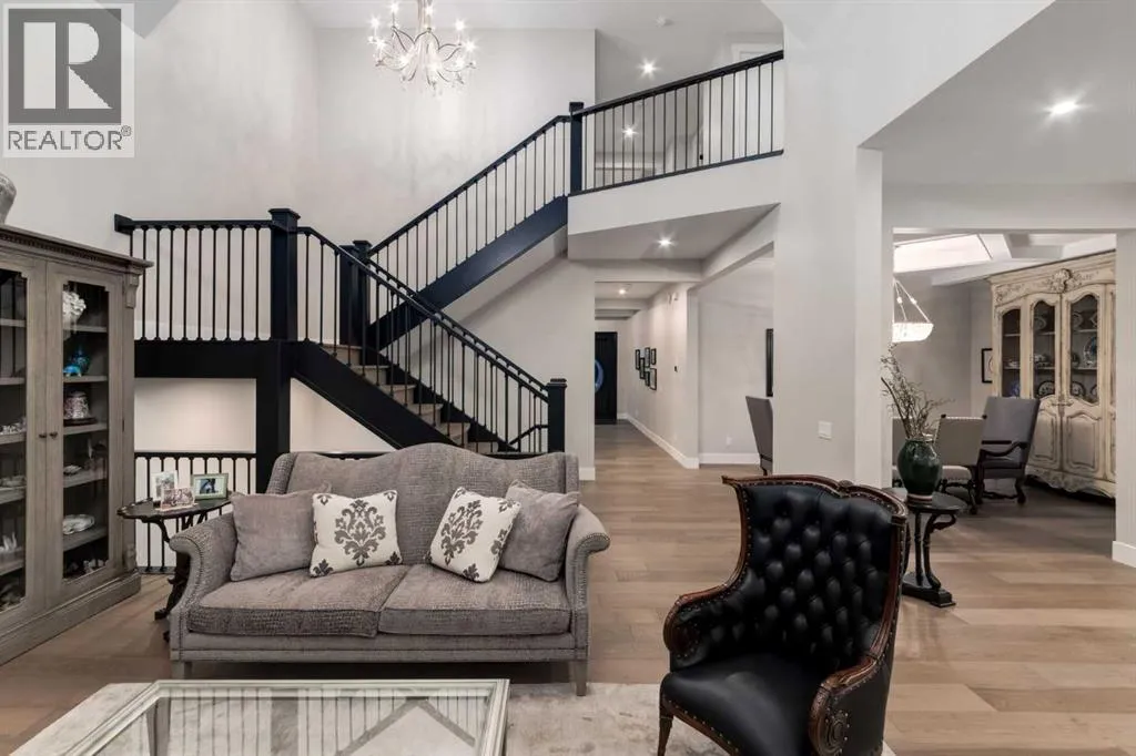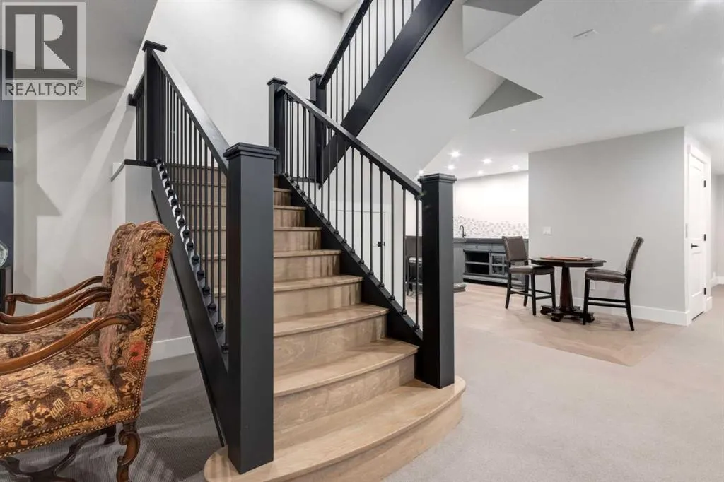 Masterfully executed in a transitional design style, this exquisite Family Home showcases nearly 5,500 sf of impeccable luxury defined by unparalleled craftsmanship and the highest quality of finishes throughout, including an ELEVATOR for easy accessibility to all three floors. The exterior architecture exudes a timeless appeal from the peaked rooflines to the "eyebrow" detailing to the rich stone accents, incredible window designs, a front veranda & upper balcony, and a striking "piece de resistance" front door. The beautifully landscaped front and back gardens impress with perfectly manicured flower beds, and a textural mélange of shrubs and trees. The home's layout is outstanding, while the interior design elements leave a lasting impression on the most discerning "eye for design". The main floor boasts soaring ceiling heights with coffered detailing, impressive, large windows flooding the interior with streams of natural light, custom millwork designs, beautiful, wide-plank hardwood floors, timeless floor and backsplash tile designs, and last but not least, exquisite "Schonbek" chandeliers. The grand, light-filled great room features a magnificent fireplace. It is open to the decadent kitchen and an elegant dining room perfectly suited to hosting dinner parties for family and friends. The front study offers complete privacy and leads to a unique "plant sunroom". The custom-designed kitchen is a chef's dream featuring high-end appliances, ample storage with pullout units, a gigantic center island, timeless quartz countertops, a coveted "Hammersmith" range hood, and last but not least, an impressive chevron pattern backsplash design executed with the utmost precision. Beautifully custom-designed stairs ascend to the upper level complete with three bedrooms and a bonus room, perfectly suited for the children's play area, a TV/games room, or a study room. The master suite is a luxurious retreat complete with wool carpeting, a showpiece chandelier, its own West-facin g balcony and a lavish spa-like ensuite and "dressing room" - a fashionista's dream. Each of the children's bedrooms offers its own chic ensuite bath. The lower level is a true "entertaining haven" featuring a family/TV room that opens onto a private patio area, a wet bar complete with custom furniture-piece units, a wine room, three additional bedrooms, one of which being designated as an exercise room, a full bathroom and a large storage/cold room area. The double and single garage spaces are heated. The single garage is complete with 220 V wiring to allow for an EV charging station. The monthly HOA fees include front yard maintenance, including weekly mowing/trimming; weekly curbside garbage/recycling pickup; snow removal on the streets, sidewalks, pathways & the central plaza; maintenance of the central plaza, cascading ponds, outdoor kitchen, and playgrounds. Please refer to the community website for a wealth of information. MUST BE SEEN! (id:27476)