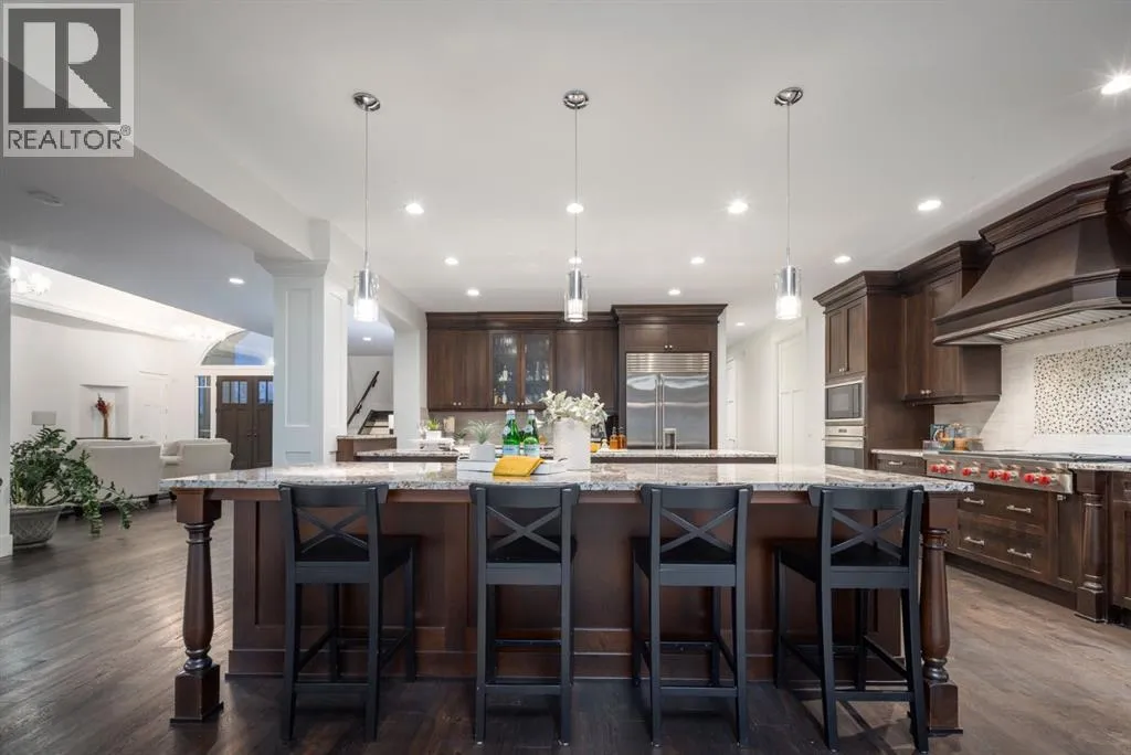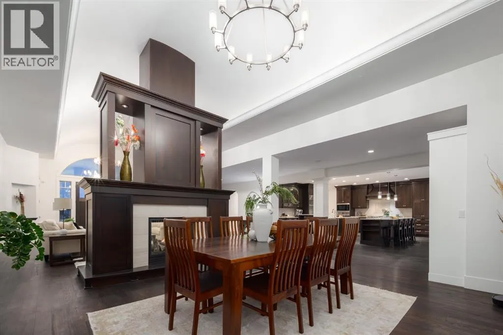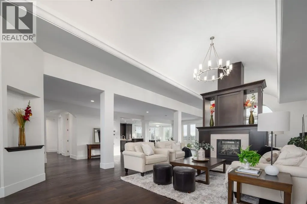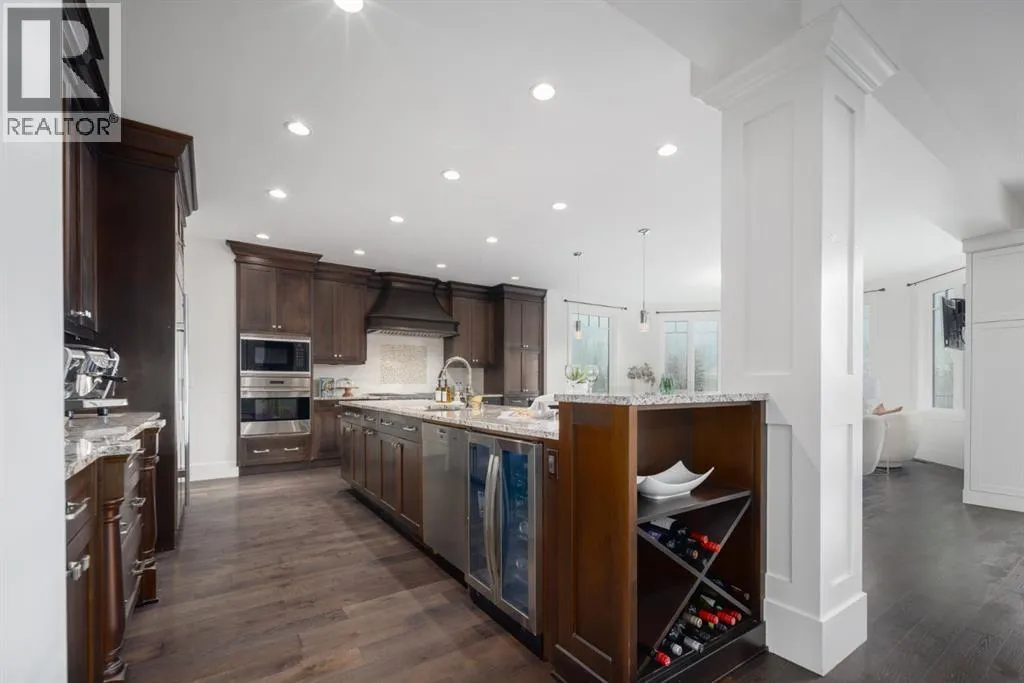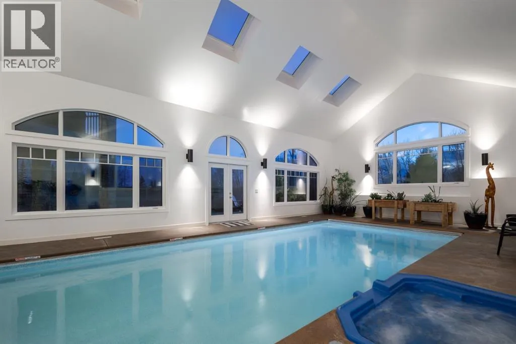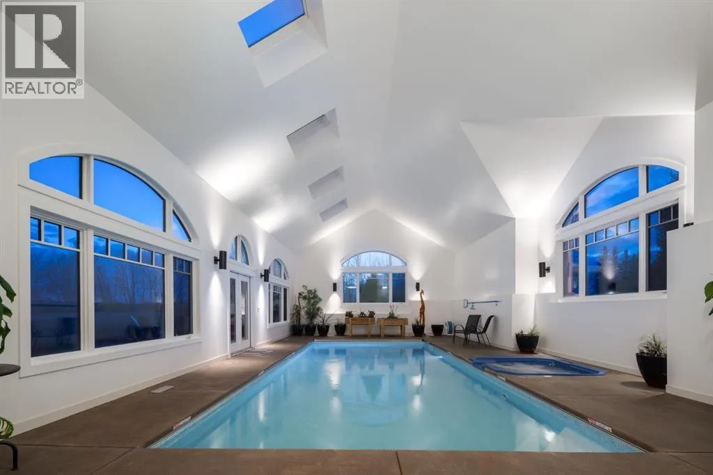Located in prestigious Grandview Estates on a prime Southwest-facing lot with breathtaking Rocky Mountain views, this impressive custom-built estate offers over 8,500 square feet of exceptionally designed living space executed by renowned builder Maillot Homes. Recently refreshed with an updated color palette, the home feels modern, bright, and move-in ready. Featuring one of the largest residential solar installations in Canada, this property combines remarkable energy efficiency with luxurious family living. A grand barrel-vaulted ceiling feature welcomes you inside, where expansive living and dining areas are connected by a striking two-sided fireplace and framed by oversized windows that flood the space with natural light. The gourmet kitchen is truly the heart of the home, offering dual oversized islands, top-of-the-line Wolf & Sub-Zero appliances, abundant cabinetry, and a sun-drenched breakfast nook that opens onto the southwest deck â perfect for casual family meals or elegant entertaining. Designed for gathering and memory-making, the residence features an incredible indoor saltwater pool and hot tub oasis, an inviting media room for movie nights, and a wine room. A lower-level secondary kitchen, expansive rec room, and direct access to the pool area complete the walkout basement, where comfort meets entertainment at every turn. Thoughtful architectural details include an elevator providing access to all levels as well as the garage, ensuring long-term accessibility. A custom-built, handicap-accessible Jack and Jill bathroom on the lower level features a curb-less shower and a wheelchair-friendly sink, an oversized four-car garage with dog wash and RV bay, and an abundance of strategically placed skylights enhancing the natural light throughout the home. The upper level offers a bonus room suite with a private bedroom and full ensuite, perfect for guests or extended family. The primary retreat is a true sanctuary, featuring a private balcony with unobstruct ed Southwest views, a romantic two-sided fireplace, and a spa-like ensuite with in-floor heating and a large walk-in closet. A dedicated study loft with built-in desks provides a quiet workspace for students or remote work needs. The walkout level is equally impressive, offering two additional bedrooms, a change room with full bathroom for pool guests, a second laundry area, and expansive entertaining spaces that open seamlessly to the outdoors. The fully landscaped outdoor areas include an expansive Southwest deck, a lower walkout patio, a fenced dog run, invisible pet fencing, and a cozy firepit area, making this property as functional as it is beautiful. With Calgaryâs top private schools and an abundance of retail shopping within a ten-minute drive, this property is ideally suited for families looking for privacy paired with convenience. This extraordinary residence is a true legacy property, offering an unparalleled lifestyle just minutes from city conveniences. (id:27476)