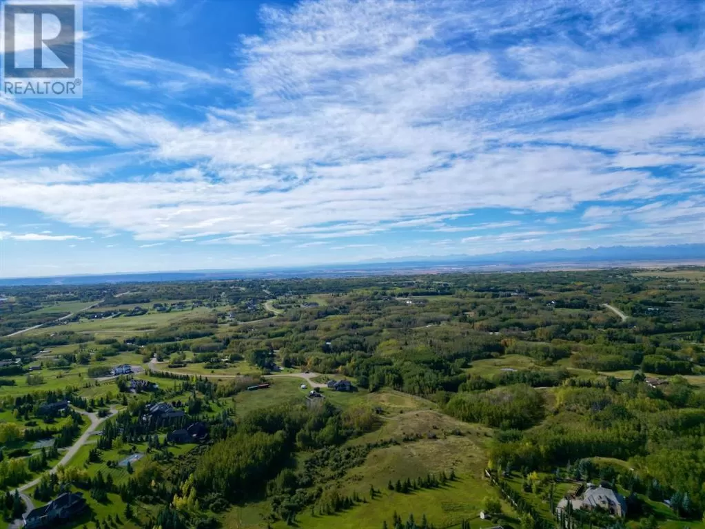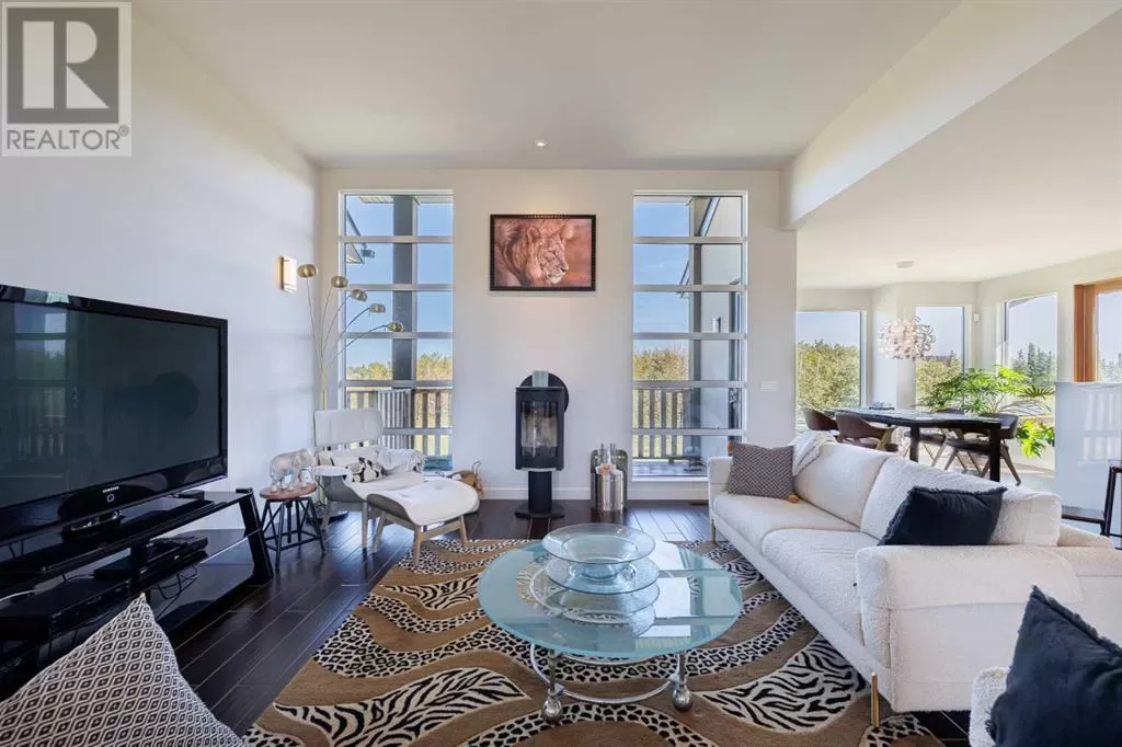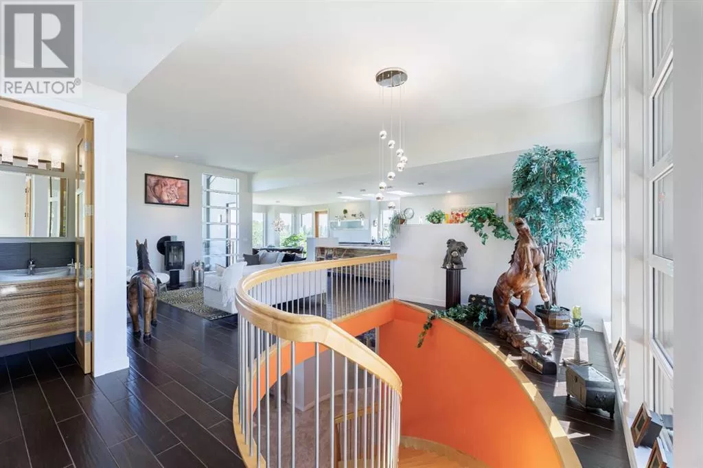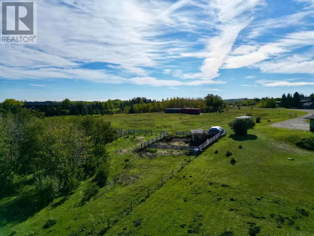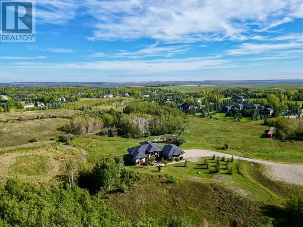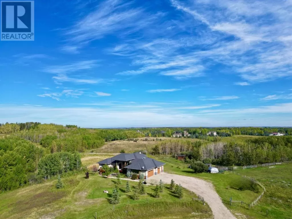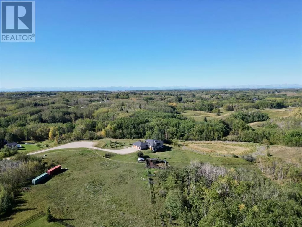 Nestled on a stunning 25.88-acre sub-dividable lot, this incredible acreage offers the ultimate blend of natural beauty and luxurious living. The land is richly adorned with mature trees, rolling hills, and serene ponds, creating a peaceful haven that is perfect for equestrian enthusiasts, complete with multiple horse shelters and fenced pastures. As you step into the main entrance, you're welcomed by an open-concept design that flows effortlessly into the heart of the home. The grandeur of the space is amplified by soaring 9-foot ceilings and expansive floor-to-ceiling triple glazed windows, allowing natural light to flood the main living area. At the heart of the home, the gourmet kitchen is a chef's dream, boasting custom cabinetry, a striking central island, and top-tier appliances, including a Sub-Zero refrigerator and a Wolf gas stove. Ideal for both intimate dinners and grand entertaining, the kitchen opens to a formal dining area that extends to a large back deck, offering breathtaking views of the property's rolling landscape. Just off the kitchen, the spacious living room invites you to relax in front of a sleek, ultra-modern wood-burning stove, capable of heating the entire home if desired. The roomâs 11-foot ceilings & floor-to-ceiling windows continue the theme of bringing the outdoors in, framing picturesque views of the estate. The main floor also features the primary bedroom, a peaceful retreat with direct access to a private balcony where you can enjoy your morning coffee while taking in the tranquil surroundings. This thoughtfully designed room includes a generous walk-in closet and a luxurious 5-piece ensuite. A second bedroom on the main level offers large windows, a 4-piece ensuite and access to very private space on the back deck. The newly updated lower level of the home offers even more space for family and friends, with a spacious family room, three additional bedrooms and a brand new 3pc bathroom. Additionally, two of these bedrooms are con nected by a newly finished Jack and Jill bathroom, offering convenience and versatility. The walkout lower level opens directly onto the property, presenting an ideal opportunity to create an additional outdoor living space, such as a patio that capitalizes on the estateâs stunning views. Rounding out the home is an oversized triple garage with heated floors, which connects to a large mudroom and laundry room on the main level, providing ample storage and practicality. This high efficiency property features in-floor heating throughout the bathrooms and selected spaced in the home and offers an exceptional lifestyle opportunity, with endless potential for those seeking a serene retreat with the conveniences of modern luxury just minutes from Calgary. (id:27476)