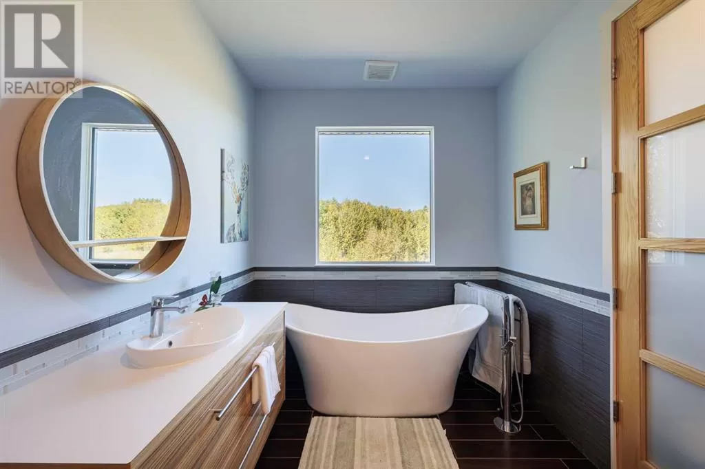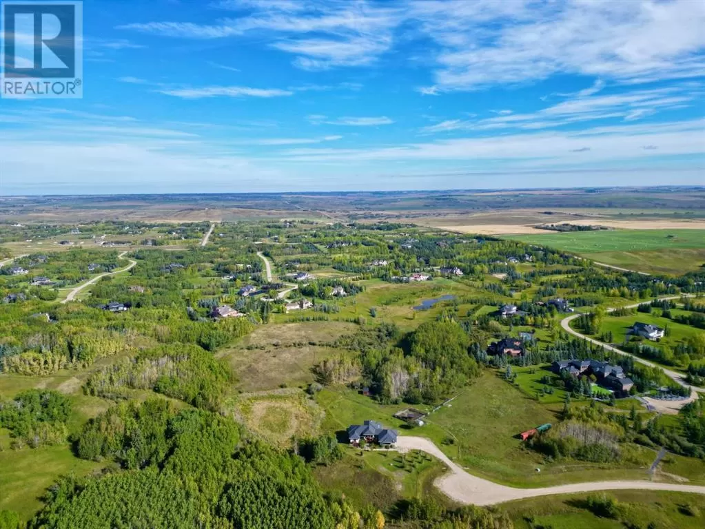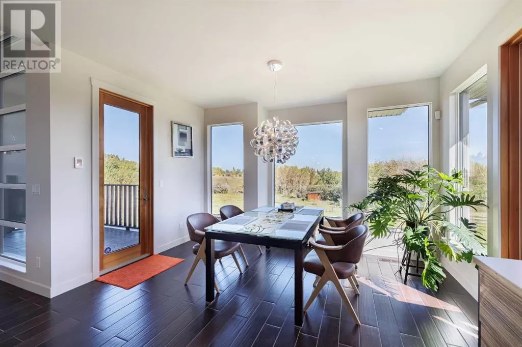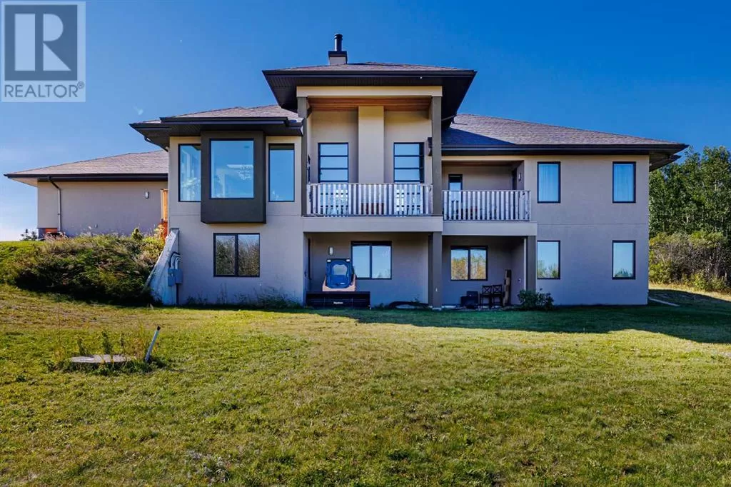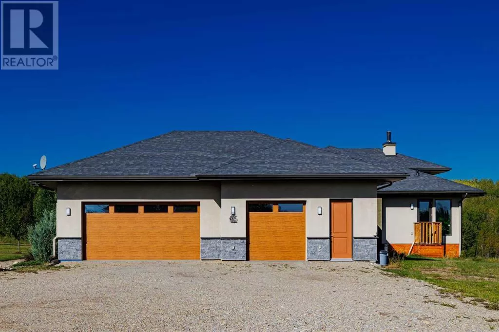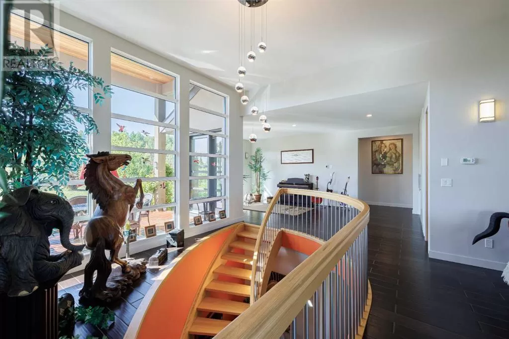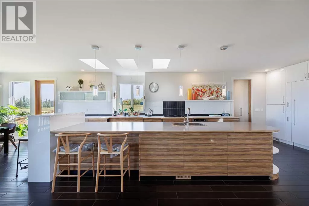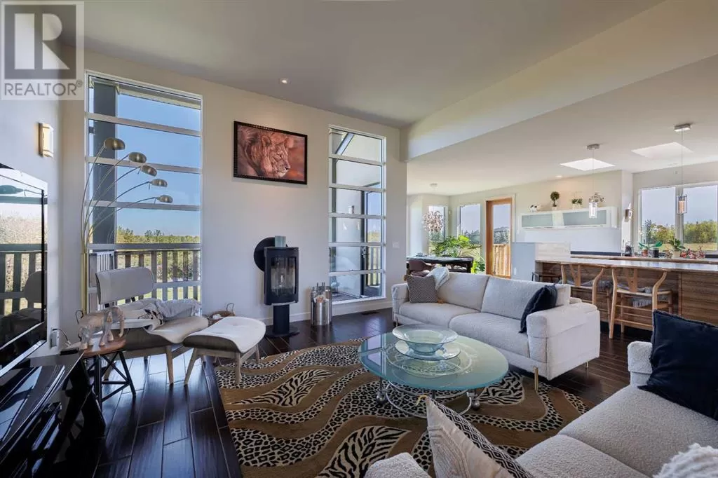 Nestled on a stunning 25.88-acre sub-dividable lot, this incredible acreage offers the ultimate blend of natural beauty and luxurious living. The land is richly adorned with mature trees, rolling hills, and serene ponds, creating a peaceful haven that is perfect for equestrian enthusiasts, complete with multiple horse shelters and fenced pastures. As you step into the main entrance, you're welcomed by an open-concept design that flows effortlessly into the heart of the home. The grandeur of the space is amplified by soaring 9-foot ceilings and expansive floor-to-ceiling triple glazed windows, allowing natural light to flood the main living area. At the heart of the home, the gourmet kitchen is a chef's dream, boasting custom cabinetry, a striking central island, and top-tier appliances, including a Sub-Zero refrigerator and a Wolf gas stove. Ideal for both intimate dinners and grand entertaining, the kitchen opens to a formal dining area that extends to a large back deck, offering breathtaking views of the property's rolling landscape. Just off the kitchen, the spacious living room invites you to relax in front of a sleek, ultra-modern wood-burning stove, capable of heating the entire home if desired. The roomâs 11-foot ceilings & floor-to-ceiling windows continue the theme of bringing the outdoors in, framing picturesque views of the estate. The main floor also features the primary bedroom, a peaceful retreat with direct access to a private balcony where you can enjoy your morning coffee while taking in the tranquil surroundings. This thoughtfully designed room includes a generous walk-in closet and a luxurious 5-piece ensuite. A second bedroom on the main level offers large windows, a 4-piece ensuite and access to very private space on the back deck. The newly updated lower level of the home offers even more space for family and friends, with a spacious family room, three additional bedrooms and a brand new 3pc bathroom. Additionally, two of these bedrooms are con nected by a newly finished Jack and Jill bathroom, offering convenience and versatility. The walkout lower level opens directly onto the property, presenting an ideal opportunity to create an additional outdoor living space, such as a patio that capitalizes on the estateâs stunning views. Rounding out the home is an oversized triple garage with heated floors, which connects to a large mudroom and laundry room on the main level, providing ample storage and practicality. This high efficiency property features in-floor heating throughout the bathrooms and selected spaced in the home and offers an exceptional lifestyle opportunity, with endless potential for those seeking a serene retreat with the conveniences of modern luxury just minutes from Calgary. (id:27476)