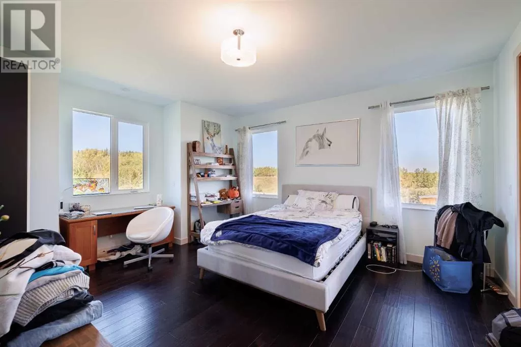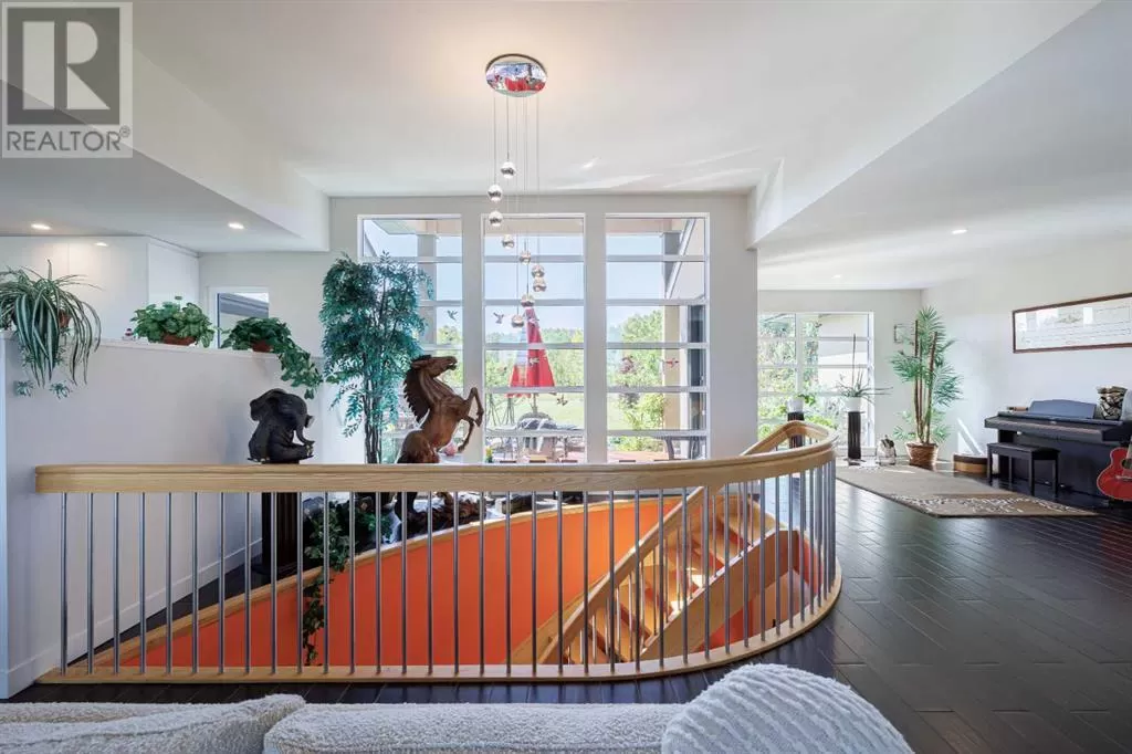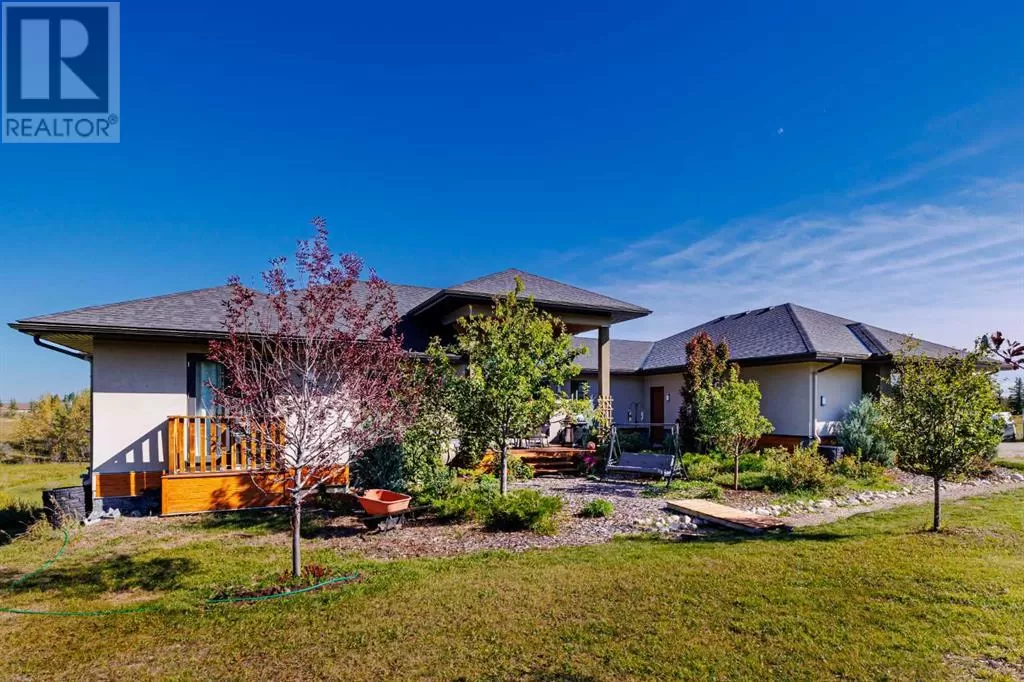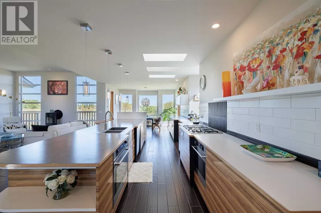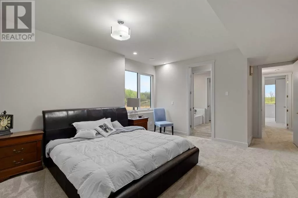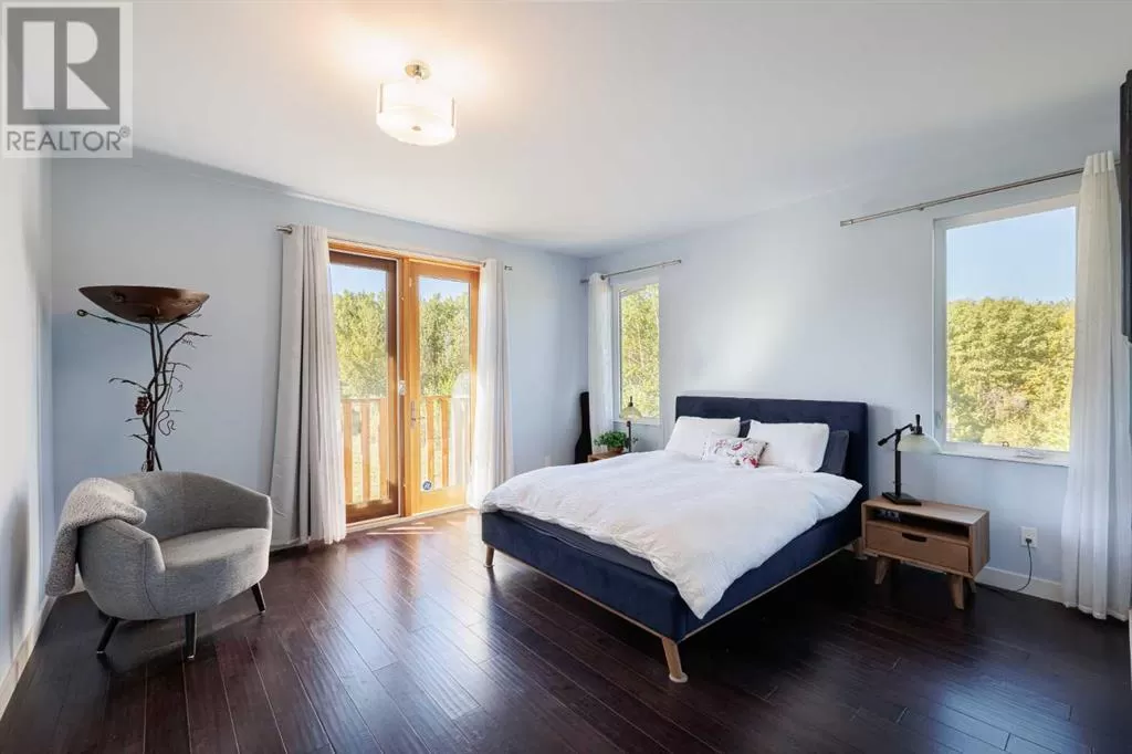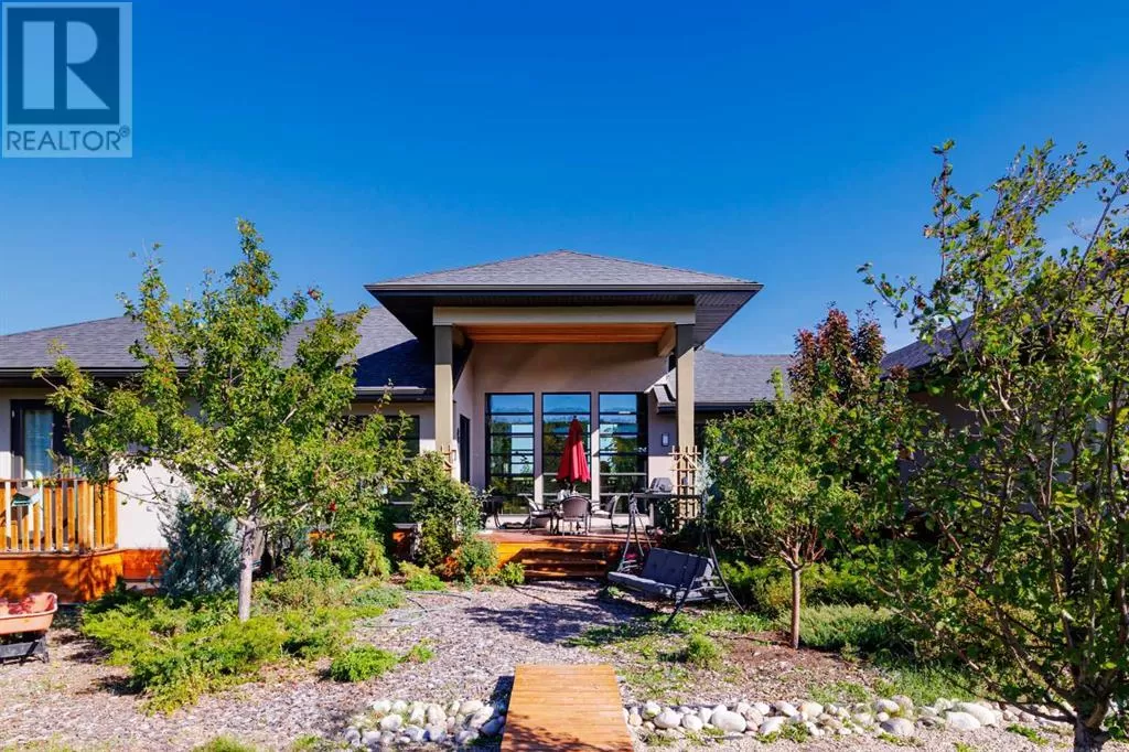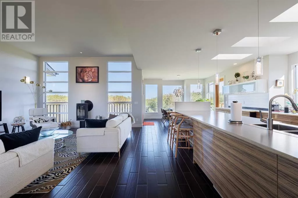 Nestled on a stunning 25.88-acre sub-dividable lot, this incredible acreage offers the ultimate blend of natural beauty and luxurious living. The land is richly adorned with mature trees, rolling hills, and serene ponds, creating a peaceful haven that is perfect for equestrian enthusiasts, complete with multiple horse shelters and fenced pastures. As you step into the main entrance, you're welcomed by an open-concept design that flows effortlessly into the heart of the home. The grandeur of the space is amplified by soaring 9-foot ceilings and expansive floor-to-ceiling triple glazed windows, allowing natural light to flood the main living area. At the heart of the home, the gourmet kitchen is a chef's dream, boasting custom cabinetry, a striking central island, and top-tier appliances, including a Sub-Zero refrigerator and a Wolf gas stove. Ideal for both intimate dinners and grand entertaining, the kitchen opens to a formal dining area that extends to a large back deck, offering breathtaking views of the property's rolling landscape. Just off the kitchen, the spacious living room invites you to relax in front of a sleek, ultra-modern wood-burning stove, capable of heating the entire home if desired. The roomâs 11-foot ceilings & floor-to-ceiling windows continue the theme of bringing the outdoors in, framing picturesque views of the estate. The main floor also features the primary bedroom, a peaceful retreat with direct access to a private balcony where you can enjoy your morning coffee while taking in the tranquil surroundings. This thoughtfully designed room includes a generous walk-in closet and a luxurious 5-piece ensuite. A second bedroom on the main level offers large windows, a 4-piece ensuite and access to very private space on the back deck. The newly updated lower level of the home offers even more space for family and friends, with a spacious family room, three additional bedrooms and a brand new 3pc bathroom. Additionally, two of these bedrooms are con nected by a newly finished Jack and Jill bathroom, offering convenience and versatility. The walkout lower level opens directly onto the property, presenting an ideal opportunity to create an additional outdoor living space, such as a patio that capitalizes on the estateâs stunning views. Rounding out the home is an oversized triple garage with heated floors, which connects to a large mudroom and laundry room on the main level, providing ample storage and practicality. This high efficiency property features in-floor heating throughout the bathrooms and selected spaced in the home and offers an exceptional lifestyle opportunity, with endless potential for those seeking a serene retreat with the conveniences of modern luxury just minutes from Calgary. (id:27476)