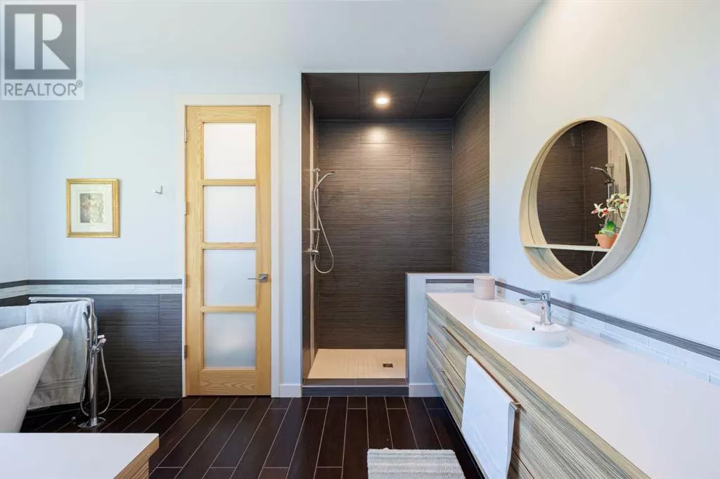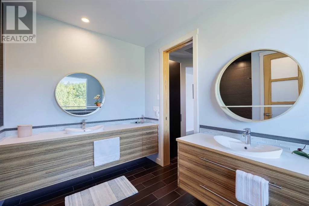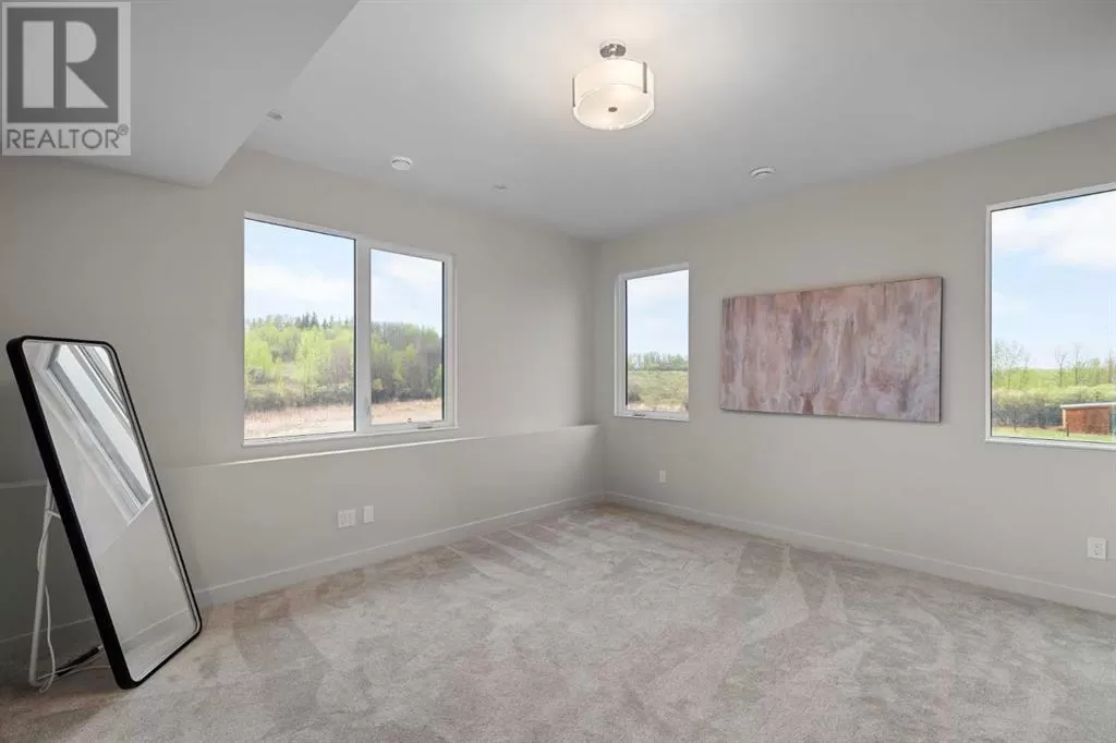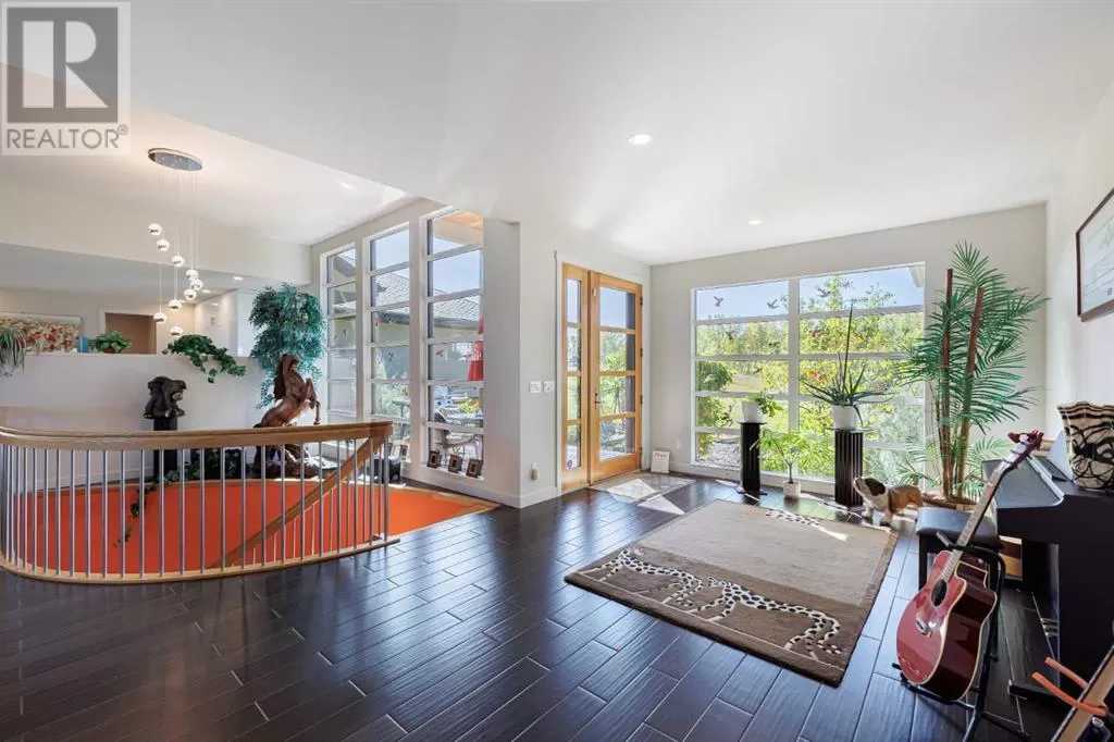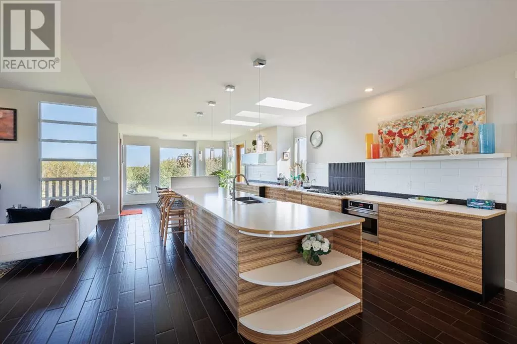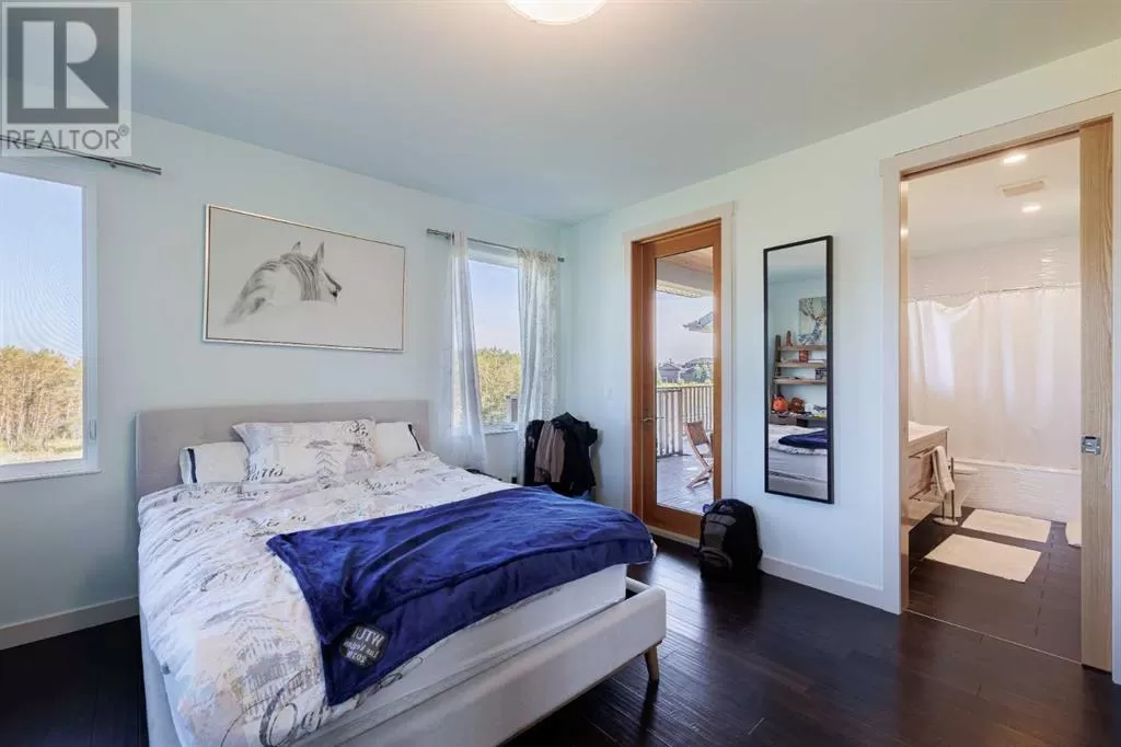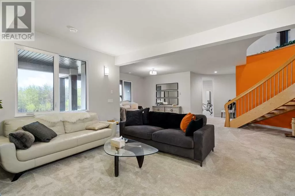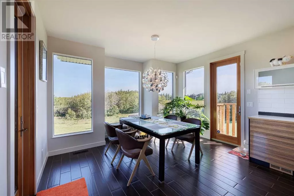 Nestled on a stunning 25.88-acre sub-dividable lot, this incredible acreage offers the ultimate blend of natural beauty and luxurious living. The land is richly adorned with mature trees, rolling hills, and serene ponds, creating a peaceful haven that is perfect for equestrian enthusiasts, complete with multiple horse shelters and fenced pastures. As you step into the main entrance, you're welcomed by an open-concept design that flows effortlessly into the heart of the home. The grandeur of the space is amplified by soaring 9-foot ceilings and expansive floor-to-ceiling triple glazed windows, allowing natural light to flood the main living area. At the heart of the home, the gourmet kitchen is a chef's dream, boasting custom cabinetry, a striking central island, and top-tier appliances, including a Sub-Zero refrigerator and a Wolf gas stove. Ideal for both intimate dinners and grand entertaining, the kitchen opens to a formal dining area that extends to a large back deck, offering breathtaking views of the property's rolling landscape. Just off the kitchen, the spacious living room invites you to relax in front of a sleek, ultra-modern wood-burning stove, capable of heating the entire home if desired. The roomâs 11-foot ceilings & floor-to-ceiling windows continue the theme of bringing the outdoors in, framing picturesque views of the estate. The main floor also features the primary bedroom, a peaceful retreat with direct access to a private balcony where you can enjoy your morning coffee while taking in the tranquil surroundings. This thoughtfully designed room includes a generous walk-in closet and a luxurious 5-piece ensuite. A second bedroom on the main level offers large windows, a 4-piece ensuite and access to very private space on the back deck. The newly updated lower level of the home offers even more space for family and friends, with a spacious family room, three additional bedrooms and a brand new 3pc bathroom. Additionally, two of these bedrooms are con nected by a newly finished Jack and Jill bathroom, offering convenience and versatility. The walkout lower level opens directly onto the property, presenting an ideal opportunity to create an additional outdoor living space, such as a patio that capitalizes on the estateâs stunning views. Rounding out the home is an oversized triple garage with heated floors, which connects to a large mudroom and laundry room on the main level, providing ample storage and practicality. This high efficiency property features in-floor heating throughout the bathrooms and selected spaced in the home and offers an exceptional lifestyle opportunity, with endless potential for those seeking a serene retreat with the conveniences of modern luxury just minutes from Calgary. (id:27476)