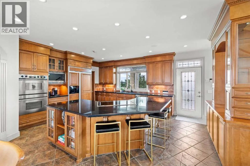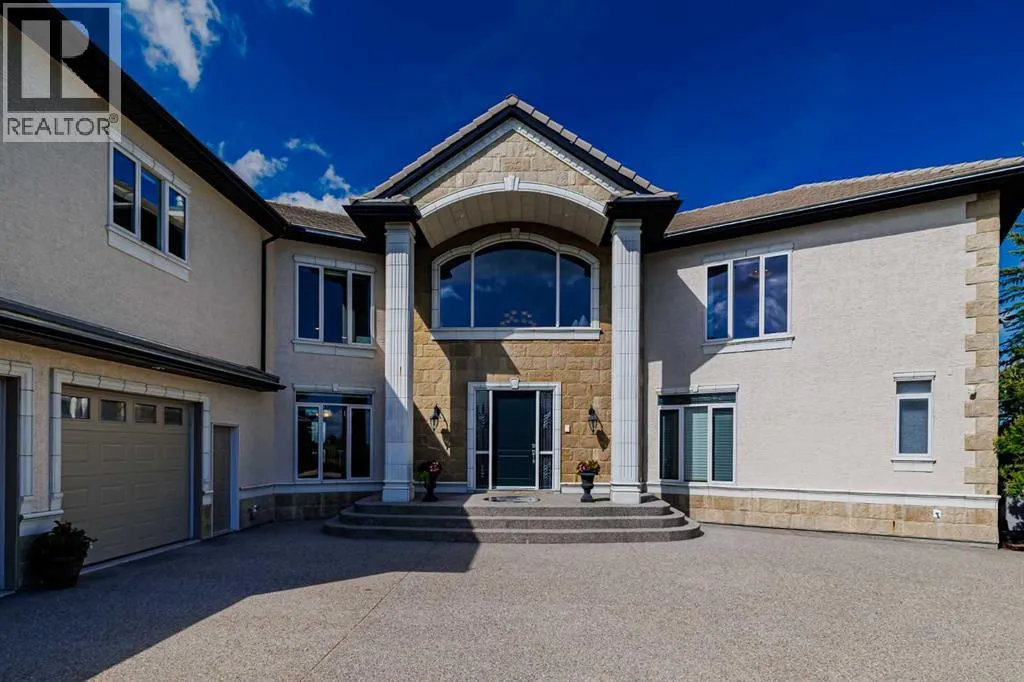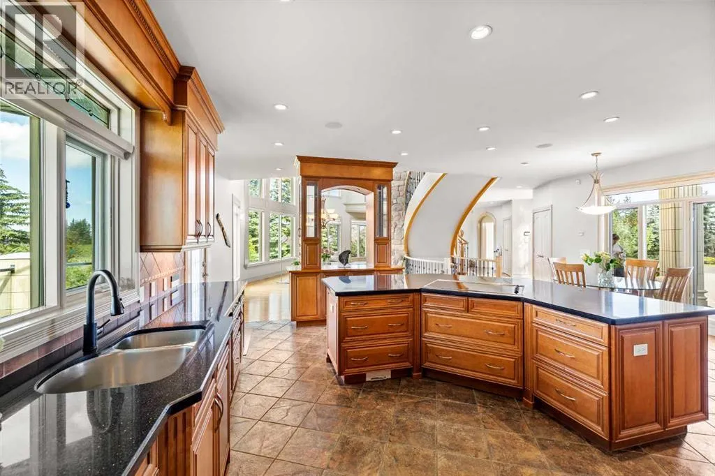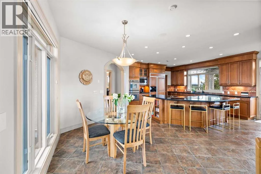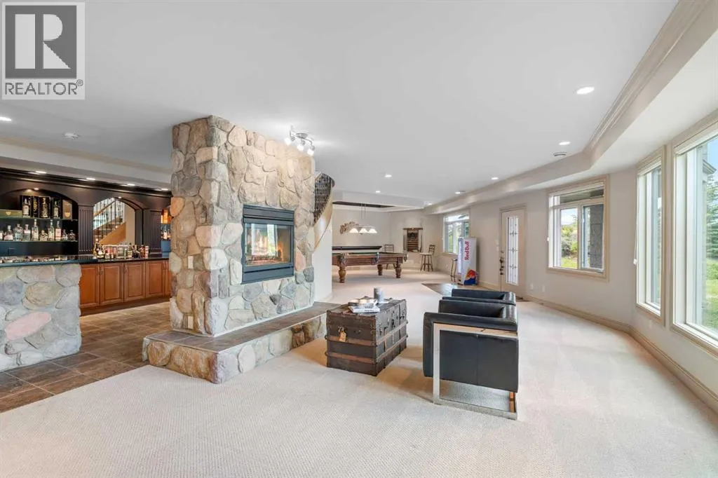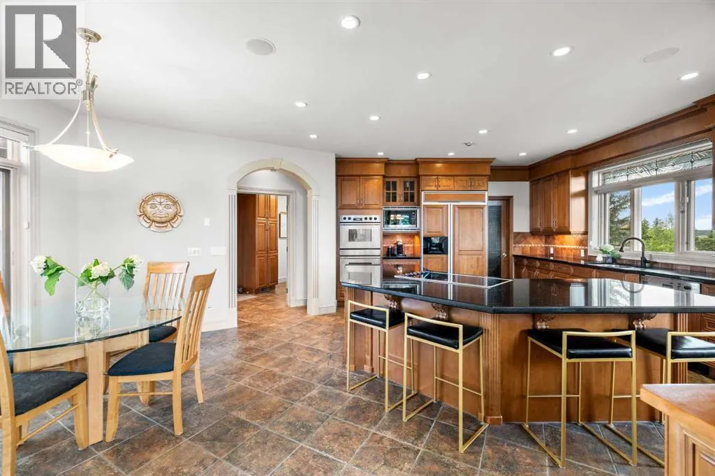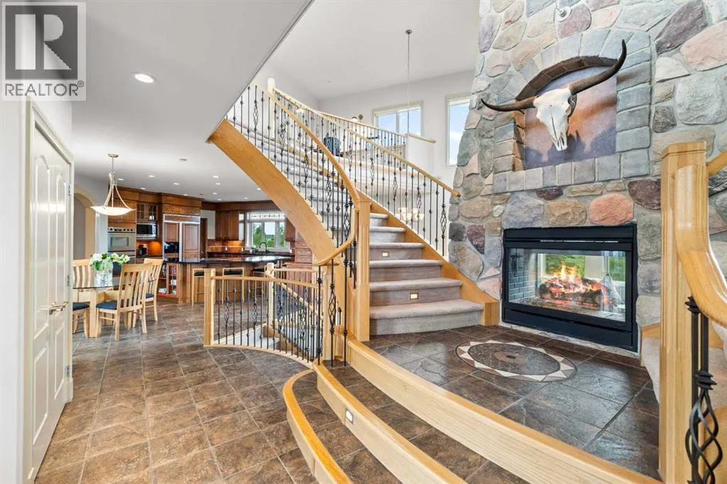 Welcome to this extraordinary 4 acre estate, where luxury, functionality, and breathtaking mountain views converge in perfect harmony! The garage is a standout feature of this abode, offering space for up to nine vehicles! With a fully epoxied finish and in-floor heating, ideal for the automotive enthusiast or easily transformed into a massive shop complete with its own bathroom. The home has been recently refreshed with brand new interior and exterior paint and complemented by a newly paved driveway, this meticulously designed home offers an unparalleled living experience. Stepping inside you are greeted with a spectacular double-sided, floor to ceiling stone fireplace with dual staircases emerging from its base leading to the upper level of the home. From here you are met with the kitchen, a chefâs dream, complete with a large granite island, ceiling-height cabinetry, stainless steel appliances, and a spacious walk-in pantry. It seamlessly flows into the eating nook and living room, creating a welcoming hub for daily life. The adjacent living room offers vaulted ceilings with expansive windows showcasing panoramic views of the mountains and rolling hills, with direct access to the spacious back deck. An exceptional theatre room with custom built-ins, two powder rooms and main floor laundry, with a brand new washer and dryer, complete this fantastic main floor. Upstairs you are met with a cozy window seat, a built-in reading nook and desk space, perfect for leisurely reading or a study area. The primary retreat is truly exceptional, featuring its own private deck to soak in the endless mountain vistas, a luxurious 5-piece ensuite with a jetted soaking tub beneath a skylight, dual vanities, a private steam shower, and a walk-in closet with custom built-ins. A private office or potential fitness area is also accessible from the primary bedroom. Completing this upper level are two additional bedrooms joined by a stylish Jack and Jill 5-piece bathroom. Descending to th e fully finished walkout basement, this space is designed for entertaining with a spacious family room showcasing a double-sided fireplace! The wet bar is complete with raised seating, a beverage fridge, full-sized fridge, and custom wine storage which is seamlessly connected to the custom billiards space with pool table included! Finishing off this level is an additional bedroom and full bathroom. The property is hardwired for a gate, features 400-amp service, complete with full irrigation, and a central vacuum system for ultimate convenience. Furthermore, in-floor heating continues throughout all three levels of the home, providing year-round comfort. This incredible property is set on a private lot with stunning panoramic mountain views, offering tranquility, privacy, and timeless elegance. Pride of ownership is seen throughout this meticulous masterpiece! (id:27476)