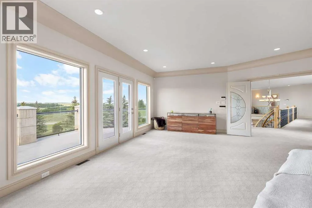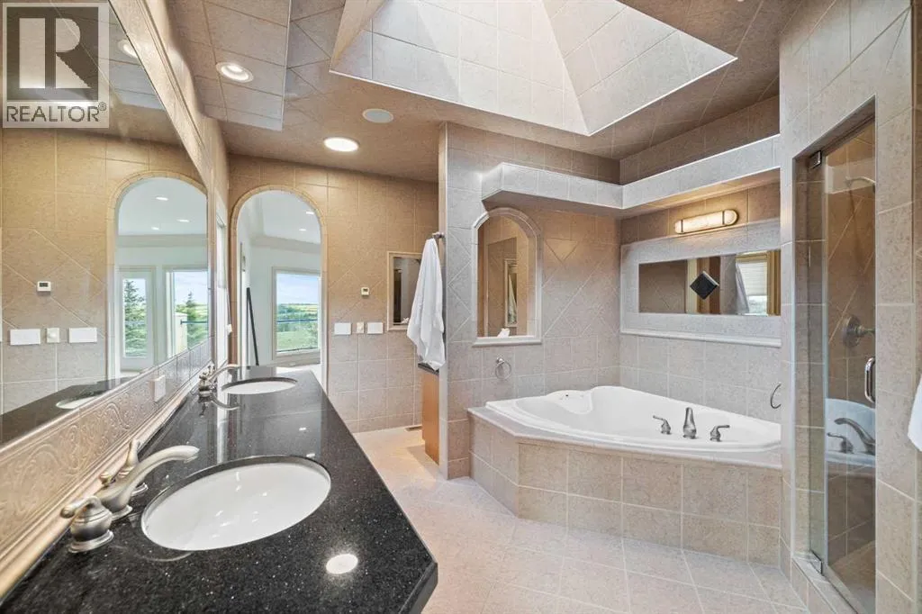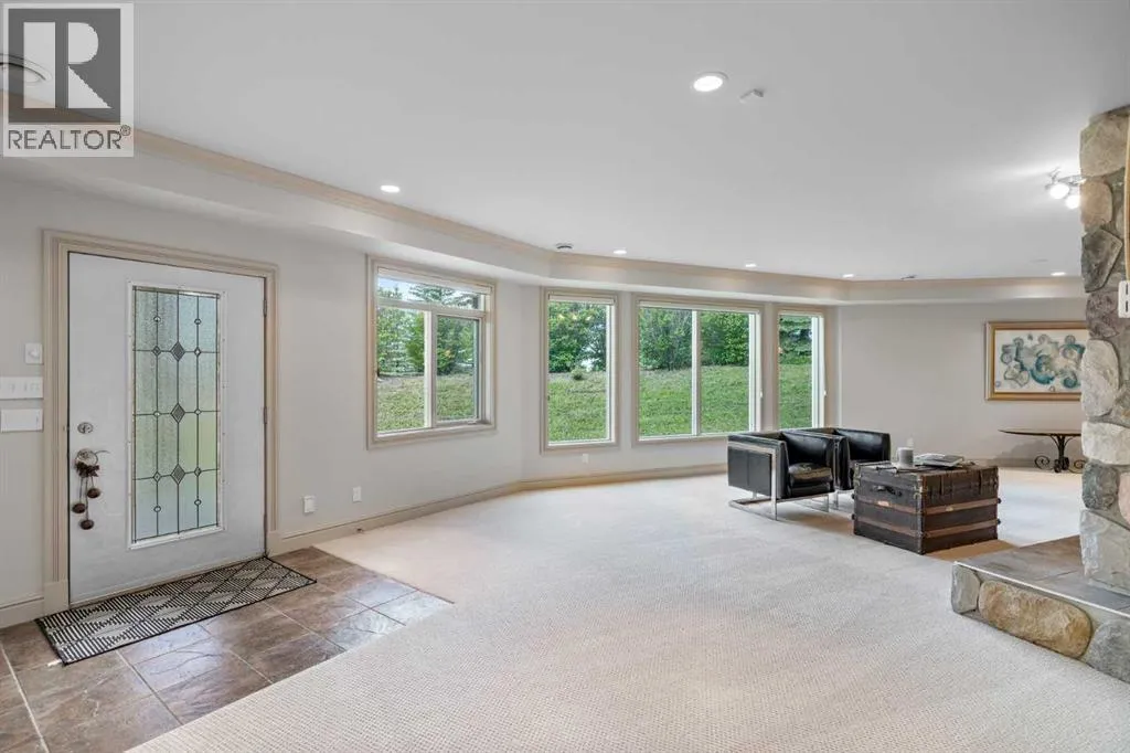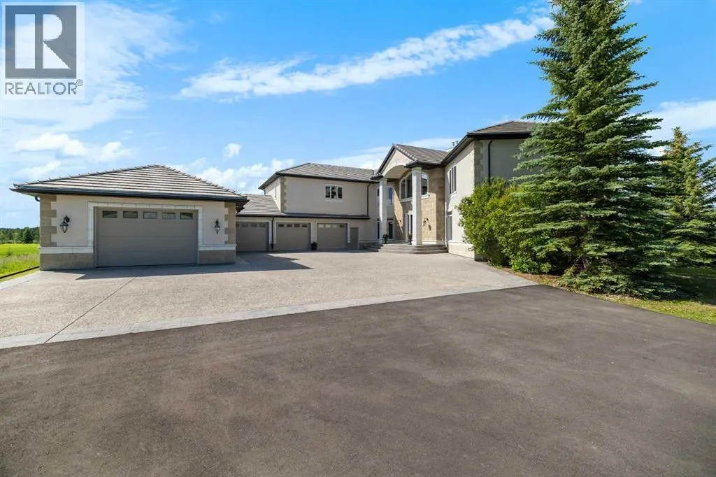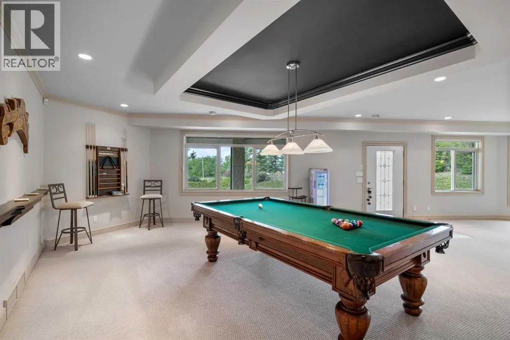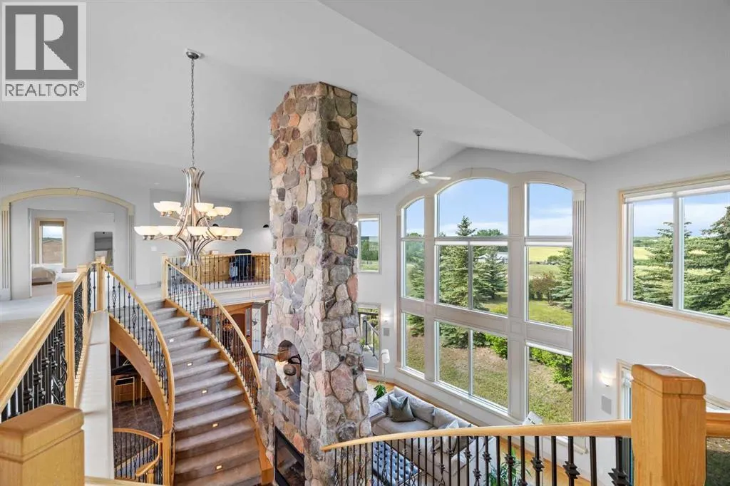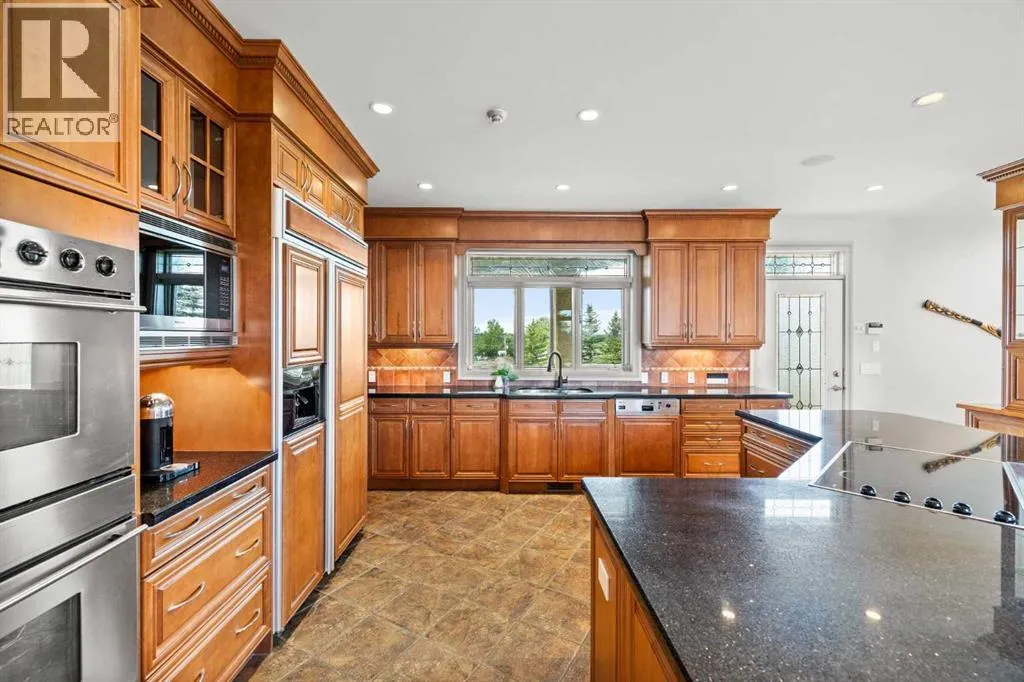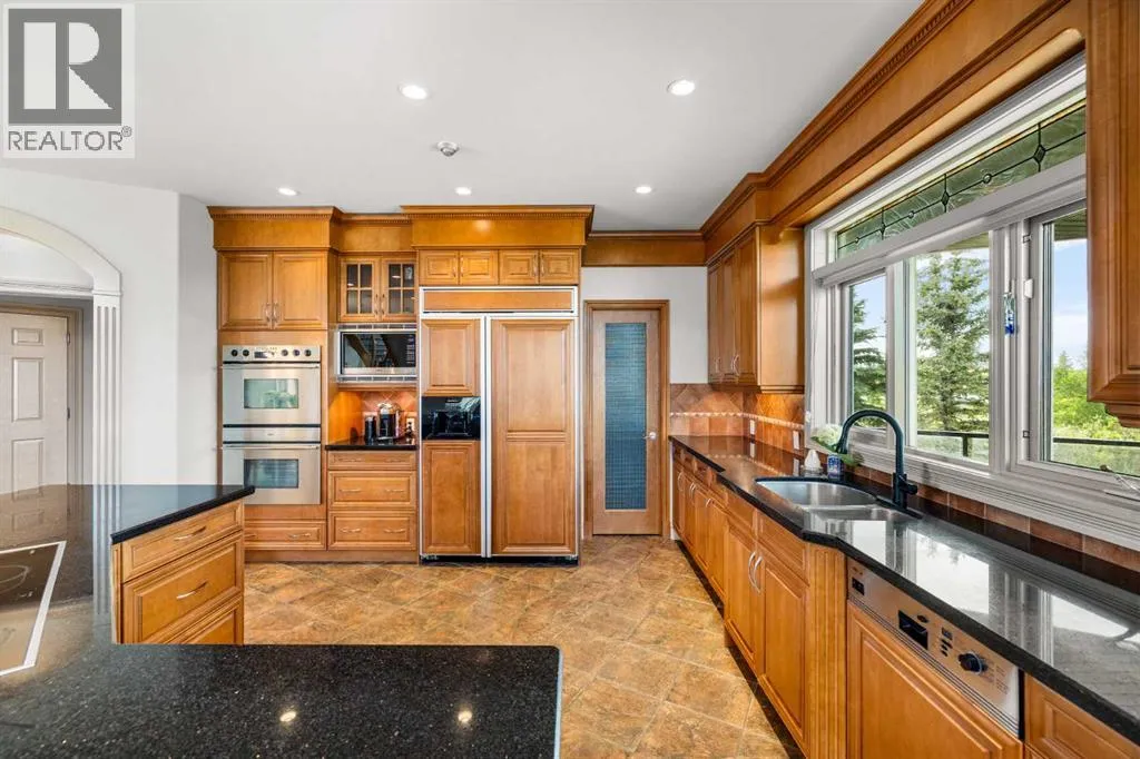 Welcome to this extraordinary 4 acre estate, where luxury, functionality, and breathtaking mountain views converge in perfect harmony! The garage is a standout feature of this abode, offering space for up to nine vehicles! With a fully epoxied finish and in-floor heating, ideal for the automotive enthusiast or easily transformed into a massive shop complete with its own bathroom. The home has been recently refreshed with brand new interior and exterior paint and complemented by a newly paved driveway, this meticulously designed home offers an unparalleled living experience. Stepping inside you are greeted with a spectacular double-sided, floor to ceiling stone fireplace with dual staircases emerging from its base leading to the upper level of the home. From here you are met with the kitchen, a chefâs dream, complete with a large granite island, ceiling-height cabinetry, stainless steel appliances, and a spacious walk-in pantry. It seamlessly flows into the eating nook and living room, creating a welcoming hub for daily life. The adjacent living room offers vaulted ceilings with expansive windows showcasing panoramic views of the mountains and rolling hills, with direct access to the spacious back deck. An exceptional theatre room with custom built-ins, two powder rooms and main floor laundry, with a brand new washer and dryer, complete this fantastic main floor. Upstairs you are met with a cozy window seat, a built-in reading nook and desk space, perfect for leisurely reading or a study area. The primary retreat is truly exceptional, featuring its own private deck to soak in the endless mountain vistas, a luxurious 5-piece ensuite with a jetted soaking tub beneath a skylight, dual vanities, a private steam shower, and a walk-in closet with custom built-ins. A private office or potential fitness area is also accessible from the primary bedroom. Completing this upper level are two additional bedrooms joined by a stylish Jack and Jill 5-piece bathroom. Descending to th e fully finished walkout basement, this space is designed for entertaining with a spacious family room showcasing a double-sided fireplace! The wet bar is complete with raised seating, a beverage fridge, full-sized fridge, and custom wine storage which is seamlessly connected to the custom billiards space with pool table included! Finishing off this level is an additional bedroom and full bathroom. The property is hardwired for a gate, features 400-amp service, complete with full irrigation, and a central vacuum system for ultimate convenience. Furthermore, in-floor heating continues throughout all three levels of the home, providing year-round comfort. This incredible property is set on a private lot with stunning panoramic mountain views, offering tranquility, privacy, and timeless elegance. Pride of ownership is seen throughout this meticulous masterpiece! (id:27476)