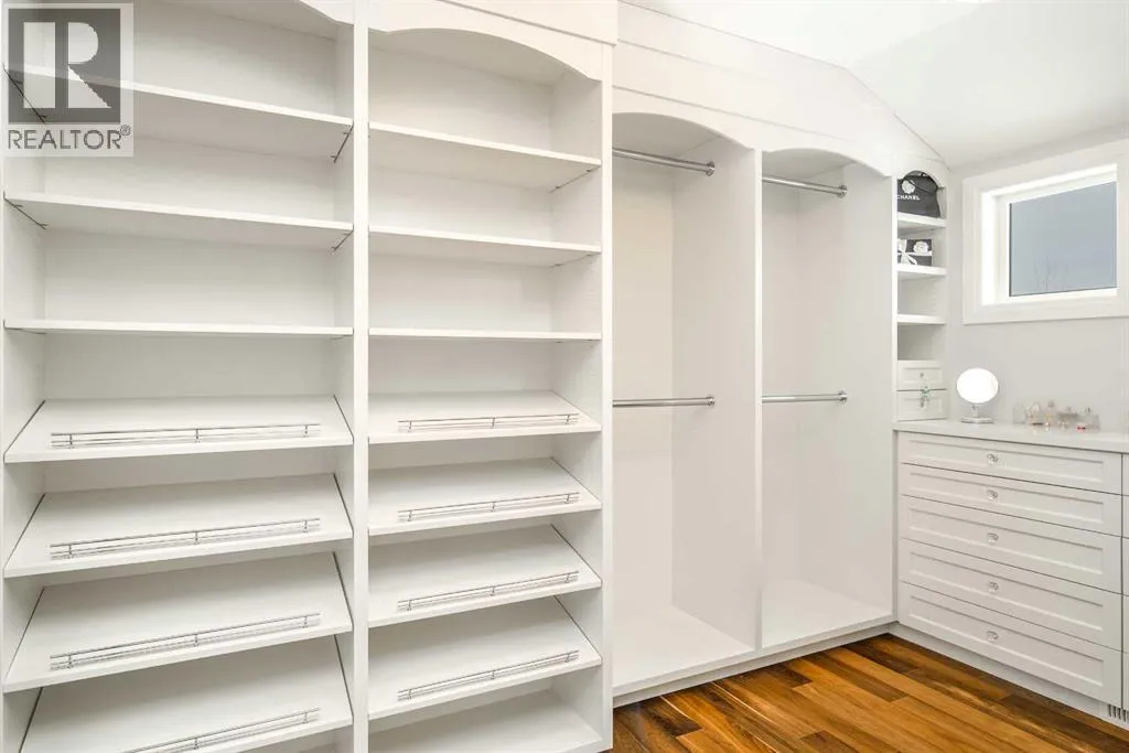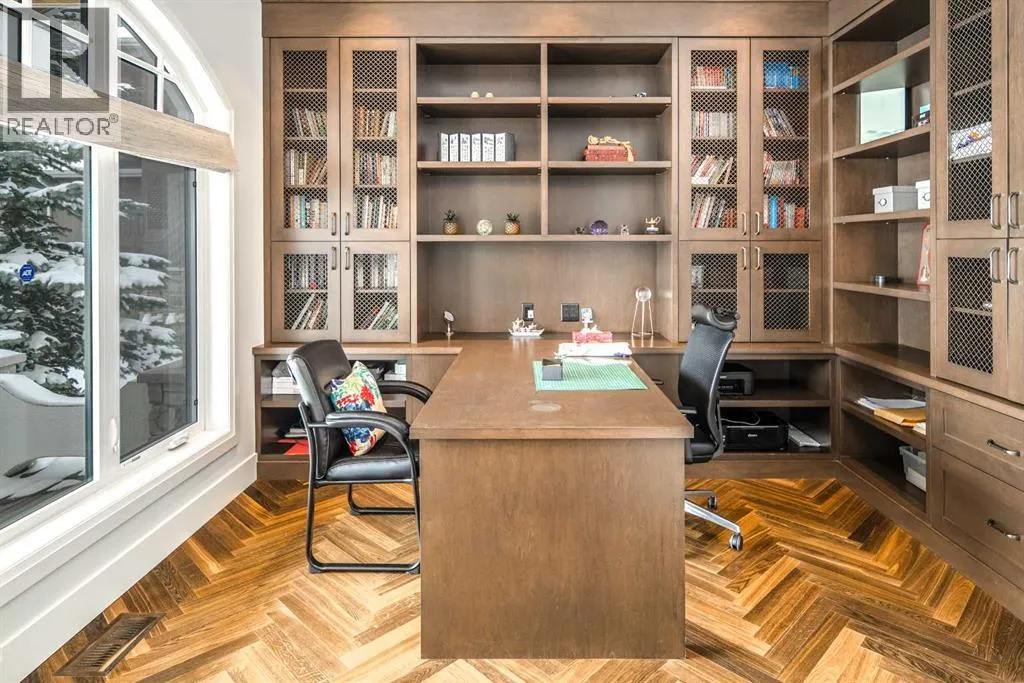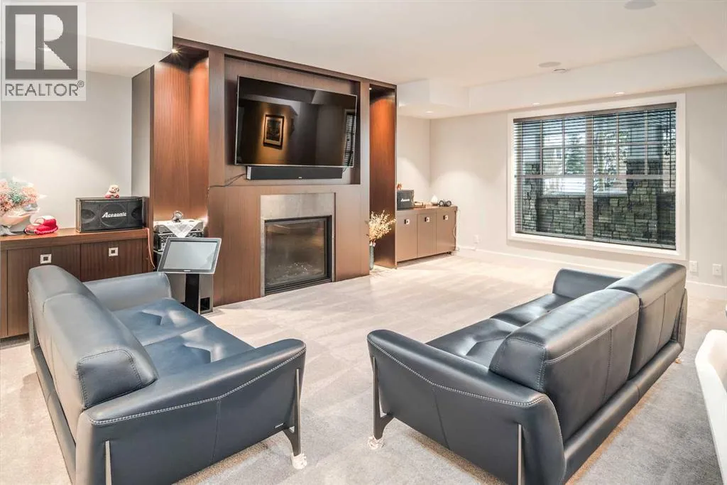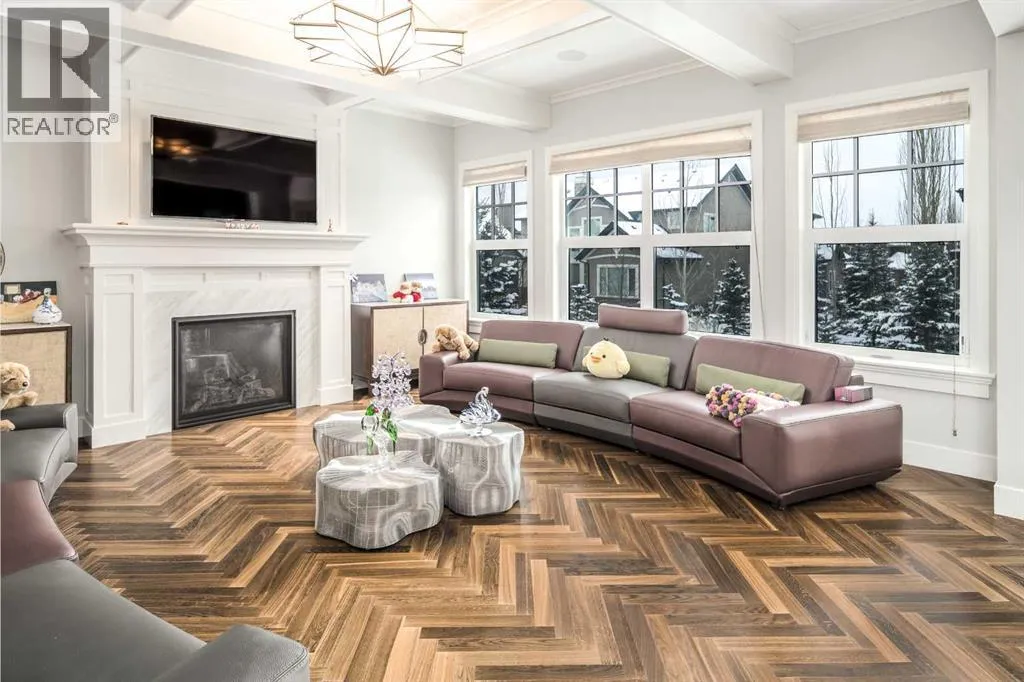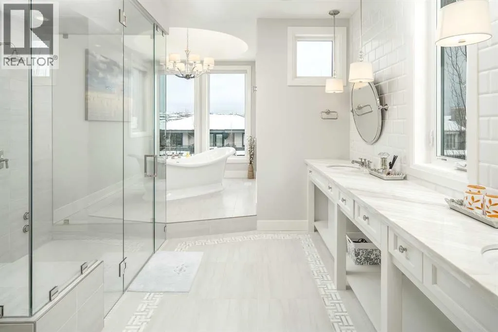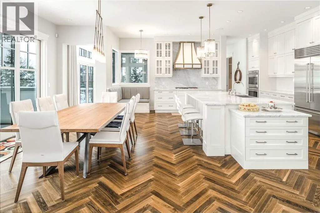 Welcome to this exquisite custom estate home by Wolf Custom Homes, nestled in the prestigious community of Watermark. Boasting over 5,400 sq. ft. of unparalleled craftsmanship and elegance, this former SHOWHOME offers tons of upgrades exemplifies luxury living. The house is in immaculate condition, having been used only occasionally by the owners. From the moment you step inside, you are welcomed by stunning luxury hardwood flooring that flows throughout the main level. The heart of the home is the gourmet chefâs kitchen, featuring beautifully crafted cabinetry, an oversized island with marble countertops, and top-of-the-line appliances, including a Sub-Zero fridge, Wolf gas stove and built-in oven, and an Asko dishwasher. Adjacent to the kitchen, the bright and inviting dining area and living room are adorned with expansive windows, allowing natural light to fill the space. A striking fireplace adds warmth and sophistication to this open-concept layout. For those who love to entertain, a formal dining room and a stunning 4-season sunroom extend onto an expansive, covered balconyâperfect for year-round enjoyment. A spacious main-floor office, complete with custom-built desk and shelving, offers the ideal work-from-home setup. A thoughtfully designed mudroom with a built-in bench and ample storage ensures effortless organization. Upstairs, retreat to the lavish primary suite, where a spectacular walk-in closet with custom spa-like 5-piece ensuite. Indulge in the free-standing soaker tub, oversized glass-enclosed shower, and dual vanities. Two additional generously sized bedrooms, each with its own walk-in closet and private 4-piece ensuite, provide ultimate comfort. A large bonus room and a convenient upper-floor laundry room complete this level. The fully developed walk-out basement, enhanced with in-floor heating, extends the homeâs luxurious appeal. It boasts a spacious entertainment area with a fully equipped wet bar, a modern fitness room, an additional bedroom, and a beautifully appointed four-piece bathroom. Step outside to your private backyard oasis, where breathtaking views, lush landscaping, and elegant decorative LED system (10K value) and garden lighting (6K) create the perfect setting for entertaining or quiet evenings under the stars. Located in the exclusive estate community of Watermark, this home provides the tranquility of country living with the convenience of city amenities just minutes away. Enjoy scenic pathways, parks, playgrounds, and the renowned Central Plaza with a pavilion, picnic areas, firepit, sports courts, and lush green spaces. Experience the pinnacle of luxuryâbook your private showing today! (id:27476)