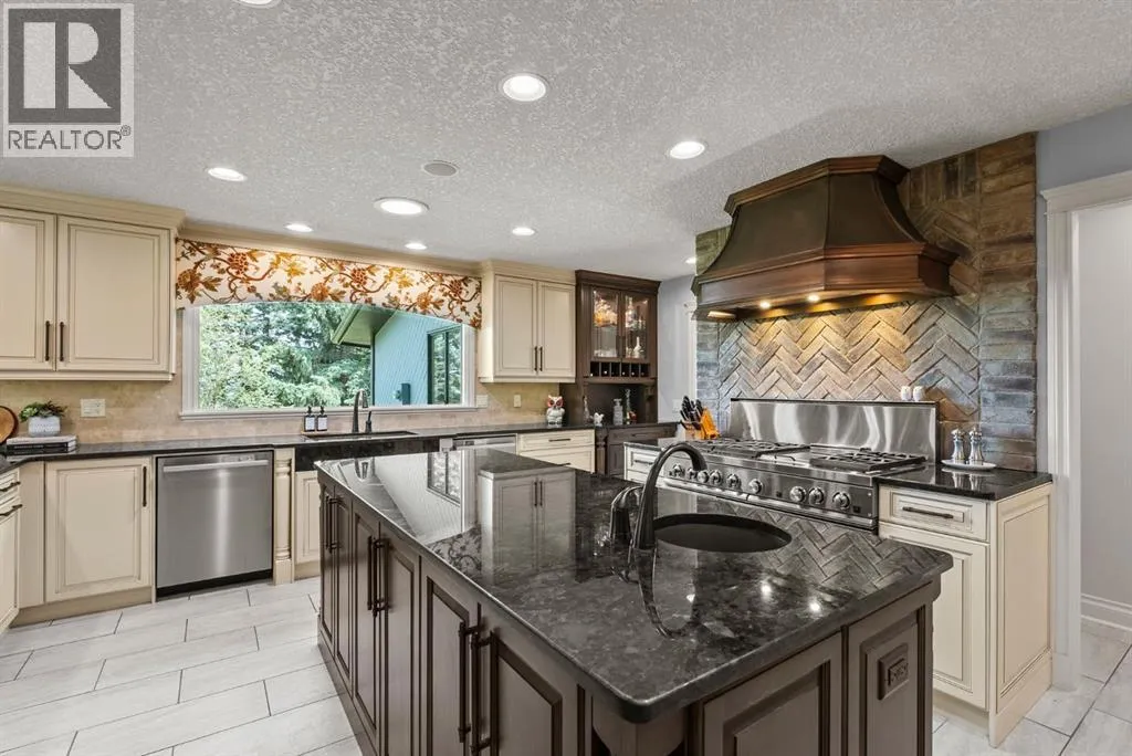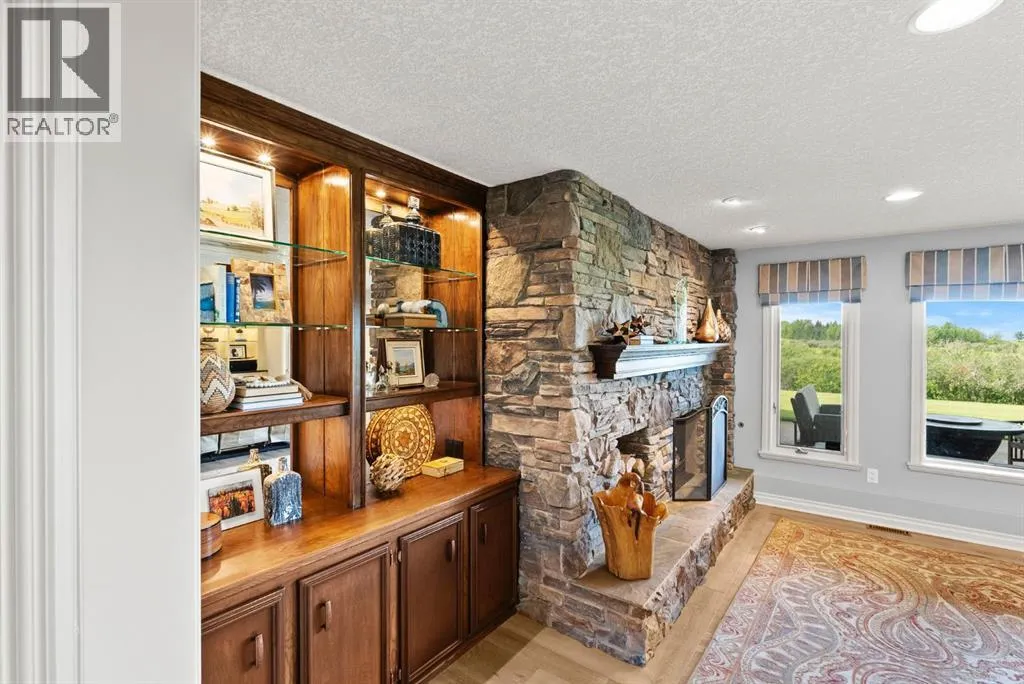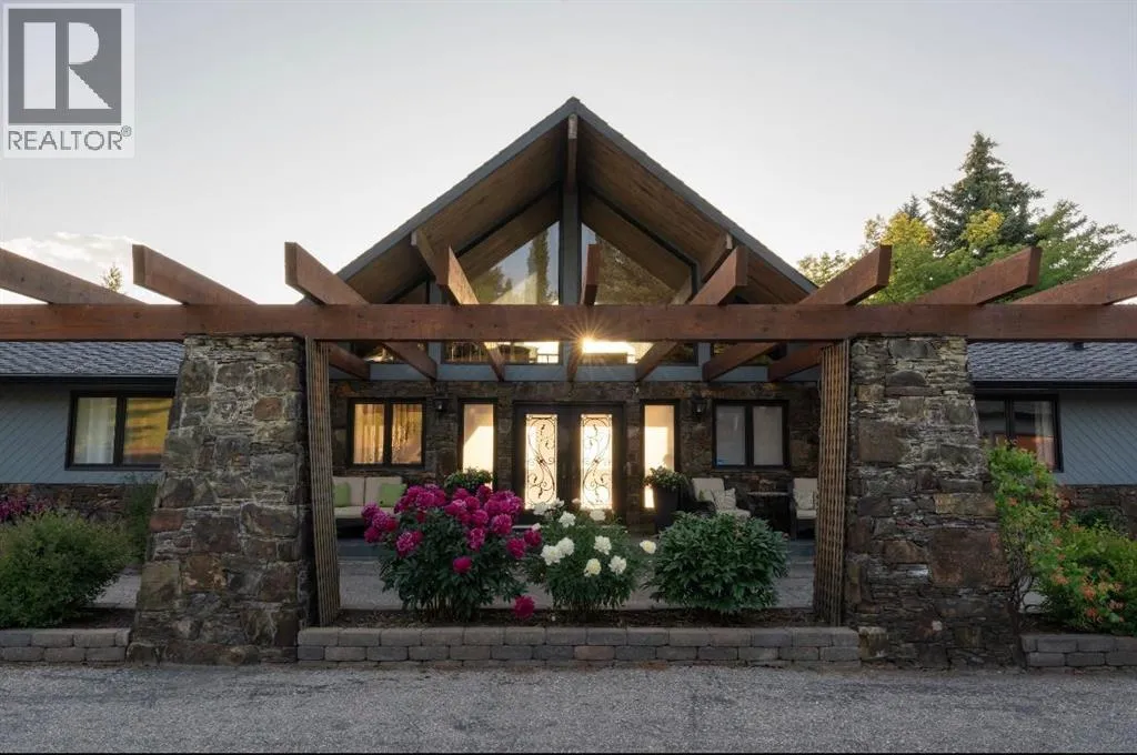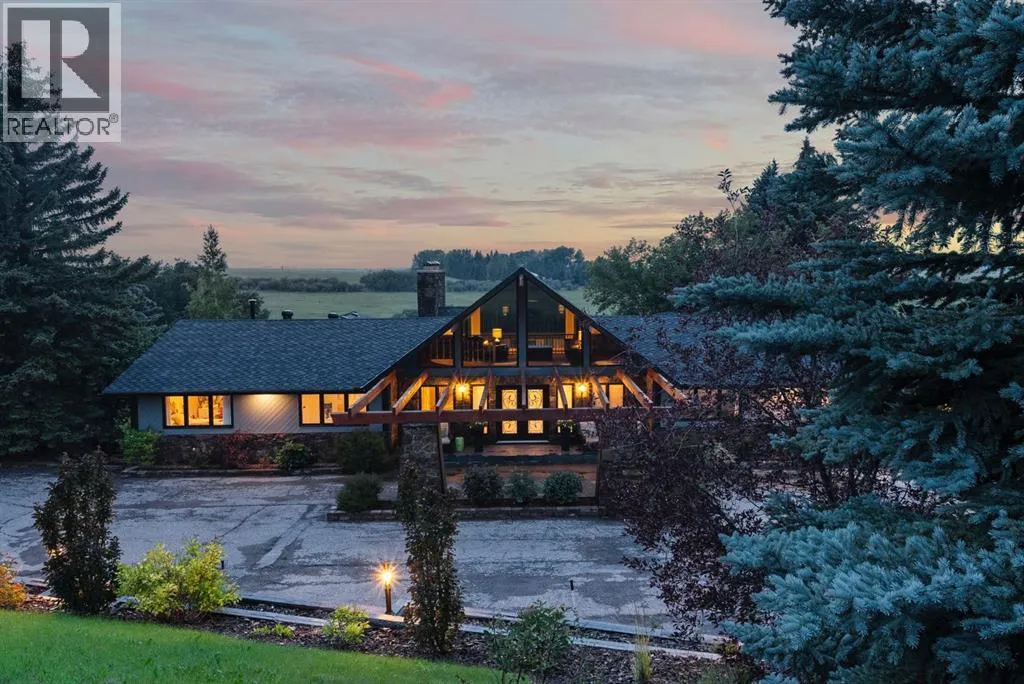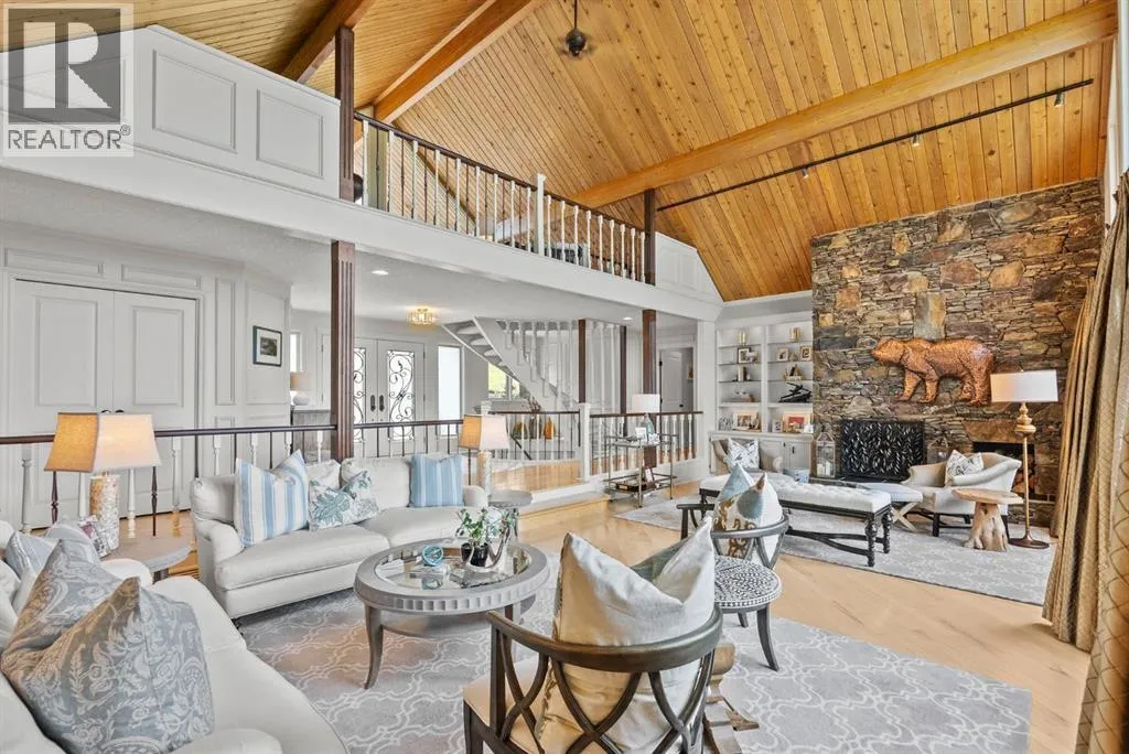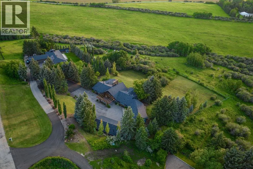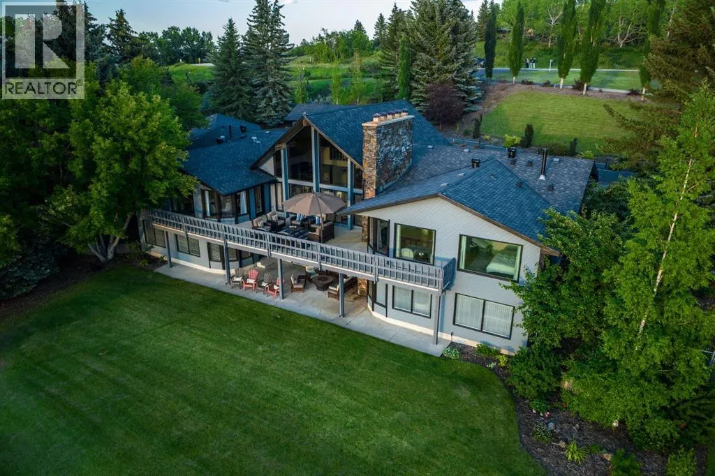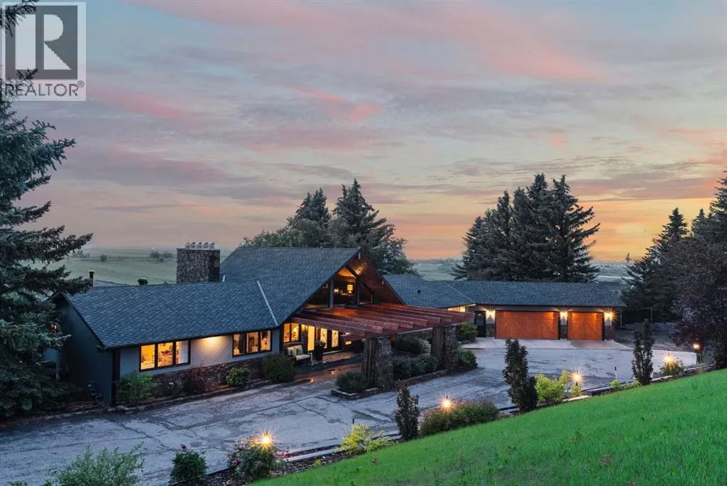 Truly a rare find, this spectacular hillside bungalow in the prestigious community of Artists View blends rustic character with modern luxury.  Homes in this community do not often come up for sale and this recently fully renovated bungalow features a walkout basement, panoramic mountain views, stunning sunsets, two 3-car garages and exceptional privacyâ¦.all while being 5 minutes from the western edge of the city. This established cul de sac is 5 minutes to Hwy 1 or Stoney Trail, 20 minutes to the University, Foothills Hospital, downtown, 45 minutes to Canmore and 1 hour to Banff. The main level offers soaring 22â cedar ceilings and picture windows that flood the space with natural light, a dramatic stone wood-burning fireplace, rich custom woodwork throughout and a bedroom wing with 3 large bedrooms. The chefâs kitchen is equipped with high-end appliances, a custom copper range hood, granite countertops, large island with seating, custom cabinetry, and a cozy breakfast nook with built-in bench and fireplace. Host with ease in the formal dining room, which opens directly to an outdoor patio dinning area overlooking your beautifully landscaped outdoor living space designed to capture the mountain vistas. The bright and spacious master suite features a fireplace, spa-inspired ensuite with in-floor heating, and a massive walk-in closet. Two additional large bedrooms, a sunlit upper loft, private home office with coffered ceilings, and a large laundry/mudroom with custom cabinetry complete the main floor. The fully finished walkout basement includes a Nanny/in-law suite that has the fourth bedroom with a private living area and ensuite.  A large rec/rumpus room, bar/kitchenette, two additional family rooms, another wood burning fireplace, steam shower, and extensive custom storage finishes off the walkout. Two dedicated mechanical rooms house 4 hot water heaters, 3 furnaces, 2 A/C units, and ample storage. Additional upgrades include sound-reducing insulation, Armour sh ake shingles, a paved driveway, fully fenced chain-link yard, mature landscaping, and multiple private outdoor retreats. Other highlights: over 7800+sq ft of finished living space, 4 fireplaces, hardwood and tile flooring throughout, integrated security system, and a beautifully landscaped yard with underground sprinkler/irrigation system. Enjoy peaceful country living with urban convenienceâjust minutes to city amenities, top public and private schools, horse boarding and the mountains.  A truly special propertyâunique in scale, design, and setting. (id:27476)