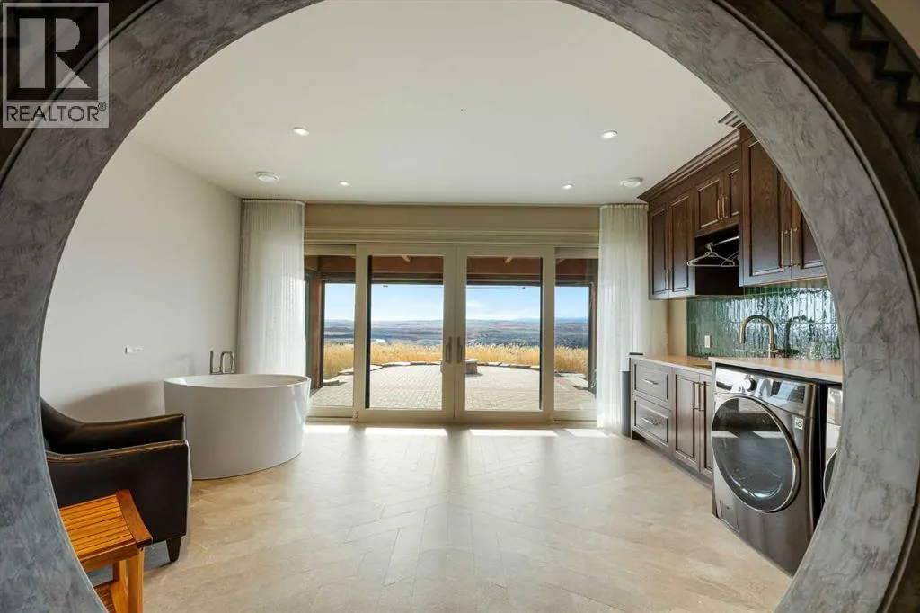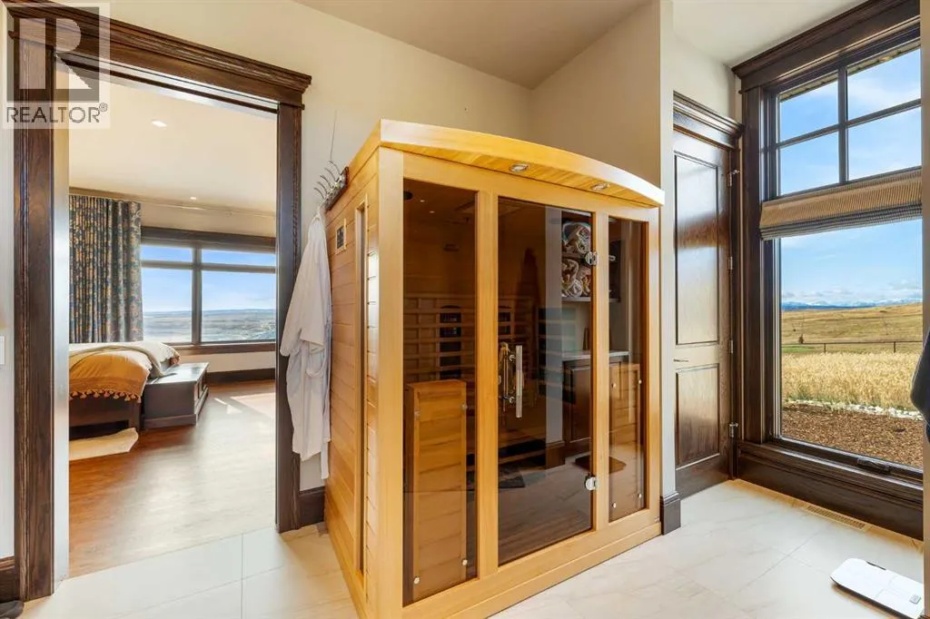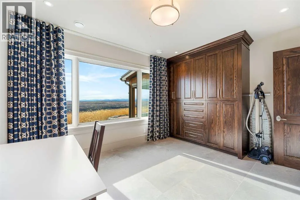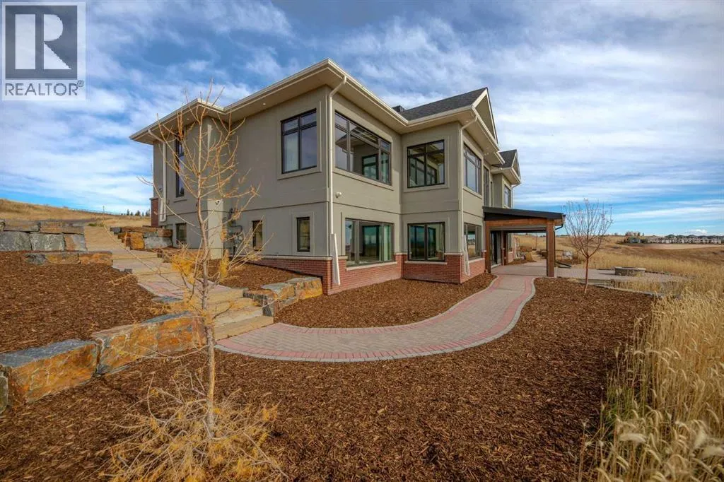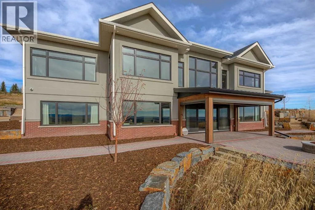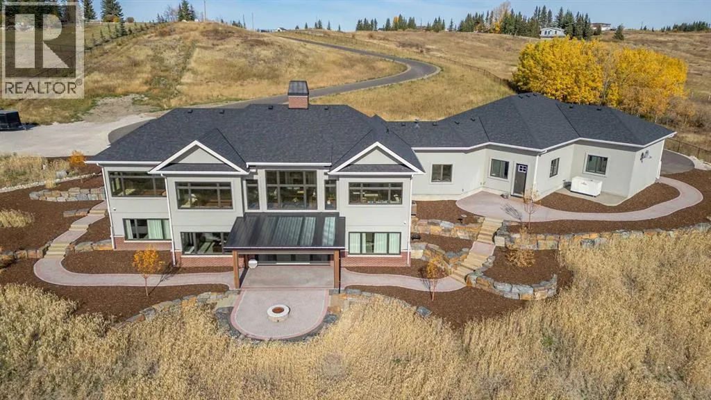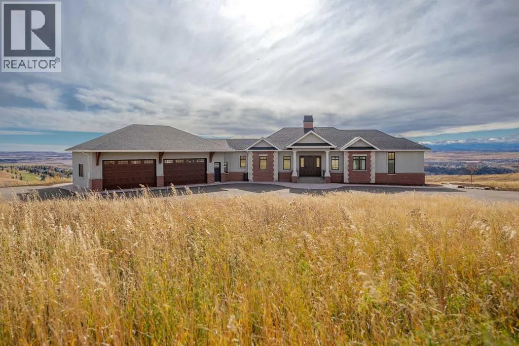Nestled on 11.76 acres of pristine land, this magnificent 4500 SF walk-out bungalow offers breathtaking panoramic views of the mountains, valley, and Town of Cochrane. Meticulously crafted by McKinley Masters, this home seamlessly blends luxury, comfort, and functionality. The entry features a water wall and expansive windows that highlight the stunning views. The open living area includes a sitting room, dining area, and a chef's kitchen with a timeless scullery and walk-in pantry. The primary bedroom offers spectacular views, a 4-piece ensuite with a dry sauna and laundry facilities, plus a large walk-in closet. The main level also includes a 2-piece bath, elevator, and large mudroom leading to a 4-car (66 x 30) garage with epoxy flooring, dog wash, side attached single garage and elevator access. The lower level has 2 bedrooms, a 4-piece bath, a 3-piece ensuite, a media room, a private office, and a studio opening onto a covered and screened patio with a fire pit. Outdoor features include a front gate with a paved drive, fully fenced property, and stunning landscaping. Additional amenities are a powered C-Can for extra storage, and utilities serviced to the west side of the home. Call today to view. (id:27476)