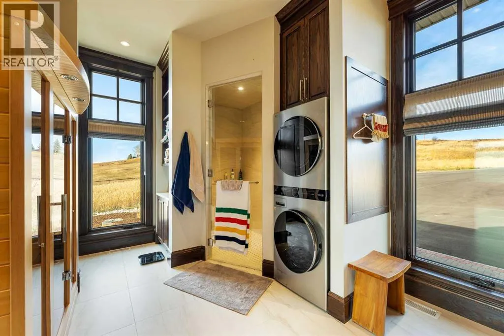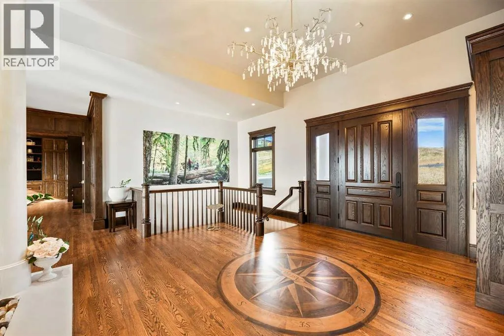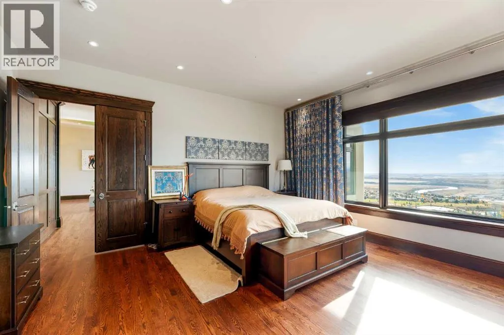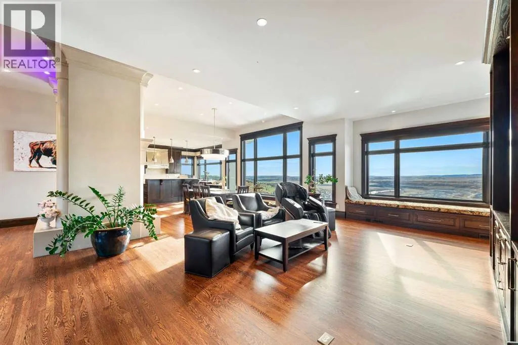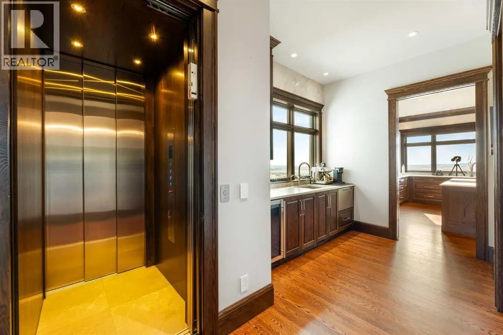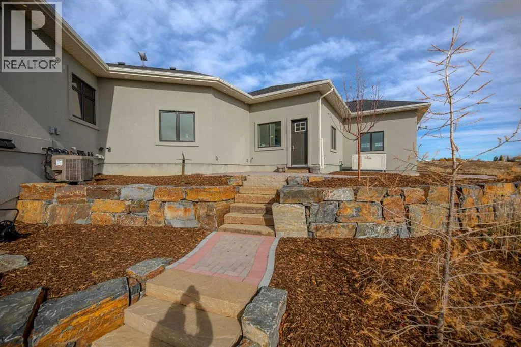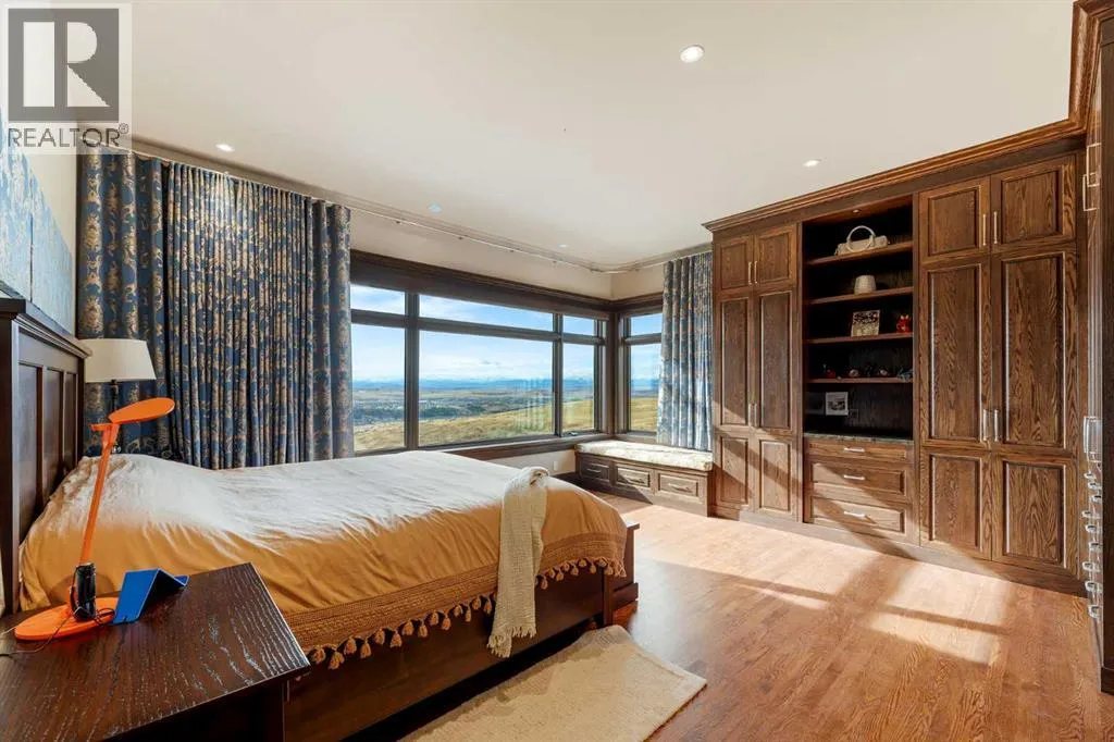 Nestled on 11.76 acres of pristine land, this magnificent 4500 SF walk-out bungalow offers breathtaking panoramic views of the mountains, valley, and Town of Cochrane. Meticulously crafted by McKinley Masters, this home seamlessly blends luxury, comfort, and functionality. The entry features a water wall and expansive windows that highlight the stunning views. The open living area includes a sitting room, dining area, and a chef's kitchen with a timeless scullery and walk-in pantry. The primary bedroom offers spectacular views, a 4-piece ensuite with a dry sauna and laundry facilities, plus a large walk-in closet. The main level also includes a 2-piece bath, elevator, and large mudroom leading to a 4-car (66 x 30) garage with epoxy flooring, dog wash, side attached single garage and elevator access. The lower level has 2 bedrooms, a 4-piece bath, a 3-piece ensuite, a media room, a private office, and a studio opening onto a covered and screened patio with a fire pit. Outdoor features include a front gate with a paved drive, fully fenced property, and stunning landscaping. Additional amenities are a powered C-Can for extra storage, and utilities serviced to the west side of the home. Call today to view. (id:27476)