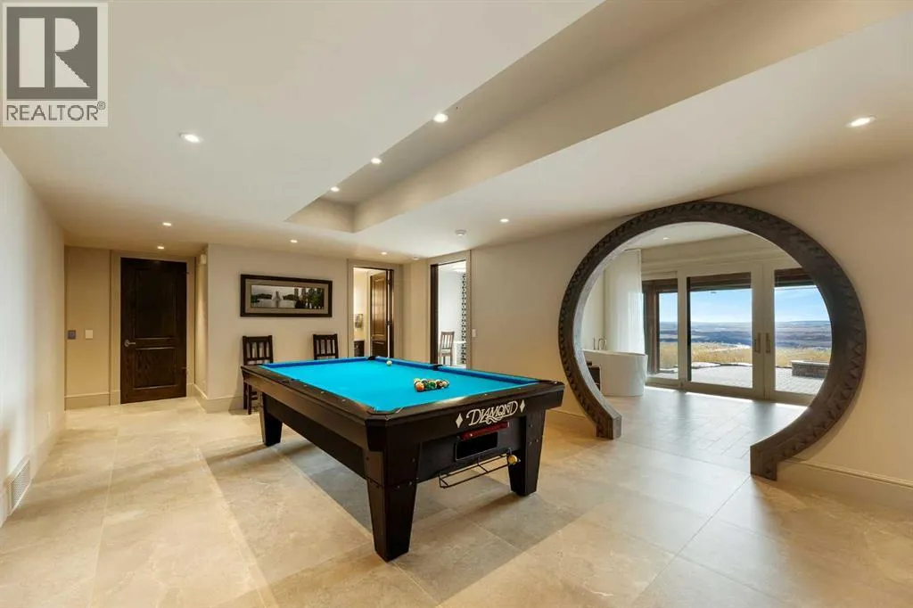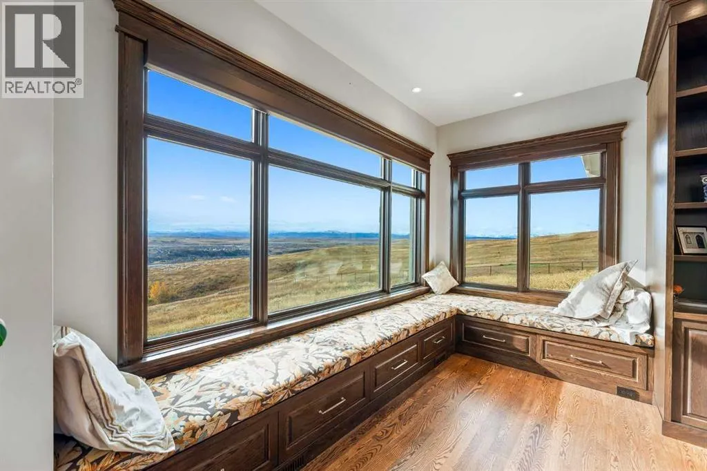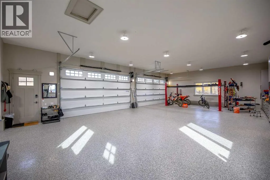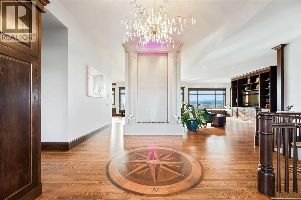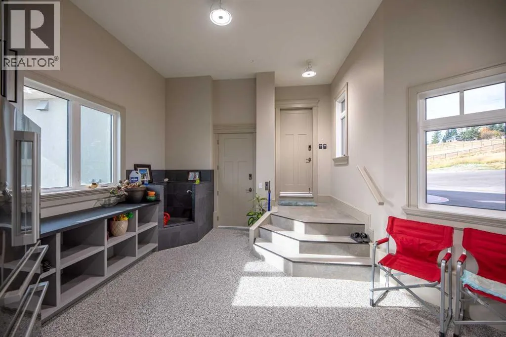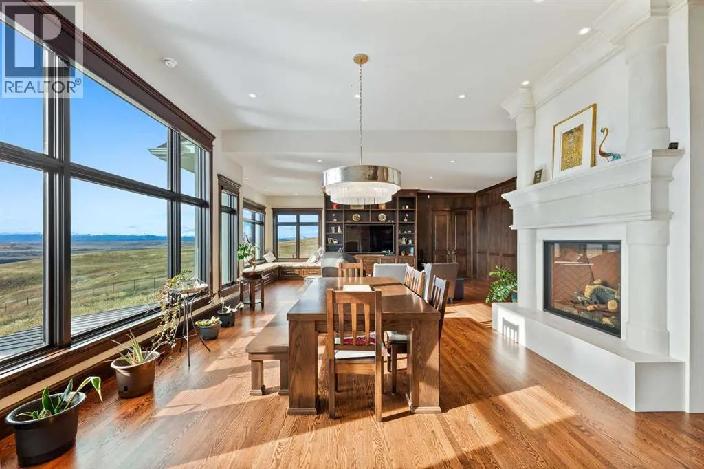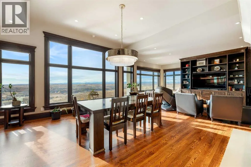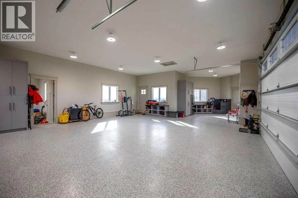 Nestled on 11.76 acres of pristine land, this magnificent 4500 SF walk-out bungalow offers breathtaking panoramic views of the mountains, valley, and Town of Cochrane. Meticulously crafted by McKinley Masters, this home seamlessly blends luxury, comfort, and functionality. The entry features a water wall and expansive windows that highlight the stunning views. The open living area includes a sitting room, dining area, and a chef's kitchen with a timeless scullery and walk-in pantry. The primary bedroom offers spectacular views, a 4-piece ensuite with a dry sauna and laundry facilities, plus a large walk-in closet. The main level also includes a 2-piece bath, elevator, and large mudroom leading to a 4-car (66 x 30) garage with epoxy flooring, dog wash, side attached single garage and elevator access. The lower level has 2 bedrooms, a 4-piece bath, a 3-piece ensuite, a media room, a private office, and a studio opening onto a covered and screened patio with a fire pit. Outdoor features include a front gate with a paved drive, fully fenced property, and stunning landscaping. Additional amenities are a powered C-Can for extra storage, and utilities serviced to the west side of the home. Call today to view. (id:27476)