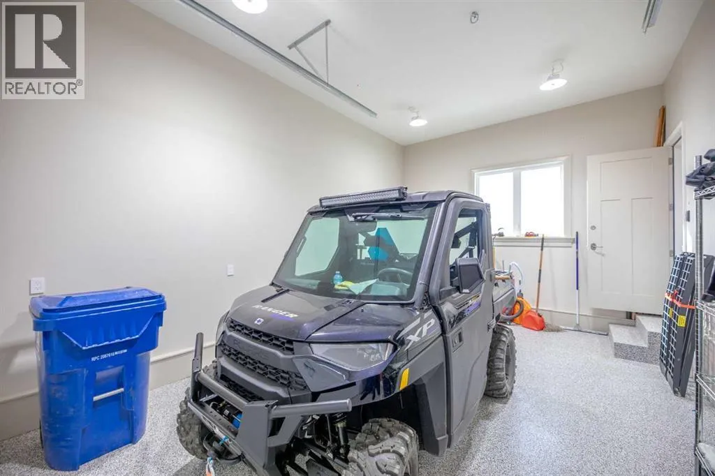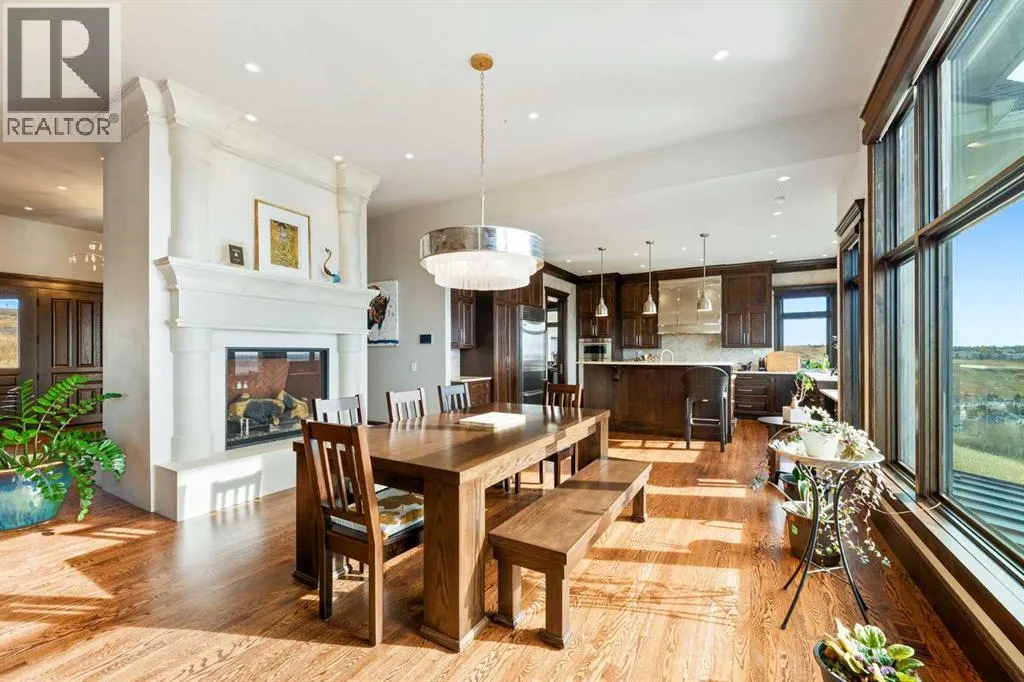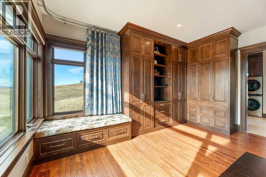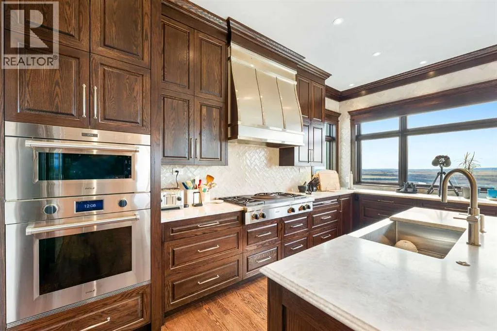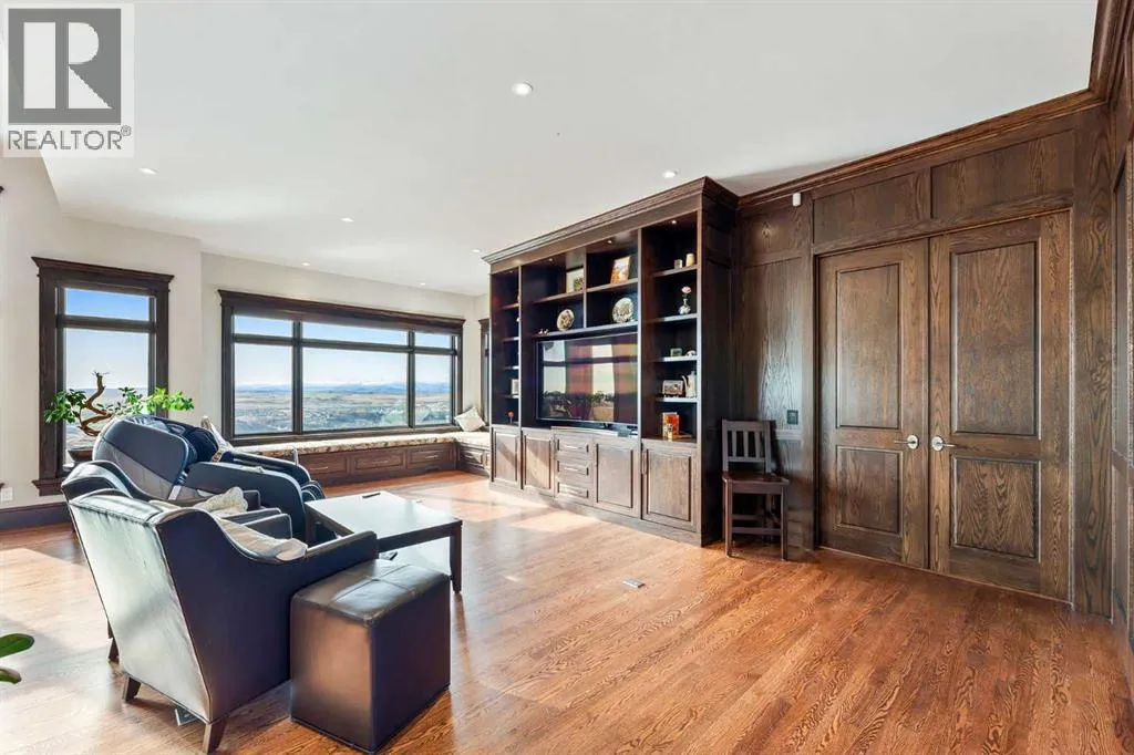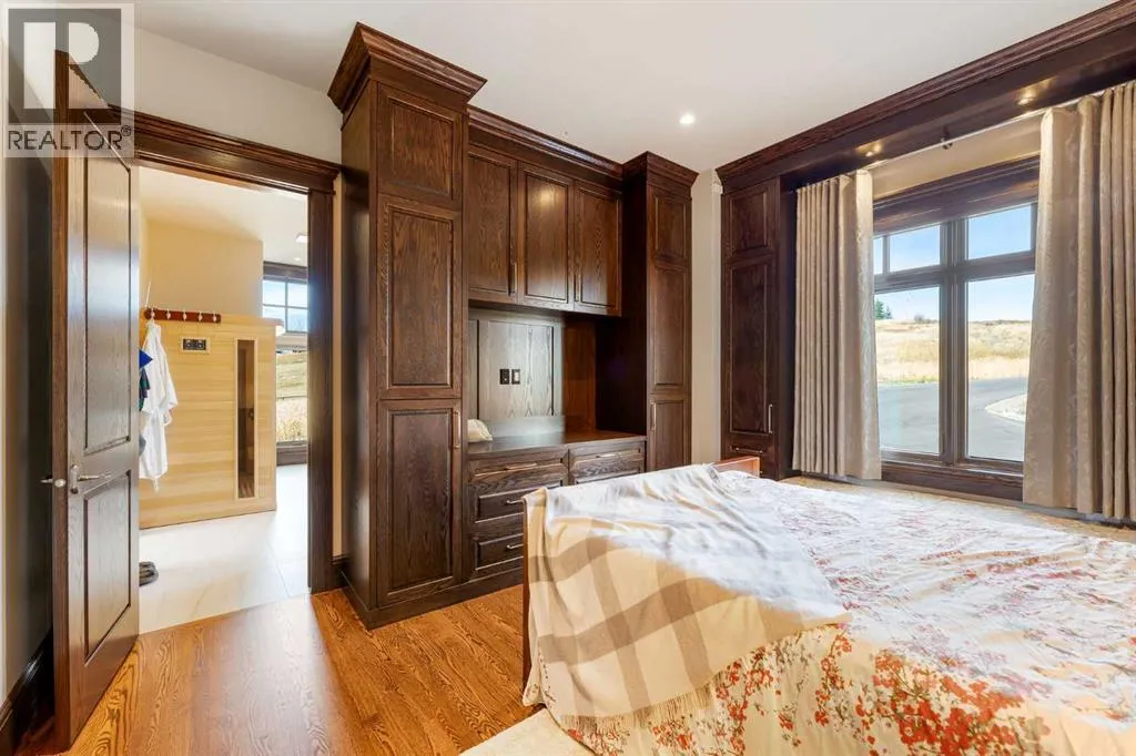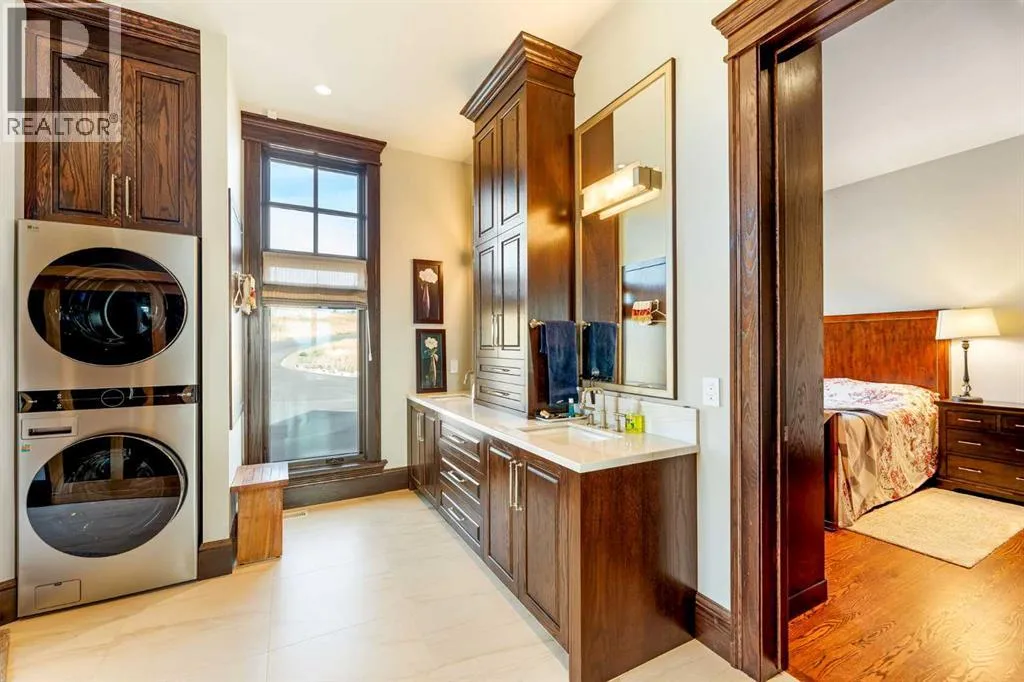 Nestled on 11.76 acres of pristine land, this magnificent 4500 SF walk-out bungalow offers breathtaking panoramic views of the mountains, valley, and Town of Cochrane. Meticulously crafted by McKinley Masters, this home seamlessly blends luxury, comfort, and functionality. The entry features a water wall and expansive windows that highlight the stunning views. The open living area includes a sitting room, dining area, and a chef's kitchen with a timeless scullery and walk-in pantry. The primary bedroom offers spectacular views, a 4-piece ensuite with a dry sauna and laundry facilities, plus a large walk-in closet. The main level also includes a 2-piece bath, elevator, and large mudroom leading to a 4-car (66 x 30) garage with epoxy flooring, dog wash, side attached single garage and elevator access. The lower level has 2 bedrooms, a 4-piece bath, a 3-piece ensuite, a media room, a private office, and a studio opening onto a covered and screened patio with a fire pit. Outdoor features include a front gate with a paved drive, fully fenced property, and stunning landscaping. Additional amenities are a powered C-Can for extra storage, and utilities serviced to the west side of the home. Call today to view. (id:27476)