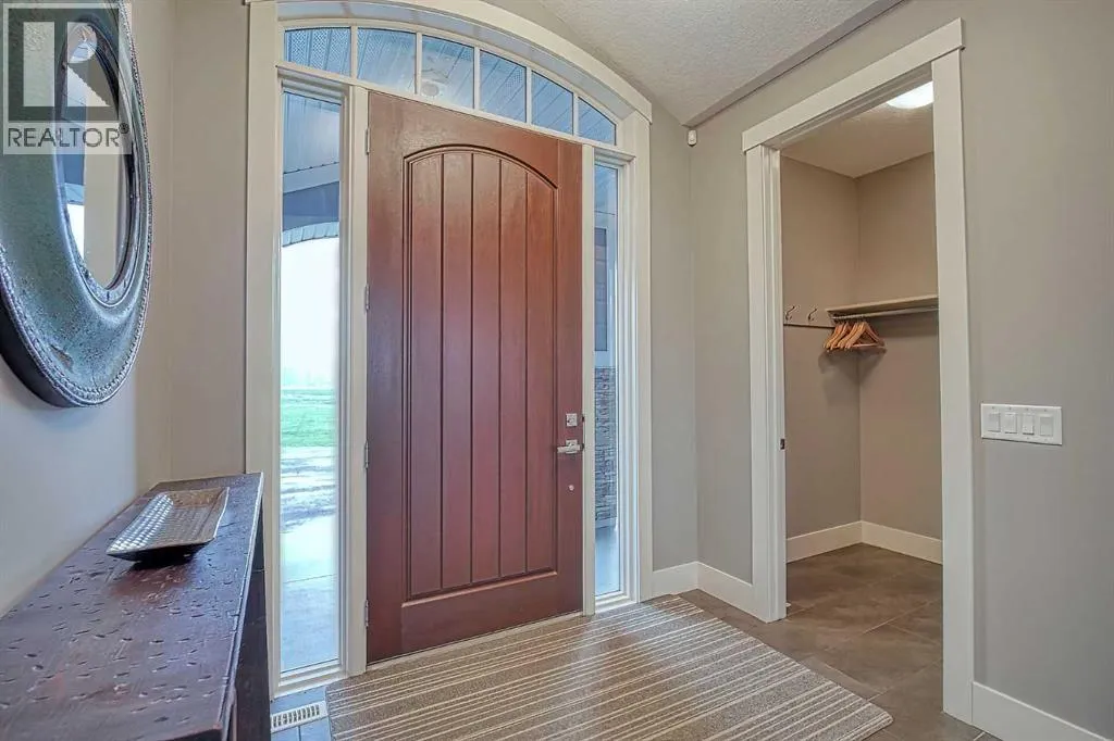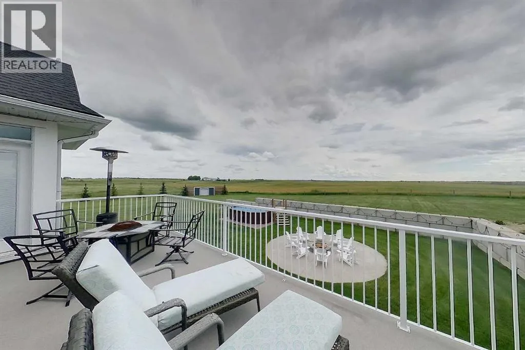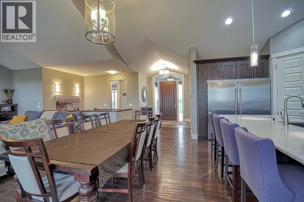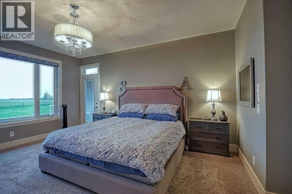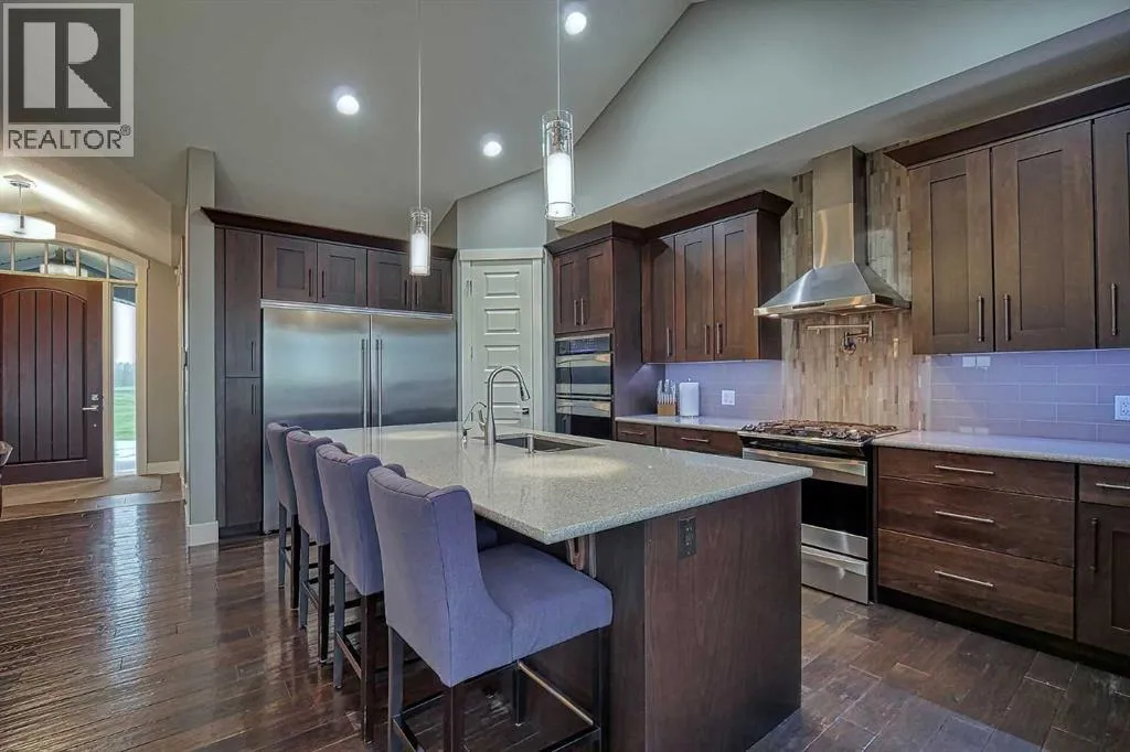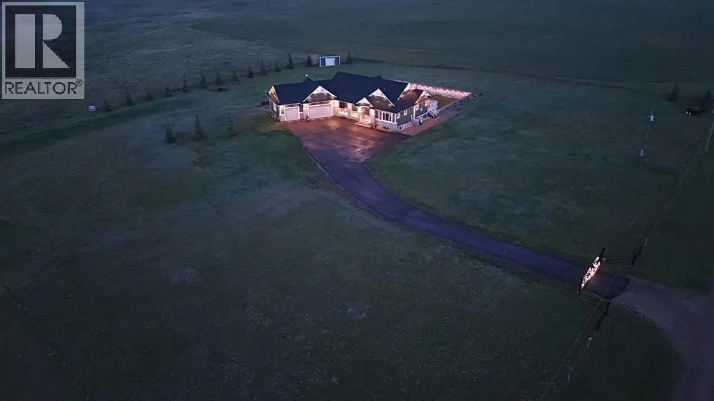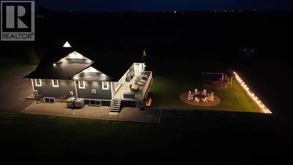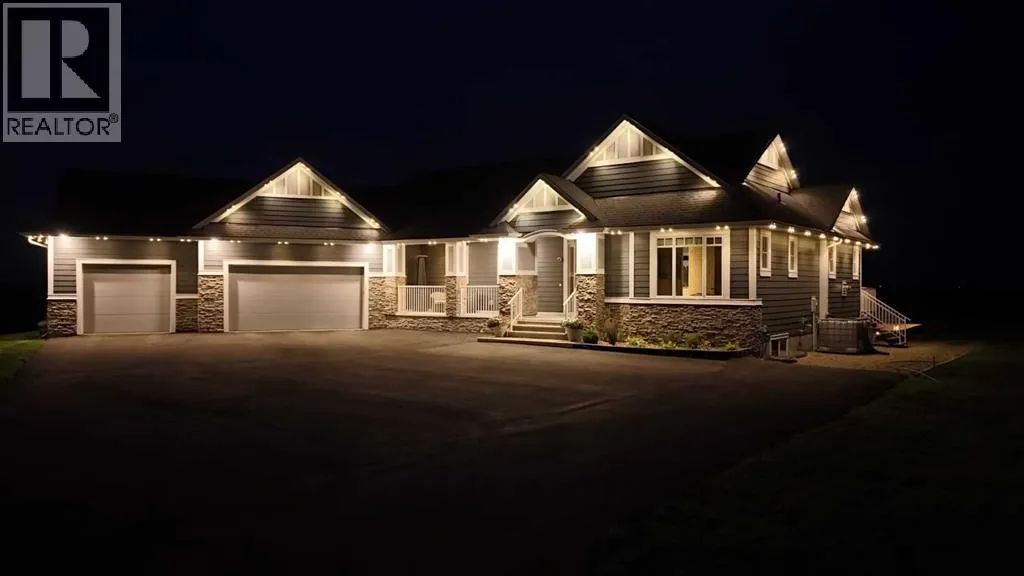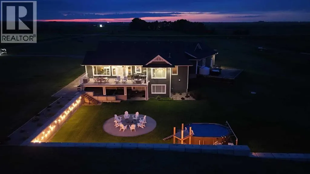 This stunning CUSTOM home was designed with no expense spared. From the moment you enter through the automated gates and follow the paved driveway, the quality is undeniable. Hardy Board siding, a triple garage, Gemstone lighting, and a warm, inviting front porch set the tone. Step into the spacious foyer, complete with its own walk-in closet, and prepare for a WOW moment as the home opens up with light, expansive windows, and breathtaking views. The kitchen, breakfast bar, dining area, and living room share an open-concept design, so no matter where you are, youâre part of the conversation. A floor-to-ceiling brick fireplace with built-ins on both sides anchors the living room beneath soaring 10â ceilings. The dining area easily accommodates a large table, while the breakfast bar and all countertops gleam with high-quality quartz. The built-in fridge and freezer combo is a generous in size, complemented by two ovens including a built-in microwave, a gourmet gas range with another oven, and a convenient pasta faucet. Hand-scraped hardwood floors add sophistication while maintaining a cozy, farm-inspired feel.This thoughtfully designed kitchen offers expansive quartz counters, abundant cabinetry, and a hidden gem â a walk-through butlerâs pantry, providing even more space for your culinary essentials. Double doors open to a spacious deck, perfect for lively gatherings or quiet evenings soaking in the peaceful farm views. In the primary suite, expansive windows frame the rolling landscape, making the view a part of the room itself. A gas fireplace flickers warmly on cooler nights, while a French door leads you directly to the patio for a breath of fresh country air. The luxurious 5-piece ensuite offers a spa-like retreat â a deep soaker tub set beside the fireplace invites indulgent baths, while double sinks, a generous walk-in shower with built-in seating, and a private water closet provide both comfort and function. The grand walk-in closet offers ample space to kee p everything perfectly organized. The Main floor features a second bedroom that provides guests or family with their own retreat, complete with a walk-in closet and an elegant 4-piece ensuite. The hall area includes a 2-piece bath, organized laundry room, and mudroom. Downstairs, a media room with a 135â screen and 4K projector is perfect for movie nights. Thereâs also space for a pool table (negotiable), poker table area and a full wet bar with quartz counters, sink, dishwasher, beer keg with tap, wine storage, and a commercial beverage fridge. This level has two bedrooms with walk-in closets, a 4-piece bath, and a walkout to a covered patio with hot tub, heated above-ground pool, and fire pit. A massive retaining wall ensures privacy, and a shed provides garden storage. There are underground sprinklers. Included are 22 built-in speakers with Control 4 automation, five TVs with mounts, projector and screen & cameras. Come experience Executive Country Living. (id:27476)