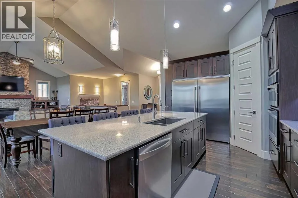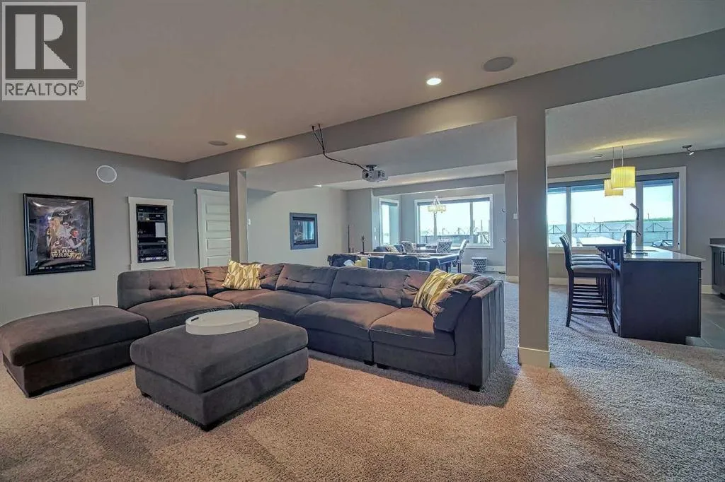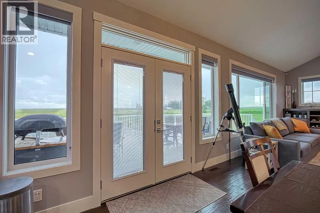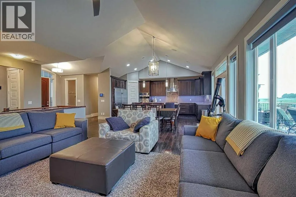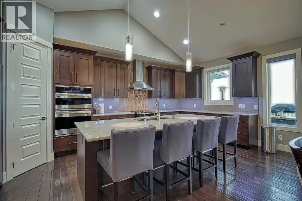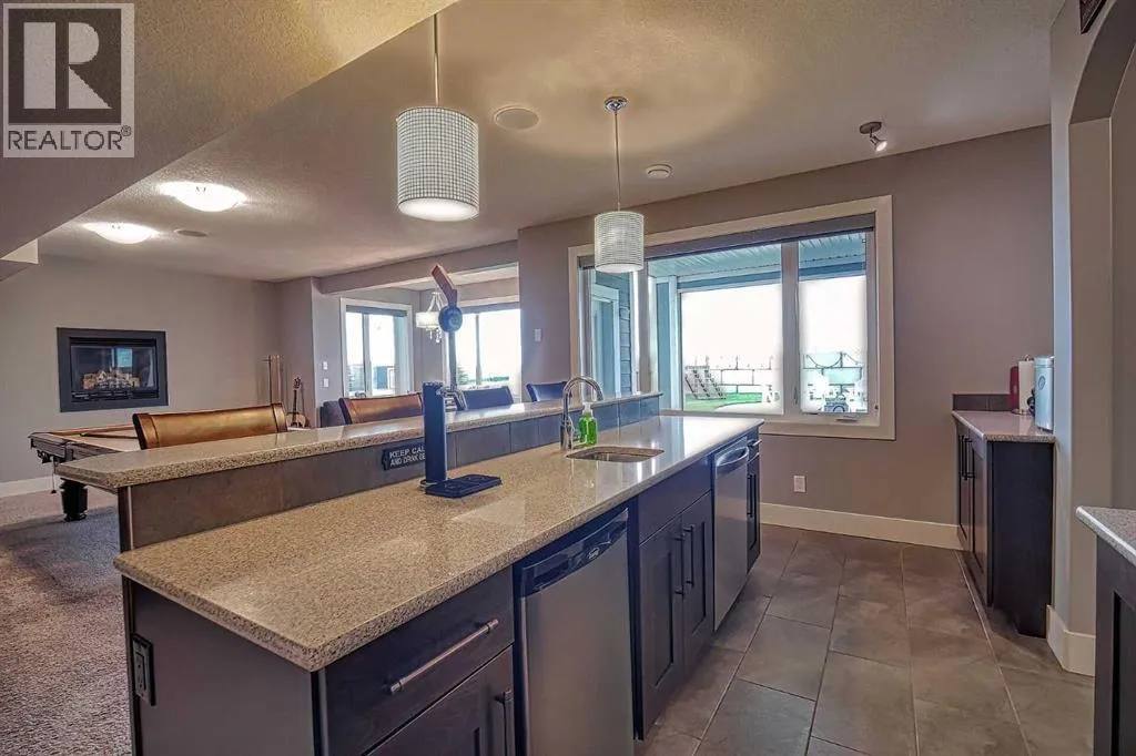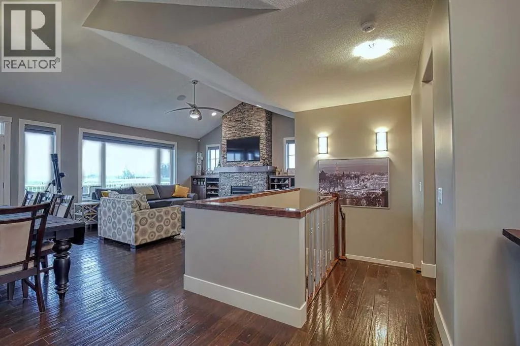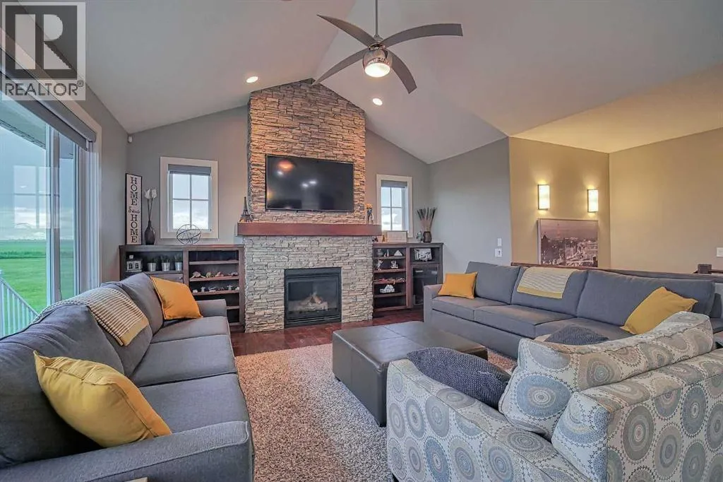 This stunning CUSTOM home was designed with no expense spared. From the moment you enter through the automated gates and follow the paved driveway, the quality is undeniable. Hardy Board siding, a triple garage, Gemstone lighting, and a warm, inviting front porch set the tone. Step into the spacious foyer, complete with its own walk-in closet, and prepare for a WOW moment as the home opens up with light, expansive windows, and breathtaking views. The kitchen, breakfast bar, dining area, and living room share an open-concept design, so no matter where you are, youâre part of the conversation. A floor-to-ceiling brick fireplace with built-ins on both sides anchors the living room beneath soaring 10â ceilings. The dining area easily accommodates a large table, while the breakfast bar and all countertops gleam with high-quality quartz. The built-in fridge and freezer combo is a generous in size, complemented by two ovens including a built-in microwave, a gourmet gas range with another oven, and a convenient pasta faucet. Hand-scraped hardwood floors add sophistication while maintaining a cozy, farm-inspired feel.This thoughtfully designed kitchen offers expansive quartz counters, abundant cabinetry, and a hidden gem â a walk-through butlerâs pantry, providing even more space for your culinary essentials. Double doors open to a spacious deck, perfect for lively gatherings or quiet evenings soaking in the peaceful farm views. In the primary suite, expansive windows frame the rolling landscape, making the view a part of the room itself. A gas fireplace flickers warmly on cooler nights, while a French door leads you directly to the patio for a breath of fresh country air. The luxurious 5-piece ensuite offers a spa-like retreat â a deep soaker tub set beside the fireplace invites indulgent baths, while double sinks, a generous walk-in shower with built-in seating, and a private water closet provide both comfort and function. The grand walk-in closet offers ample space to kee p everything perfectly organized. The Main floor features a second bedroom that provides guests or family with their own retreat, complete with a walk-in closet and an elegant 4-piece ensuite. The hall area includes a 2-piece bath, organized laundry room, and mudroom. Downstairs, a media room with a 135â screen and 4K projector is perfect for movie nights. Thereâs also space for a pool table (negotiable), poker table area and a full wet bar with quartz counters, sink, dishwasher, beer keg with tap, wine storage, and a commercial beverage fridge. This level has two bedrooms with walk-in closets, a 4-piece bath, and a walkout to a covered patio with hot tub, heated above-ground pool, and fire pit. A massive retaining wall ensures privacy, and a shed provides garden storage. There are underground sprinklers. Included are 22 built-in speakers with Control 4 automation, five TVs with mounts, projector and screen & cameras. Come experience Executive Country Living. (id:27476)