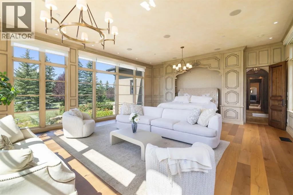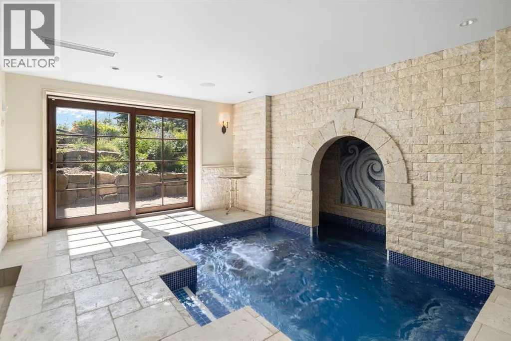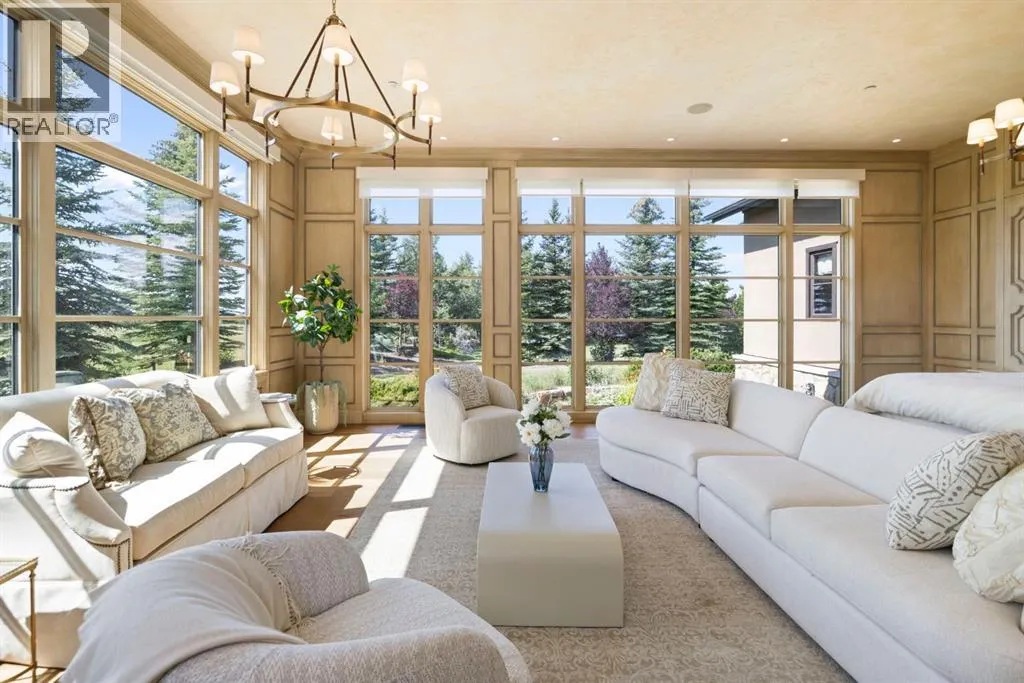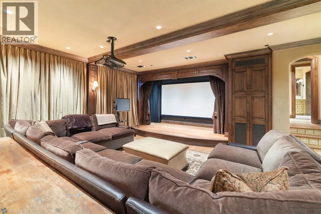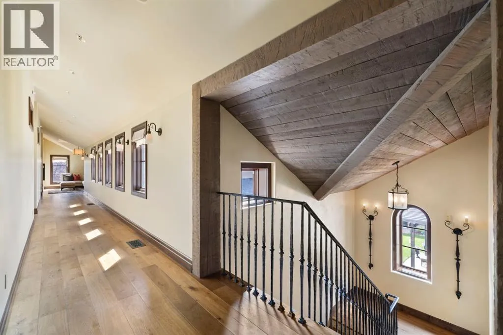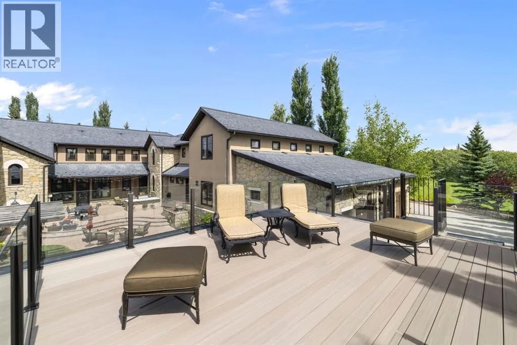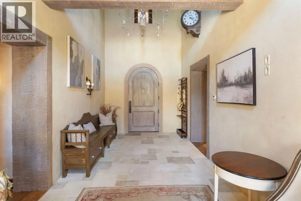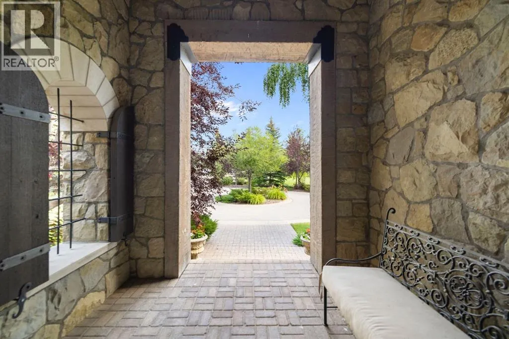 Welcome to 209 Pinnacle Ridge, an exceptional Tuscan inspired estate set on two acres in the foothills with sweeping views of the Rocky Mountains and just minutes from Calgaryâs finest amenities. With more than 16,000 square feet of living space, this villa combines timeless European charm with modern luxury in every detail.The exterior showcases stonework, hand sawn timber beams, industrial steel brackets, and an oversized custom entry door. Inside, arched doorways, barrel vaulted ceilings, and perfectly aligned sightlines frame picturesque views throughout.The grand foyer with its soaring ceiling and bridge walkway leads to a formal lounge with paneled walls, coffered ceilings, and a wood burning fireplace. At the heart of the home, a gourmet kitchen with slab marble islands and a full suite of commercial grade appliances opens to the central courtyard, a private gathering space with built in BBQ, wall fountain, and pergola topped brick patio. Just beyond, the family room features a travertine mantled fireplace and French doors to the west lawn.The lower level is designed for both leisure and entertainment, offering a 25-meter lap pool, spa inspired hot tub alcove, walkout patio framed by sandstone boulders, a private theatre with professional grade audio visual, a games room with fabric lined walls, and a brick barrel vaulted wine cellar.The private primary wing showcases sweeping 180 degree mountain views and a luxurious ensuite. The upper level, accessed by dual staircases or elevator, offers five childrenâs bedrooms, a gym, and recreation spaces. Completing the home is a six car garage, extensive storage, a sport court, and professionally landscaped grounds.This estate has been featured in the National Post and Best Home Alberta, showcased in the award-winning series Fargo, and even served as Leonardo DiCaprioâs residence during the filming of The Revenant. It is a rare combination of artisanal craftsmanship, imported and local materials, and timeless arc hitectural design. All within 10 minutes of Springbank Airport, 15 minutes of downtown Calgary, 40 minutes to Banff, and close to Calgaryâs top private schools. (id:27476)