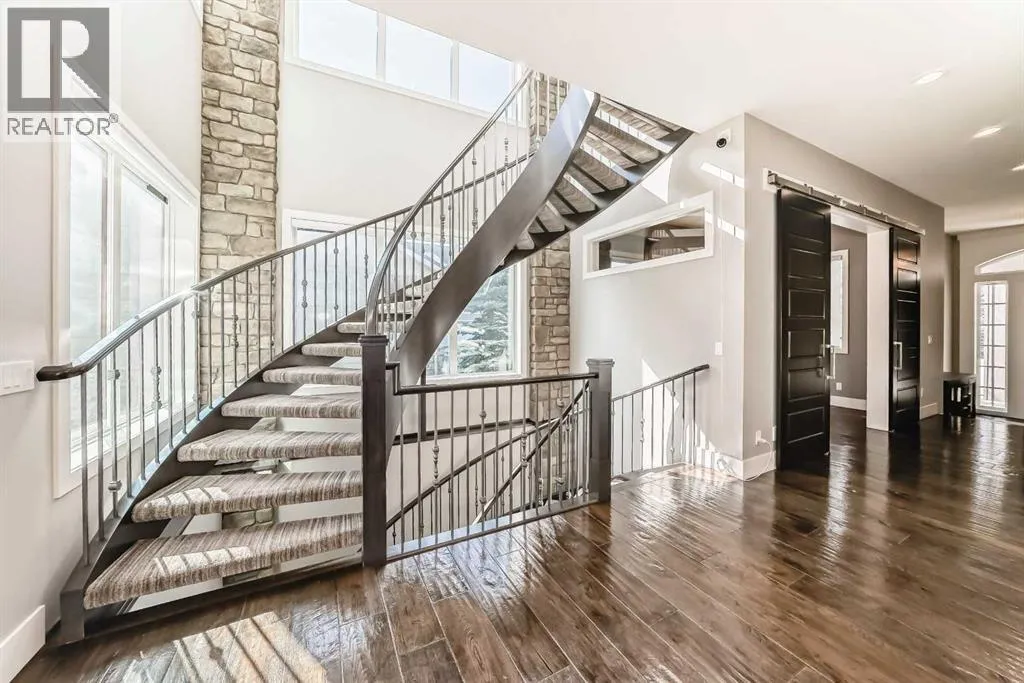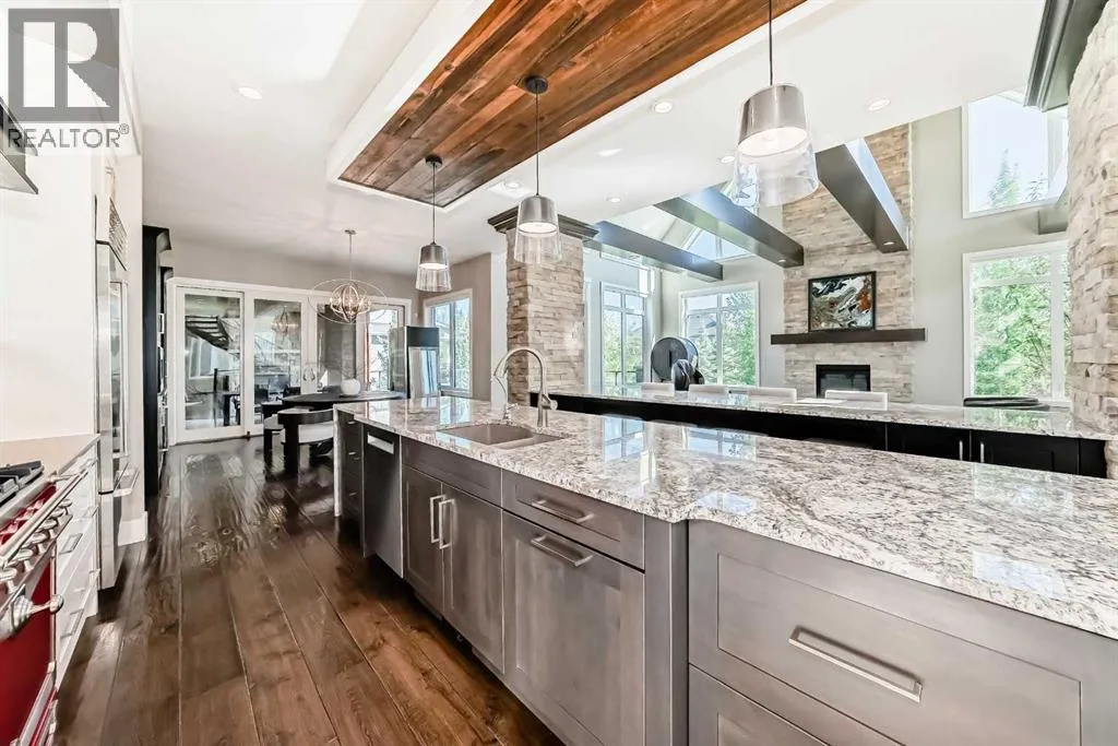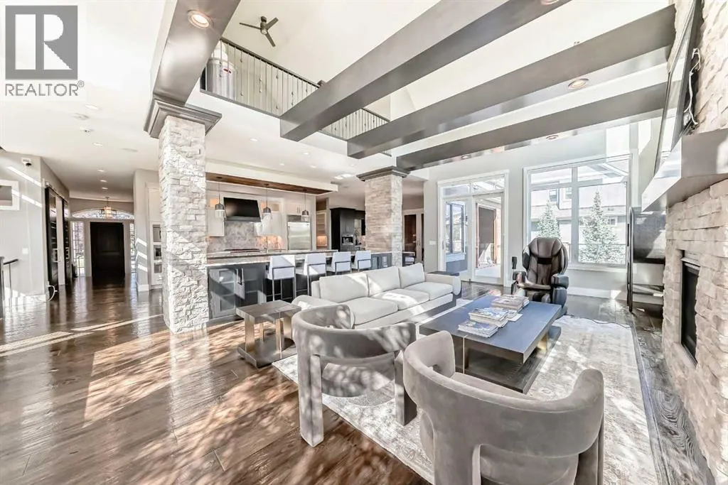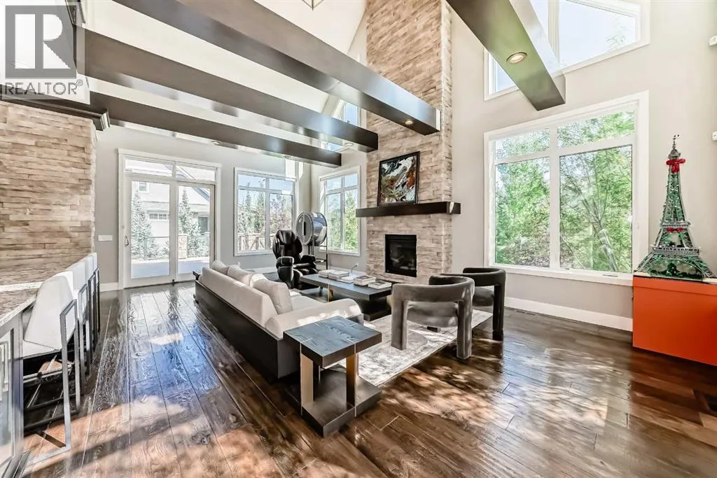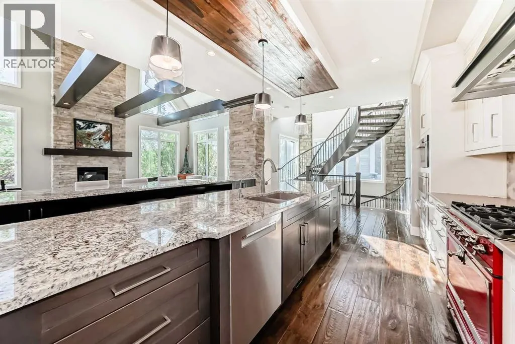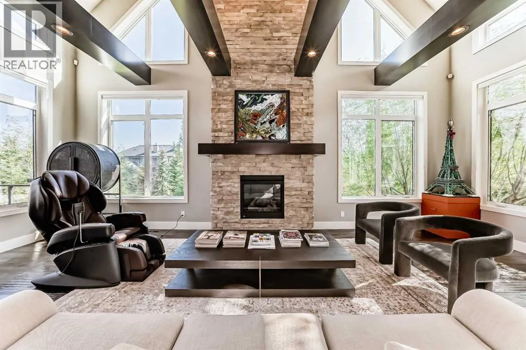 FORMER ASTORIA SHOWHOME â NATIONAL FINALIST FOR HOME OF THE YEAR! Welcome to 24 Rockwater Way in Watermark, a masterpiece by Astoria Custom Homes.Recognized as a Canadian National Finalist for Housing Excellence and a SAM Awards Finalist for Best New Home, this residence was ranked among the TOP FIVE homes in the nation.The home opens with a dramatic foyer, where wide-plank hardwood, 11-foot ceilings, and a curved open-rise staircase set the tone. Sunlight floods the space, illuminating stone-clad columns, wood-beamed ceilings, and hand-painted details. The chef-inspired kitchen featuring dual granite waterfall islands, a La Cornue range, Sub-Zero refrigeration, and a Wolf built-in coffee system. A butlerâs pantry with beverage center streamlines entertaining, while custom cabinetry, subtle lighting, and professional-grade finishes complete the space. French doors open to a covered deck with a stone-clad fireplace, extending the gathering space for year-round enjoyment. In the great room, a soaring stone fireplace anchors the design, while exposed beams draw the eye upward.Custom lighting and built-in speakers enhance the ambiance, highlighting both architecture and comfort. A private home office with barn doors and tailored built-ins offers function with style, while the bright dining nookâframed by designer finishesâcreates an inviting space for everyday living. Upstairs, the primary suite is a private sanctuary with vaulted ceilings, a fireplace, and a hidden walk-in closet. The spa-inspired ensuite offers heated tile floors, a glass shower, private water closet, and a soaking tub designed for pure serenity. A second guest suite with ensuite, two additional bedrooms with a shared full bath, and a loft overlooking the great room provide space for family and guests. A full laundry room with custom cabinetry adds convenience.The walkout basement is designed for both relaxation and entertaining.Highlights include a rec/theatre room with stone-clad built-ins, wet bar, and wine display; a fifth bedroom with full bath for guests; and walkout access to a covered patio prepped for a hot tub with gas fire bowl rough-in. The triple-attached heated garage features epoxy floors, slab heating, and custom storageâcombining function with refined elegance.Over $40,000 in thoughtful upgrades make this home move-in ready, including a 2024 Bosch dishwasher, radon mitigation system, landscaping with new trees, mulch, and driveway sealing, patio improvements with a new staircase and screened patio, and custom window blinds, among other refinements. Watermark at Bearspaw delivers tranquility, privacy, and prestige. Architectural controls preserve timeless beauty, and the absence of commercial development ensures peace and exclusivity. Residents enjoy a central plaza with gazebo and outdoor fire pit, soccer field, reflection pond, BBQ facilities, landscaped parks, NBA-sized sports court and 5 km of paved trails. Book your private showing today and Welcome Home! (id:27476)