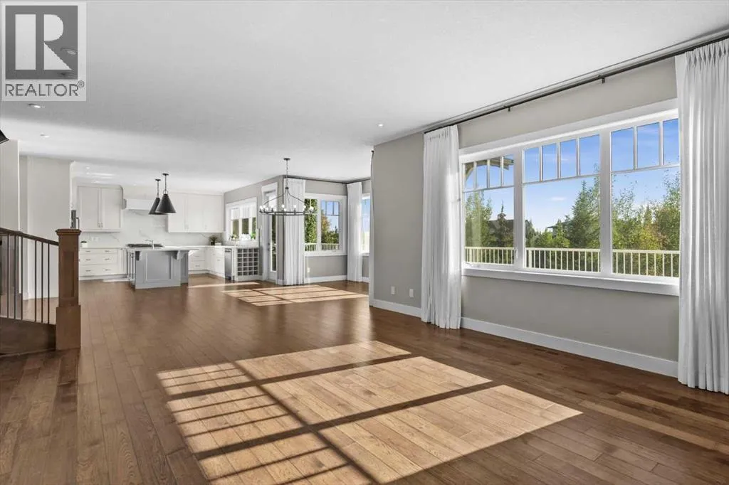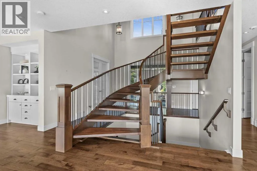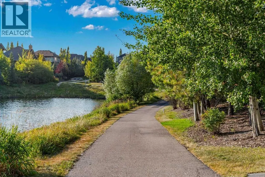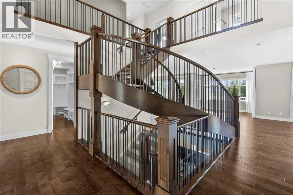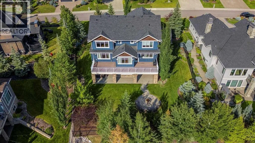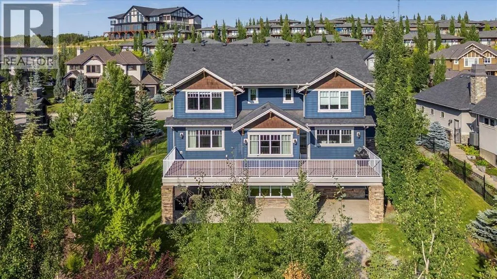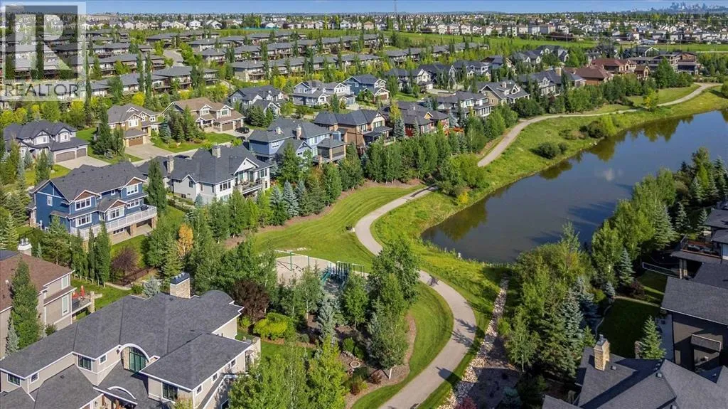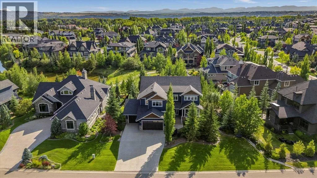 Set in one of Watermark's most coveted locations, a quiet cul-de-sac backing southwest onto green space with tranquil pond and stunning Rocky Mountain views, this custom built two-storey walkout by Wolf Custom Homes offers over 4500sqft of thoughtfully designed living space. Entering the home you are immediately captivated by the millwork on the artisanal curved wood staircase, the natural light streaming throughout the home and the serenity of the stunning views. The main floor is ideal for family connection and entertaining featuring an expansive great room with focal gas fireplace and custom cabinetry, a spacious dining area, and a chef-inspired kitchen with Calcutta Marble quartz countertops, premium JennAir appliances, and walk-through butlerâs pantry with exceptional storage. An expansive southwest deck off the kitchen and dining area is perfect for weekend BBQâs, outdoor dining or simply relaxing in the sunshine. Working from home is easy with the private office with double french doors on the main floor, while the large mudroom with custom built-ins keeps family life organized. On the upper level hardwood floors lead to four generous bedrooms and three full bathrooms, including a luxurious primary suite with vaulted ceilings, spectacular mountain views, a walk-in dressing room with custom cabinetry, and a spa-inspired ensuite featuring heated floors, dual vanities, a deep soaker tub, and a 10mm glass shower with dual rain heads. Two of the upper bedrooms share a Jack & Jill bathroom, and the fourth has its own private bathâideal for teens or guests. A large laundry room on the upper level adds everyday convenience. The walkout lower level features in-slab heating and is perfect for movie nights or entertaining with the spacious family room and wet bar. Additionally on the lower level is a fifth bedroom that can double as a gym or second home office, a full bathroom, and plentiful storage. The private backyard continues the theme of exceptional living wi th professional landscaping, mature trees, fire pit conversation area, discreetly positioned hot tub, irrigation system and an abundance of space to play and entertain. Not to be missed is the finished oversized triple garage with polyaspartic flooring, slat walls, extensive built-in storage and EV charger. Recent updates to the home include servicing of furnaces, hot water tank, and A/C units; new light fixtures above island and in dining area, new wine fridge and icemaker in wet bar, hot tub, polyaspartic flooring and shelves in garage, mirrored wall in 5th bedroom, re-tiled shower base in ensuite, and addition of childrenâs play space under the stairs. Awarded Canadaâs Community of the Year multiple times, Watermark features over 5km of paved trails, a network of cascading ponds and streams, community playgrounds and a Central Plaza. Exceptional access to several golf courses, the Rocky Mountains, Stoney Trail and downtown Calgary. (id:27476)