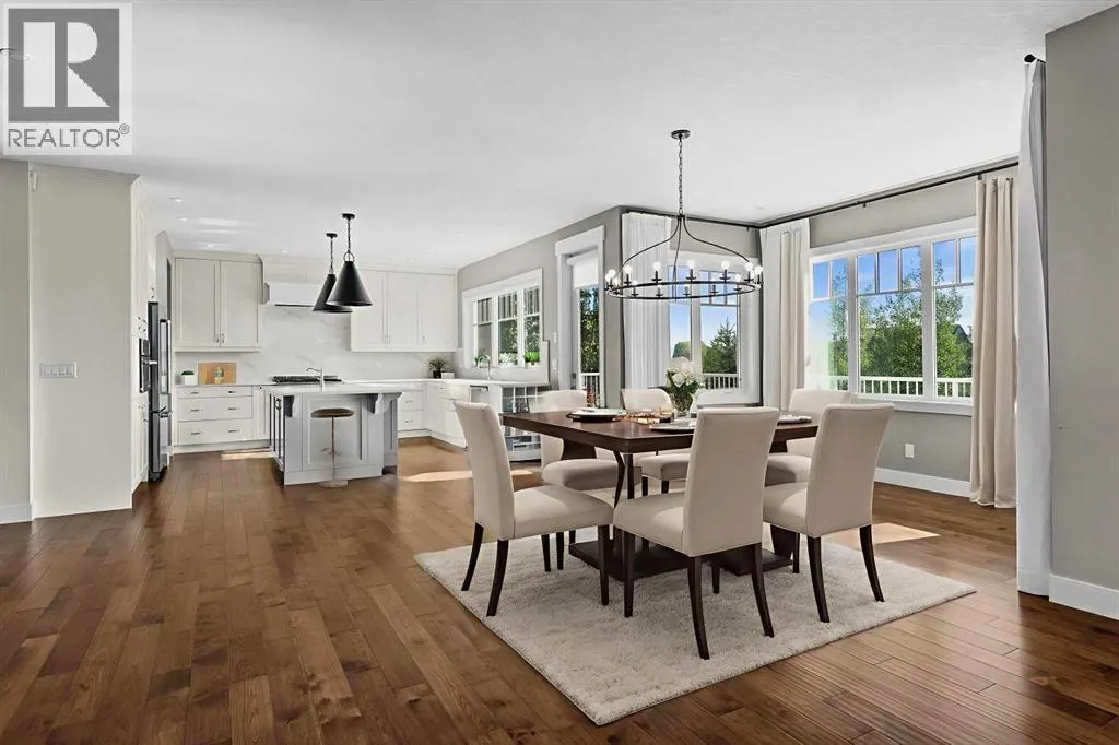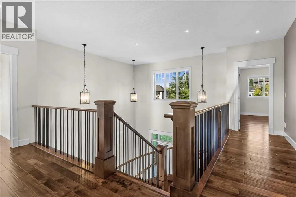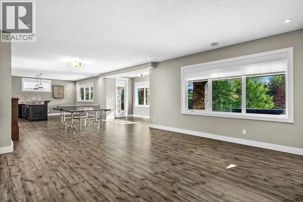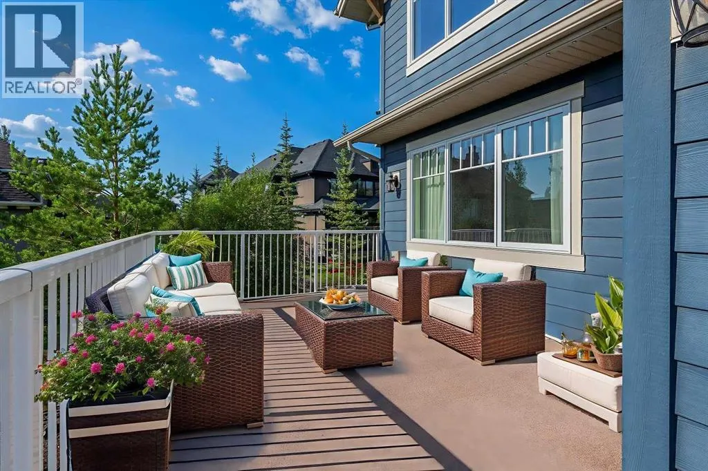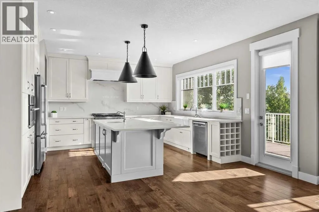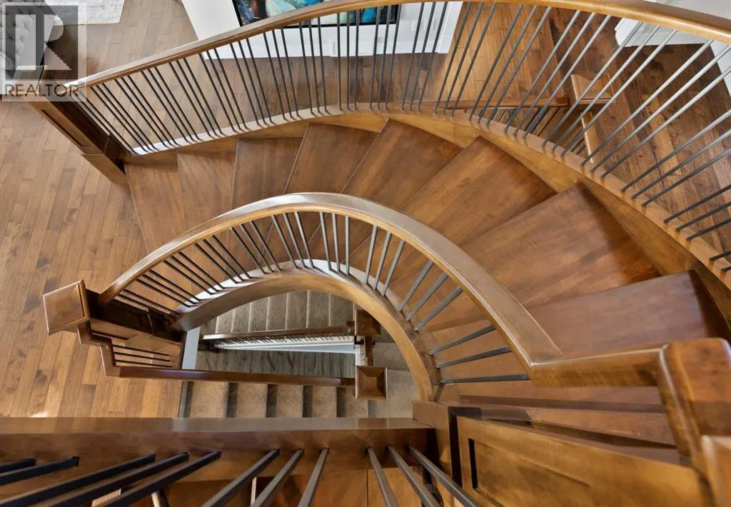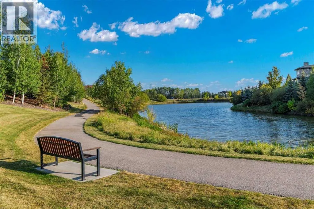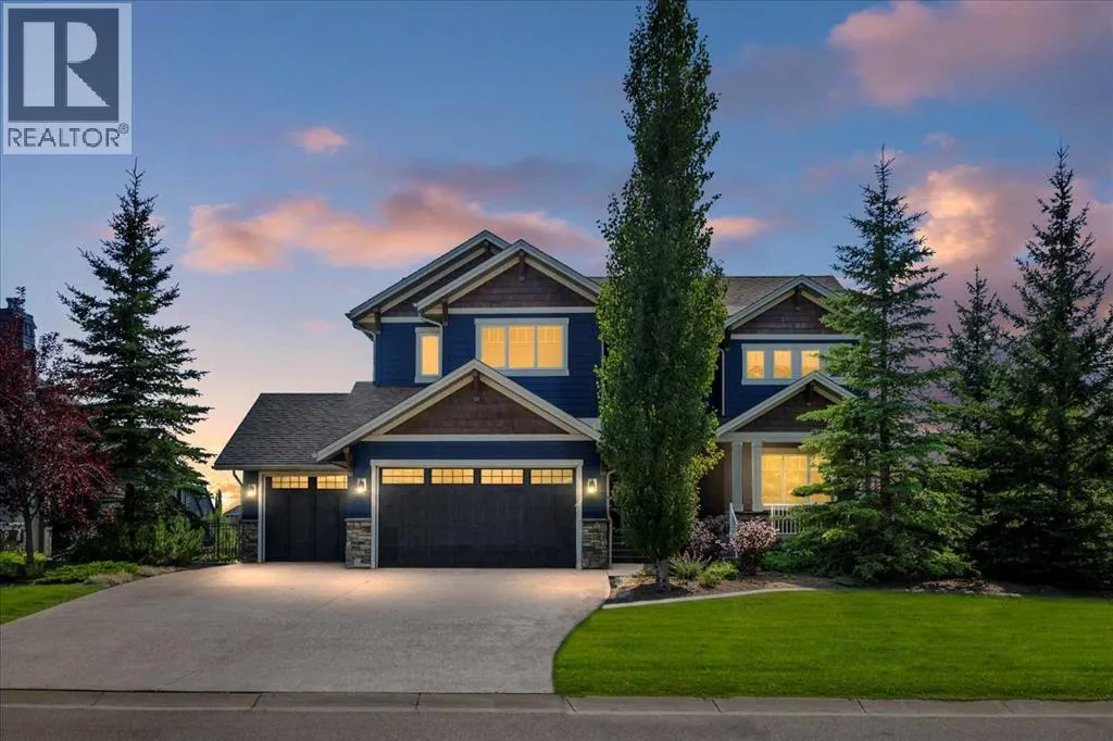 Set in one of Watermark's most coveted locations, a quiet cul-de-sac backing southwest onto green space with tranquil pond and stunning Rocky Mountain views, this custom built two-storey walkout by Wolf Custom Homes offers over 4500sqft of thoughtfully designed living space. Entering the home you are immediately captivated by the millwork on the artisanal curved wood staircase, the natural light streaming throughout the home and the serenity of the stunning views. The main floor is ideal for family connection and entertaining featuring an expansive great room with focal gas fireplace and custom cabinetry, a spacious dining area, and a chef-inspired kitchen with Calcutta Marble quartz countertops, premium JennAir appliances, and walk-through butlerâs pantry with exceptional storage. An expansive southwest deck off the kitchen and dining area is perfect for weekend BBQâs, outdoor dining or simply relaxing in the sunshine. Working from home is easy with the private office with double french doors on the main floor, while the large mudroom with custom built-ins keeps family life organized. On the upper level hardwood floors lead to four generous bedrooms and three full bathrooms, including a luxurious primary suite with vaulted ceilings, spectacular mountain views, a walk-in dressing room with custom cabinetry, and a spa-inspired ensuite featuring heated floors, dual vanities, a deep soaker tub, and a 10mm glass shower with dual rain heads. Two of the upper bedrooms share a Jack & Jill bathroom, and the fourth has its own private bathâideal for teens or guests. A large laundry room on the upper level adds everyday convenience. The walkout lower level features in-slab heating and is perfect for movie nights or entertaining with the spacious family room and wet bar. Additionally on the lower level is a fifth bedroom that can double as a gym or second home office, a full bathroom, and plentiful storage. The private backyard continues the theme of exceptional living wi th professional landscaping, mature trees, fire pit conversation area, discreetly positioned hot tub, irrigation system and an abundance of space to play and entertain. Not to be missed is the finished oversized triple garage with polyaspartic flooring, slat walls, extensive built-in storage and EV charger. Recent updates to the home include servicing of furnaces, hot water tank, and A/C units; new light fixtures above island and in dining area, new wine fridge and icemaker in wet bar, hot tub, polyaspartic flooring and shelves in garage, mirrored wall in 5th bedroom, re-tiled shower base in ensuite, and addition of childrenâs play space under the stairs. Awarded Canadaâs Community of the Year multiple times, Watermark features over 5km of paved trails, a network of cascading ponds and streams, community playgrounds and a Central Plaza. Exceptional access to several golf courses, the Rocky Mountains, Stoney Trail and downtown Calgary. (id:27476)
