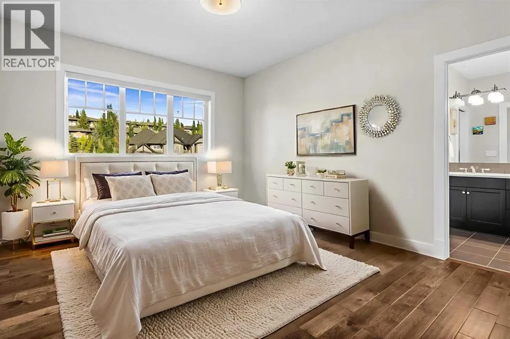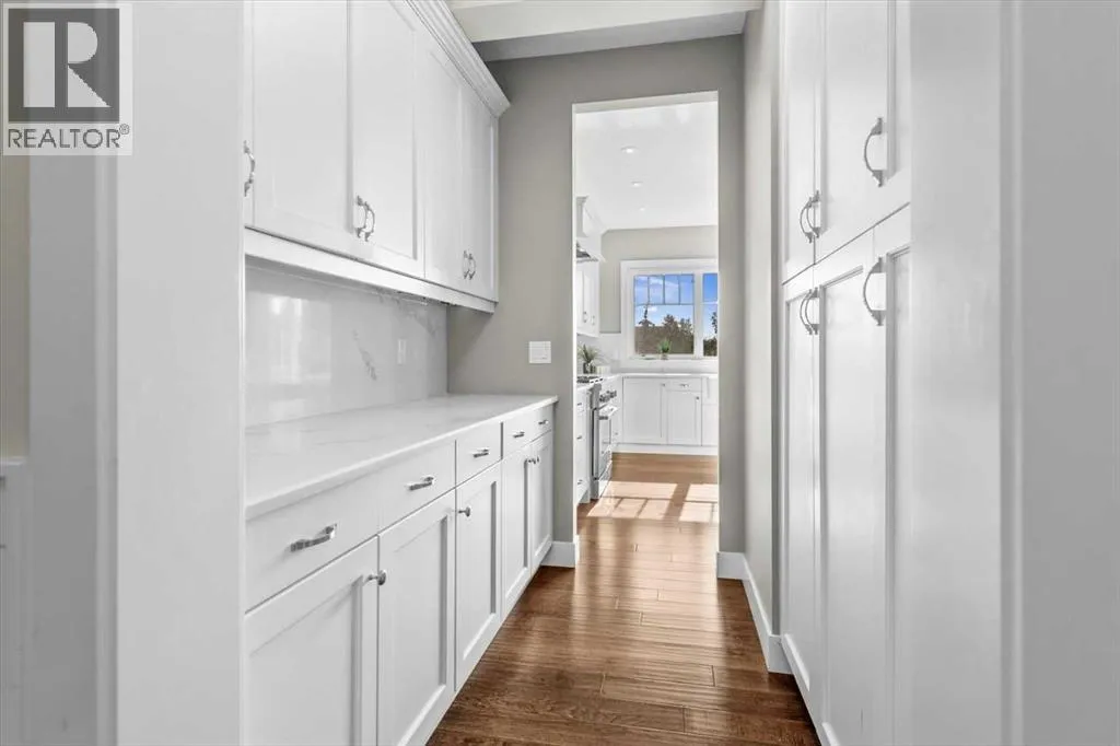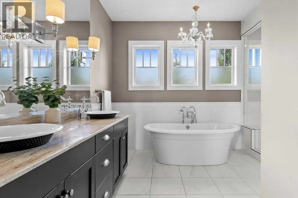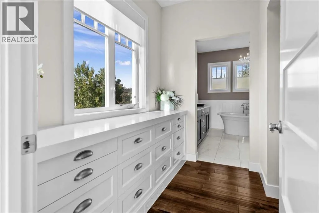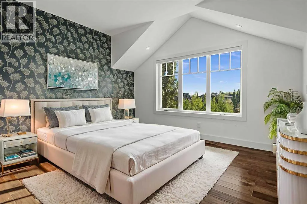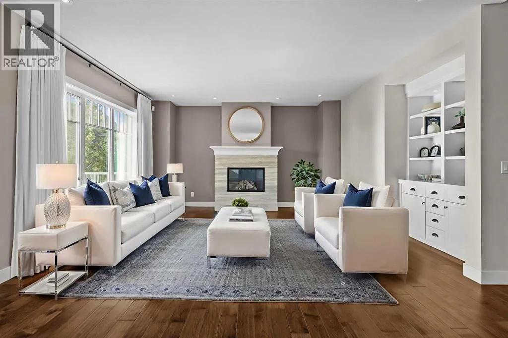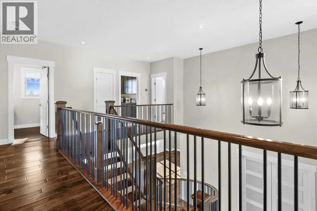 Set in one of Watermark's most coveted locations, a quiet cul-de-sac backing southwest onto green space with tranquil pond and stunning Rocky Mountain views, this custom built two-storey walkout by Wolf Custom Homes offers over 4500sqft of thoughtfully designed living space. Entering the home you are immediately captivated by the millwork on the artisanal curved wood staircase, the natural light streaming throughout the home and the serenity of the stunning views. The main floor is ideal for family connection and entertaining featuring an expansive great room with focal gas fireplace and custom cabinetry, a spacious dining area, and a chef-inspired kitchen with Calcutta Marble quartz countertops, premium JennAir appliances, and walk-through butlerâs pantry with exceptional storage. An expansive southwest deck off the kitchen and dining area is perfect for weekend BBQâs, outdoor dining or simply relaxing in the sunshine. Working from home is easy with the private office with double french doors on the main floor, while the large mudroom with custom built-ins keeps family life organized. On the upper level hardwood floors lead to four generous bedrooms and three full bathrooms, including a luxurious primary suite with vaulted ceilings, spectacular mountain views, a walk-in dressing room with custom cabinetry, and a spa-inspired ensuite featuring heated floors, dual vanities, a deep soaker tub, and a 10mm glass shower with dual rain heads. Two of the upper bedrooms share a Jack & Jill bathroom, and the fourth has its own private bathâideal for teens or guests. A large laundry room on the upper level adds everyday convenience. The walkout lower level features in-slab heating and is perfect for movie nights or entertaining with the spacious family room and wet bar. Additionally on the lower level is a fifth bedroom that can double as a gym or second home office, a full bathroom, and plentiful storage. The private backyard continues the theme of exceptional living wi th professional landscaping, mature trees, fire pit conversation area, discreetly positioned hot tub, irrigation system and an abundance of space to play and entertain. Not to be missed is the finished oversized triple garage with polyaspartic flooring, slat walls, extensive built-in storage and EV charger. Recent updates to the home include servicing of furnaces, hot water tank, and A/C units; new light fixtures above island and in dining area, new wine fridge and icemaker in wet bar, hot tub, polyaspartic flooring and shelves in garage, mirrored wall in 5th bedroom, re-tiled shower base in ensuite, and addition of childrenâs play space under the stairs. Awarded Canadaâs Community of the Year multiple times, Watermark features over 5km of paved trails, a network of cascading ponds and streams, community playgrounds and a Central Plaza. Exceptional access to several golf courses, the Rocky Mountains, Stoney Trail and downtown Calgary. (id:27476)