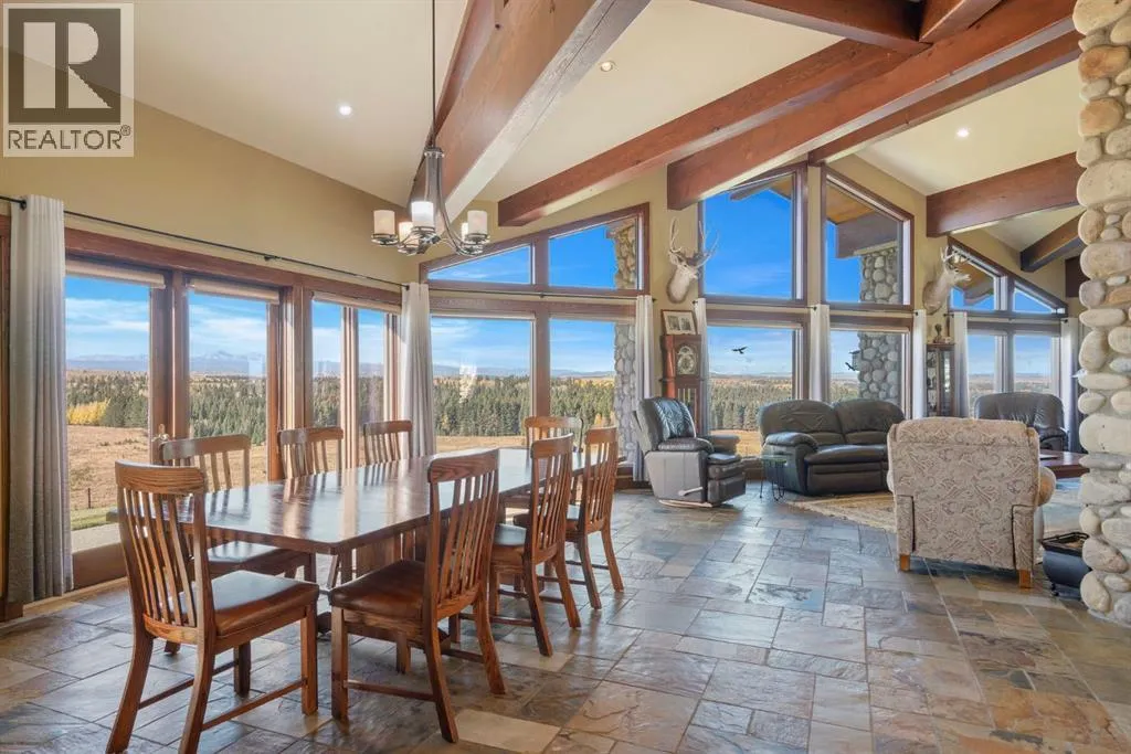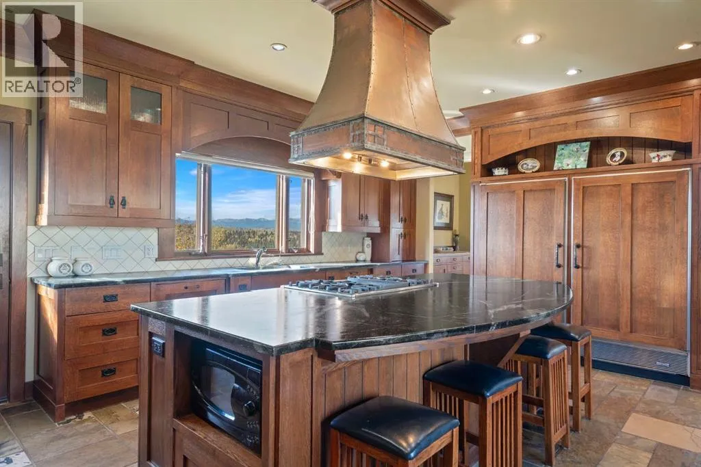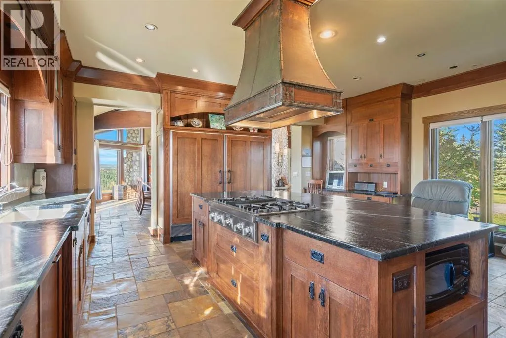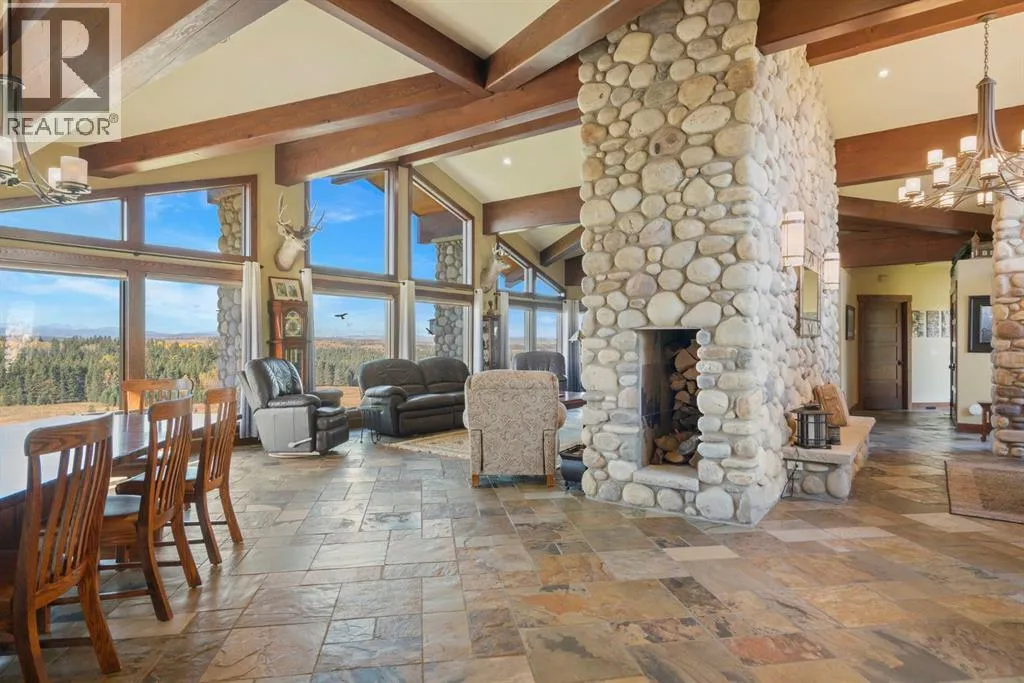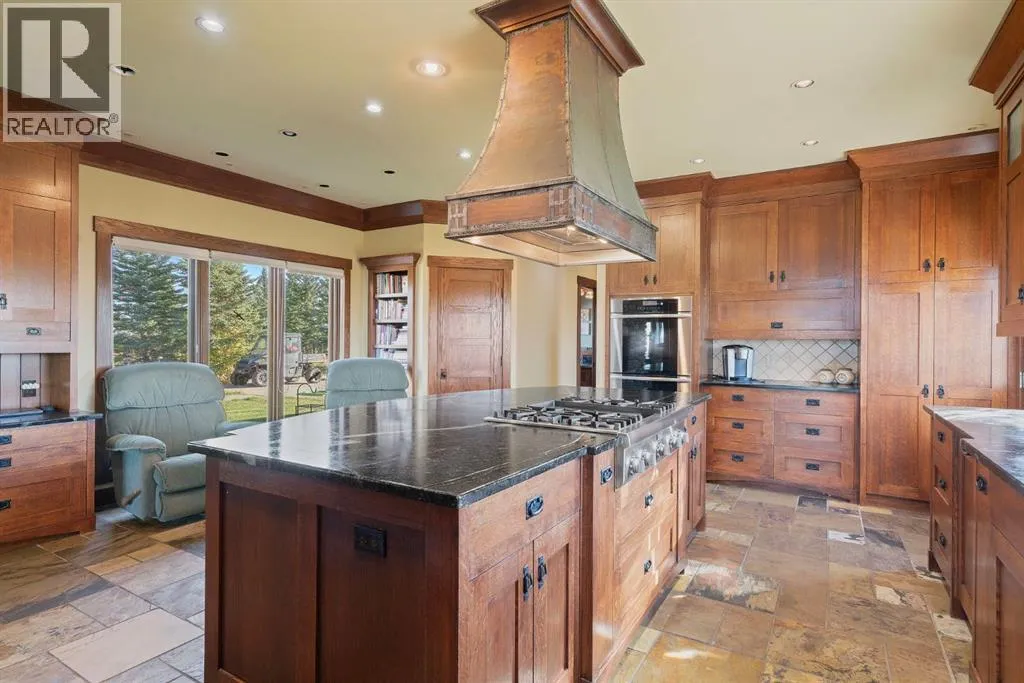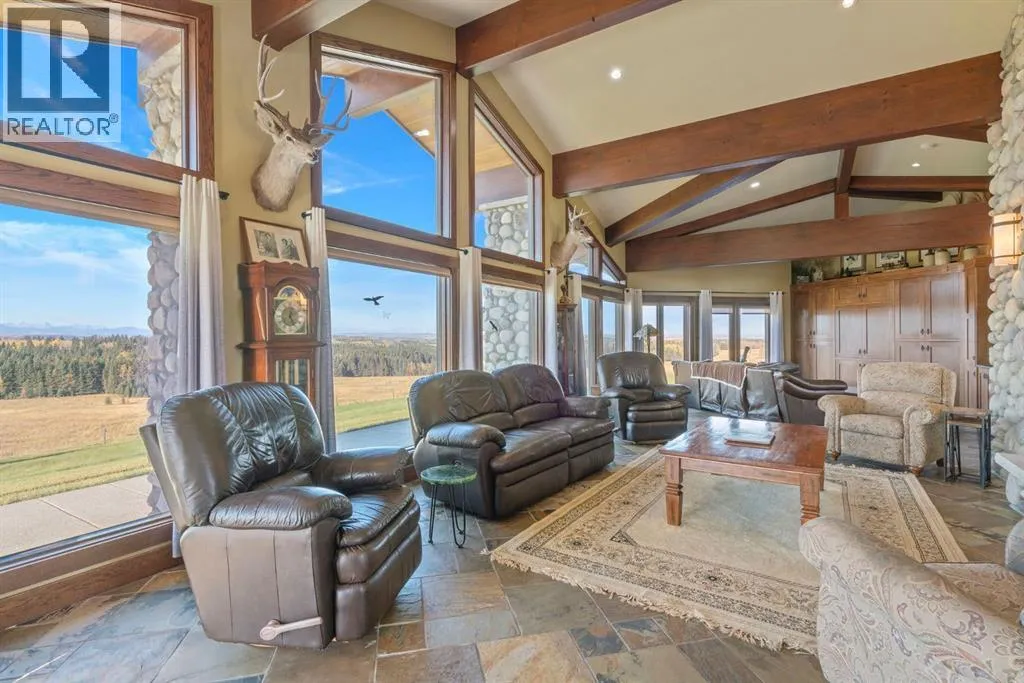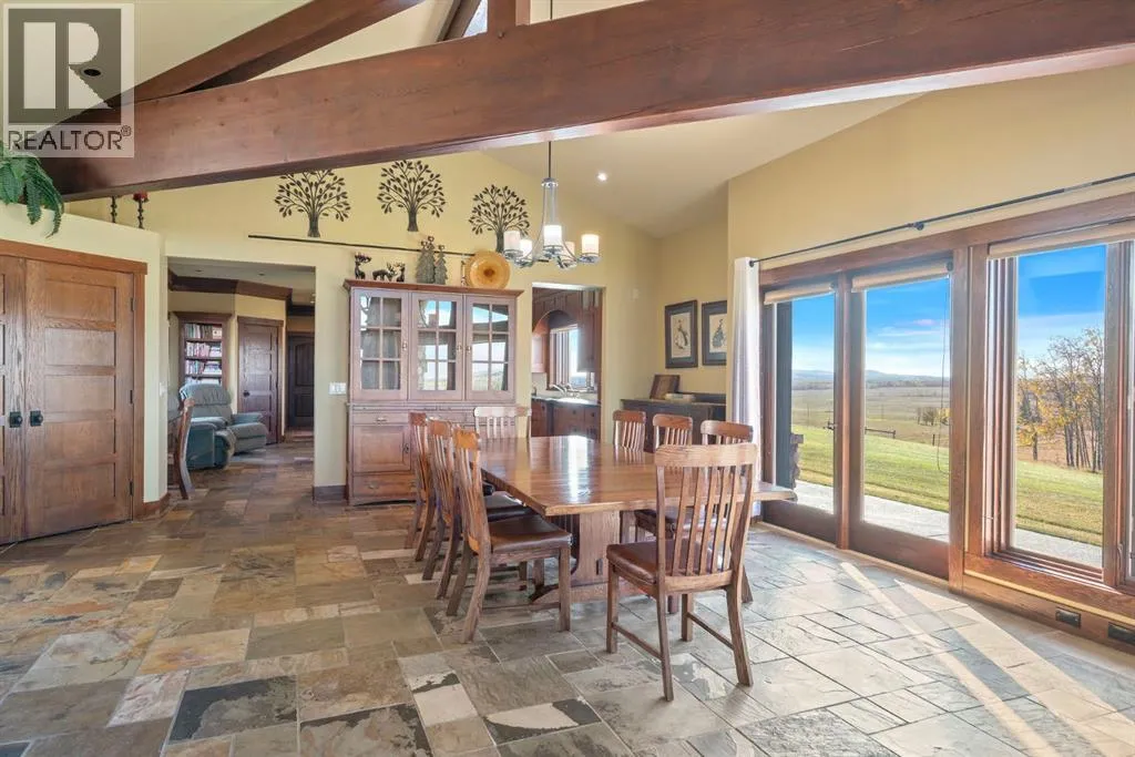 Welcome to 44110 Township Road 242, a one-of-a-kind country estate set on 80 private acres of rolling Alberta prairie, only 15 minutes from Calgary. Blending timeless craftsmanship with breathtaking views, this custom-built 3,388 sq ft bungalow is a true rural retreat. Inside, youâll find vaulted timber-beamed ceilings, expansive windows framing panoramic mountain and valley views, and a massive river rock fireplace that anchors the open-concept living and dining area. The natural slate floors, solid wood doors, and detailed millwork throughout highlight the homeâs enduring quality. The kitchen is both elegant and functional, featuring custom cabinetry, granite counters, a large central island with seating, double wall ovens, a large full height fridge, large full height freezer, gas cooktop, and a stunning handcrafted copper range hood. The primary suite offers a serene escape with treed views and a spa-like ensuite complete with a deep soaker tub overlooking the countryside. Two additional bedrooms, a full bath, and a 2 piece washroom complete the main living quarters. Additional highlights include in-floor heating, a large mudroom, and an oversized attached double garage. Step outside to enjoy the expansive stone patio and firepit area surrounded by mature trees, perfect for evenings under Albertaâs wide-open skies. Wrapping around the South and West sides of the home is a concrete pad, perfect to take in the expansive mountain views, and your dogs can enjoy it as well with the dog run off the back side of the garage. The property also features a 40â x 46â heated shop, offering plenty of workspace and storage. Above the shop is a bonus room with a kitchen, living room, and washroom. With 80 acres of usable land, this property offers endless opportunities, whether youâre looking for recreation, equestrian pursuits, a small-scale agricultural setup, or simply wide-open privacy within easy reach of city amenities. A rare and remarkable acreage where craftsmanship me ets nature, welcome home to 44110 Township Road 242! (id:27476)