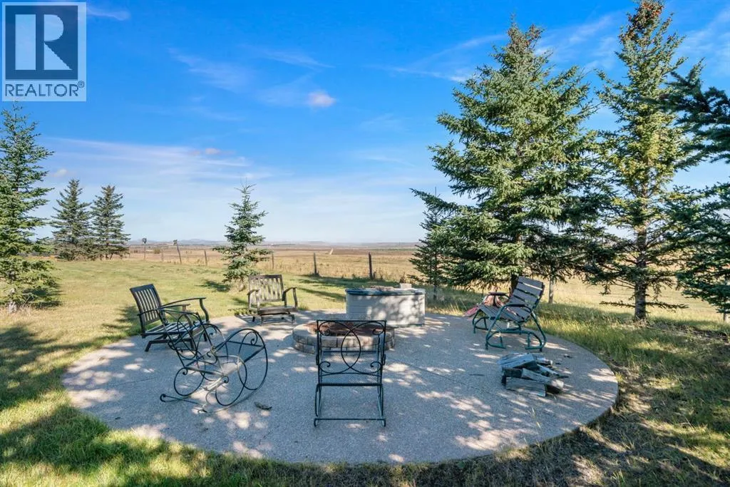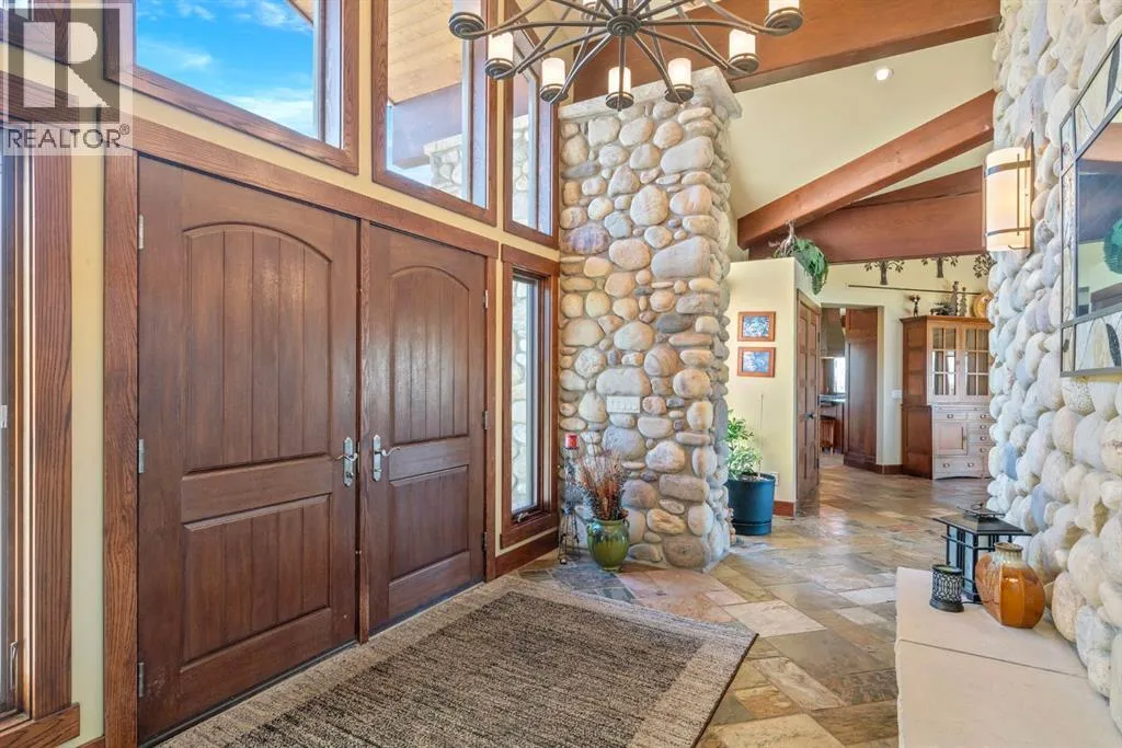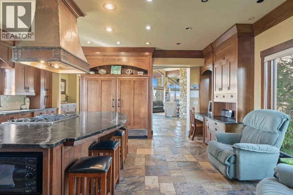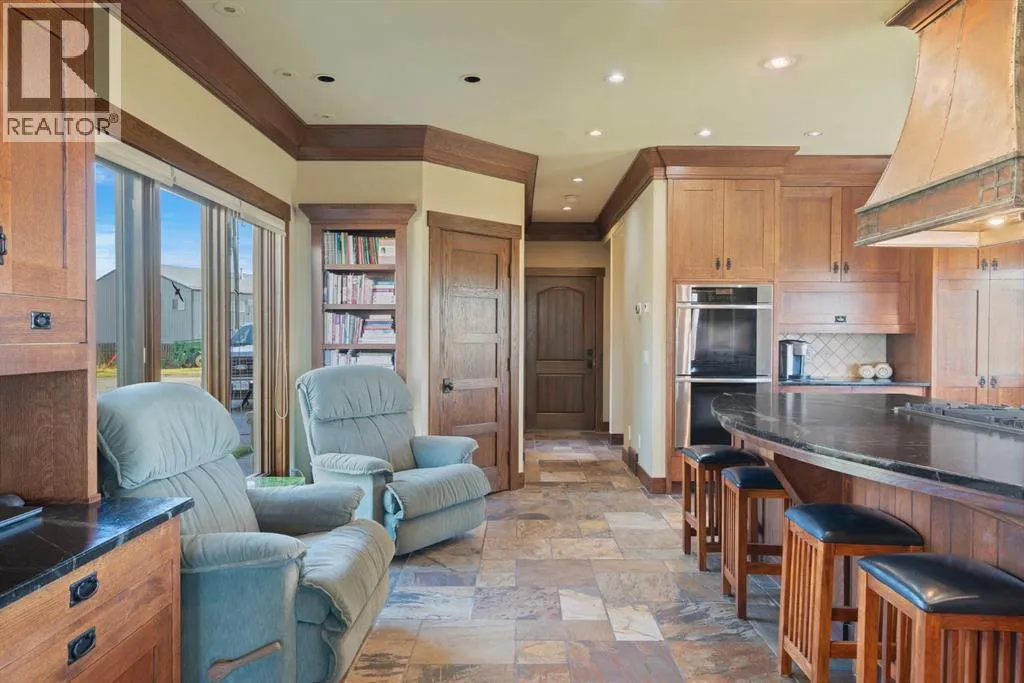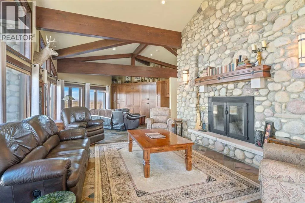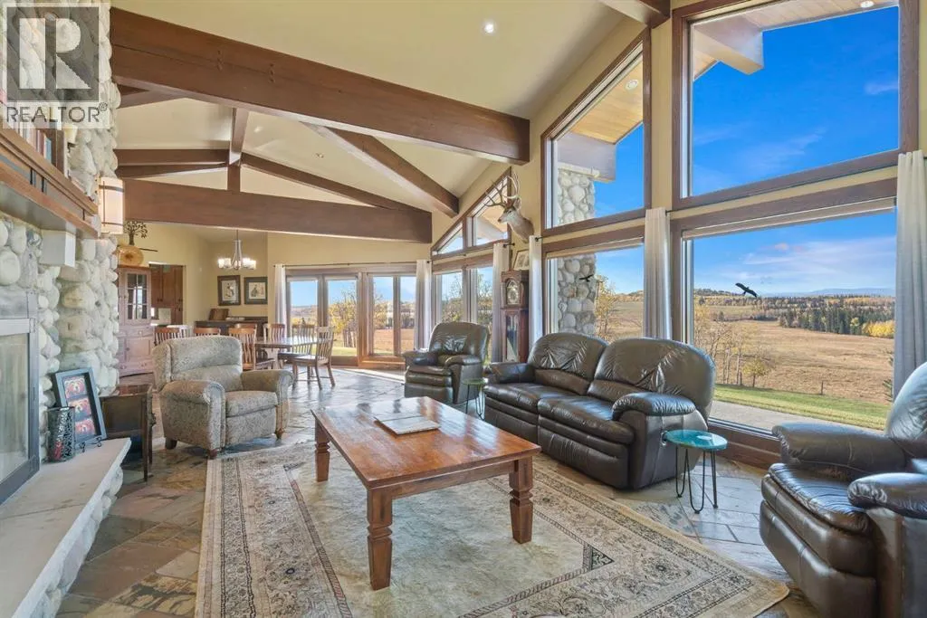 Welcome to 44110 Township Road 242, a one-of-a-kind country estate set on 80 private acres of rolling Alberta prairie, only 15 minutes from Calgary. Blending timeless craftsmanship with breathtaking views, this custom-built 3,388 sq ft bungalow is a true rural retreat. Inside, youâll find vaulted timber-beamed ceilings, expansive windows framing panoramic mountain and valley views, and a massive river rock fireplace that anchors the open-concept living and dining area. The natural slate floors, solid wood doors, and detailed millwork throughout highlight the homeâs enduring quality. The kitchen is both elegant and functional, featuring custom cabinetry, granite counters, a large central island with seating, double wall ovens, a large full height fridge, large full height freezer, gas cooktop, and a stunning handcrafted copper range hood. The primary suite offers a serene escape with treed views and a spa-like ensuite complete with a deep soaker tub overlooking the countryside. Two additional bedrooms, a full bath, and a 2 piece washroom complete the main living quarters. Additional highlights include in-floor heating, a large mudroom, and an oversized attached double garage. Step outside to enjoy the expansive stone patio and firepit area surrounded by mature trees, perfect for evenings under Albertaâs wide-open skies. Wrapping around the South and West sides of the home is a concrete pad, perfect to take in the expansive mountain views, and your dogs can enjoy it as well with the dog run off the back side of the garage. The property also features a 40â x 46â heated shop, offering plenty of workspace and storage. Above the shop is a bonus room with a kitchen, living room, and washroom. With 80 acres of usable land, this property offers endless opportunities, whether youâre looking for recreation, equestrian pursuits, a small-scale agricultural setup, or simply wide-open privacy within easy reach of city amenities. A rare and remarkable acreage where craftsmanship me ets nature, welcome home to 44110 Township Road 242! (id:27476)